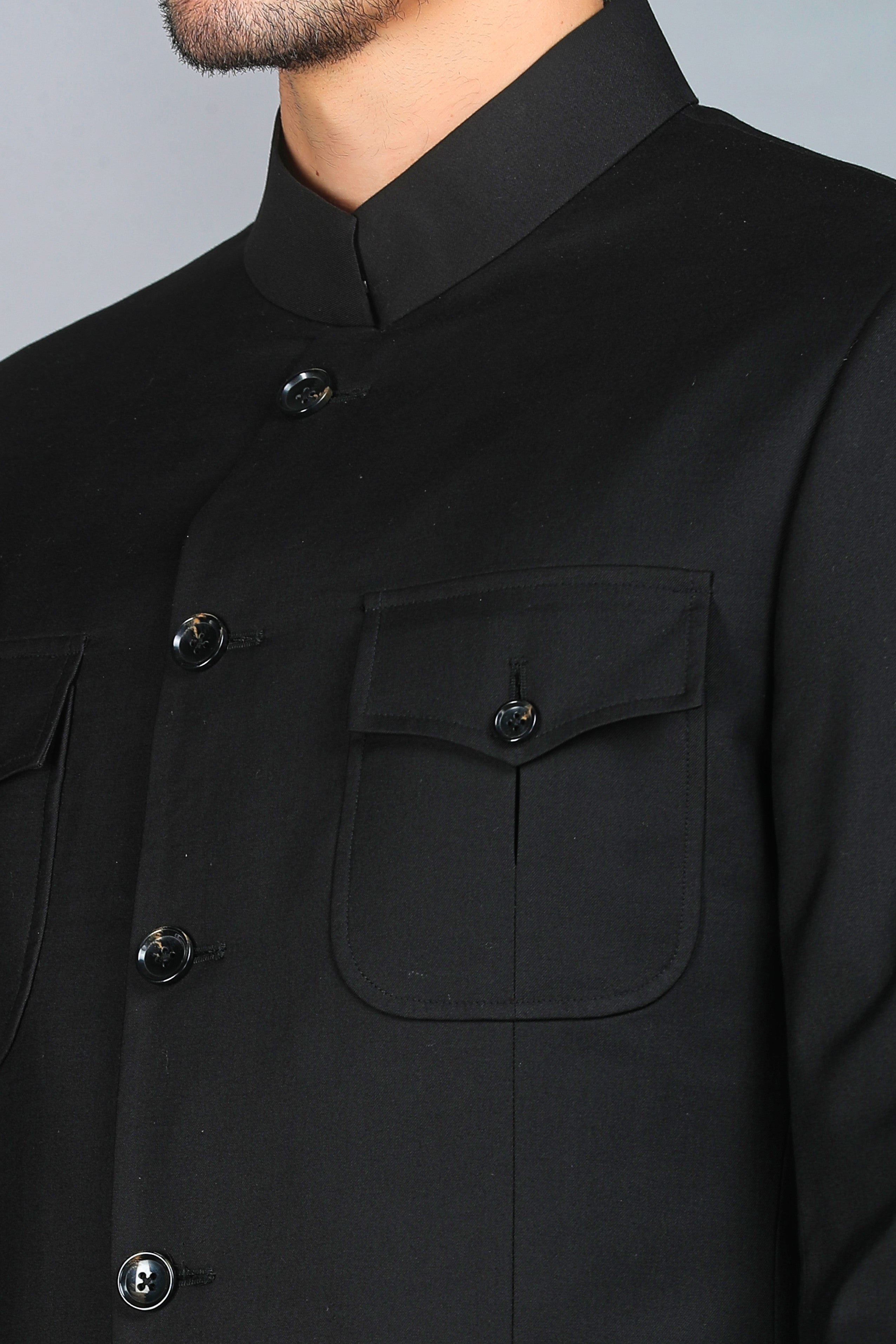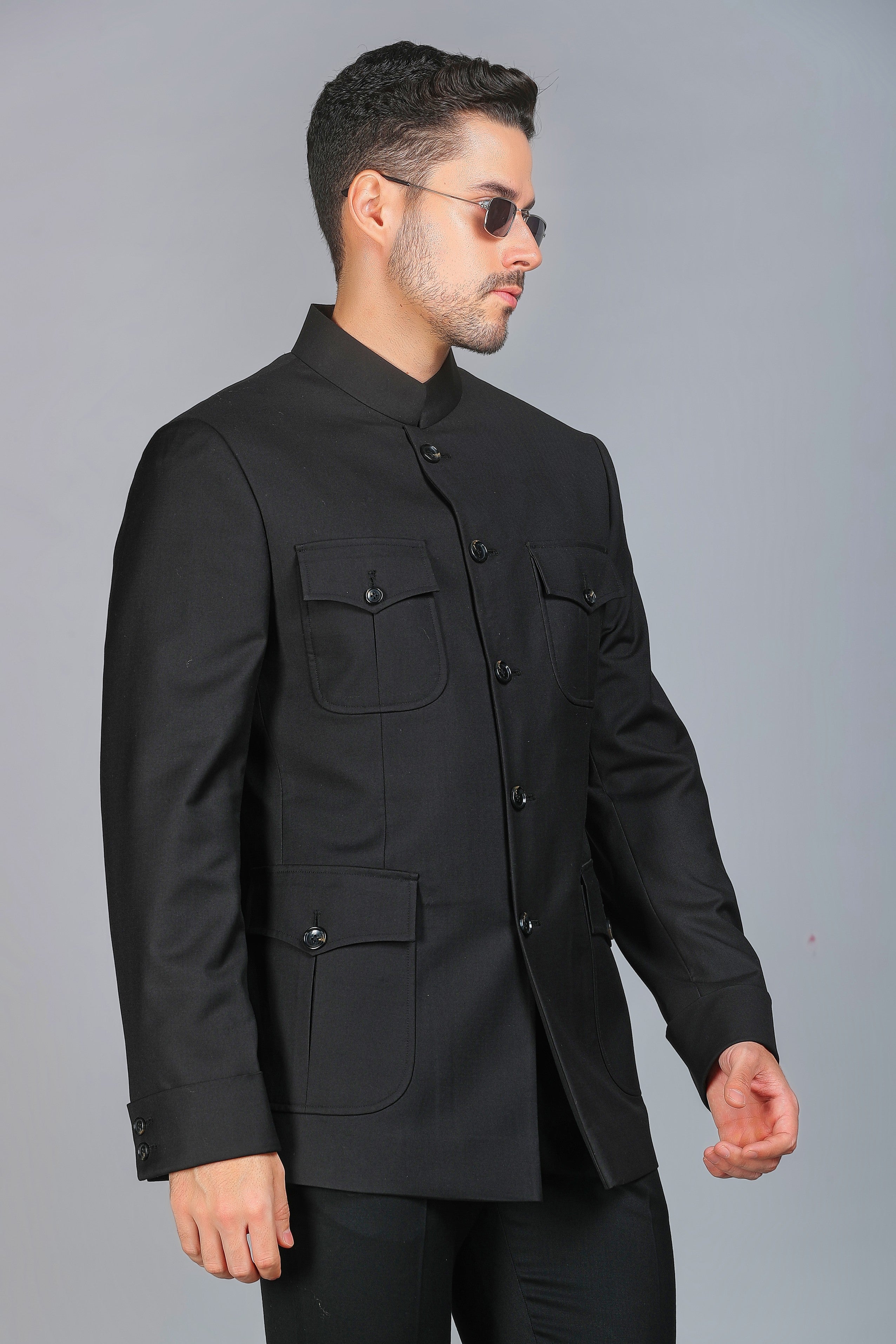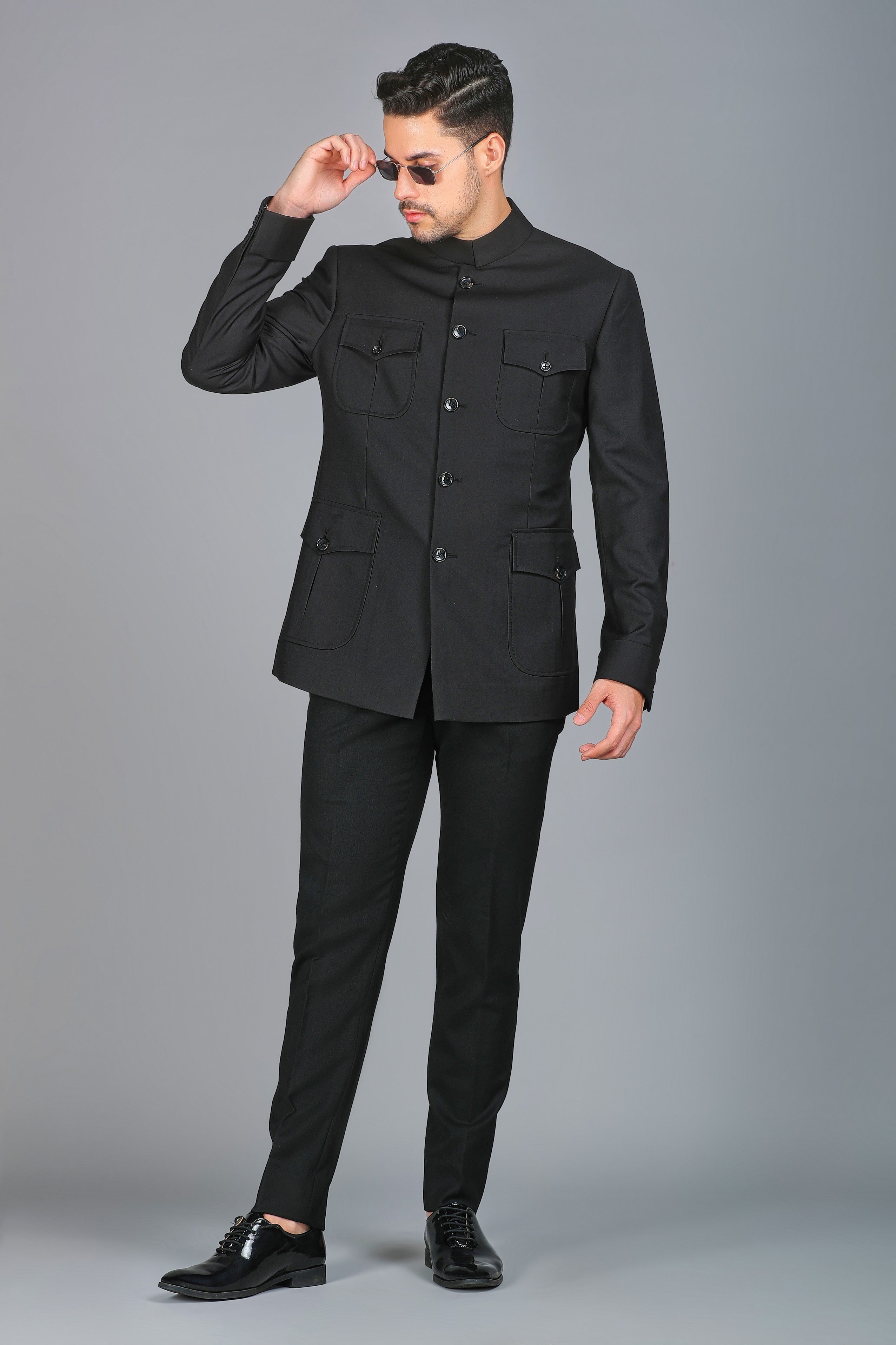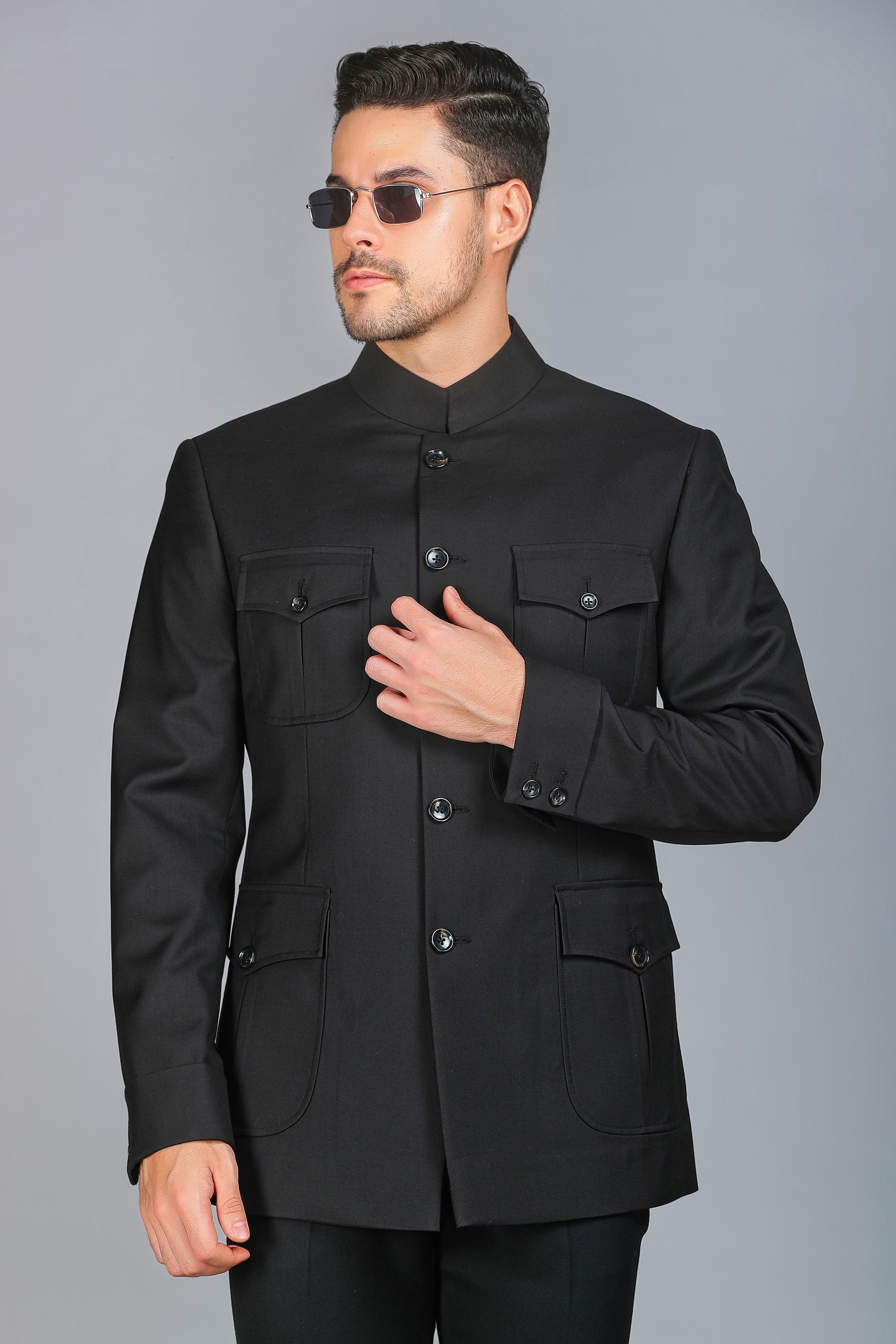 Introducing the Black Four Pocket Bandhgala – a perfect fusion of tradition and modern sophistication. Designed with a structured silhouette and four-pocket detailing, this black Bandhgala exudes elegance and versatility. Ideal for formal events and festive occasions, it offers a smart body fit for a polished look.