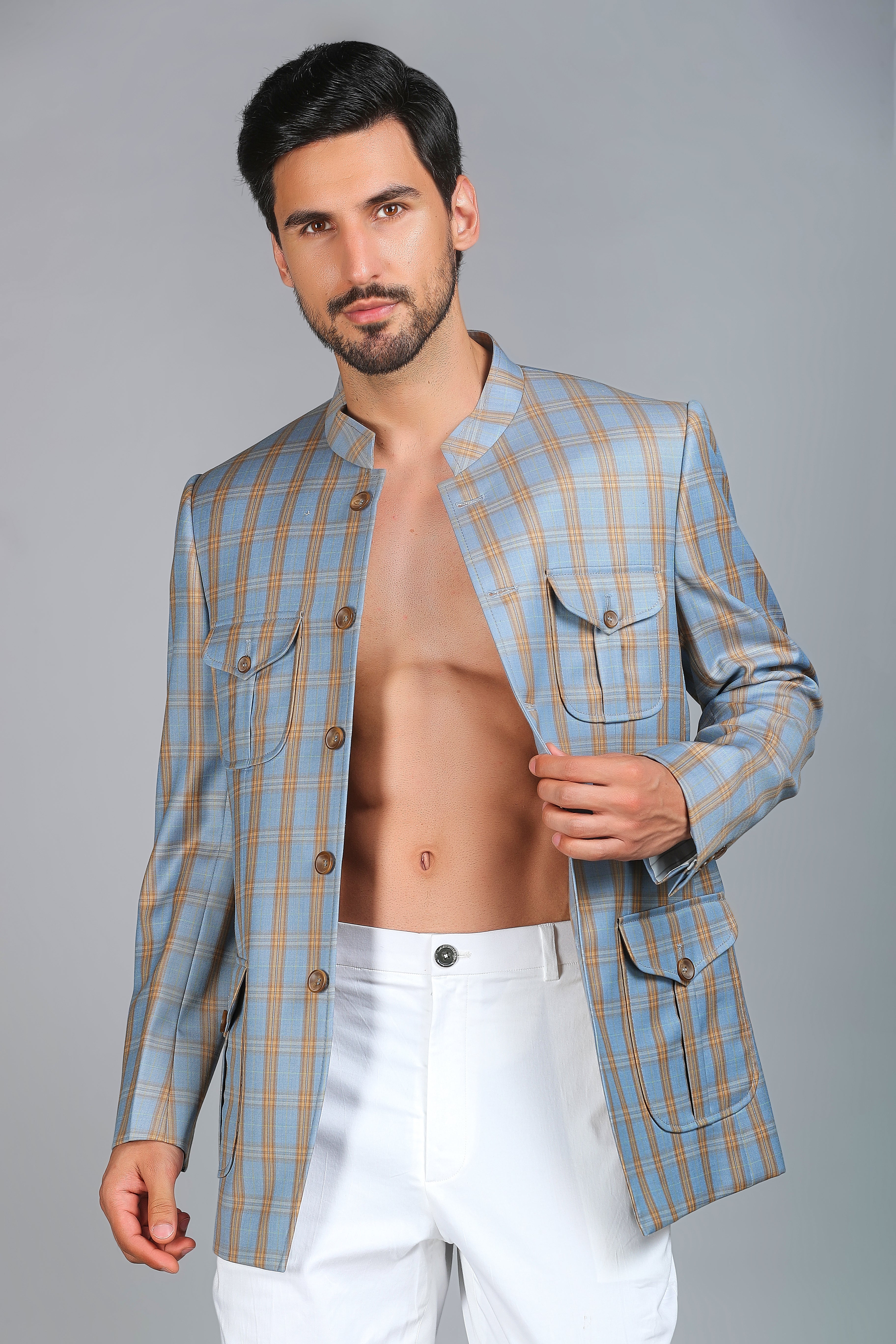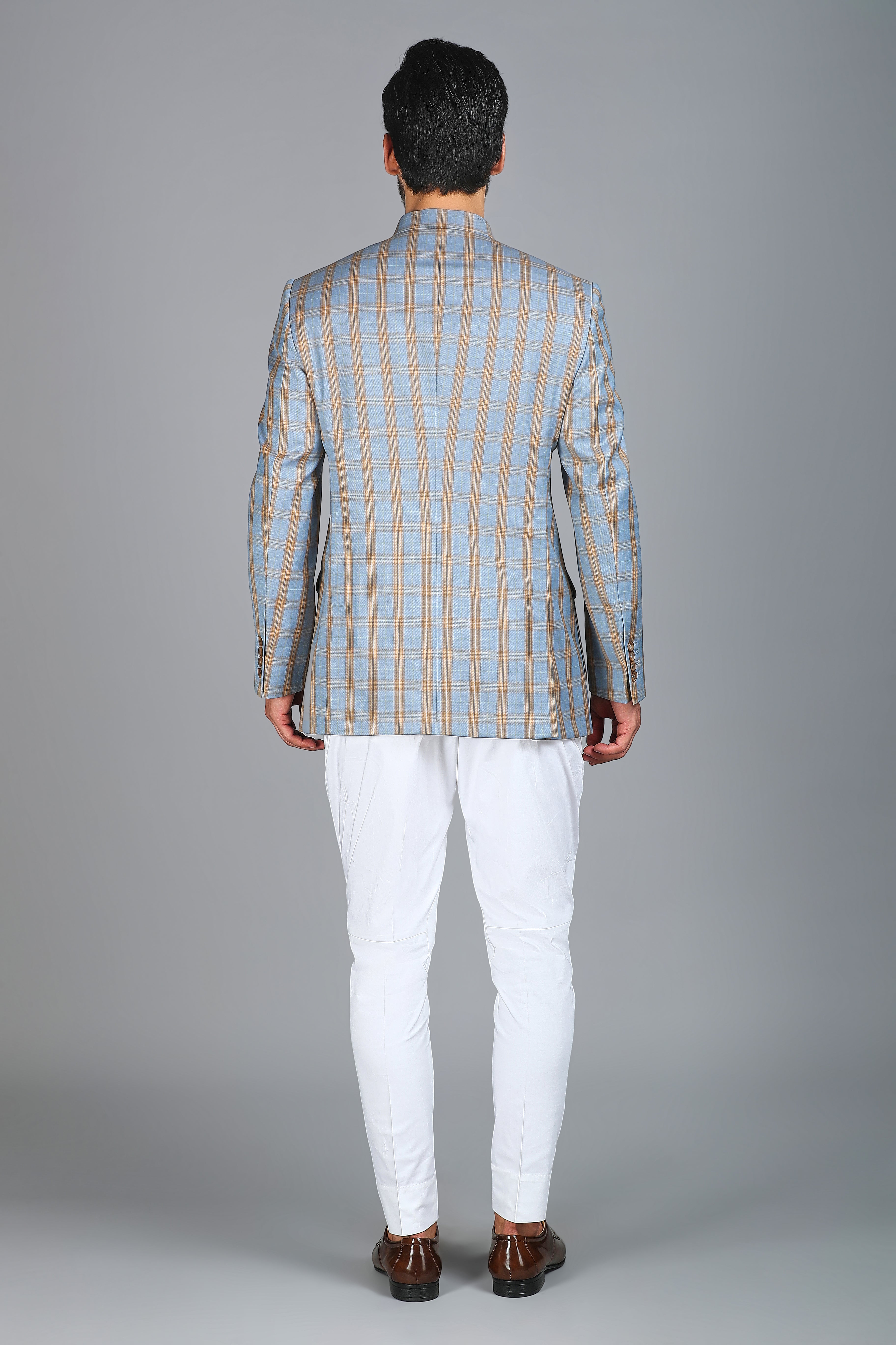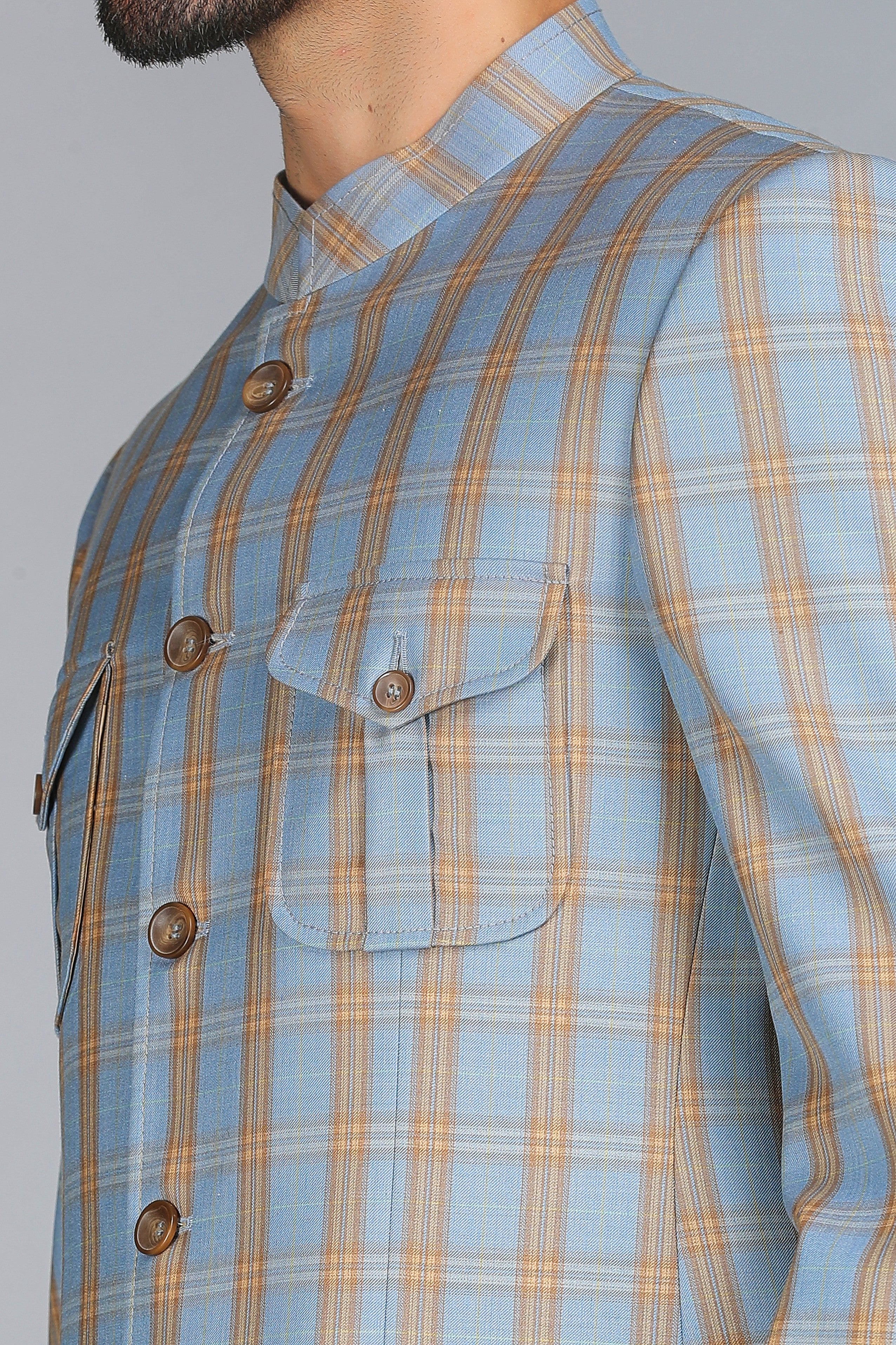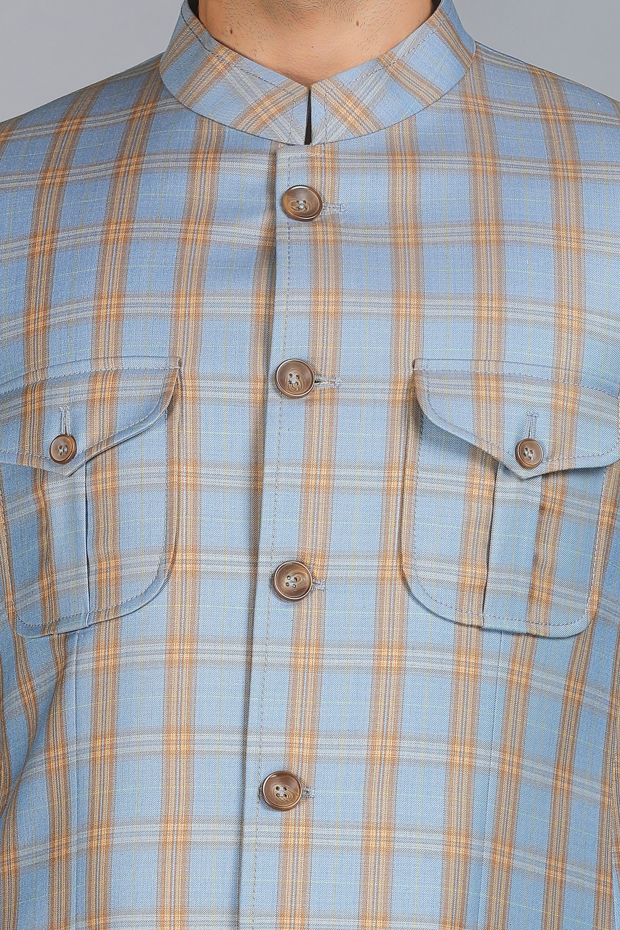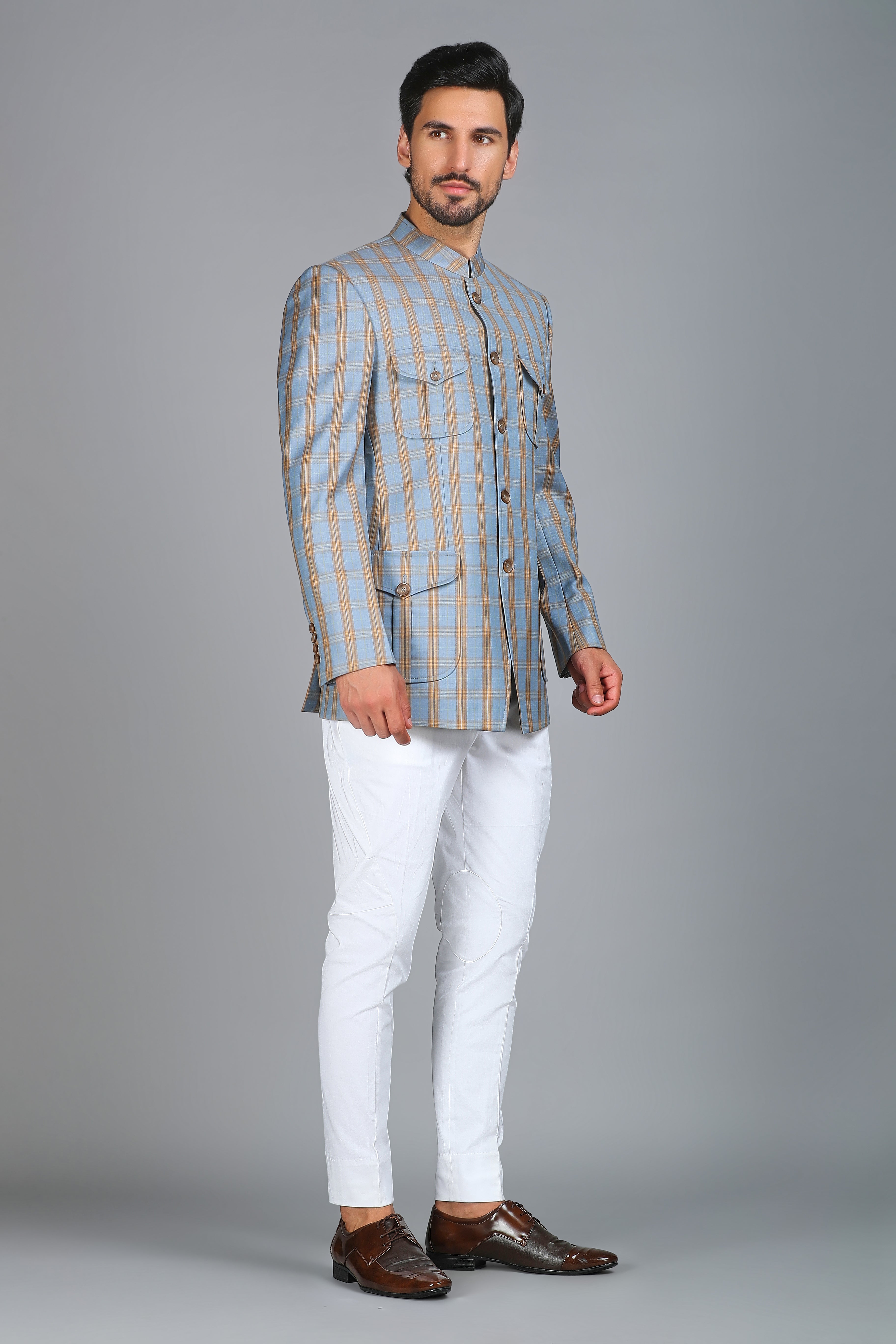 Introducing the Style 4 Patch Pocket Jodhpuri Bandhgala – a refined blend of classic elegance and contemporary design. This blue and brown checkered Jodhpuri-style Bandhgala is tailored to perfection, offering a smart body fit that enhances your silhouette. Paired effortlessly with ivory trousers, it’s a distinguished choice for formal occasions and cultural celebrations.