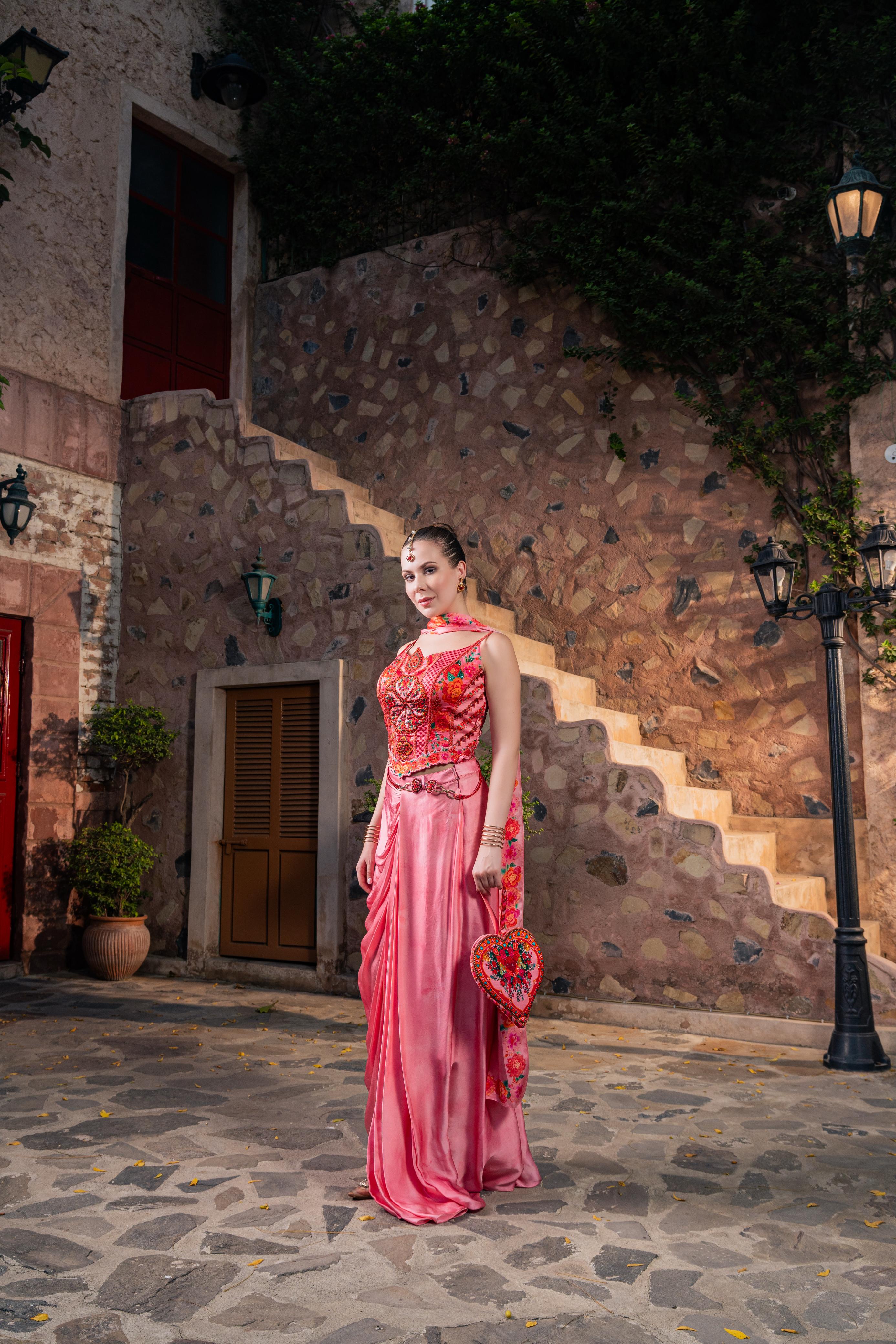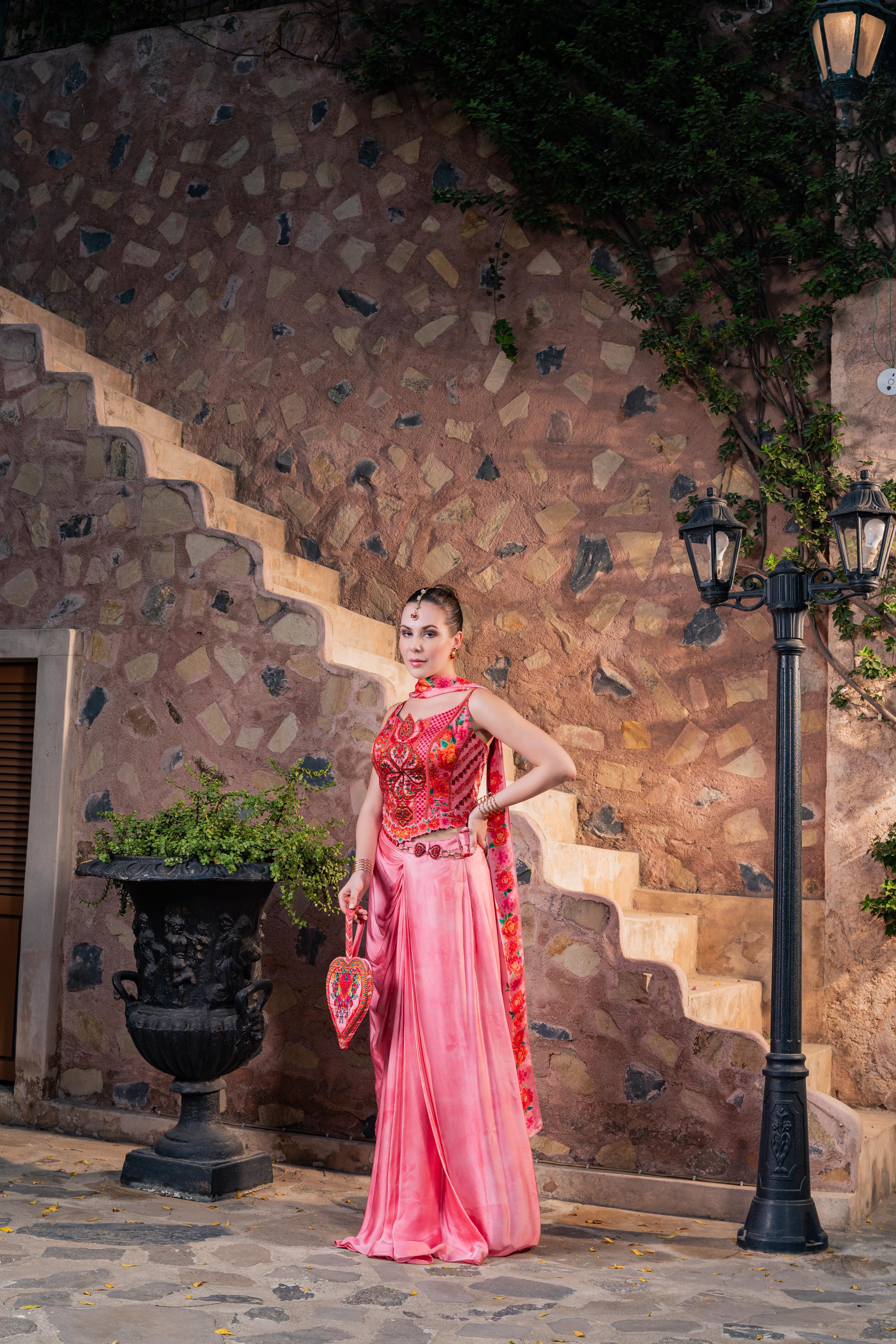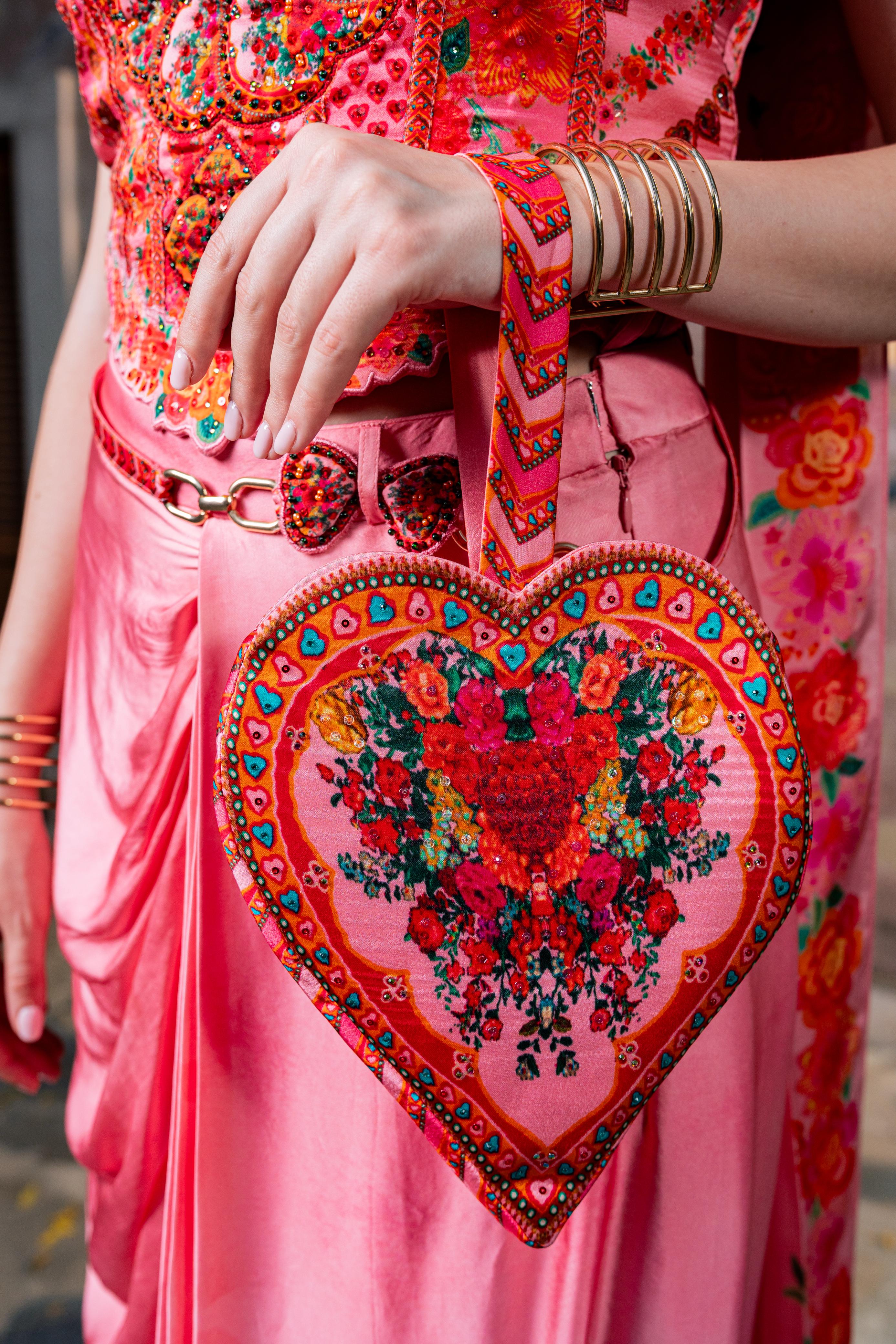 A statement waist belt and matching embroidered heart-shaped potli complete the look, making it a versatile outfit that balances playfulness with elegance. Perfect for sangeets, cocktail evenings, and festive soirées, this design celebrates femininity with a modern twist.