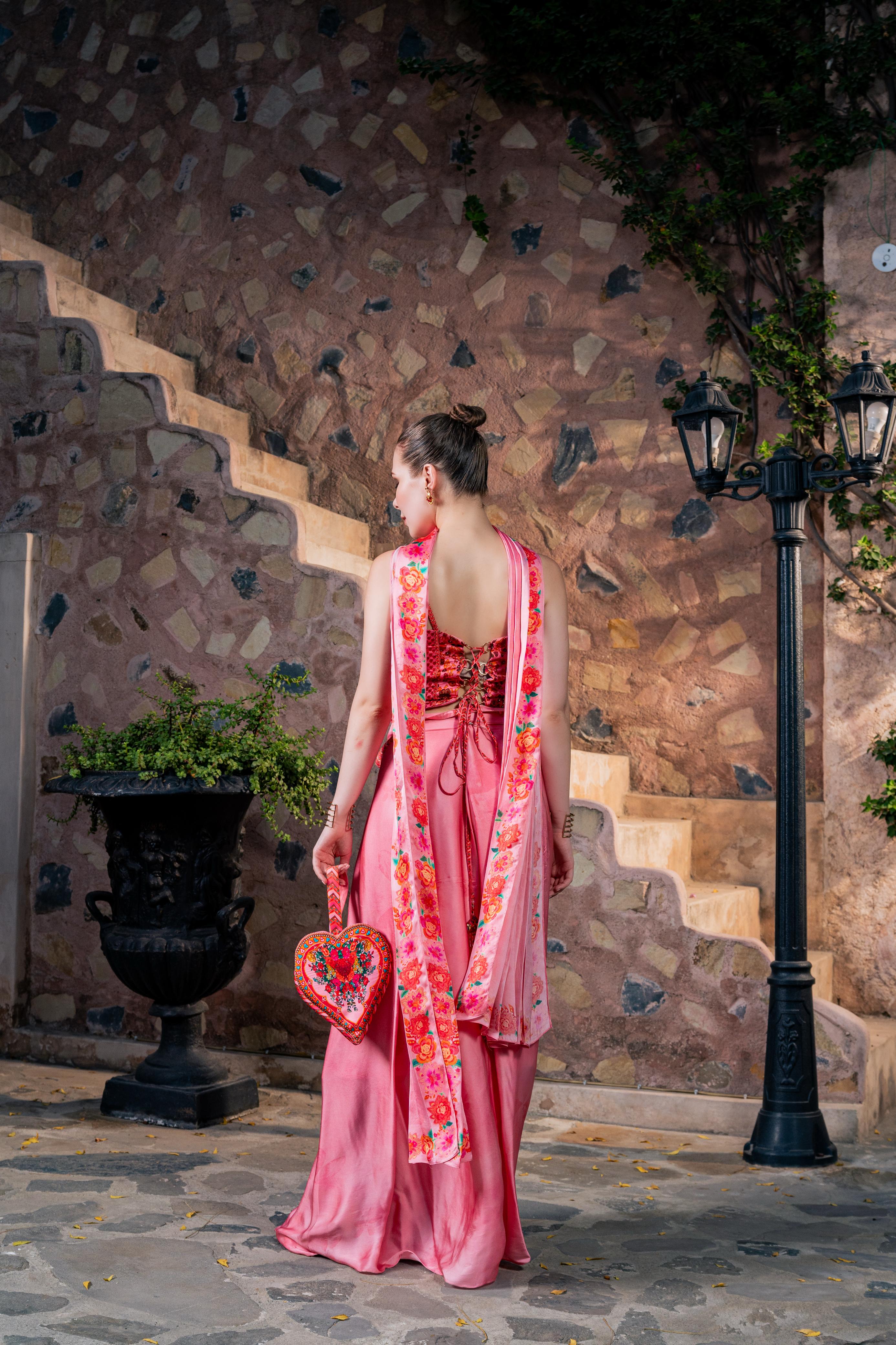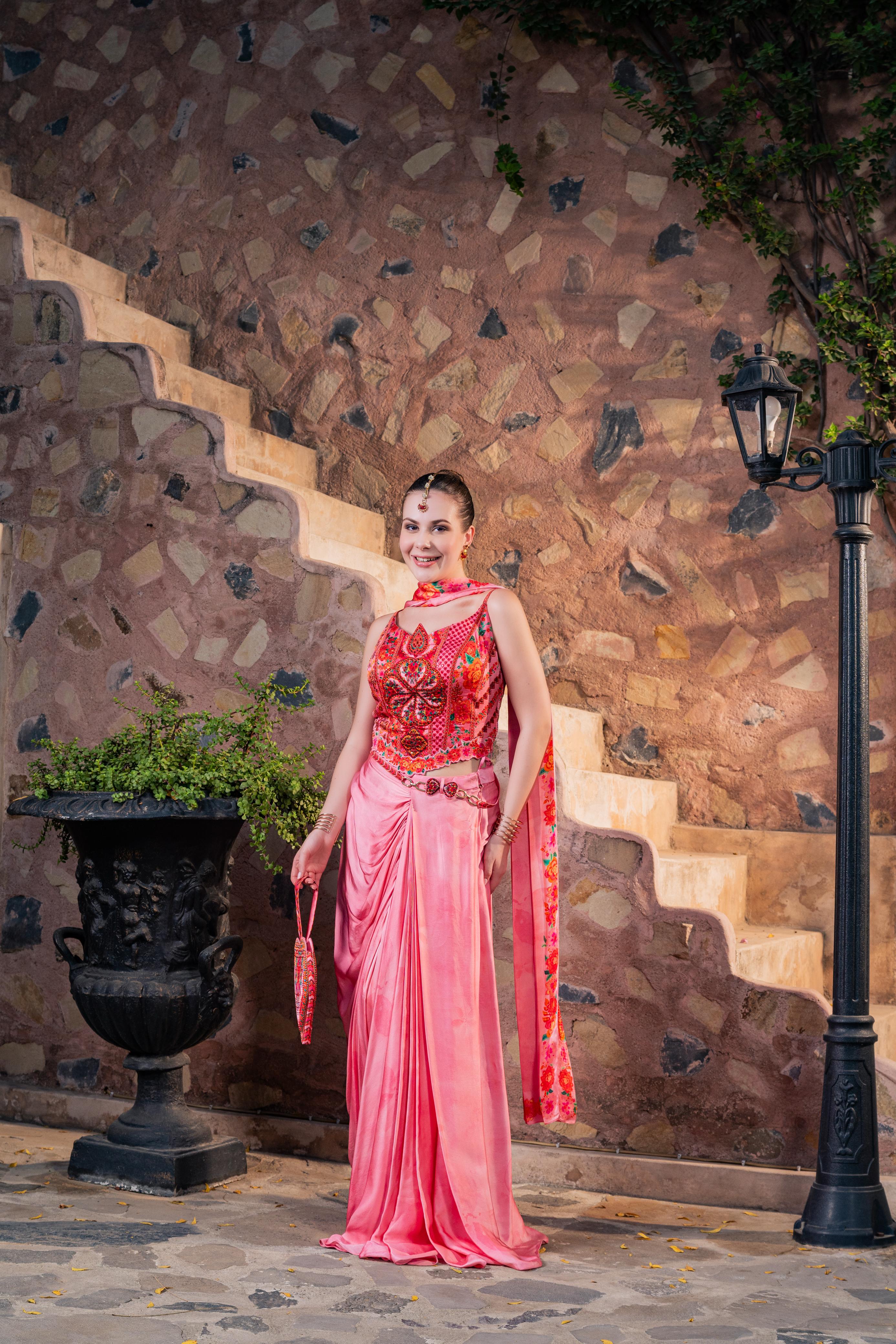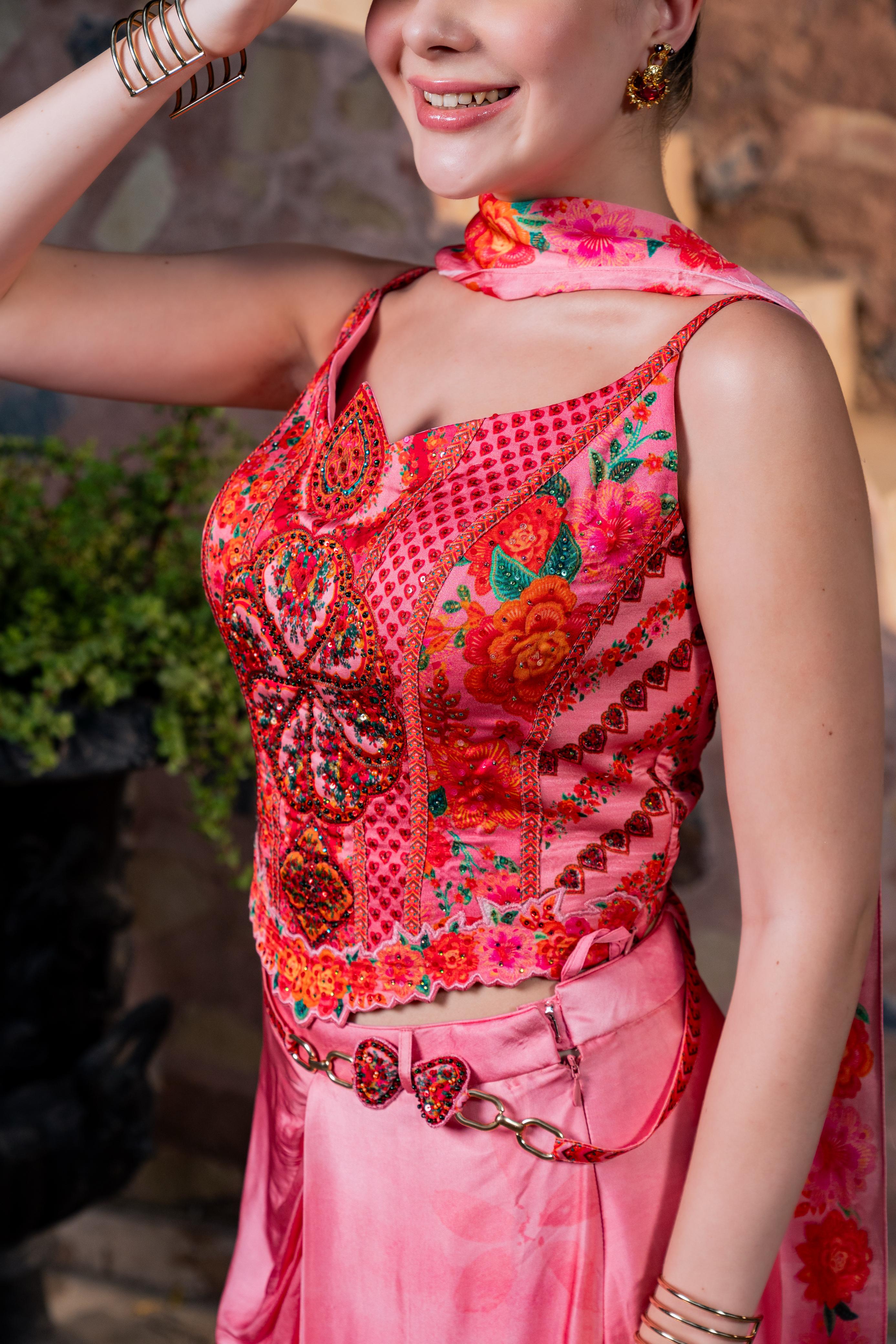 A statement waist belt and matching embroidered heart-shaped potli complete the look, making it a versatile outfit that balances playfulness with elegance. Perfect for sangeets, cocktail evenings, and festive soirées, this design celebrates femininity with a modern twist.
