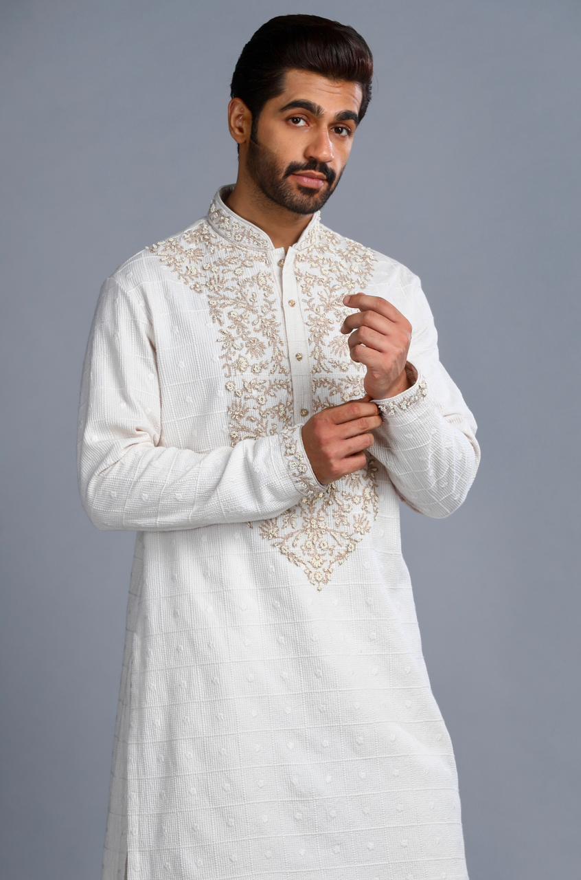 Ivory Cotton Embroidered Kurta reflects timeless elegance with delicate tonal embroidery adorning the front panel on a textured cotton base. Designed with a refined mandarin collar and subtle button detailing, this kurta offers breathable comfort and graceful appeal—perfect for festive occasions and traditional celebrations.