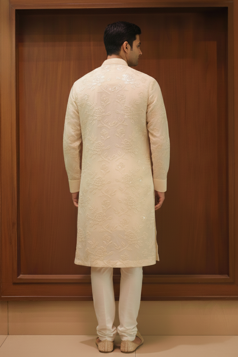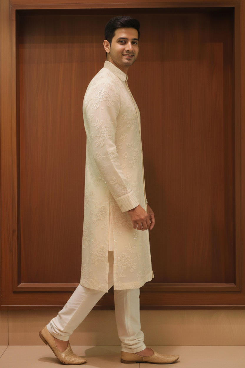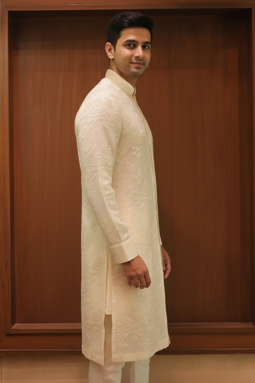 Ivory Organza Embroidered Kurta Set exudes understated luxury with delicate all-over floral embroidery on a sheer organza base. Designed with a refined mandarin collar and tonal button placket, it is paired with a matching trouser for a complete ensemble. Ideal for weddings, festive celebrations, and elegant traditional occasions.