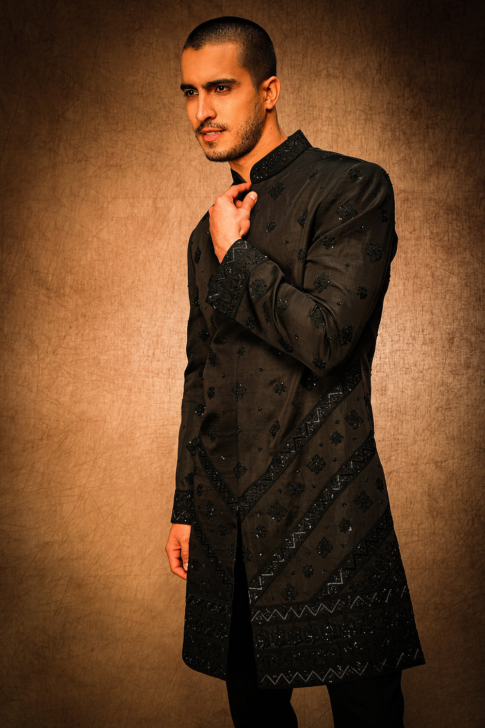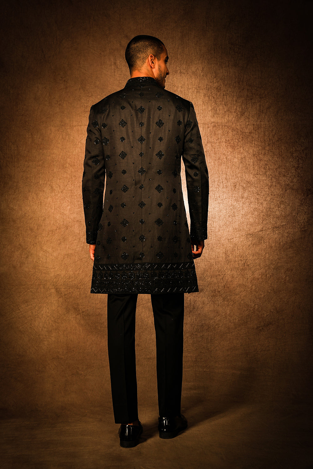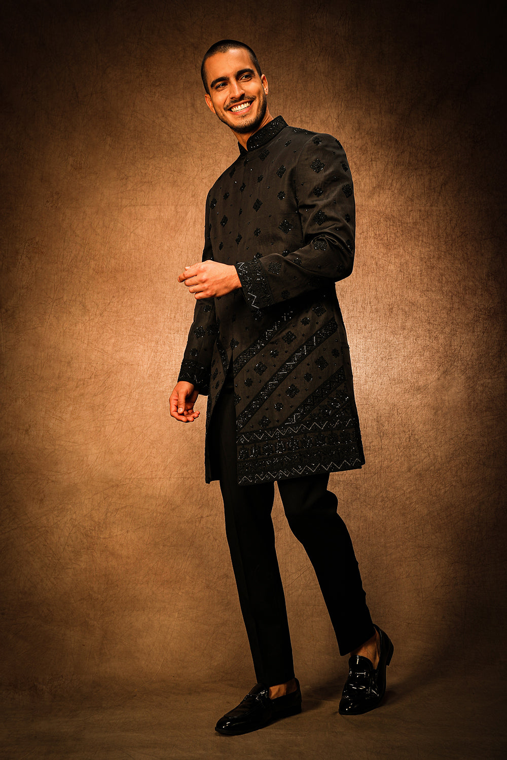 - Catch the eyes of the Bridesmaids as you dazzle in this Black Indowestern Crafted in Linen Satin with black Kiran Dori, sequins, and bugle beads. To complete the look, it can be paired with trousers, polo pants and churidar (available in bottoms section)