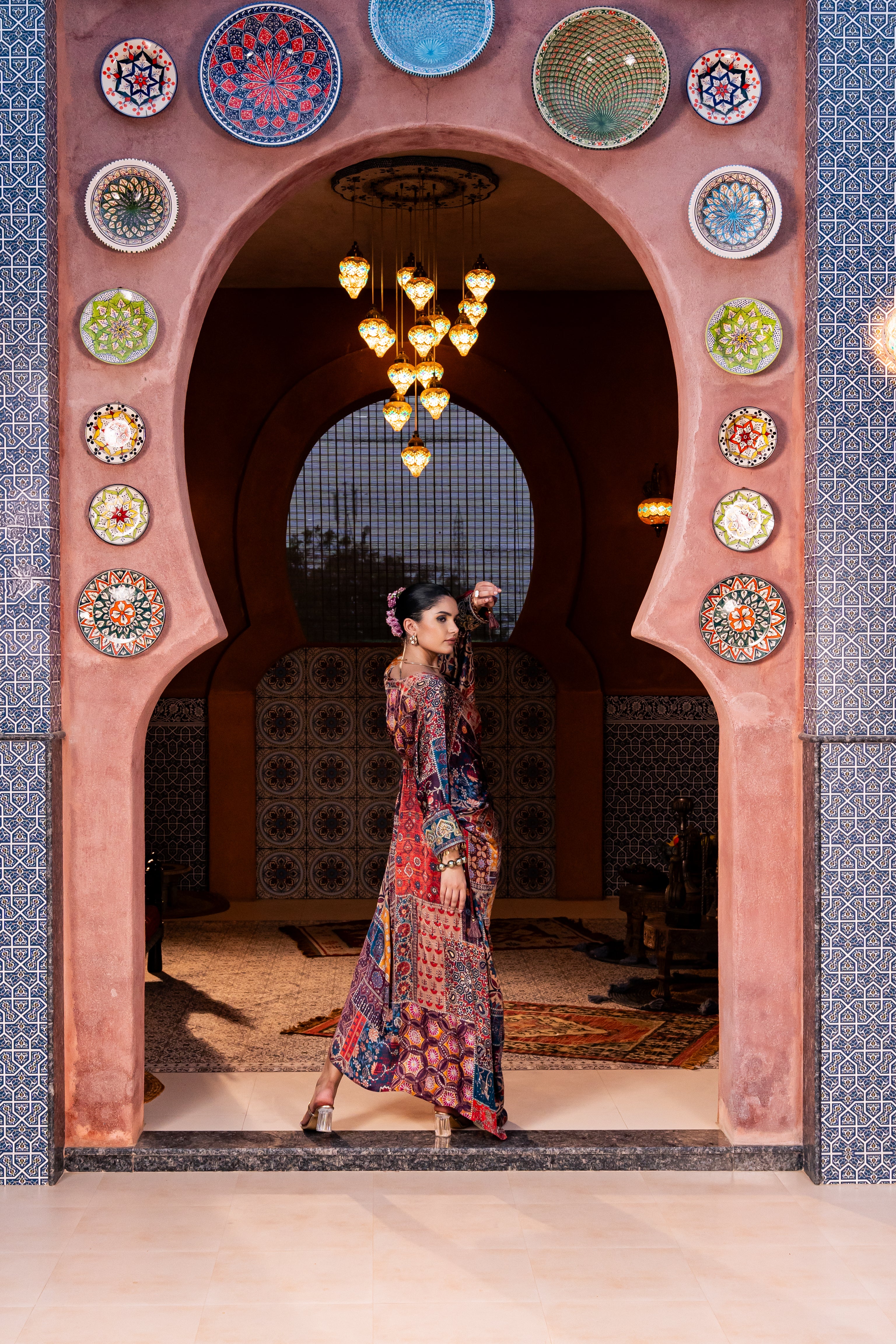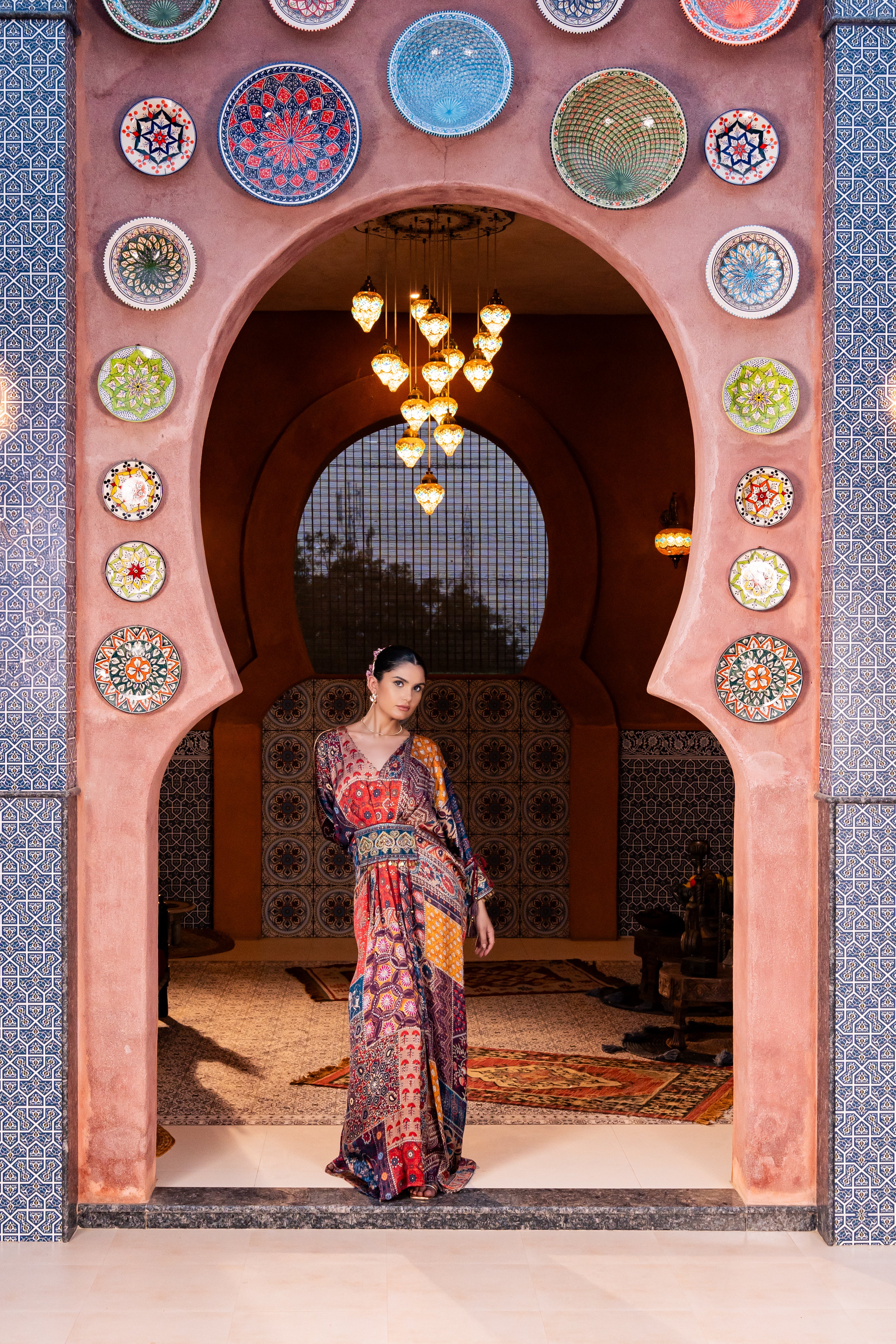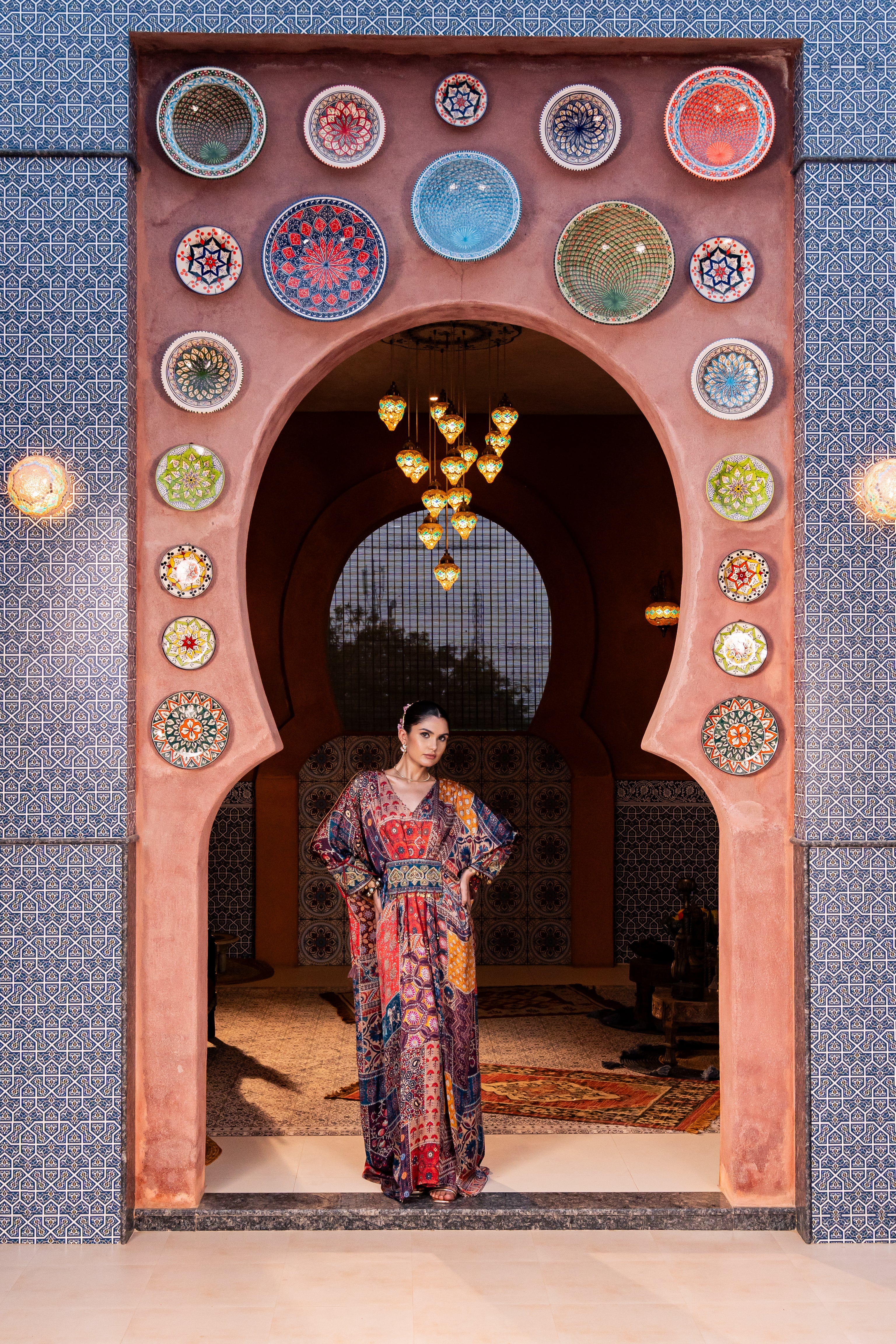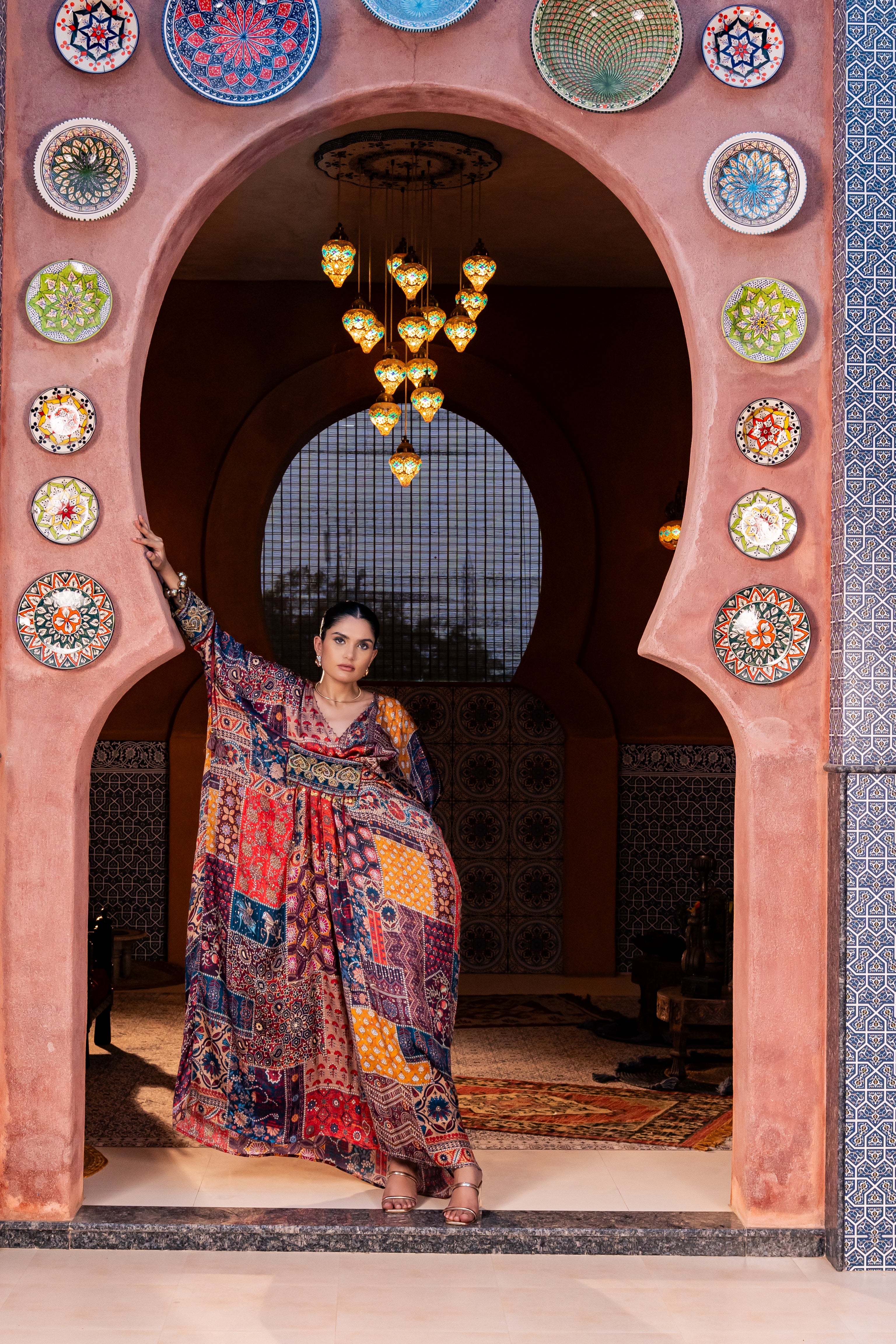 The neckline is intricately embellished, adding a touch of regal charm to this boho-chic ensemble. Perfect for resort getaways, evening soirées, or festive celebrations, this kaftaan blends tradition with contemporary flair, making it a versatile wardrobe statement.