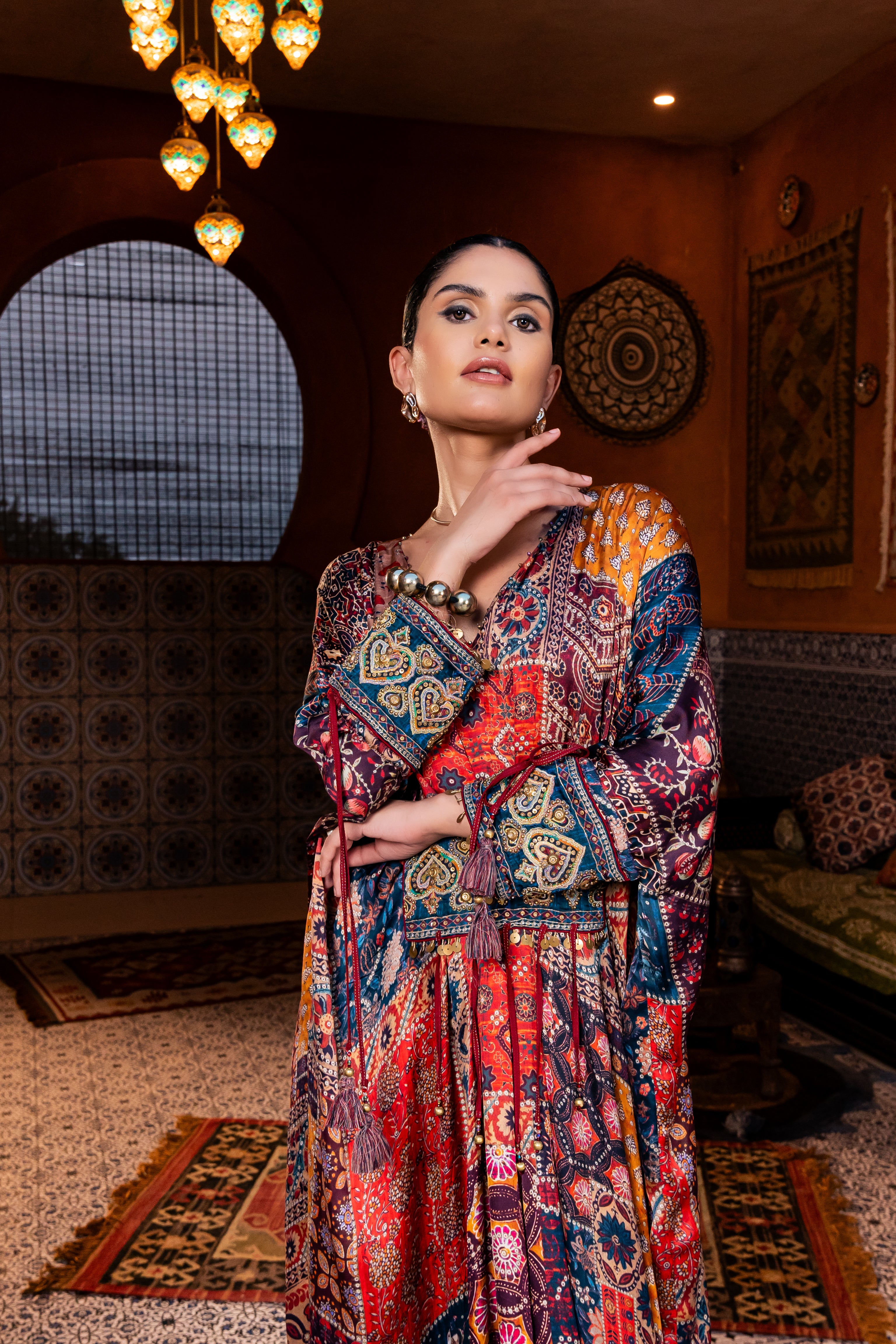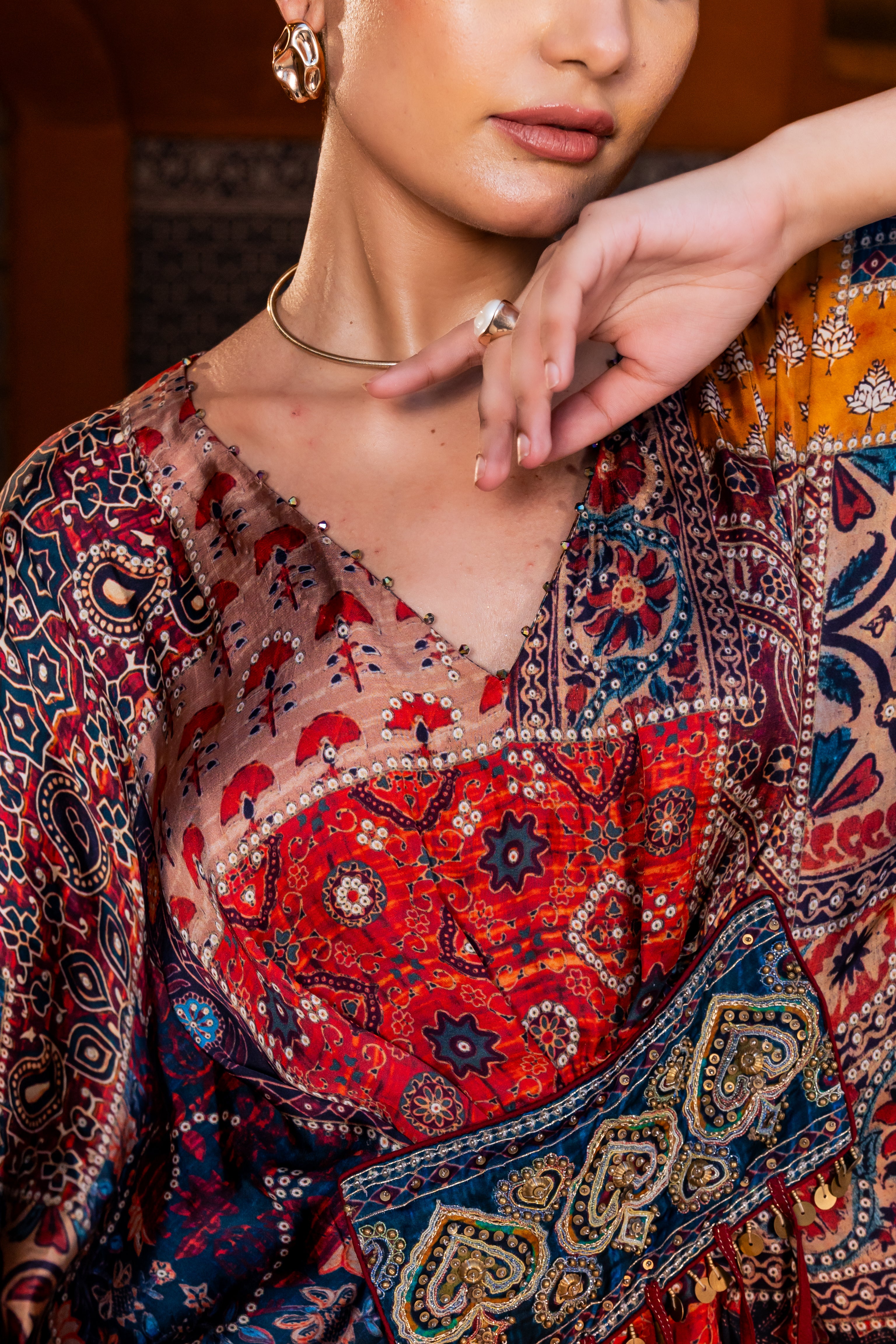 This free-flowing silhouette is a canvas of vibrant artistry, featuring a patchwork-inspired design in jewel tones of ruby, sapphire, amber, and emerald. Crafted from a lightweight, fluid fabric, it drapes gracefully to offer both comfort and sophistication.
