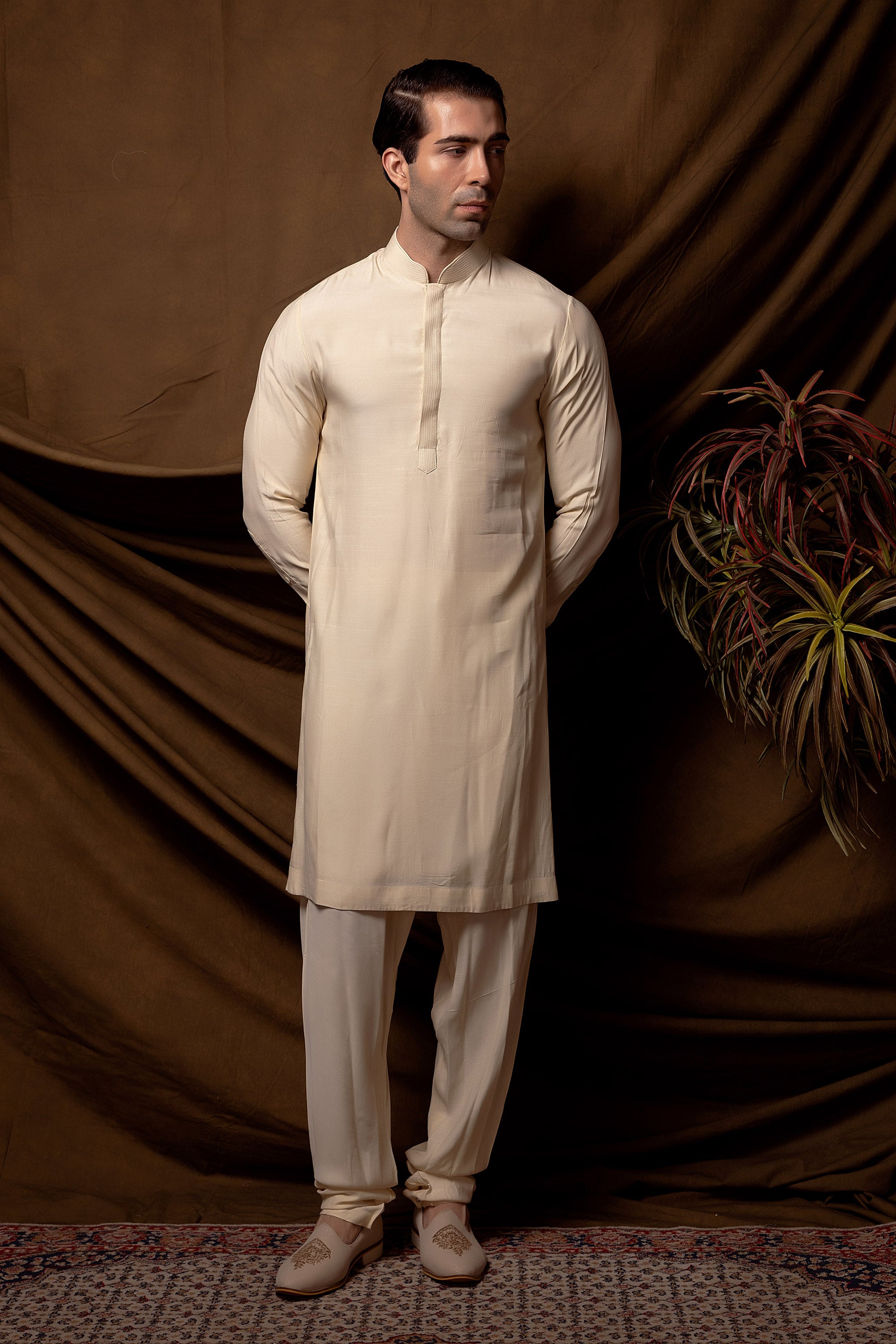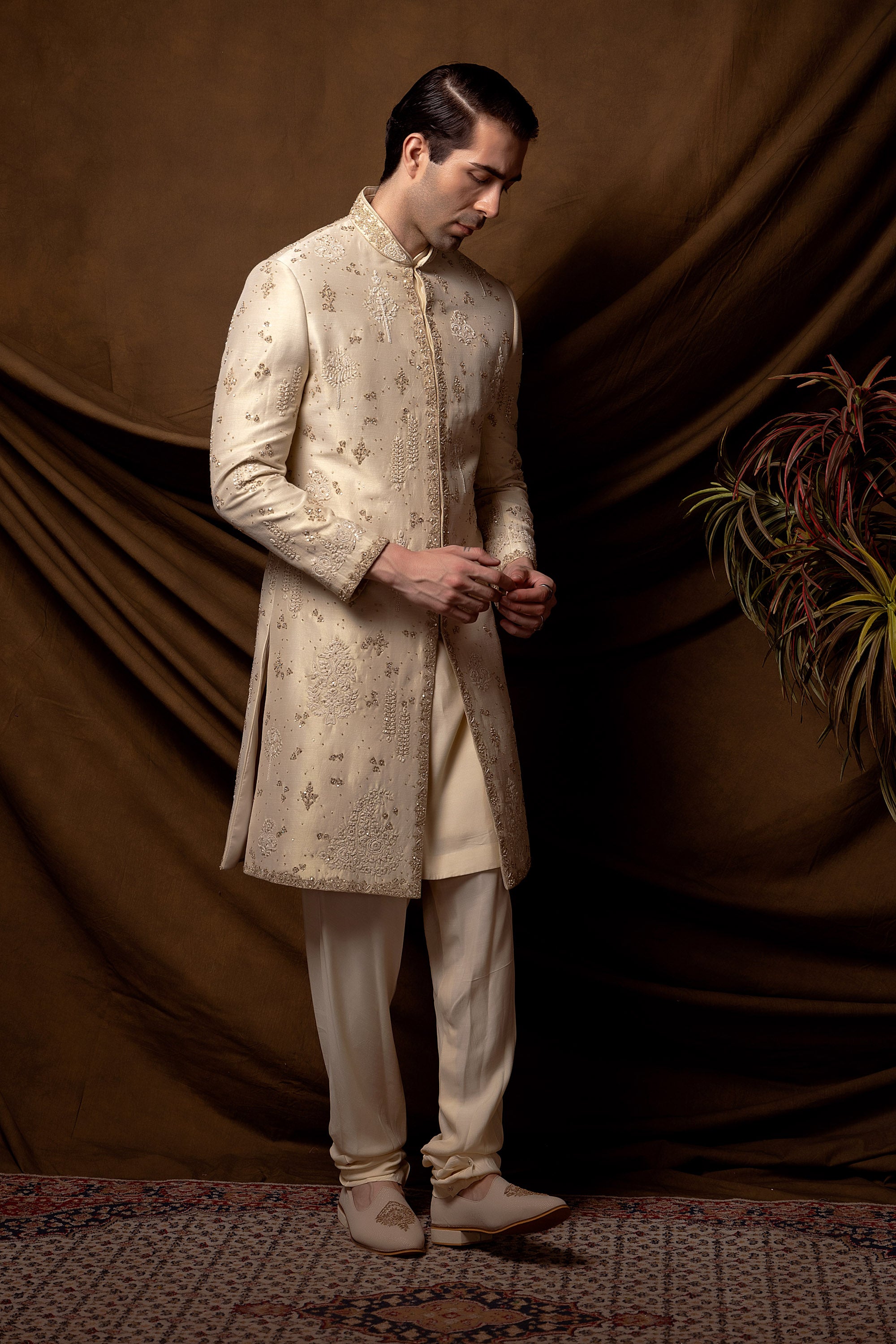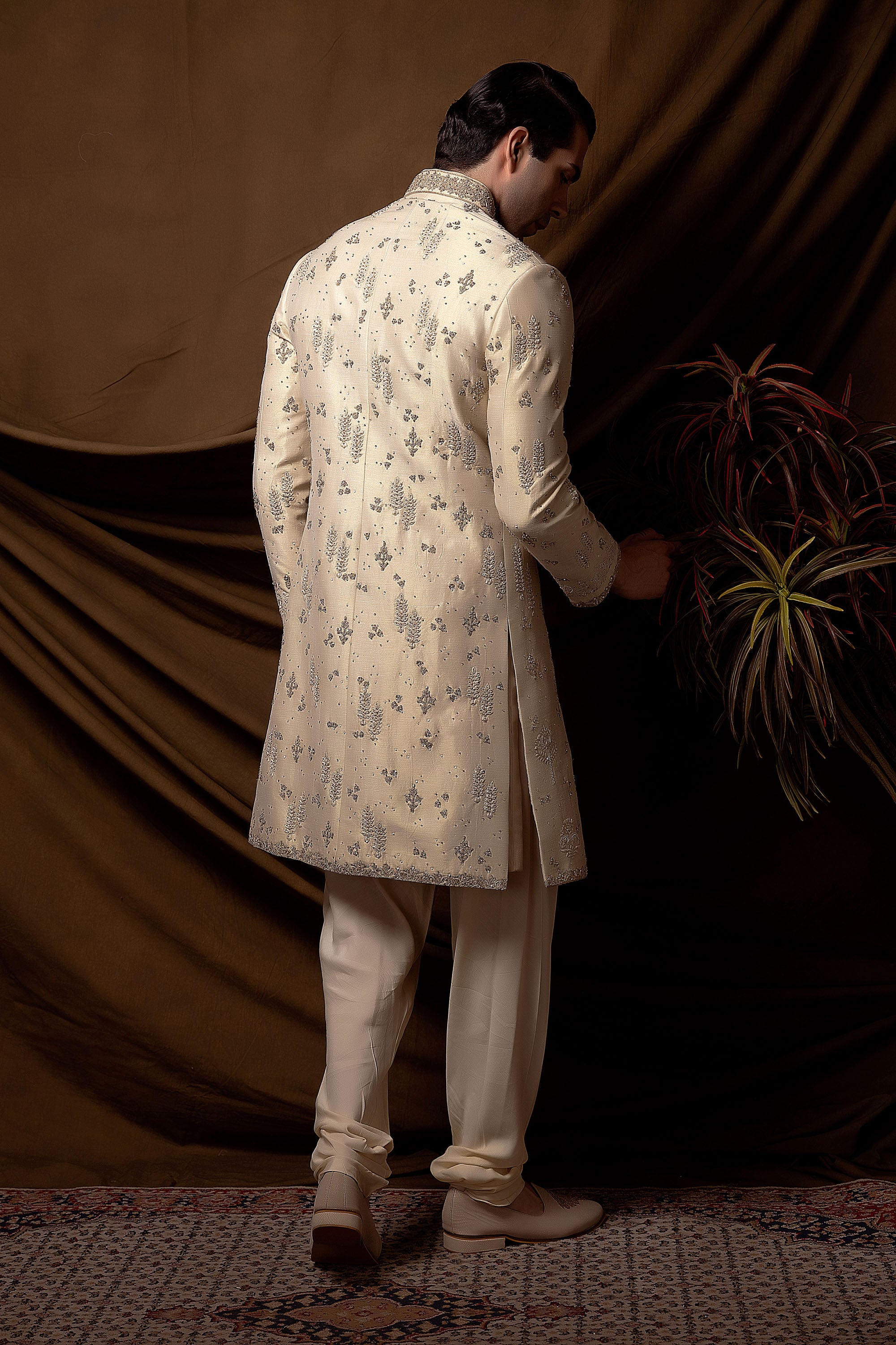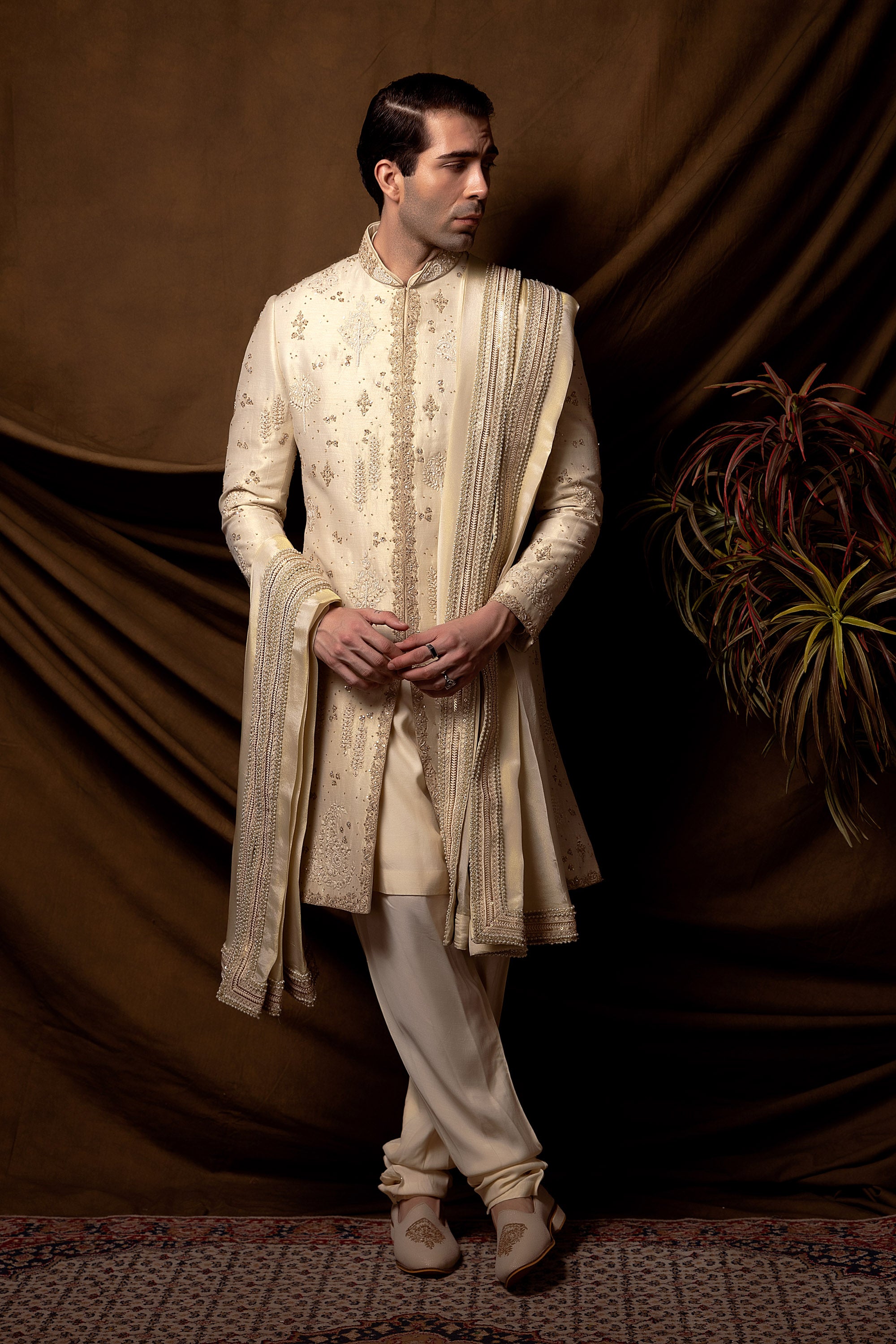 Ivory Majesty Cut Dana & Beadwork Sherwani Set is a statement piece for the modern groom, exquisitely designed with meticulously placed motifs across the entire ensemble. This sherwani features heavily intricate hand embroidery that adds depth, along with cut dana and thoughtfully placed sequins, as well as clusters of beadwork, making this sherwani a true standout. Its unique, off-beat detailing makes it the perfect choice for a distinguished, fashion-forward groom.