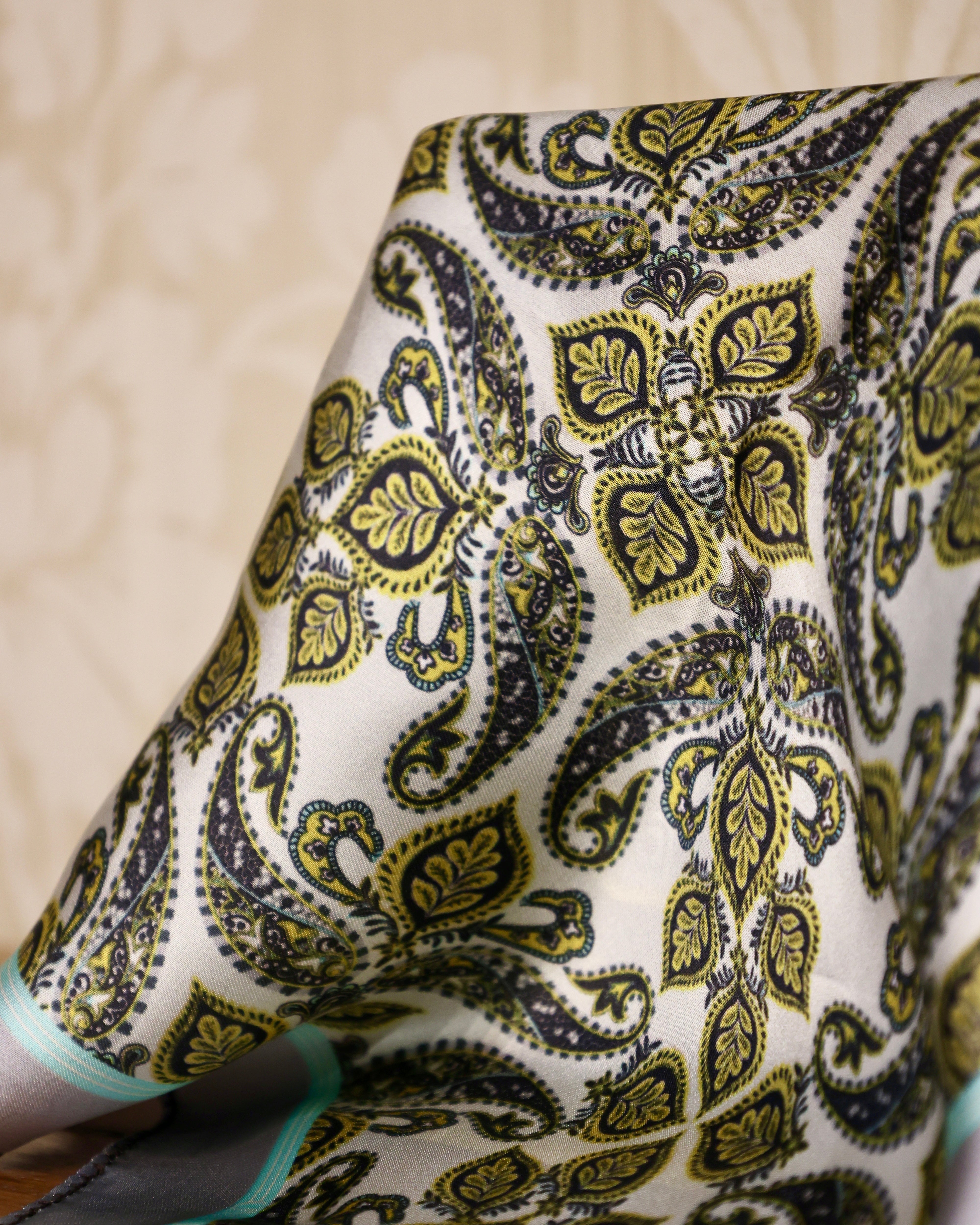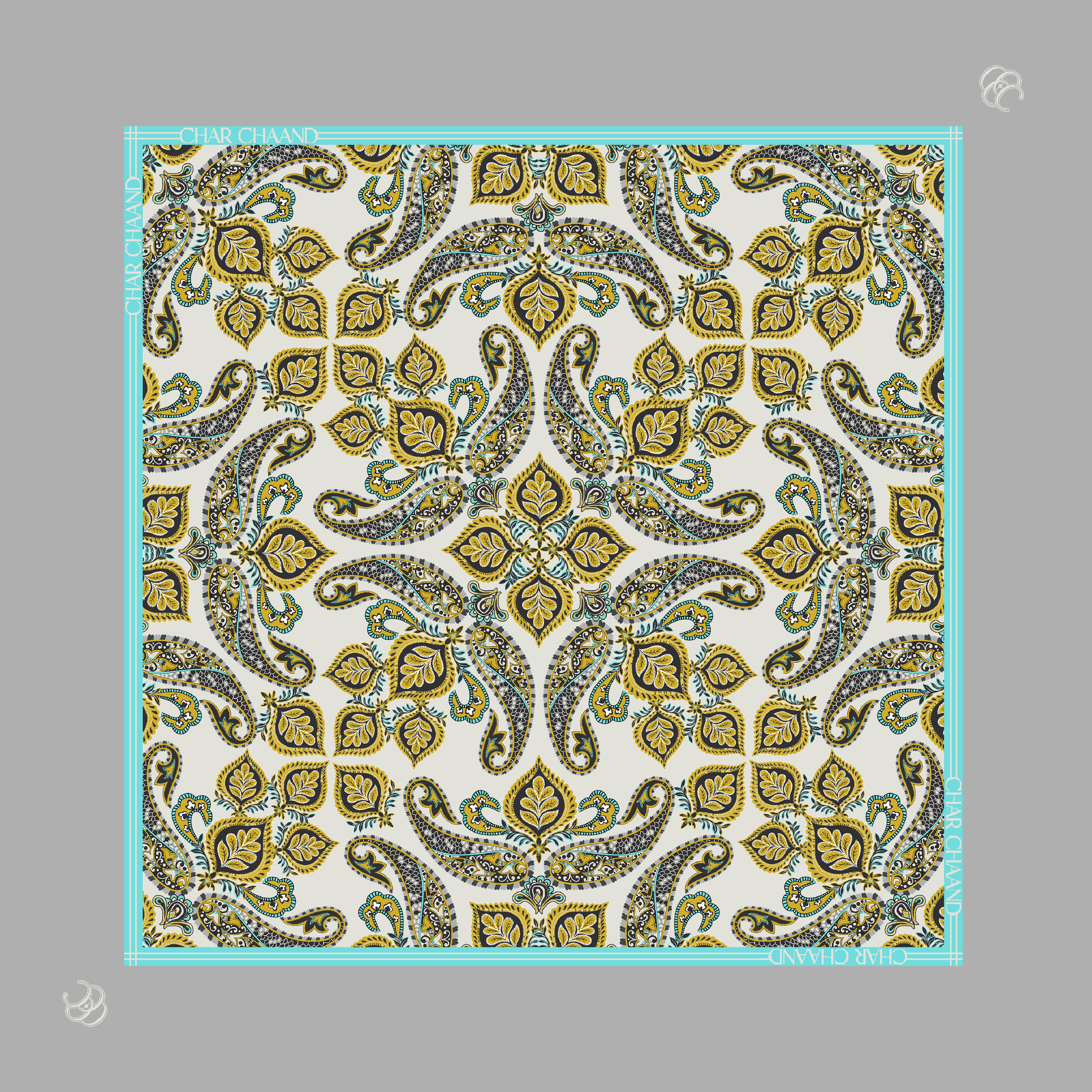 "Oceanic Symphony" features a mesmerising geometric pattern in teal, gold, and black hues, inspired by Baroque art and the soothing flow of ocean waves. Its symmetrical design embodies balance and sophistication.