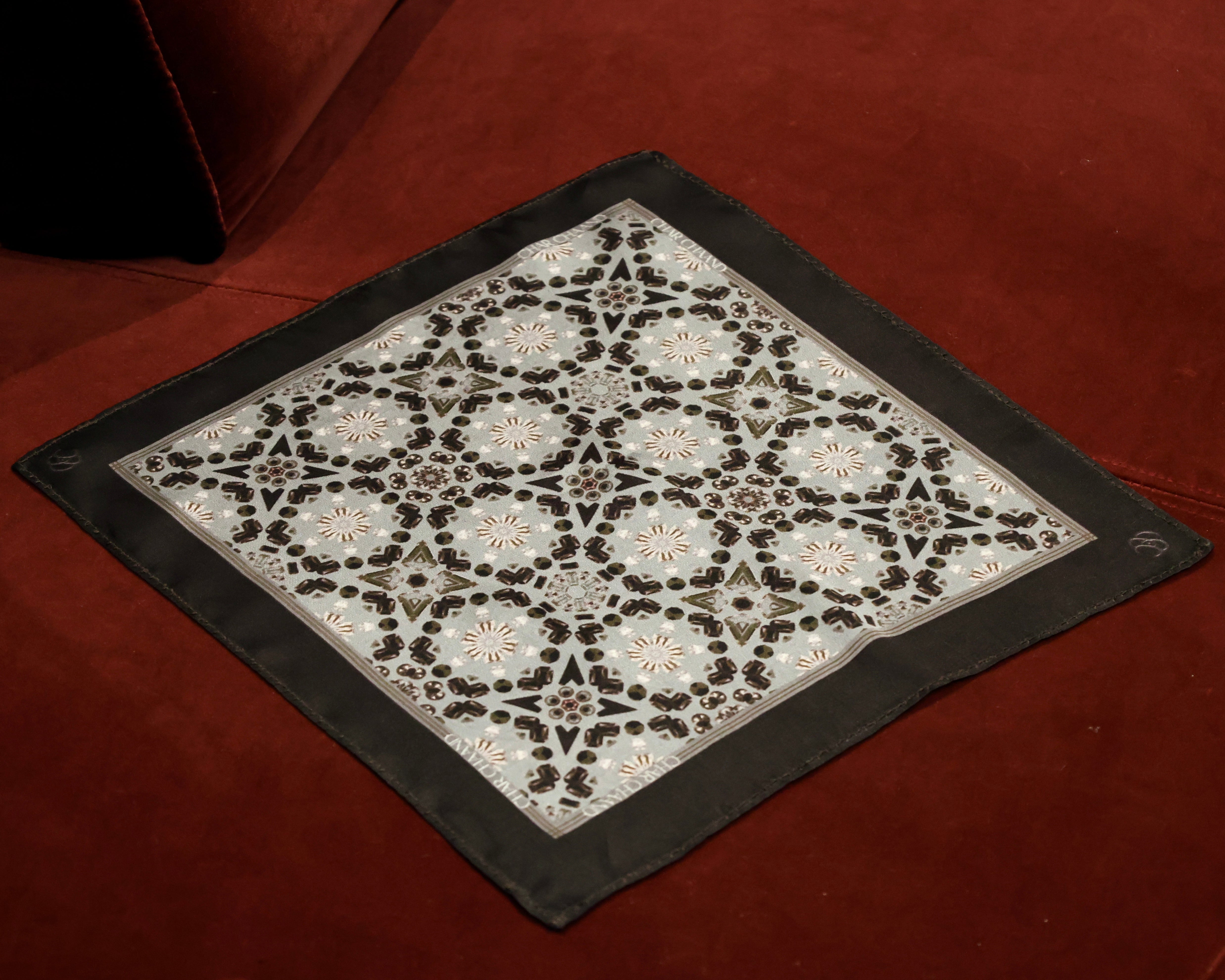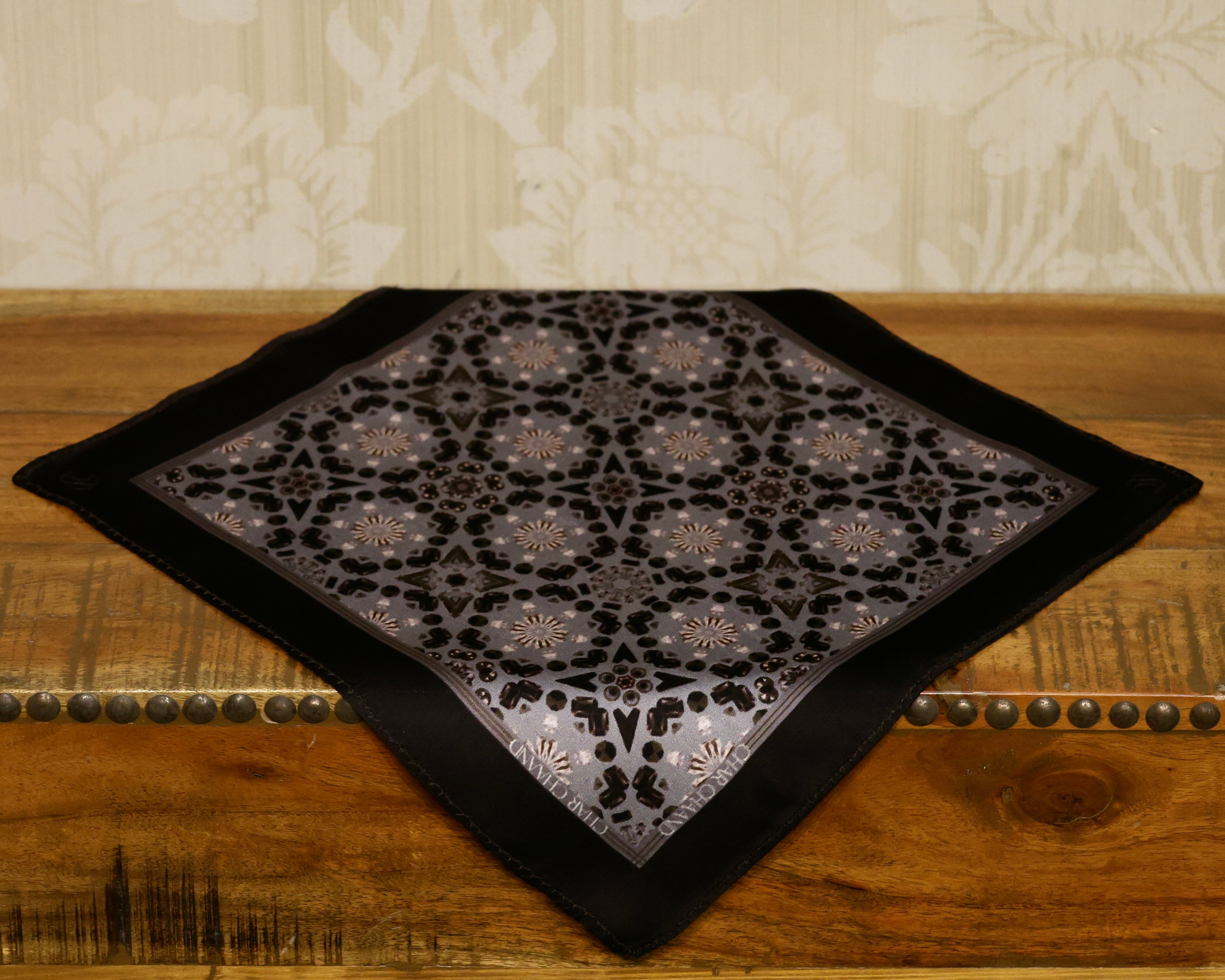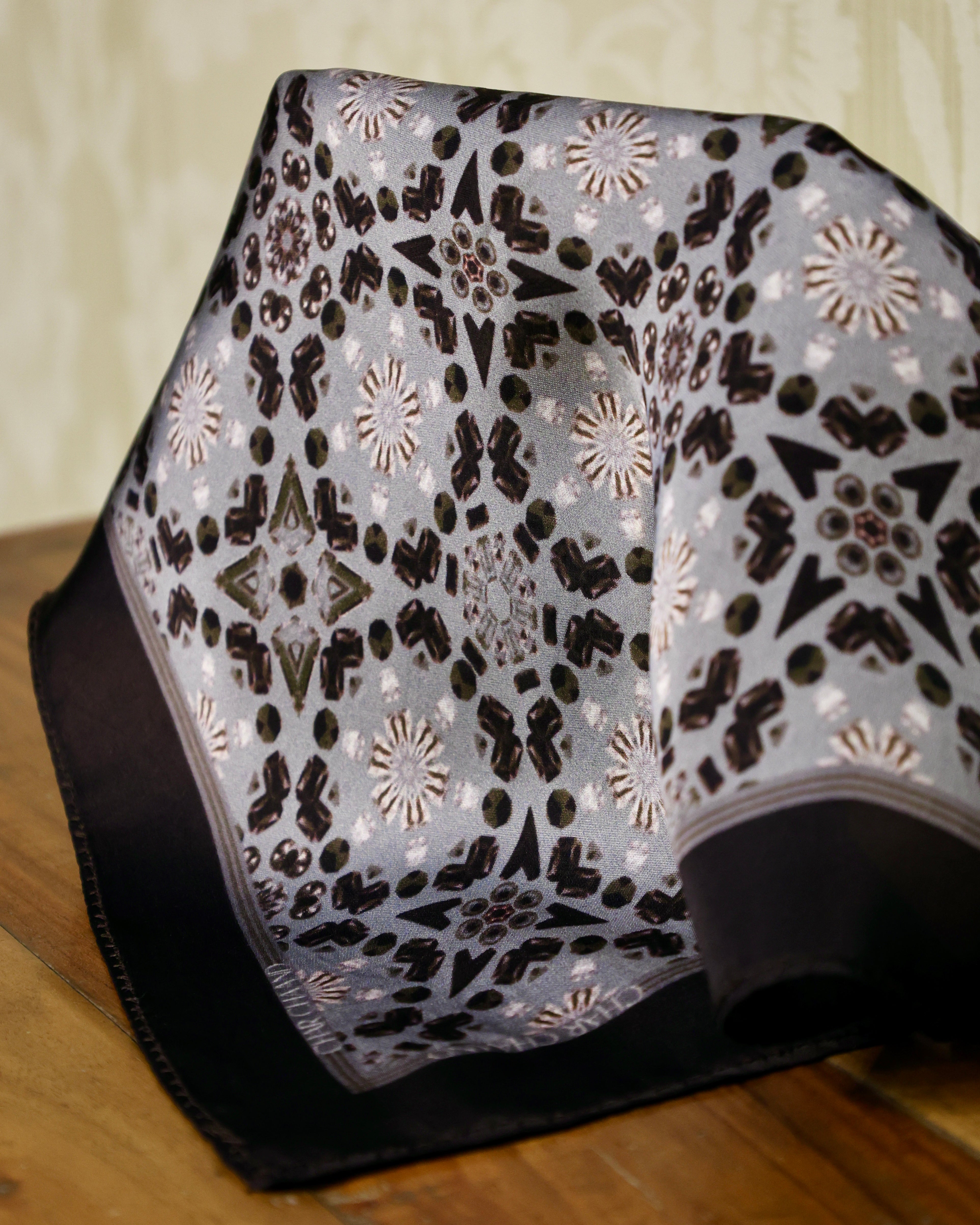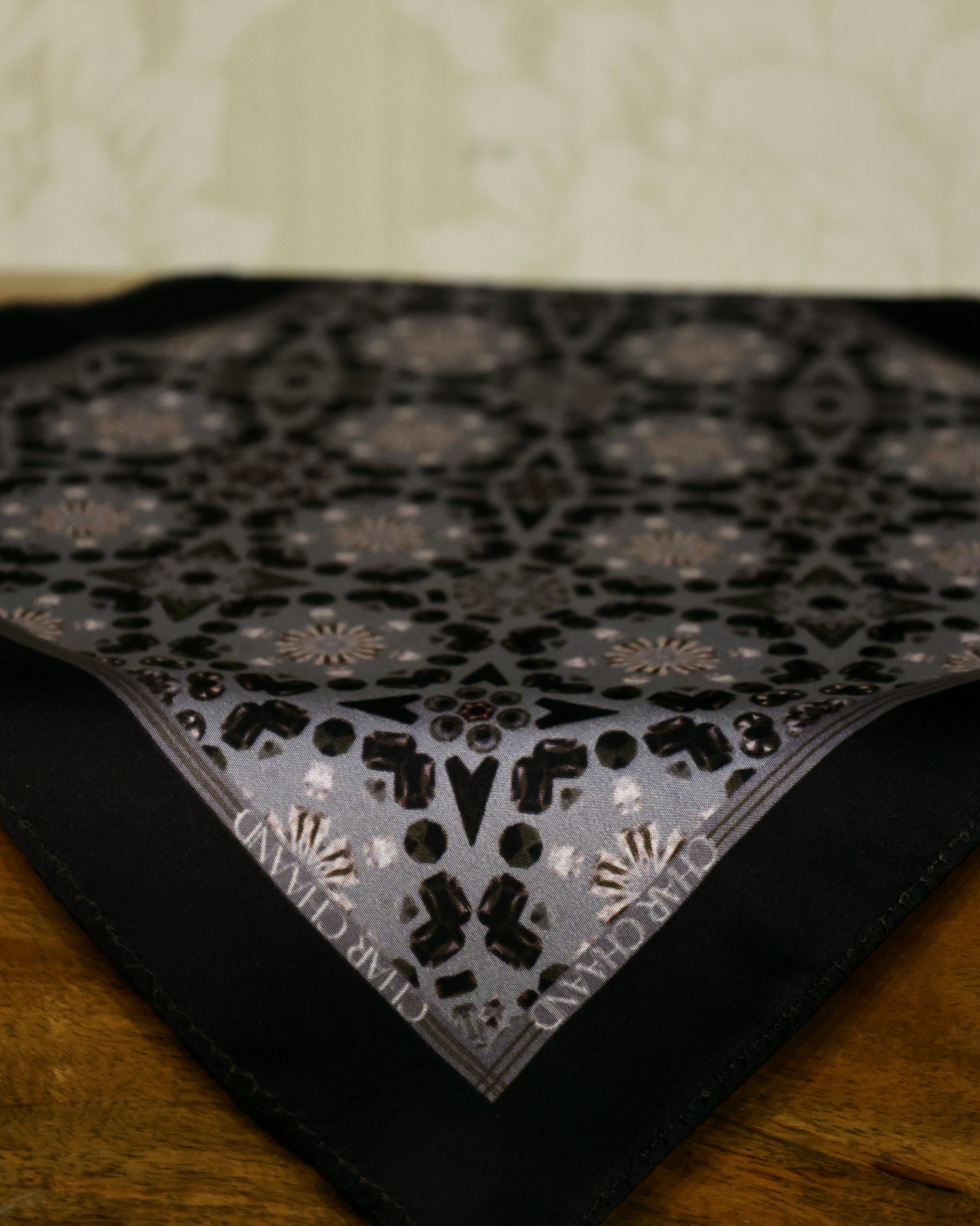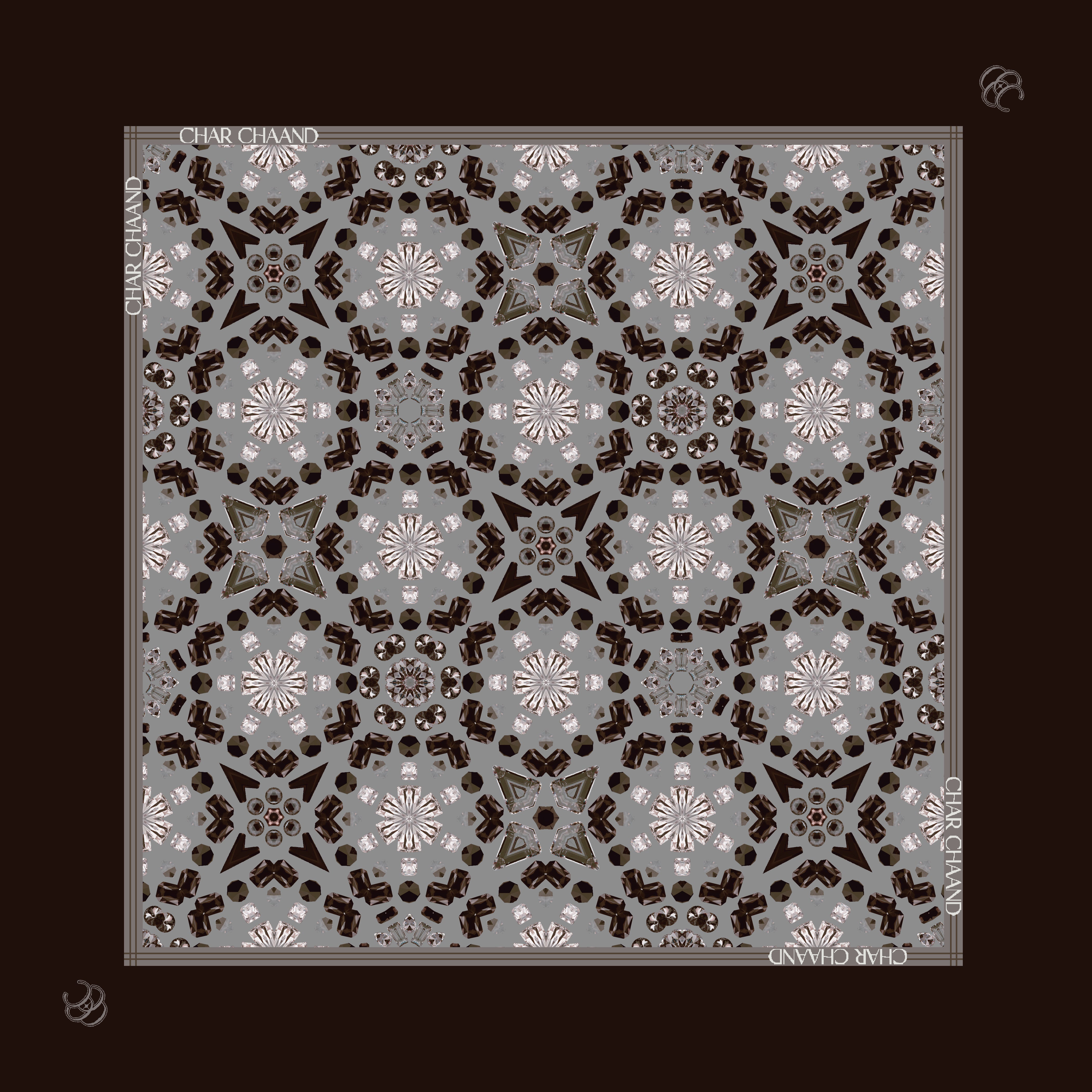 "Twilight Elegance" features a captivating interplay of greys and dark browns, accented with star-shaped kaleidoscopic motifs. Its delicate white details add a subtle shimmer, reminiscent of moonlight reflecting on intricate patterns.