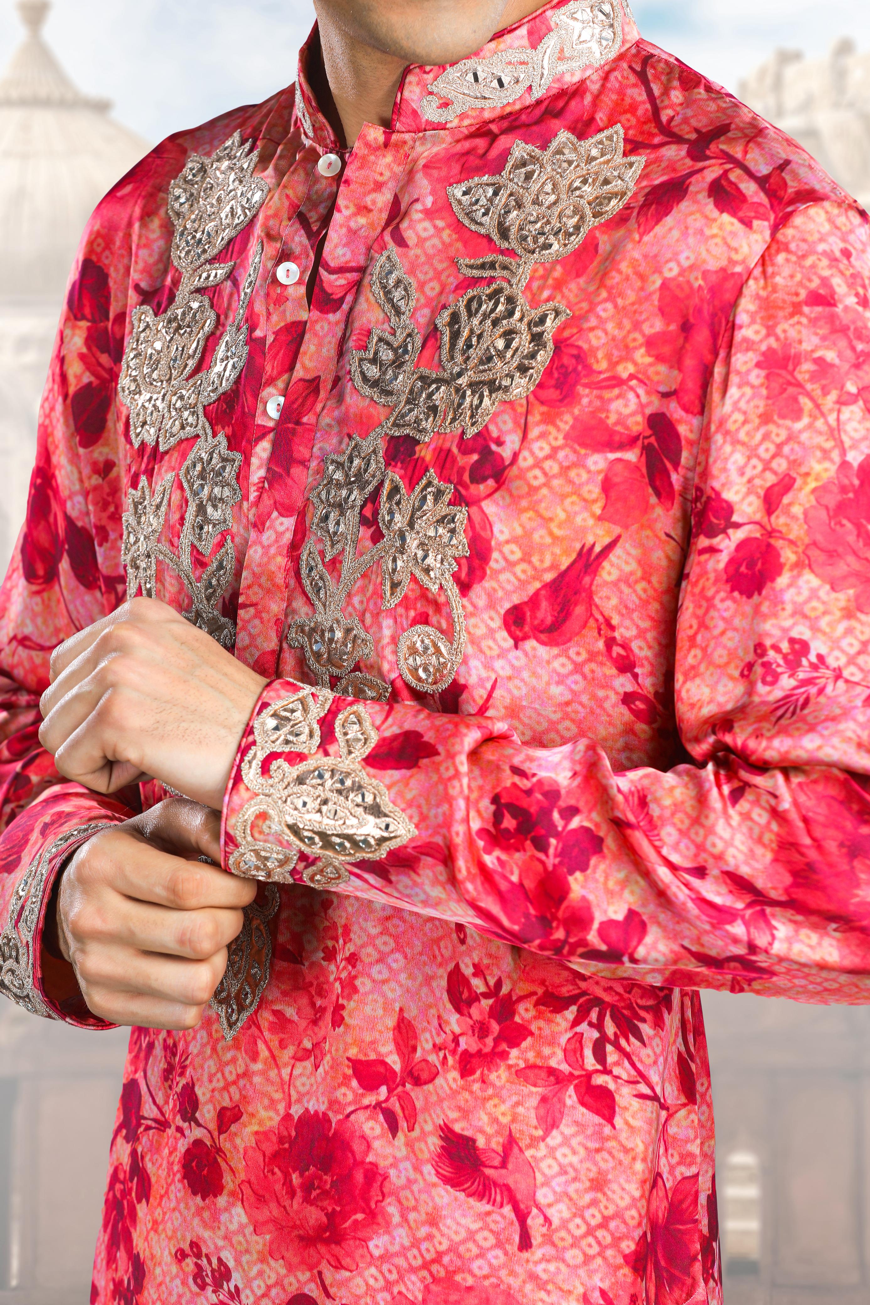 Introducing the Floral Embellished Rani Rose Kurta, a luxurious satin silk kurta that showcases a captivating rani rose colour tone, beautifully enhanced by a vibrant floral digital print. Featuring intricate leather appliqué work along with dori and mirror embellishments, the design incorporates offbeat placements that add a unique touch. The perfect blend of shimmer and rich patterns makes this kurta an ideal choice for all special occasions.