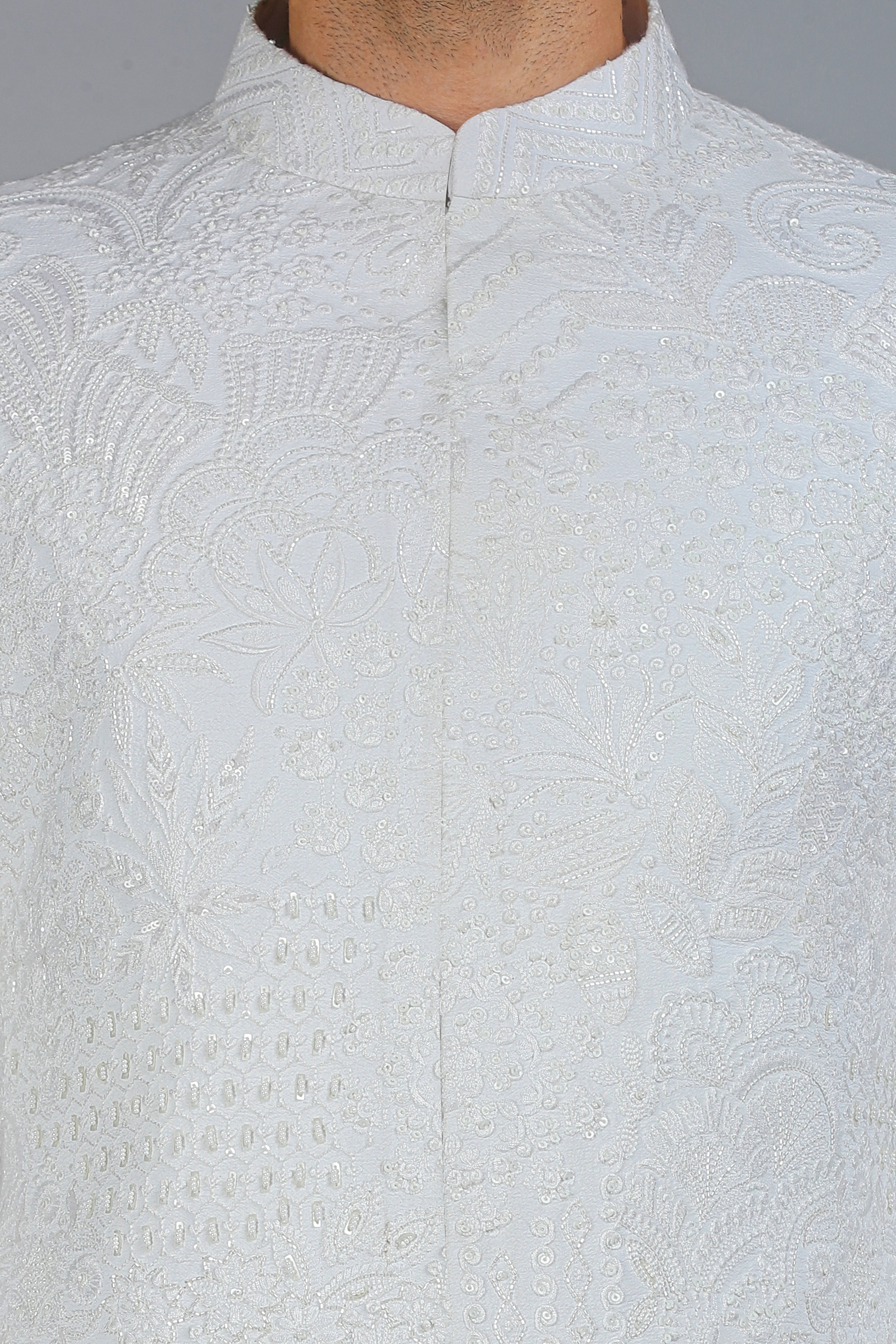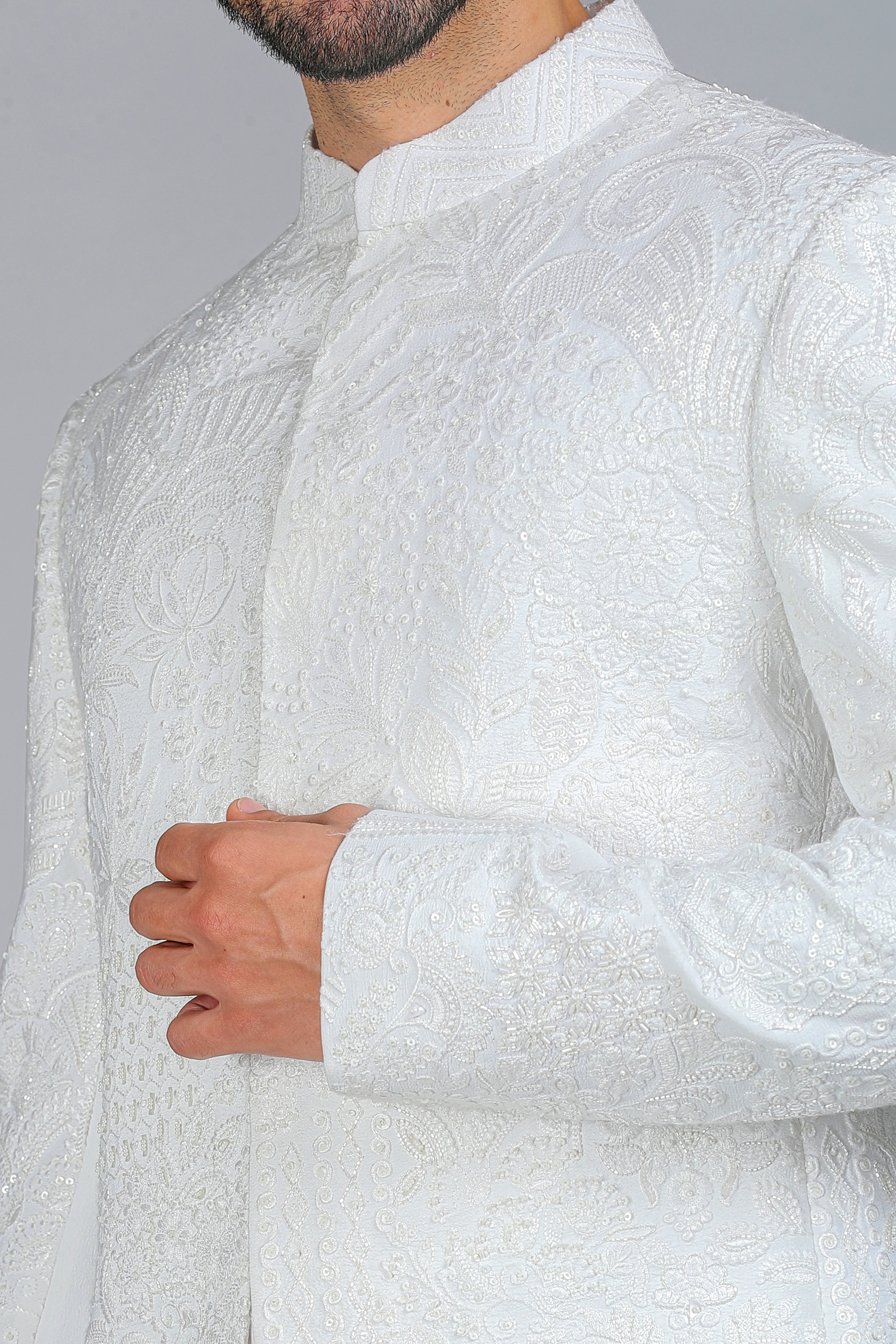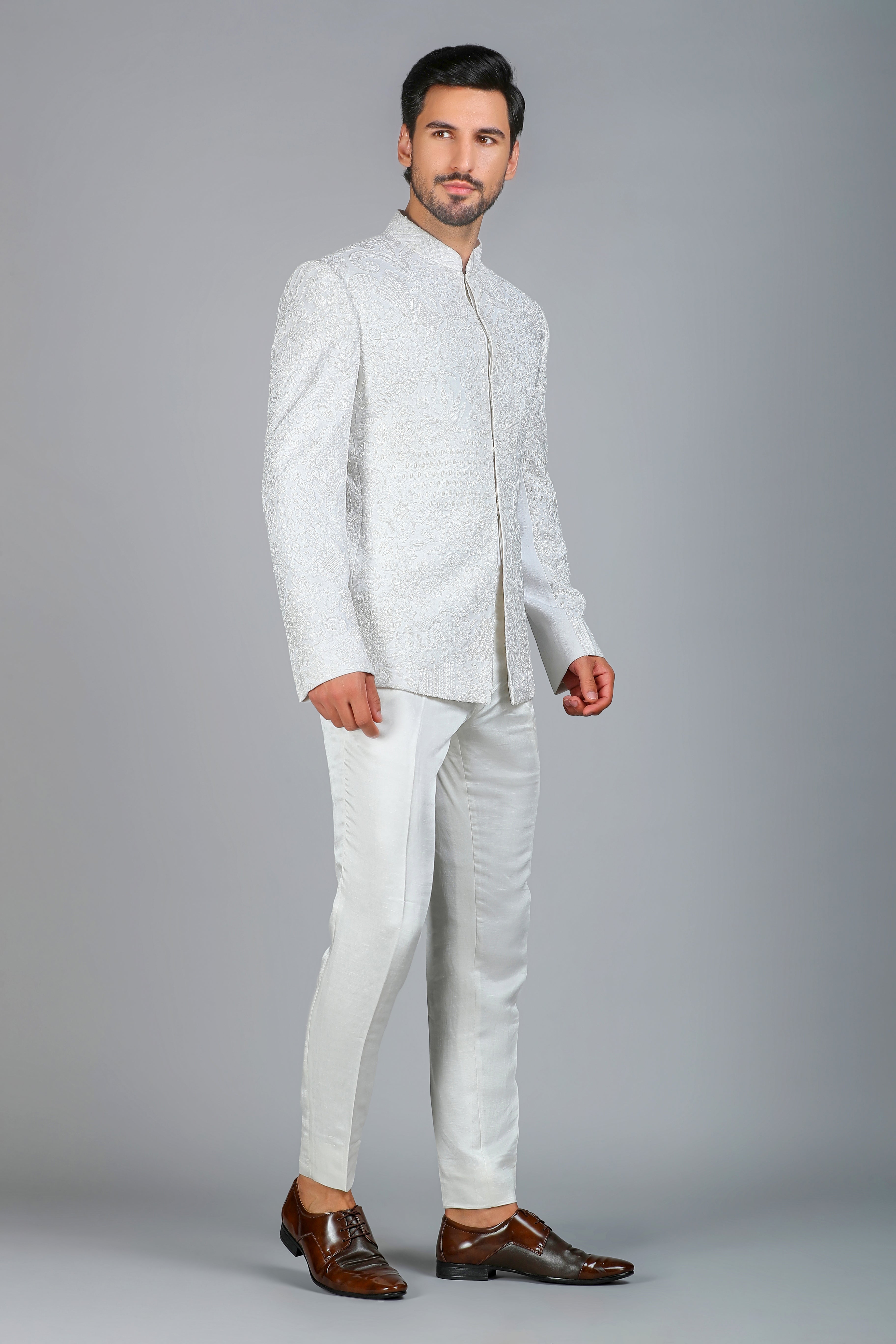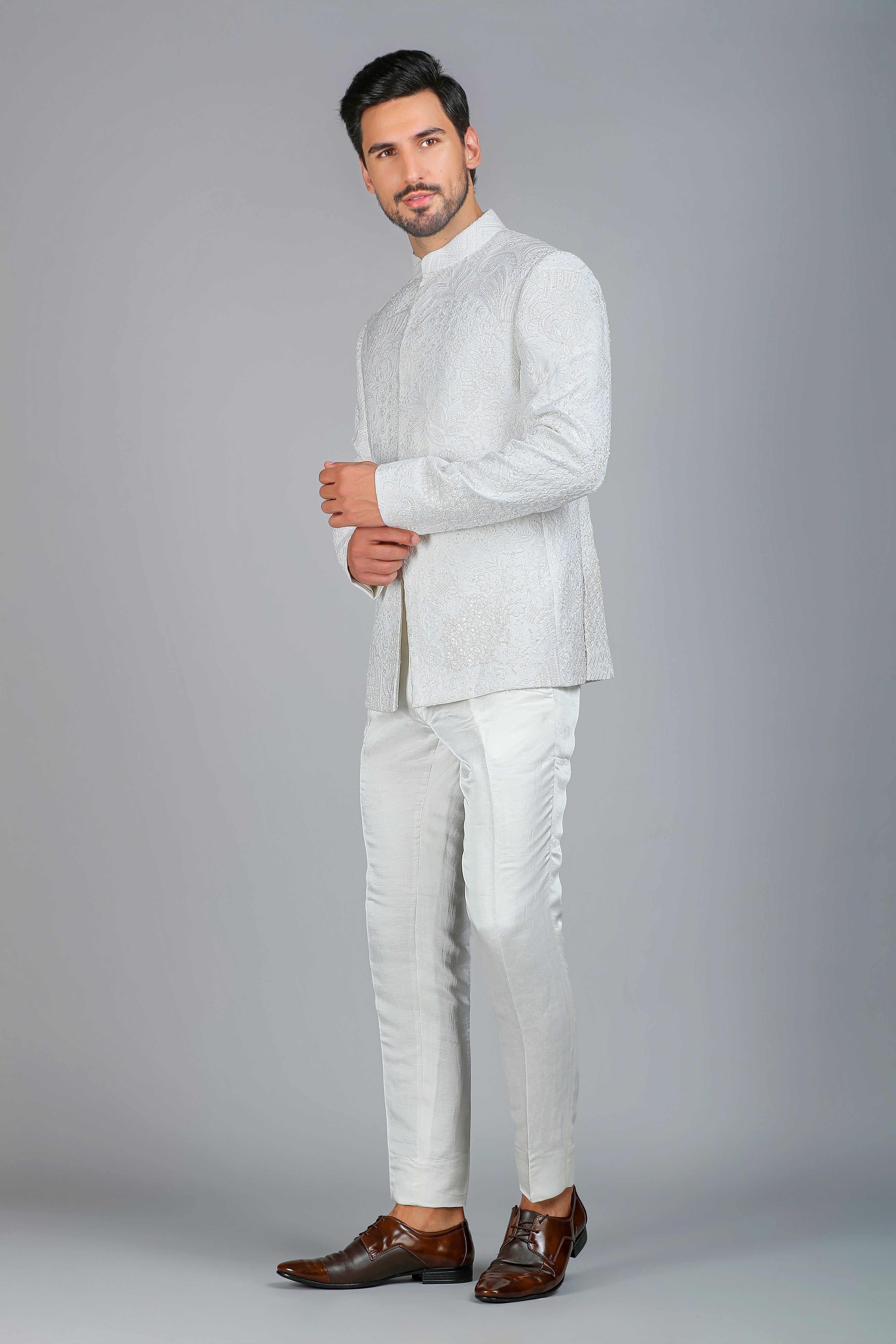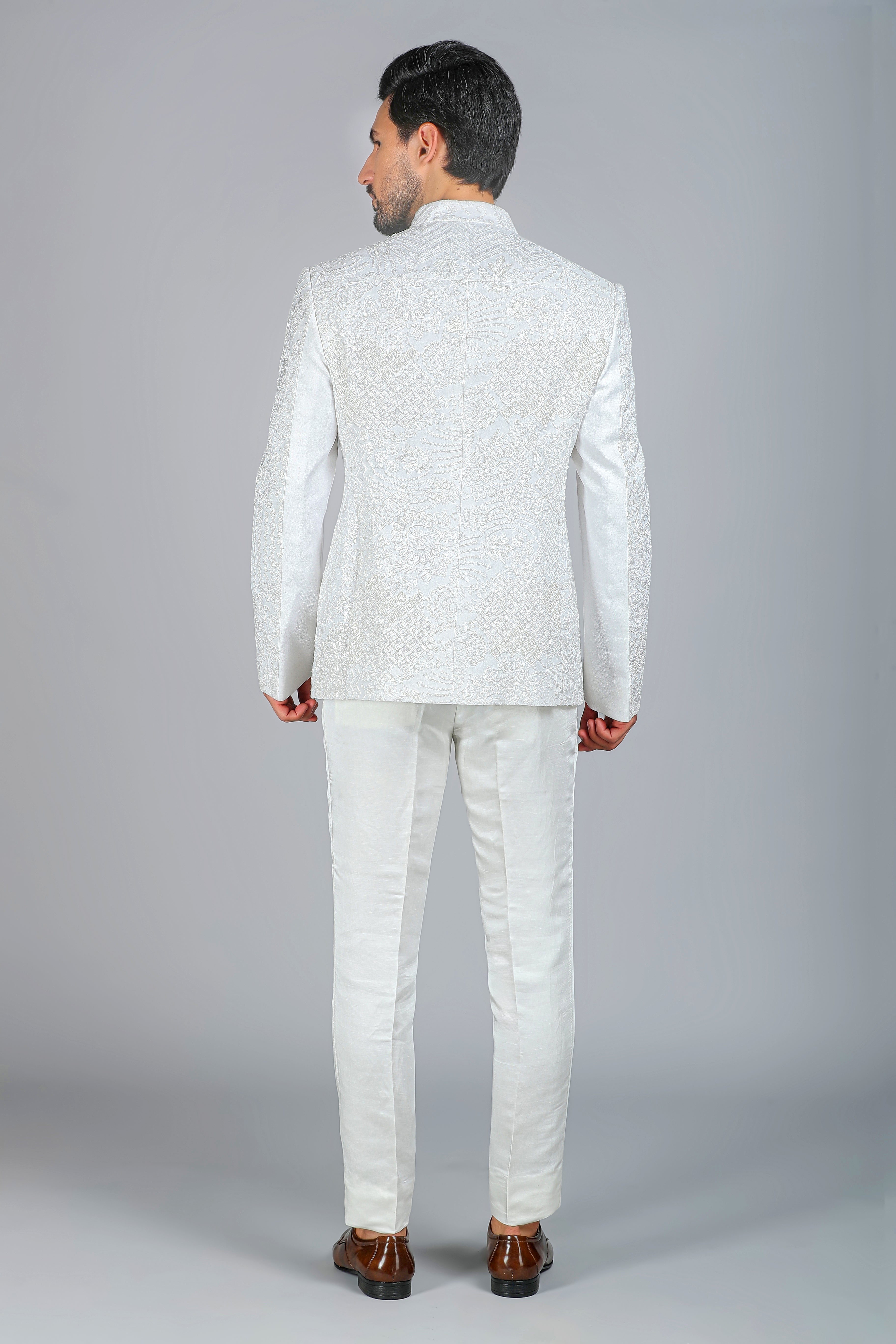 Introducing our Ivory Moonlight Bandhgala, a celestial masterpiece crafted in luxurious textured handloom silk. This enchanting creation is adorned with intricate silk threadwork, delicate cutdana, and shimmering sequins, embodying pure elegance and timeless artistry. Designed for a smart body fit, this Bandhgala is perfect for those who appreciate refined craftsmanship and regal sophistication.