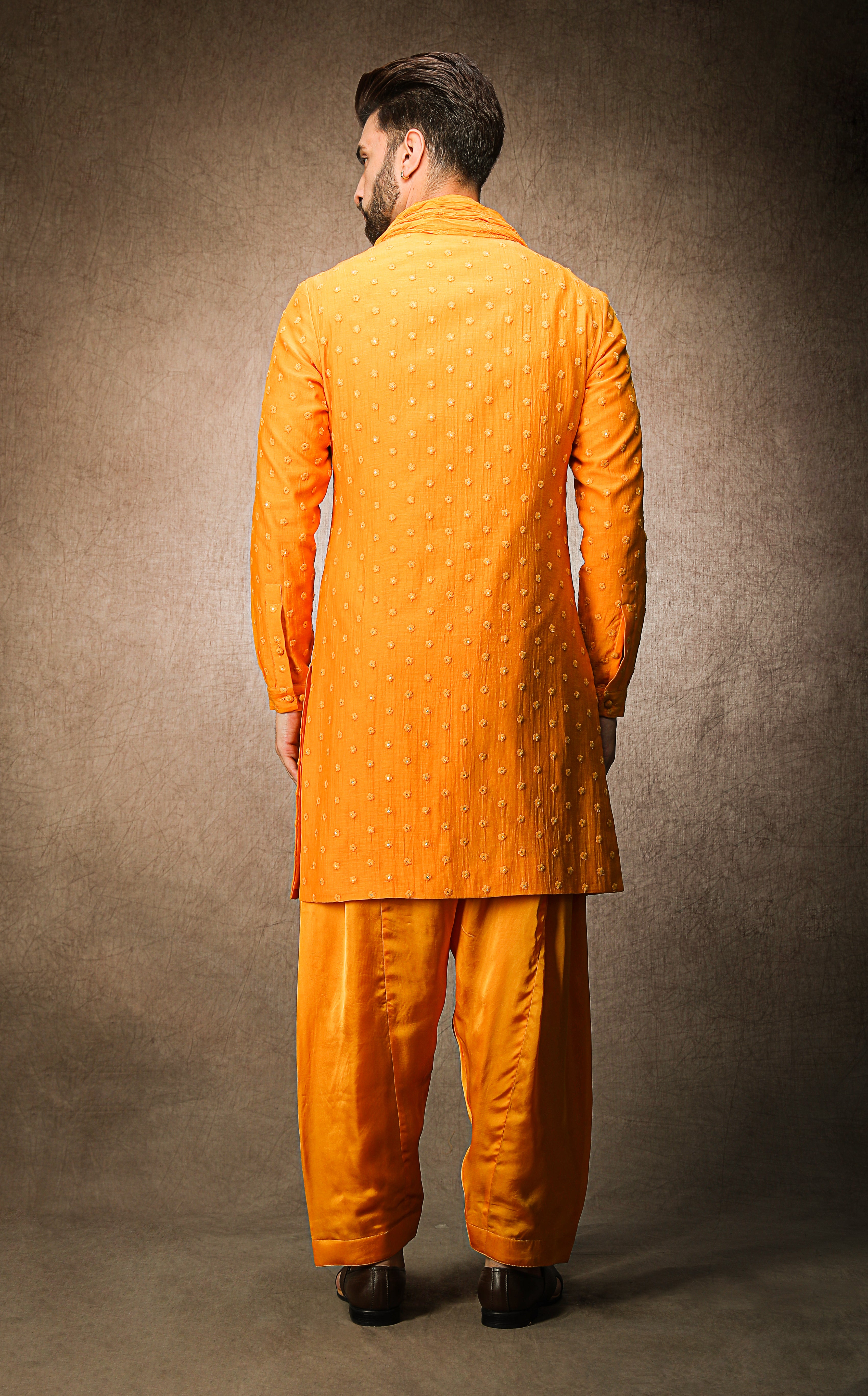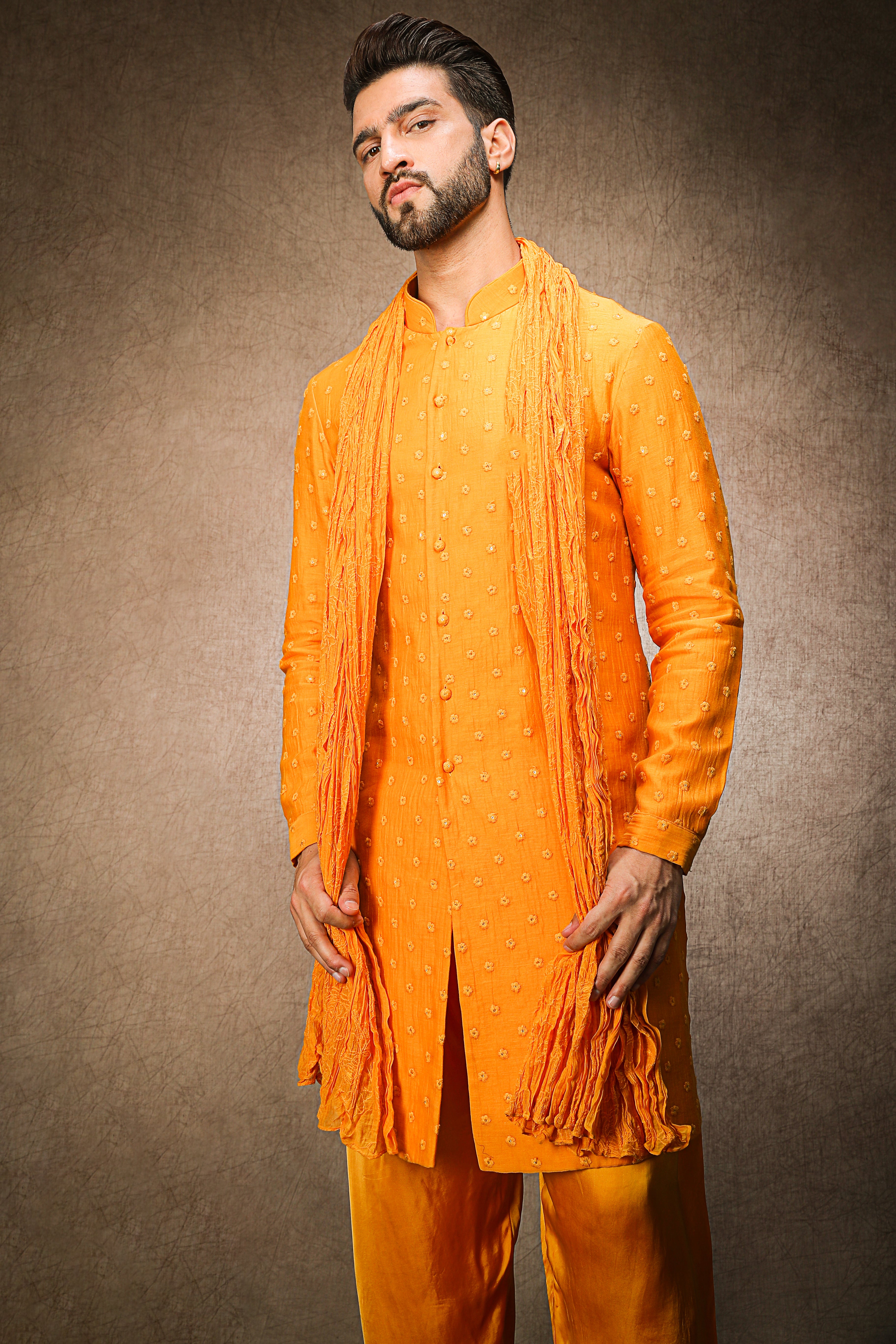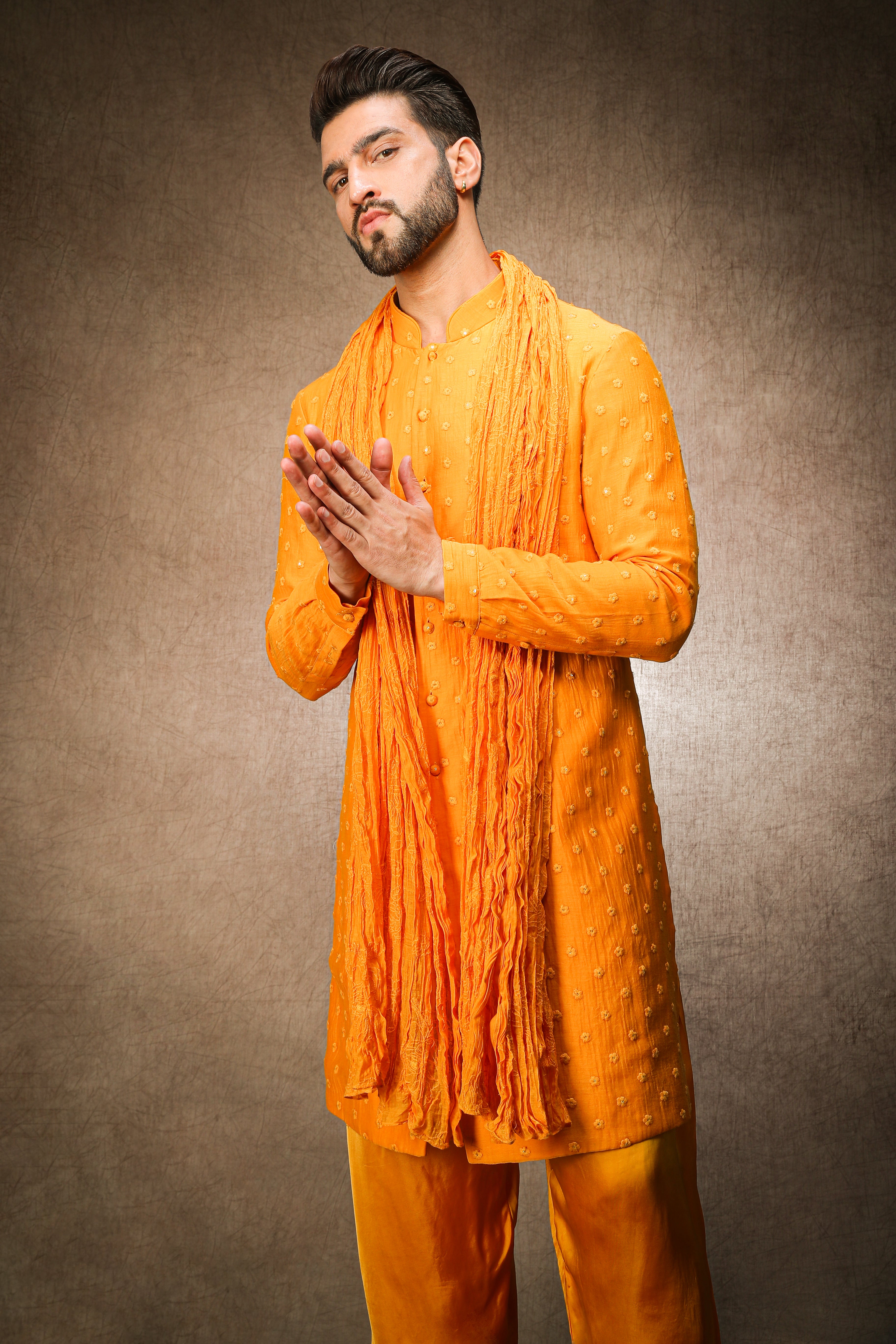 Introducing the Mustard Thread Embroidered Kurta Set, this elegant kurta, salwar, and stole set is tailored from soft cotton and showcases intricate mustard thread embroidery with delicate sequin detailing. This ensemble Perfectly balances simplicity and elegance and is ideal for festive occasions.