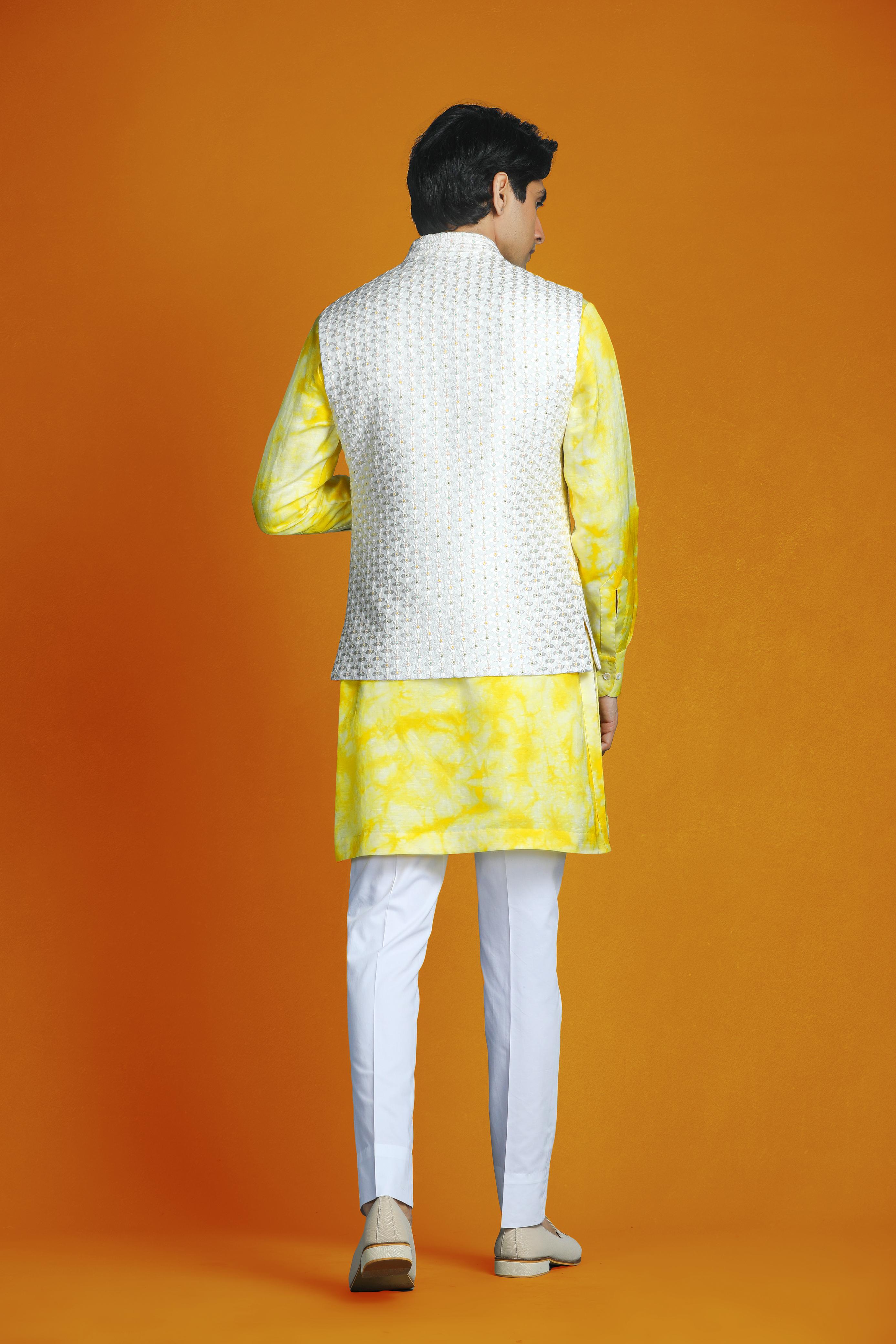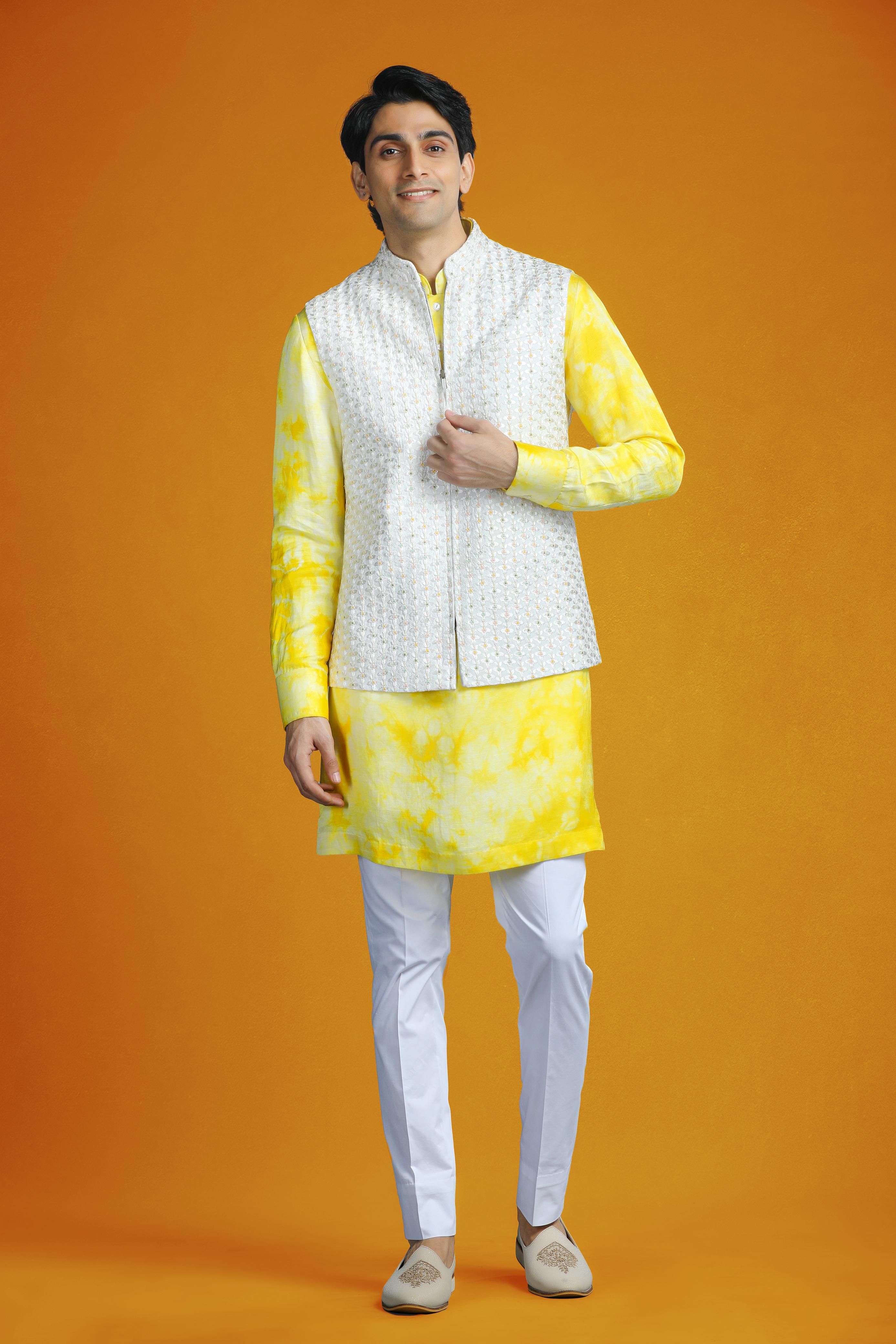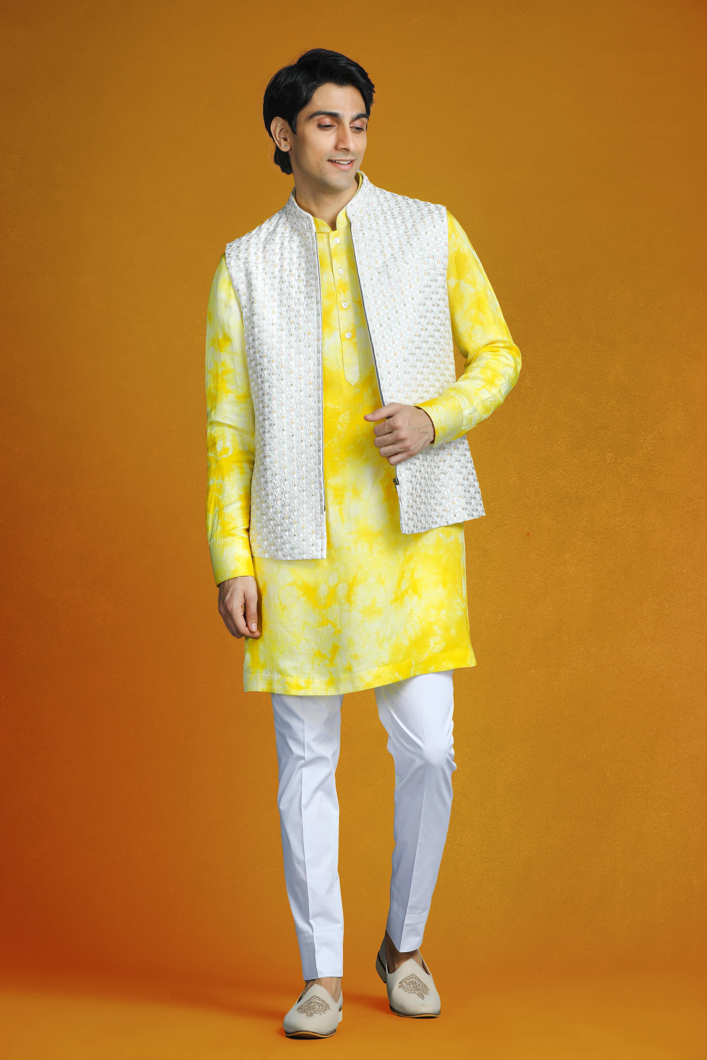 Introducing the Yellow Linen Kurta with Silk Bundi set, where tradition meets contemporary style. This striking set features a vibrant yellow kurta crafted from luxe linen satin, paired with a white Bundi made from silk. The Bundi's modern touch is enhanced with a sleek zipper, adding a unique edge to this classic ensemble.