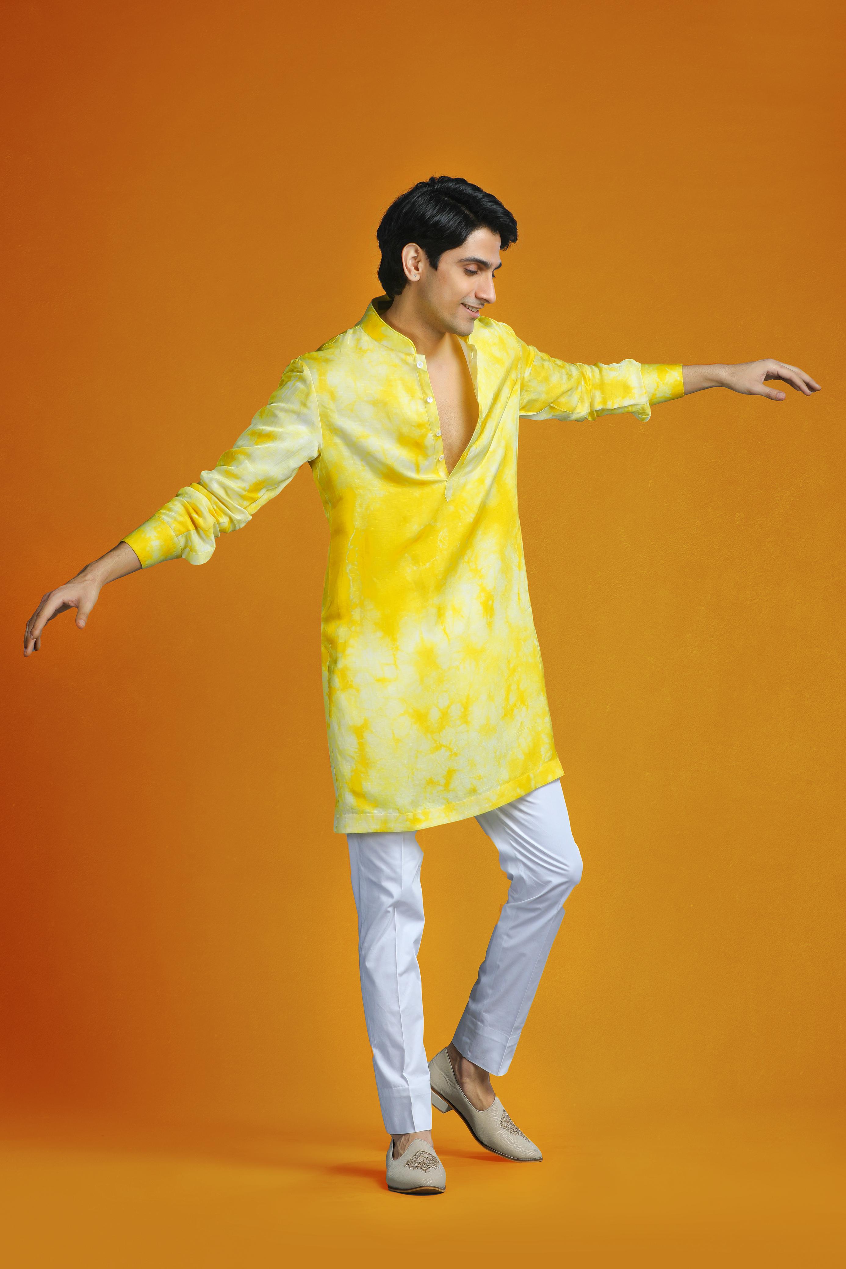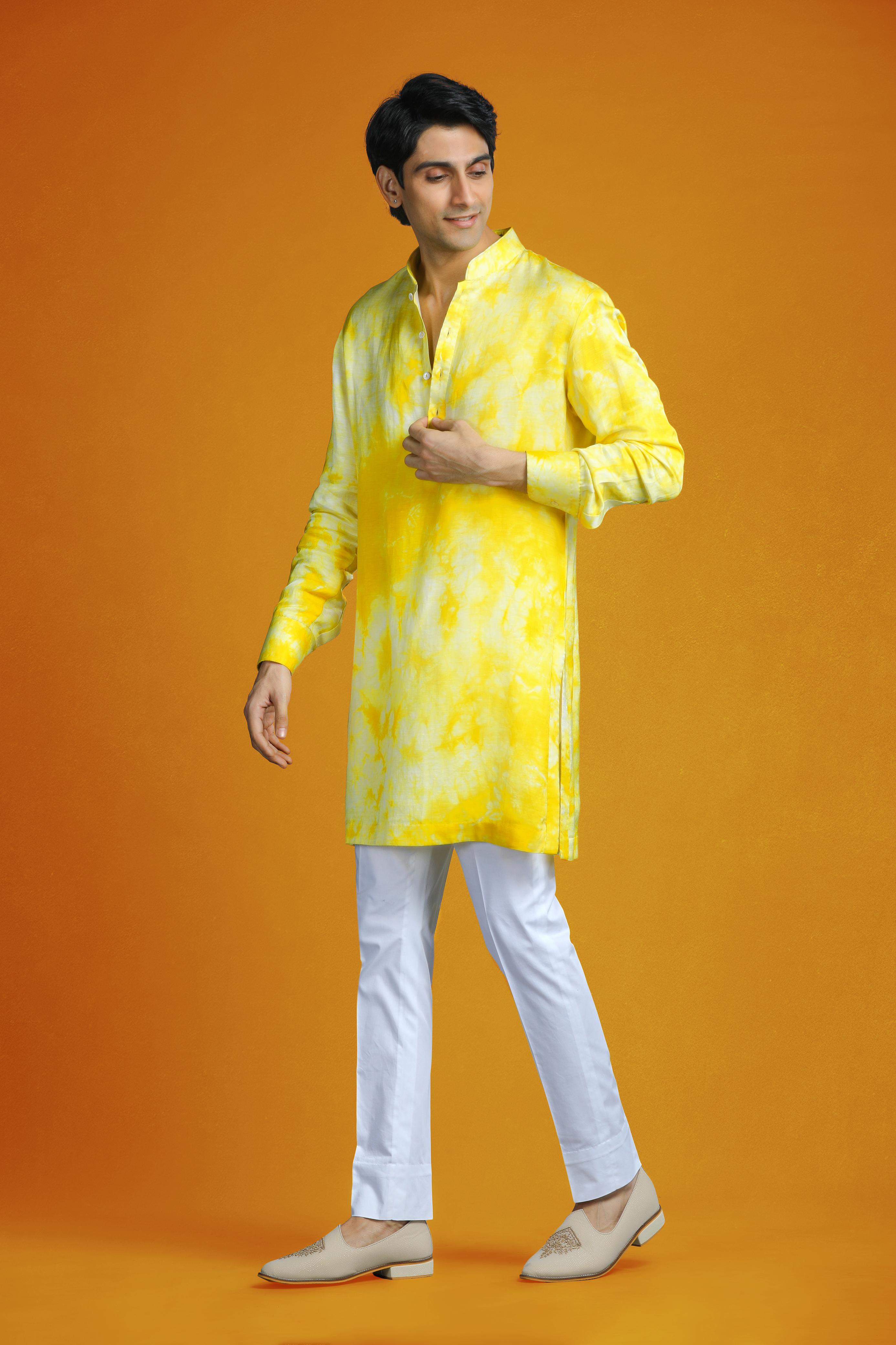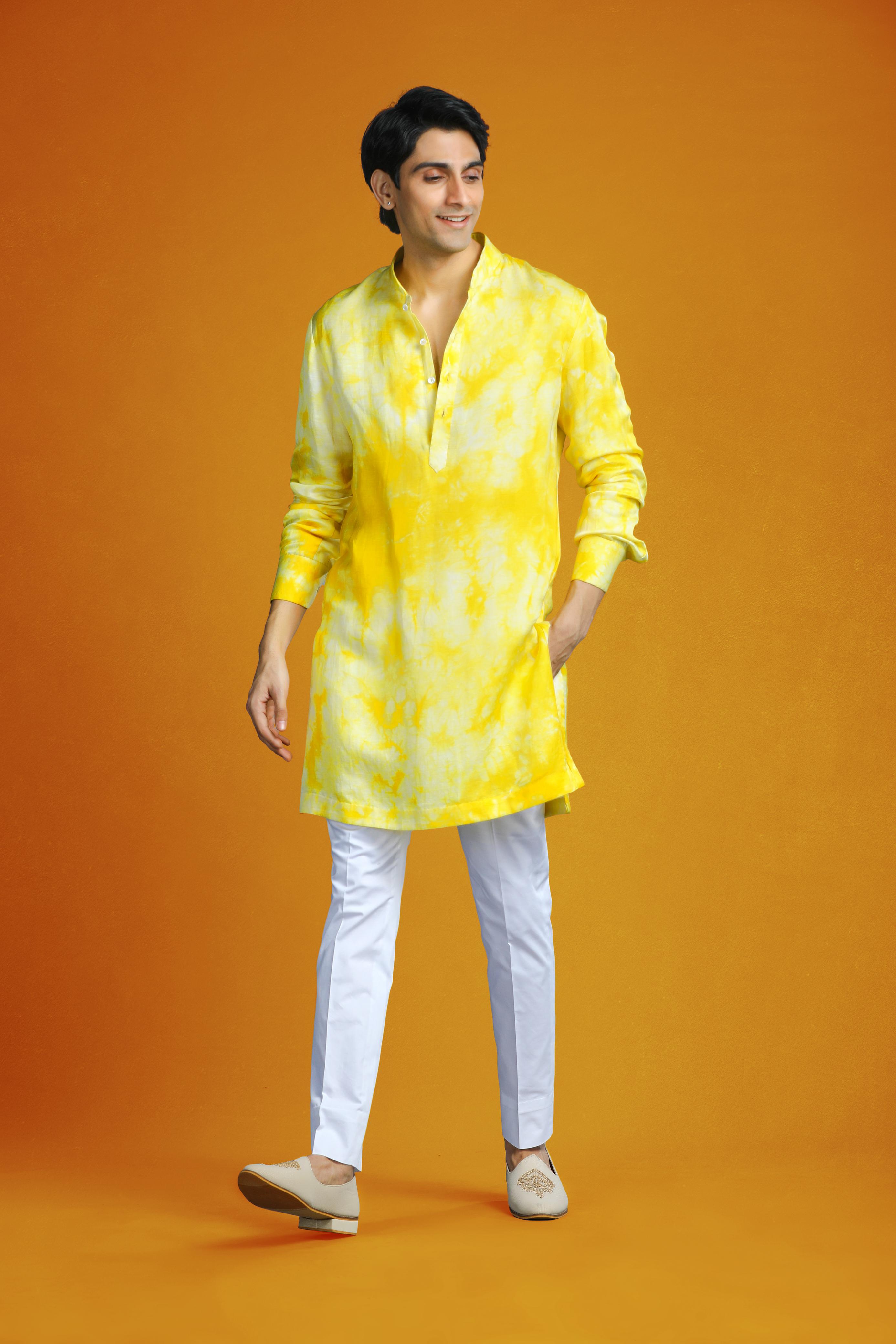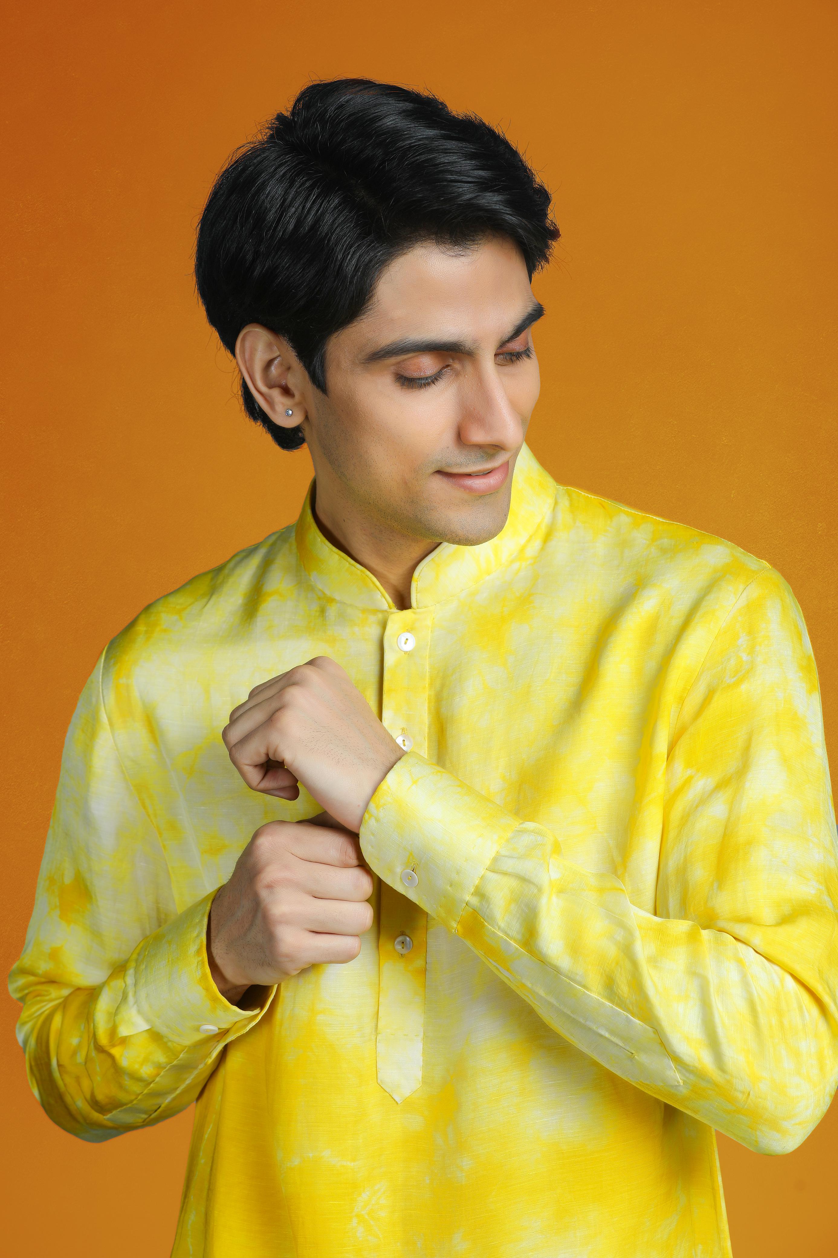 Introducing the Yellow Linen Kurta with Silk Bundi set, where tradition meets contemporary style. This striking set features a vibrant yellow kurta crafted from luxe linen satin, paired with a white Bundi made from silk. The Bundi's modern touch is enhanced with a sleek zipper, adding a unique edge to this classic ensemble.
