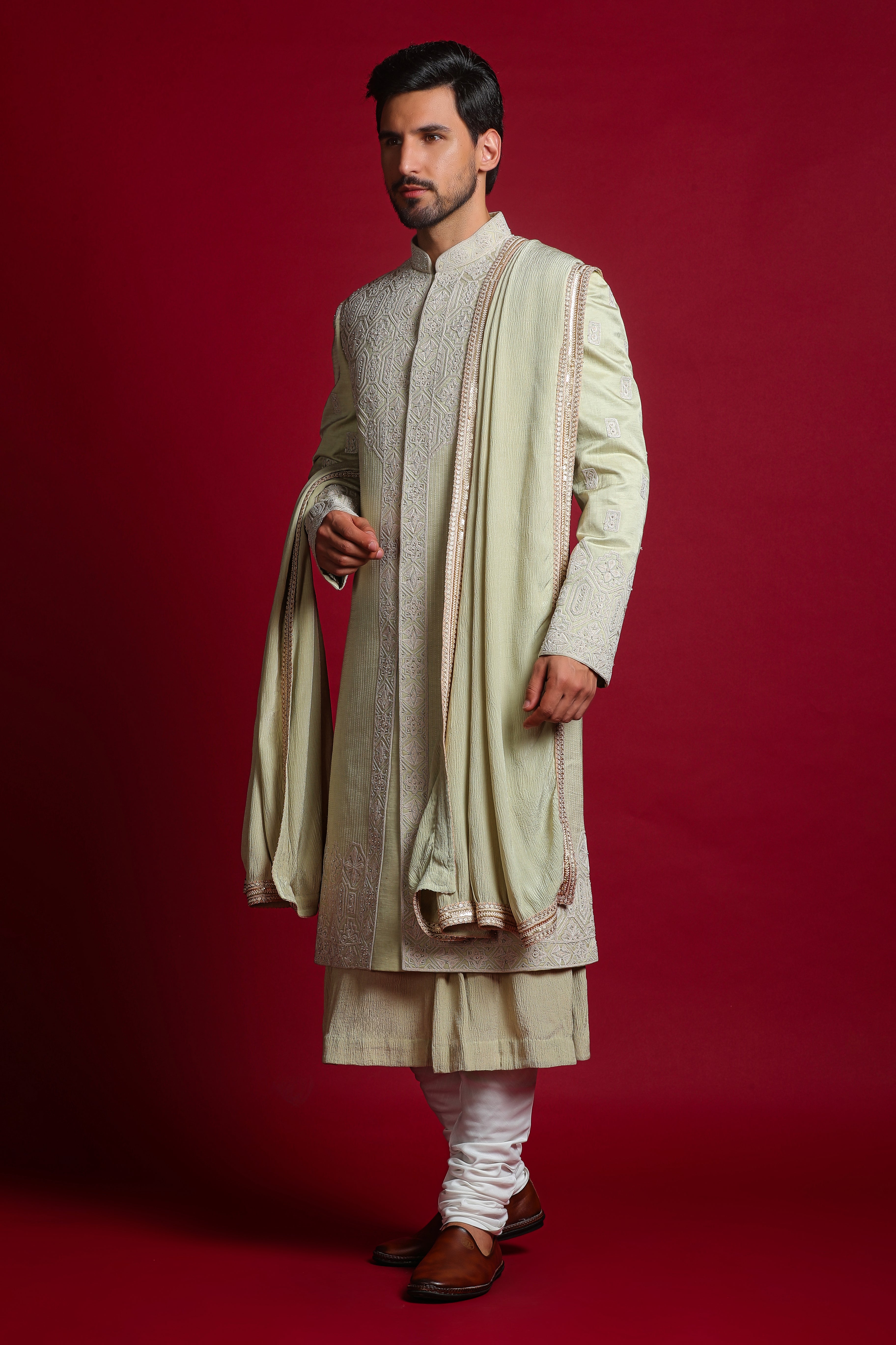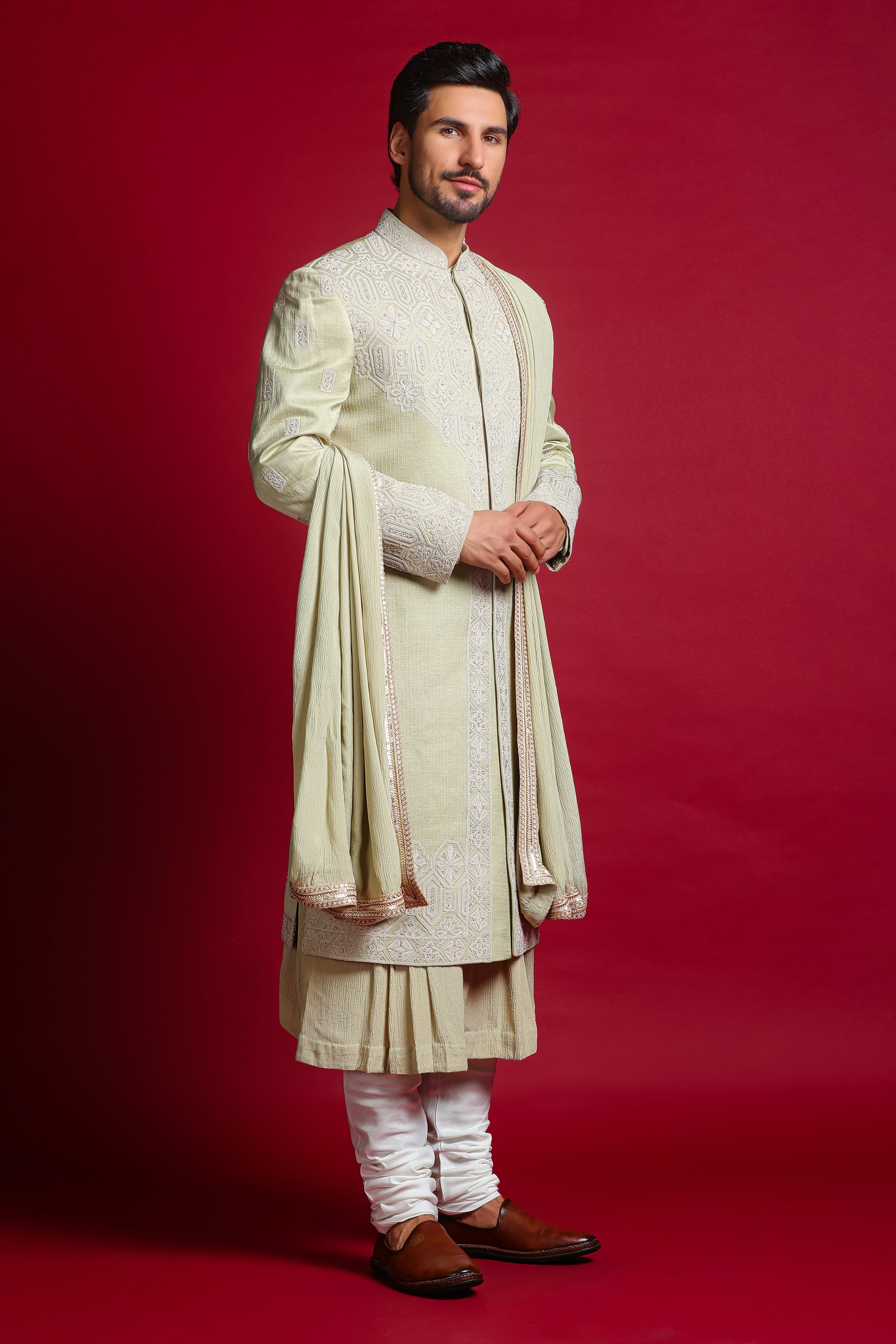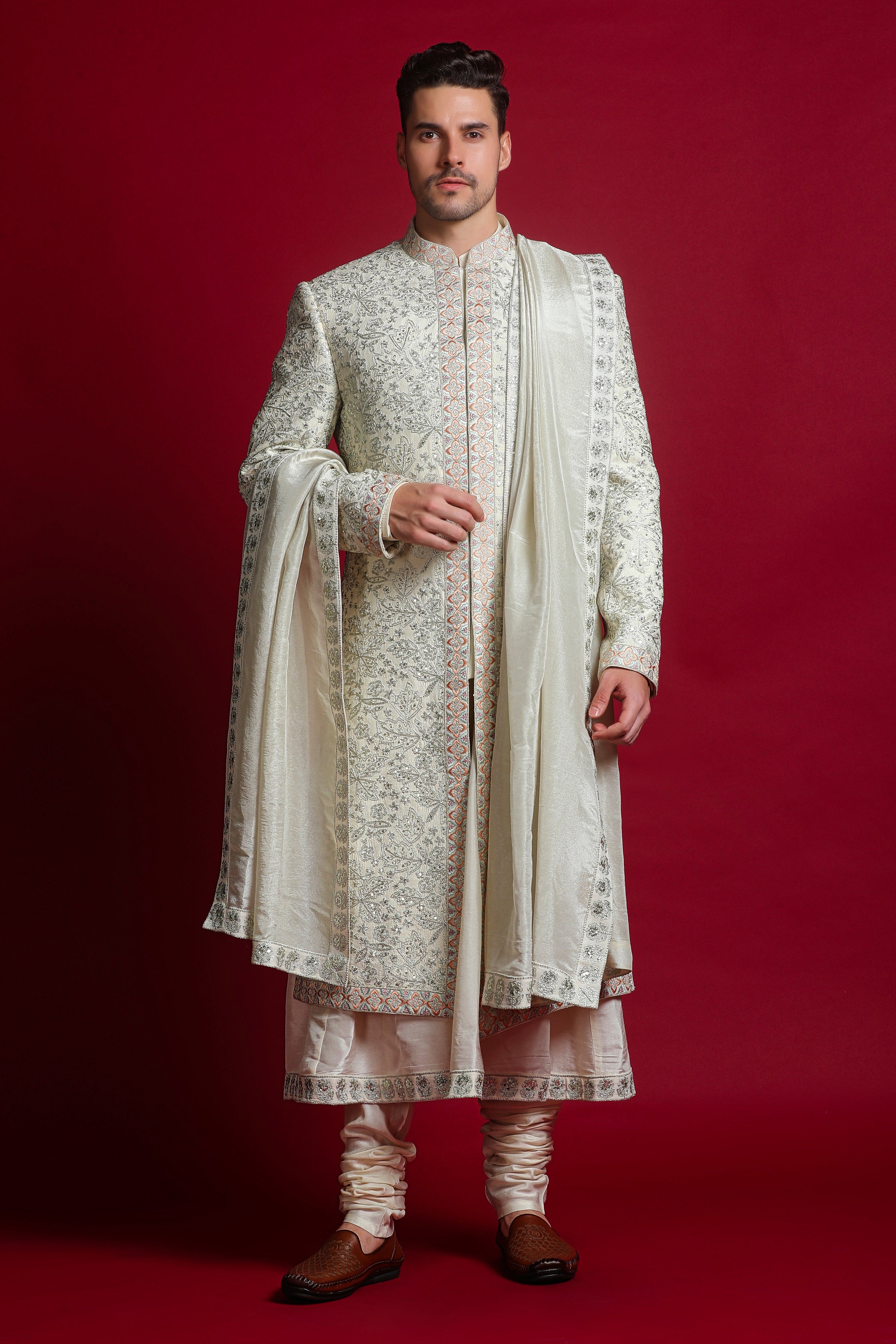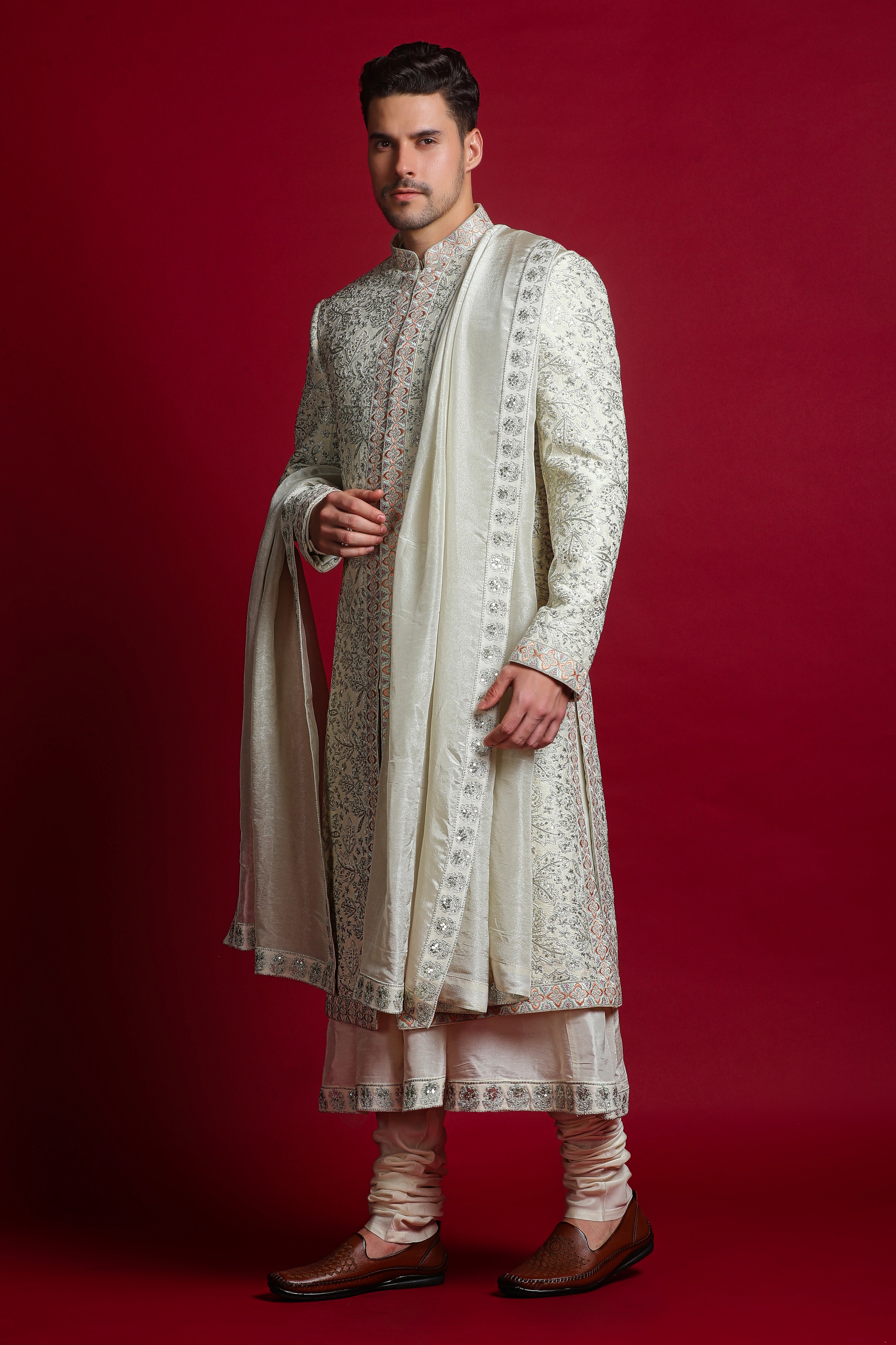 Includes: Sherwani, Kurta, Churidar, Stole, Belt