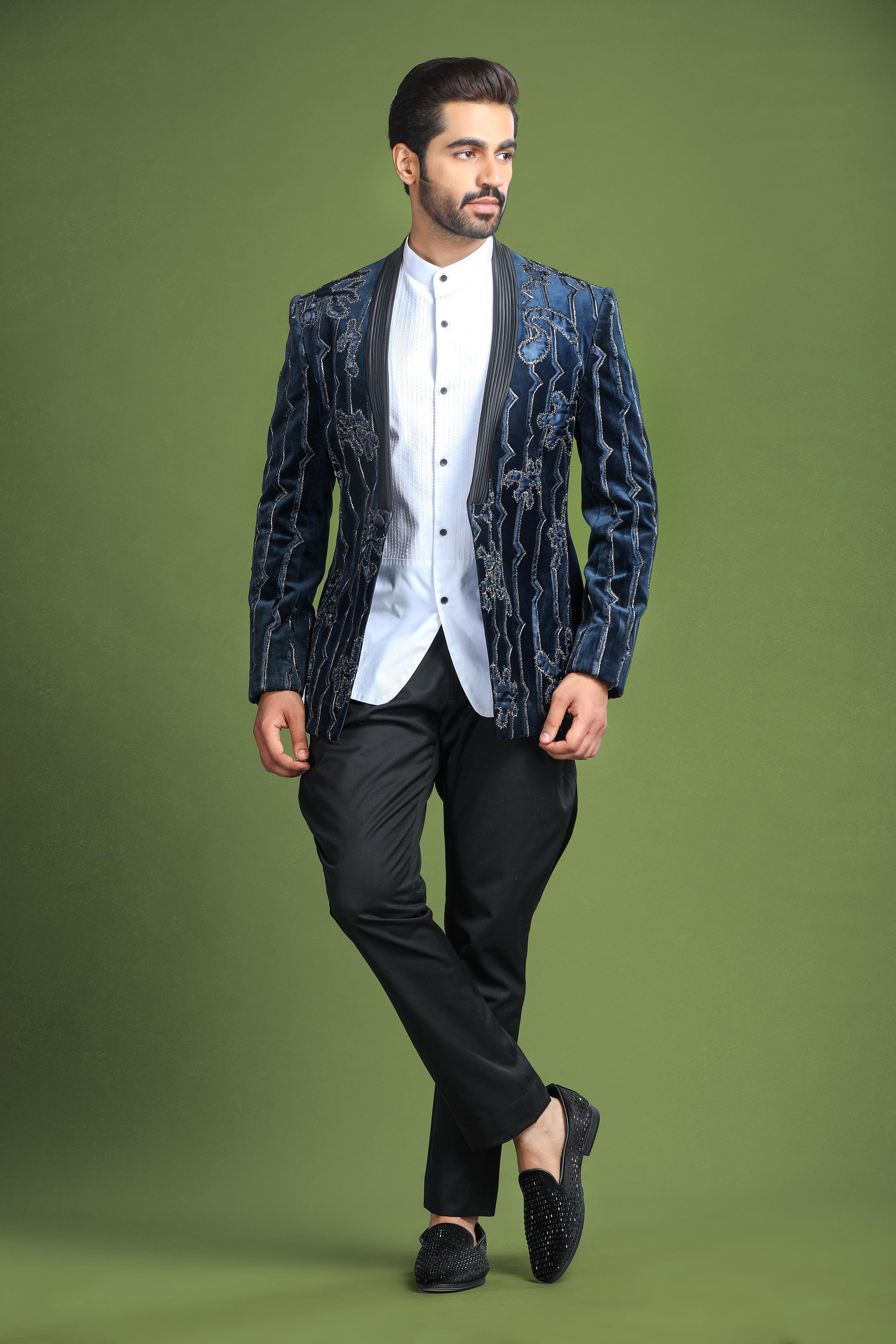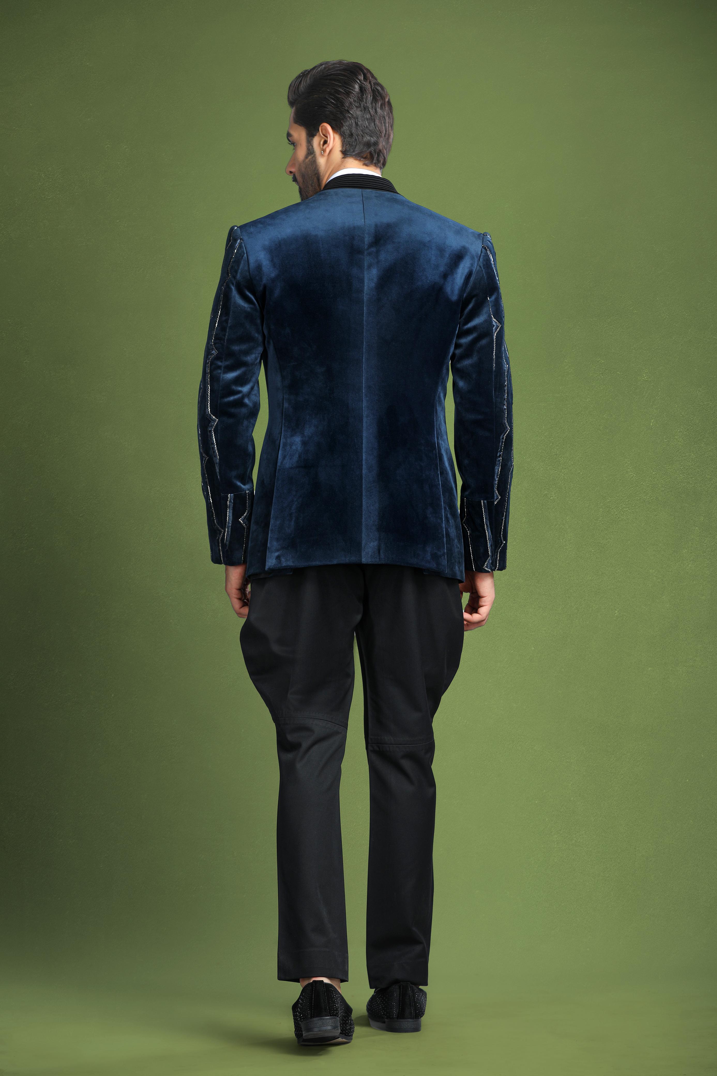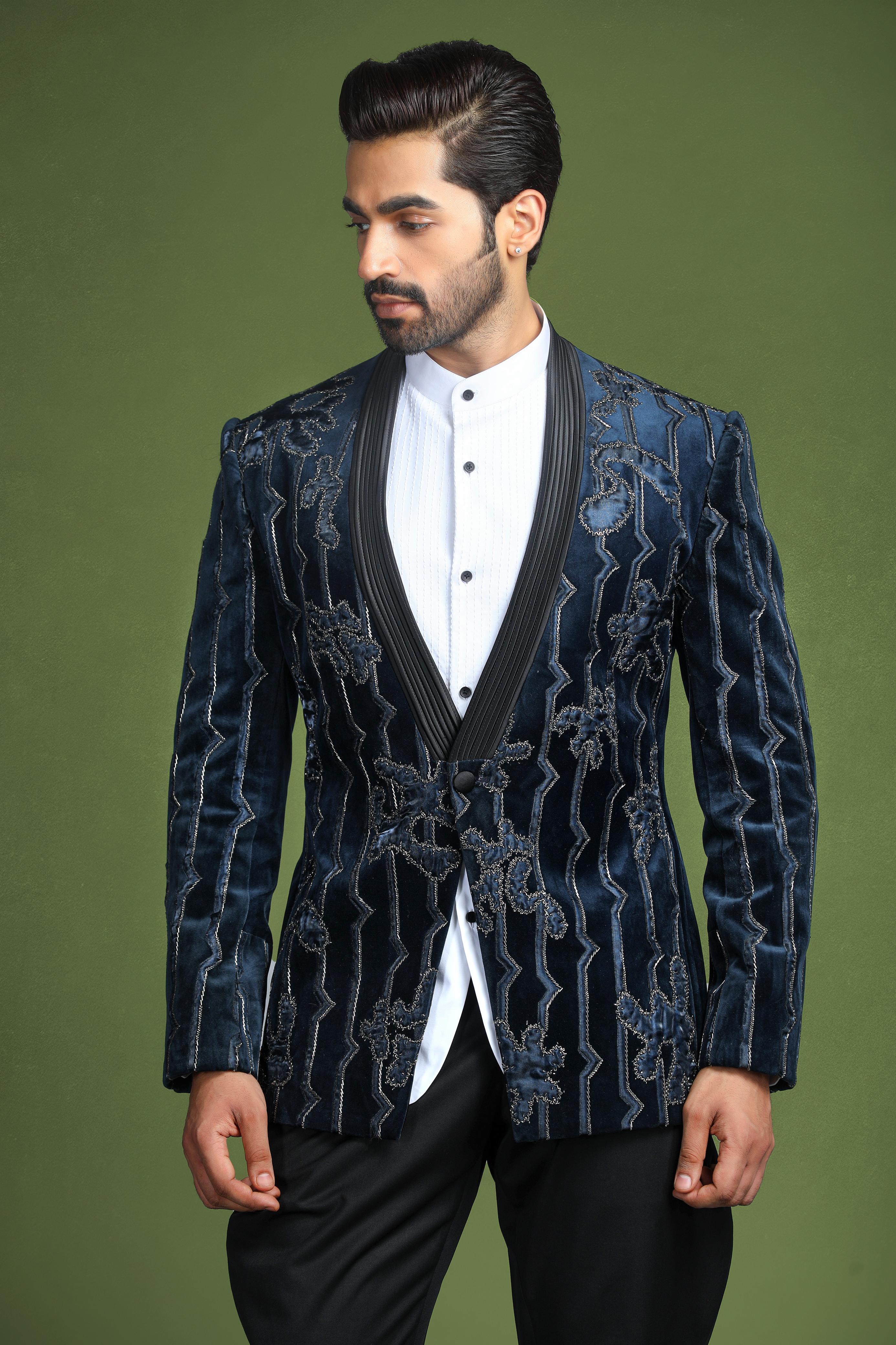 Introducing the Velvet Royal Navy Blue Tuxedo, a statement of timeless elegance and modern flair. This exquisite tuxedo is crafted from rich velvet in a deep navy blue hue, featuring intricate patchwork, shimmering glass beads, and stylish pin-tuck detailing along the lapel. The combination of luxurious fabric and sophisticated embellishments ensures a refined look, perfect for events where you want to make a lasting impression.