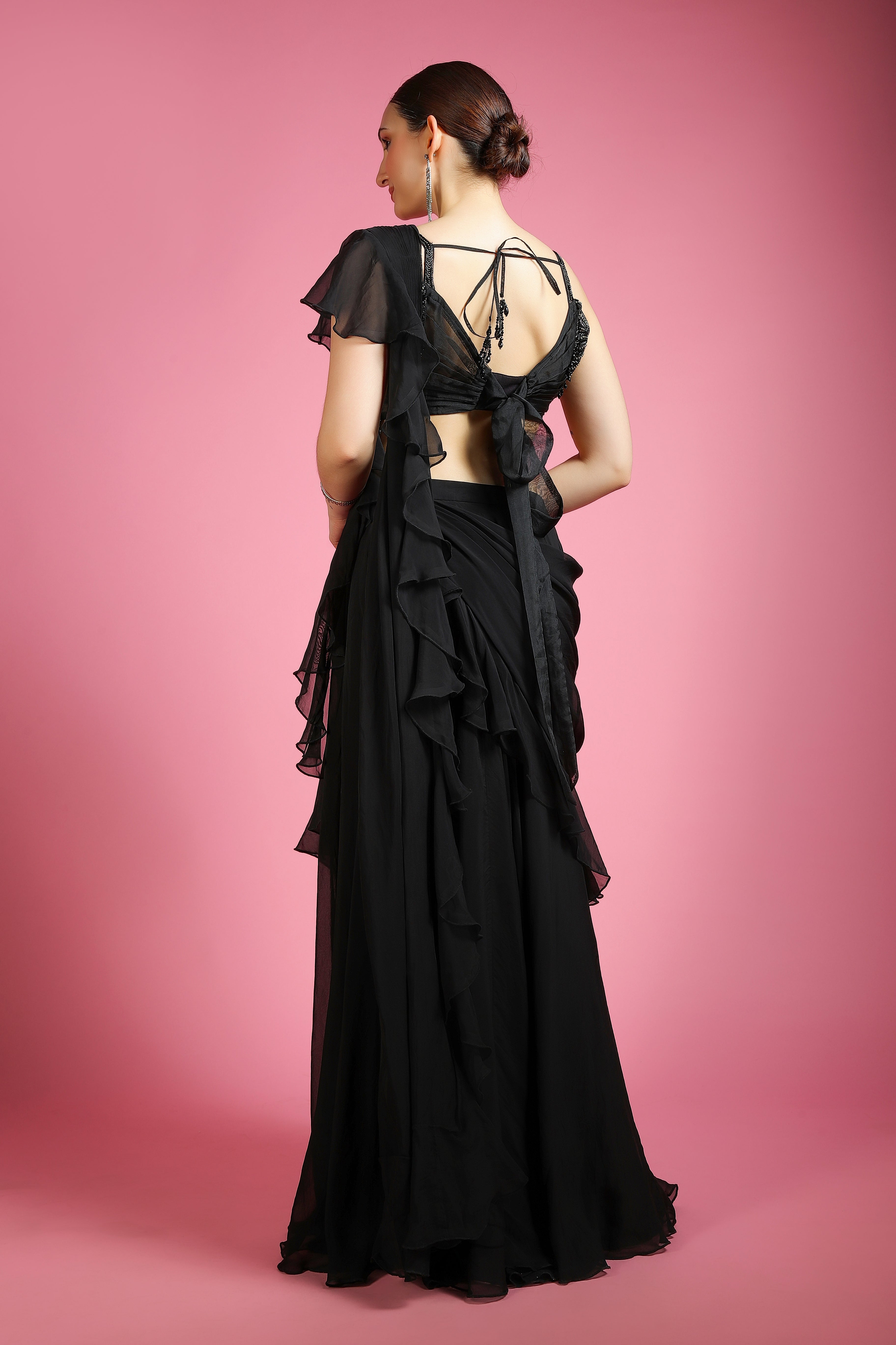 Introducing Luna Noir's black drape saree, a perfect blend of modern elegance. Crafted from delicate organza fabric, the saree is paired with a subtle dance of beautiful beads all over the blouse, making it a statement piece for any occasion.