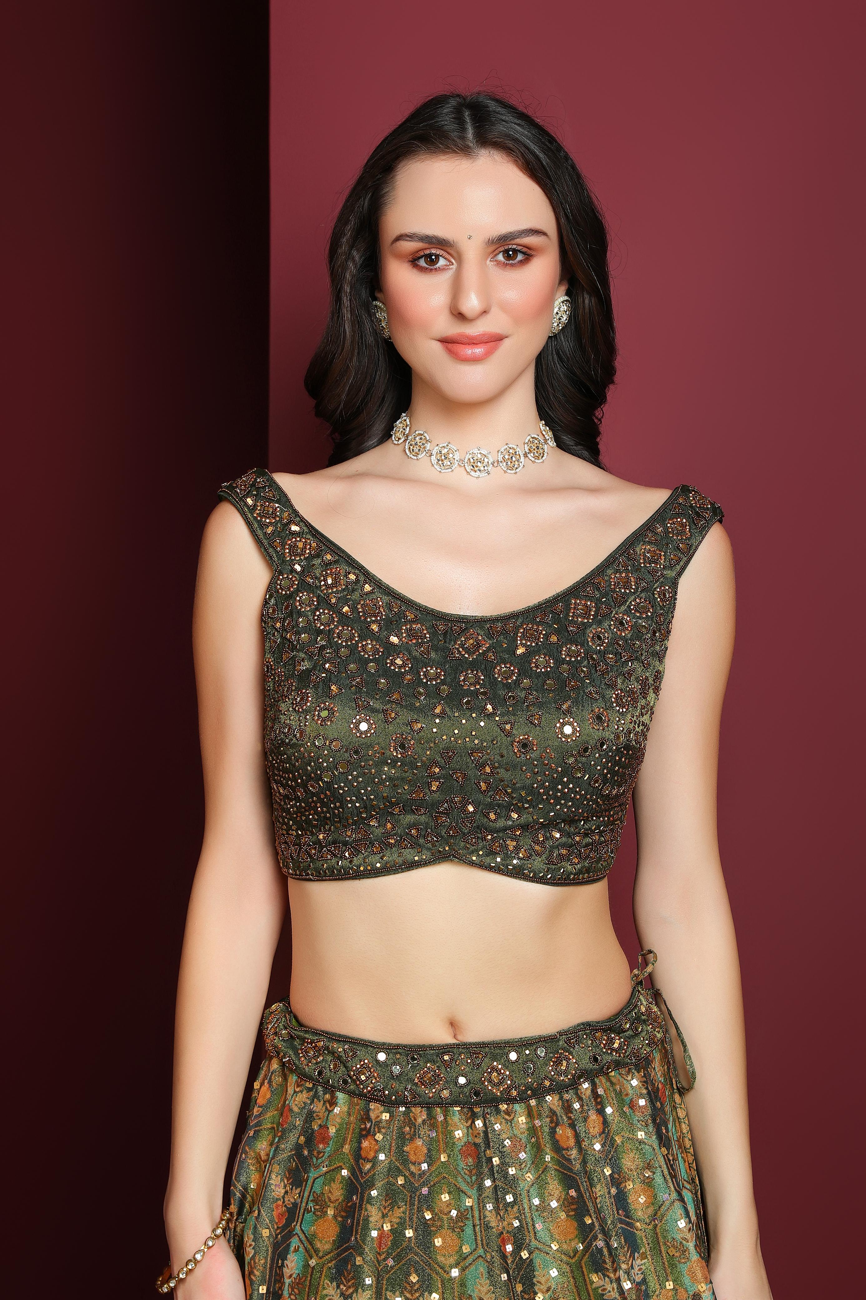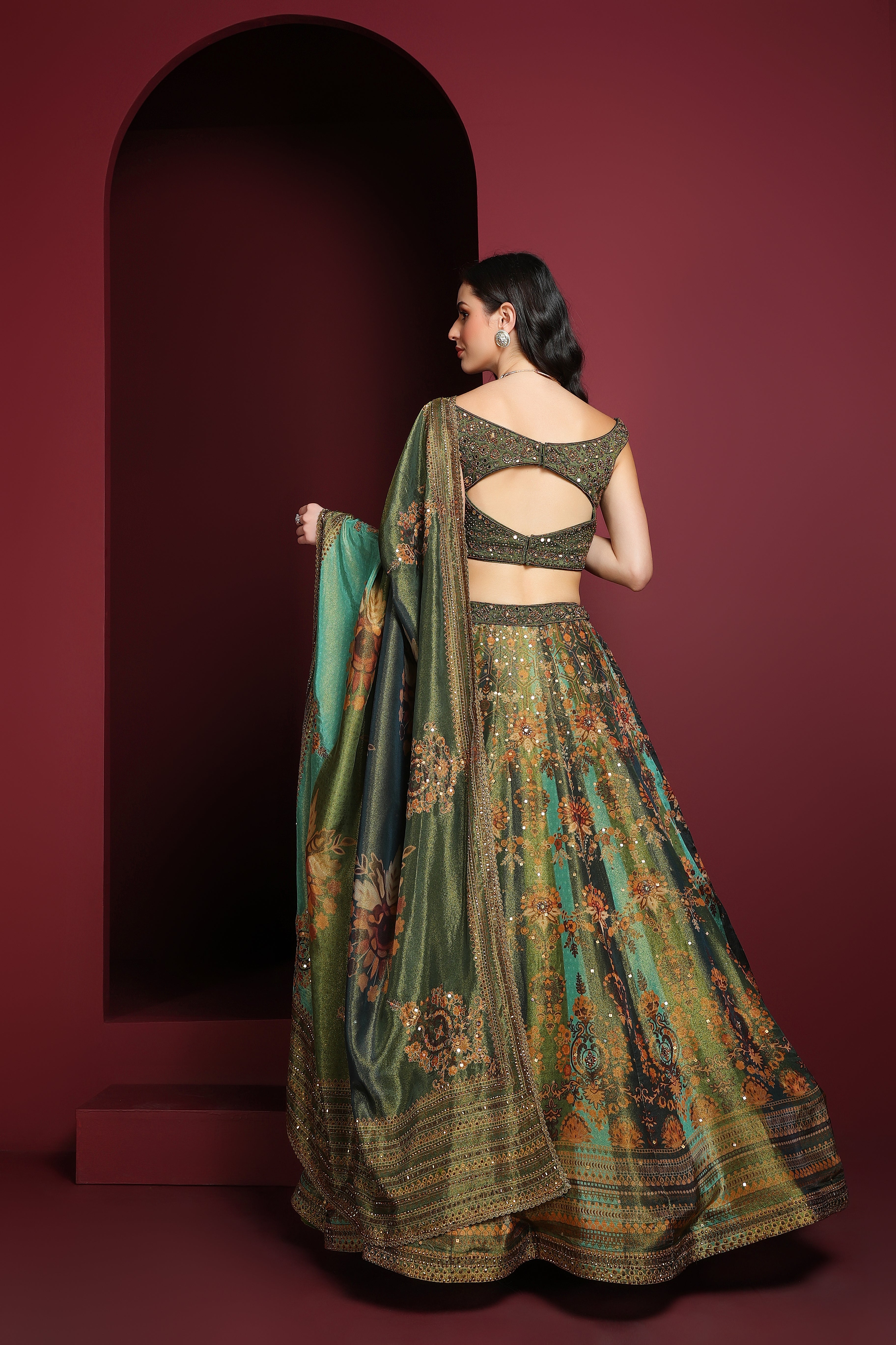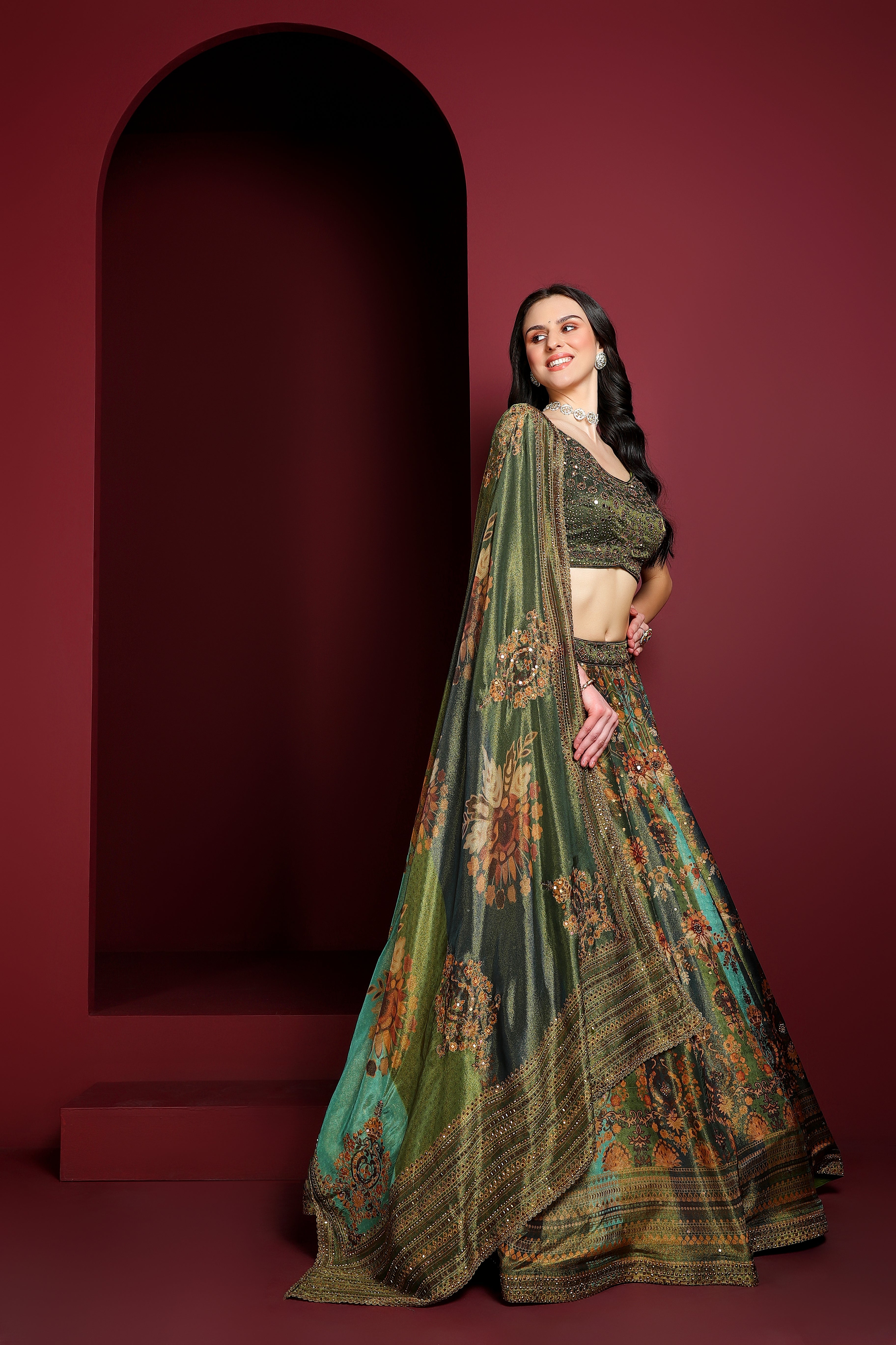 A tribute to nature’s elegance, the Panna Phool Vana Sundari Green Lehenga blends tradition with contemporary charm. Crafted in a rich green hue, this lehenga features exquisite floral brocade patterns, enhanced with mirror work, delicate beads, and shimmering sequins. The intricate detailing adds a touch of timeless grace, making it perfect for festive occasions, weddings, and cultural celebrations.