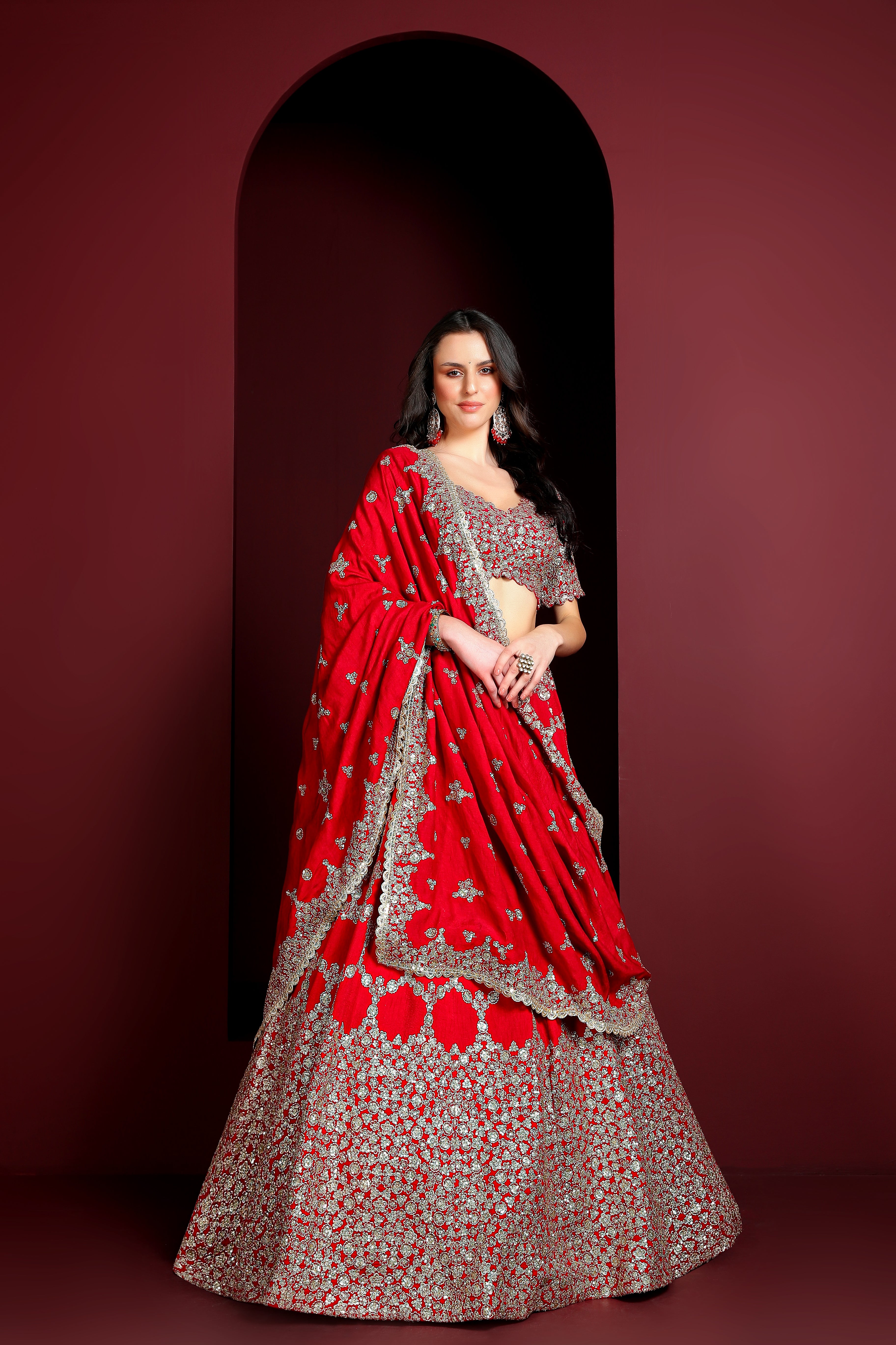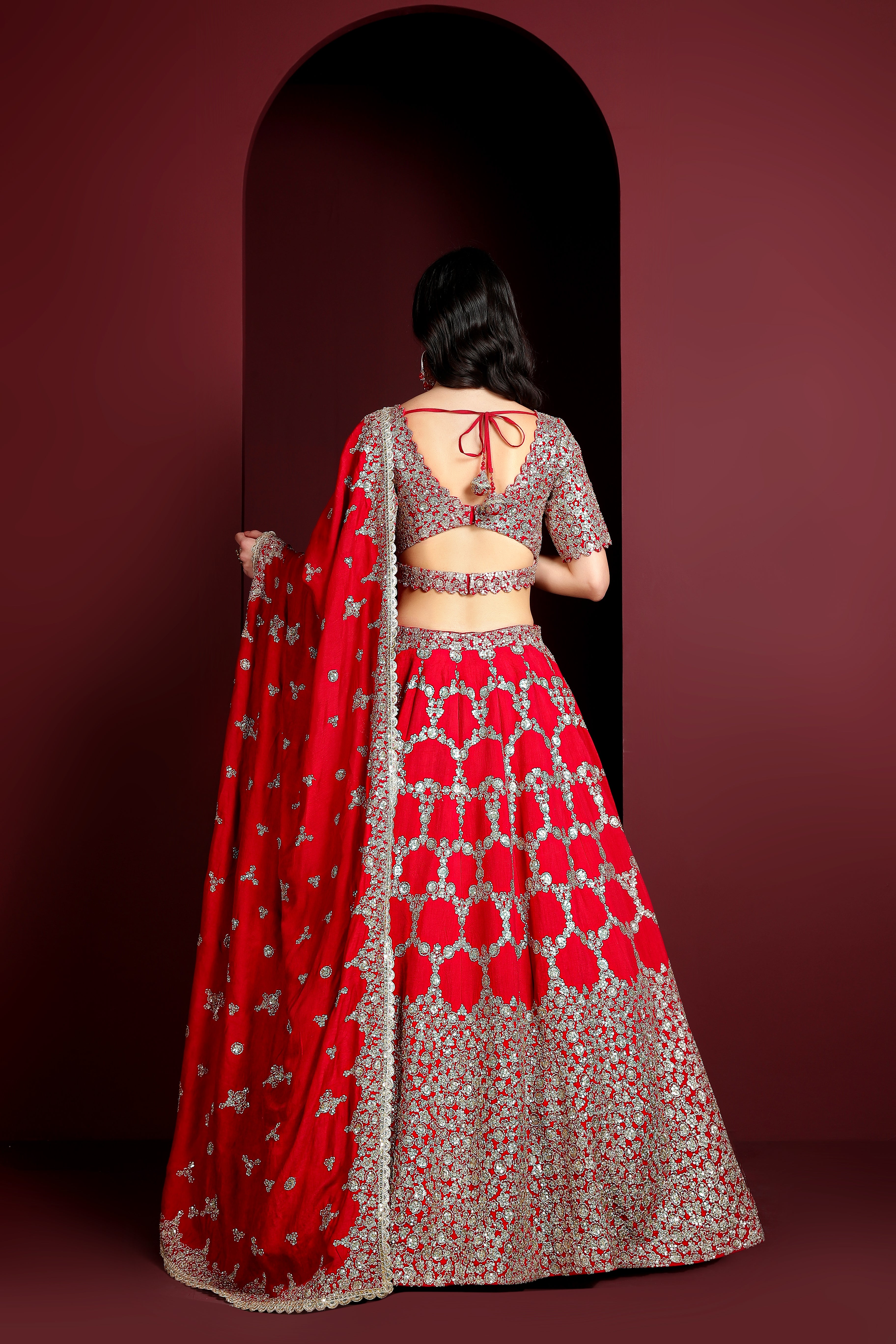 A timeless masterpiece, the Shahana Noor Crimson Shimmer Embroidered Lehenga is crafted from luxurious tissue silk, radiating a regal charm. The lehenga showcases heritage fort gate-inspired embroidery, blending architectural elegance with shimmering embellishments. Paired with a meticulously embroidered blouse and a graceful dupatta, this ensemble is a must-have for any ethnic wardrobe, exuding grandeur and sophistication.