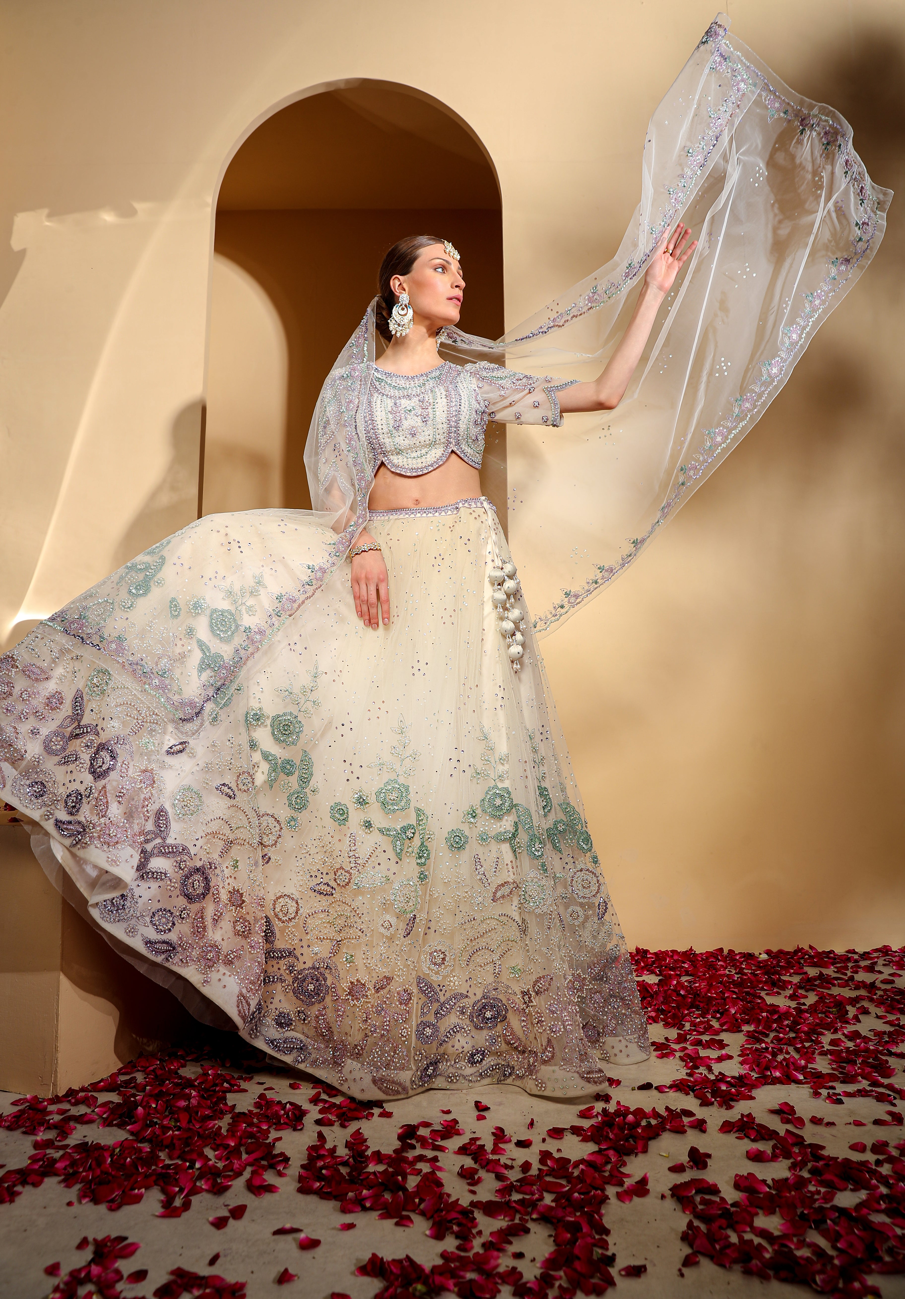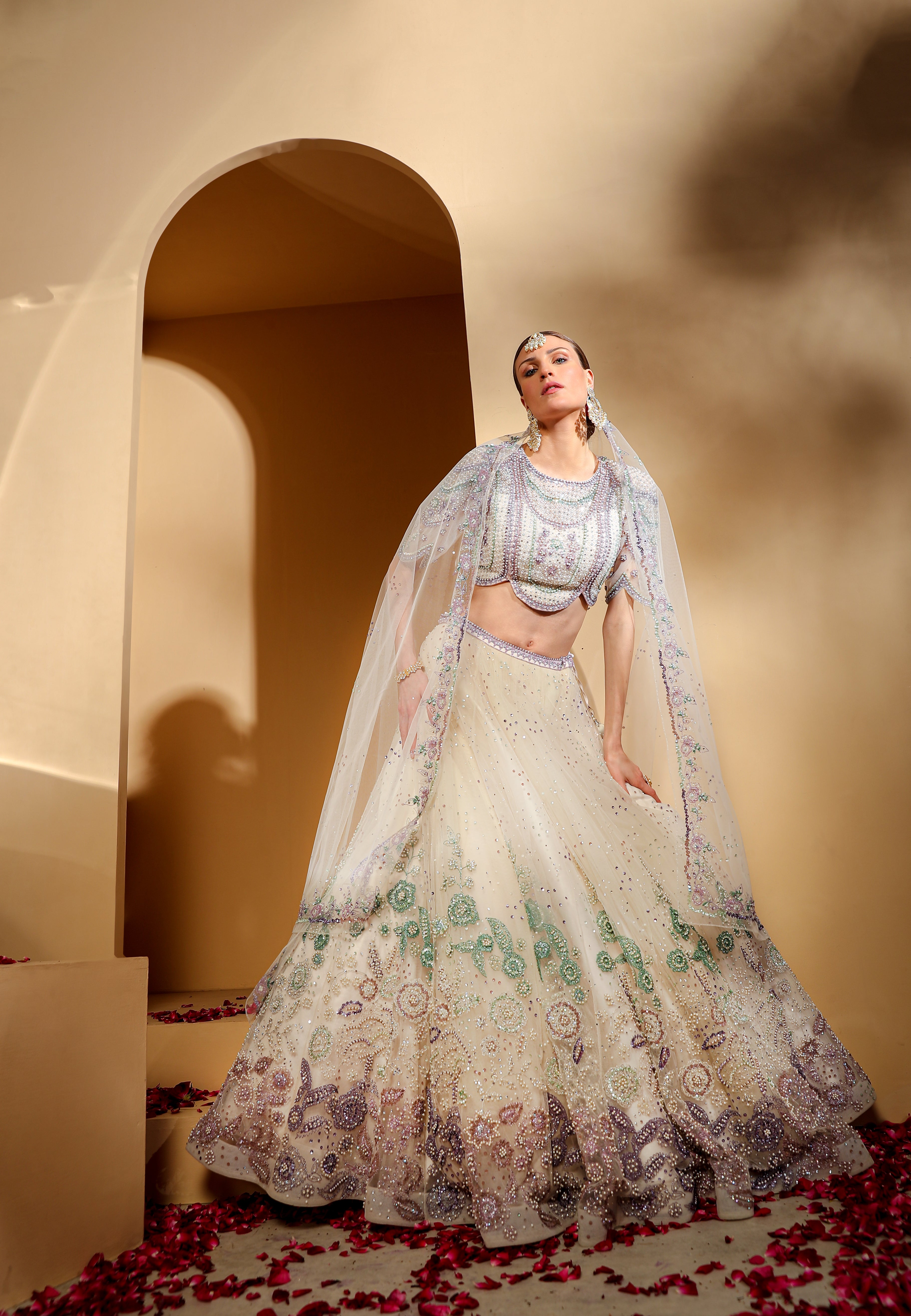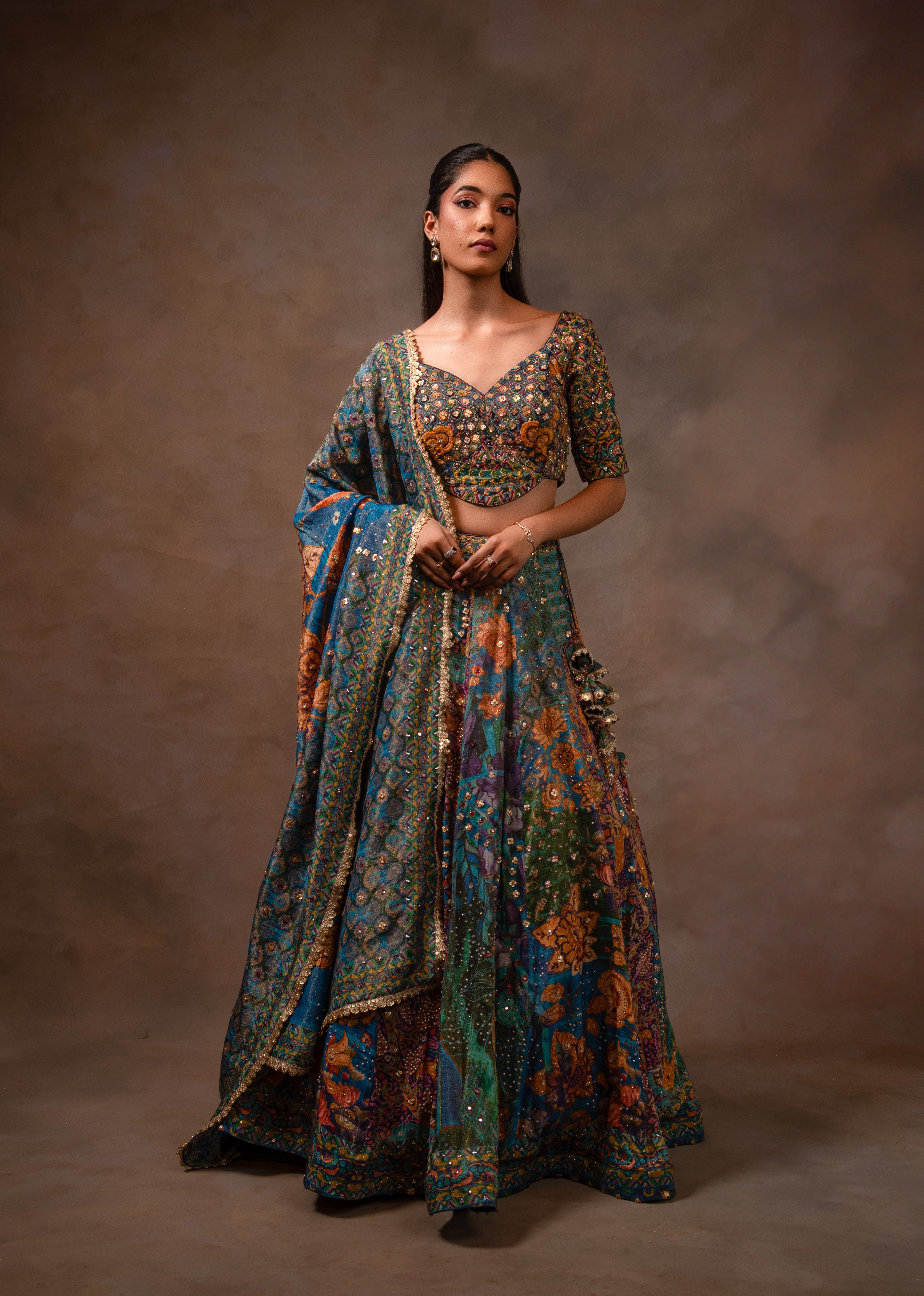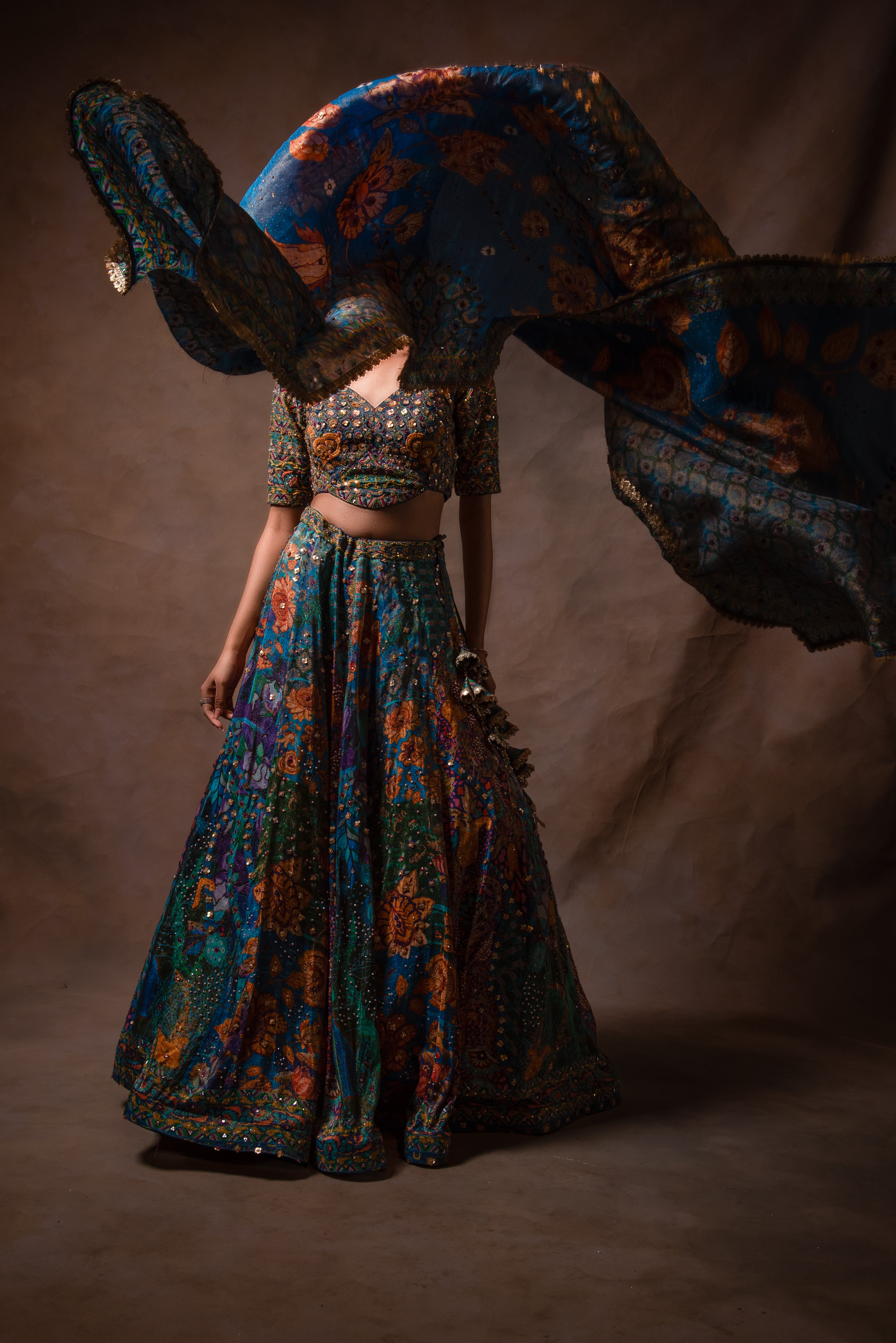 Prismatic Floral Printed Hand-Embroidered Lehenga