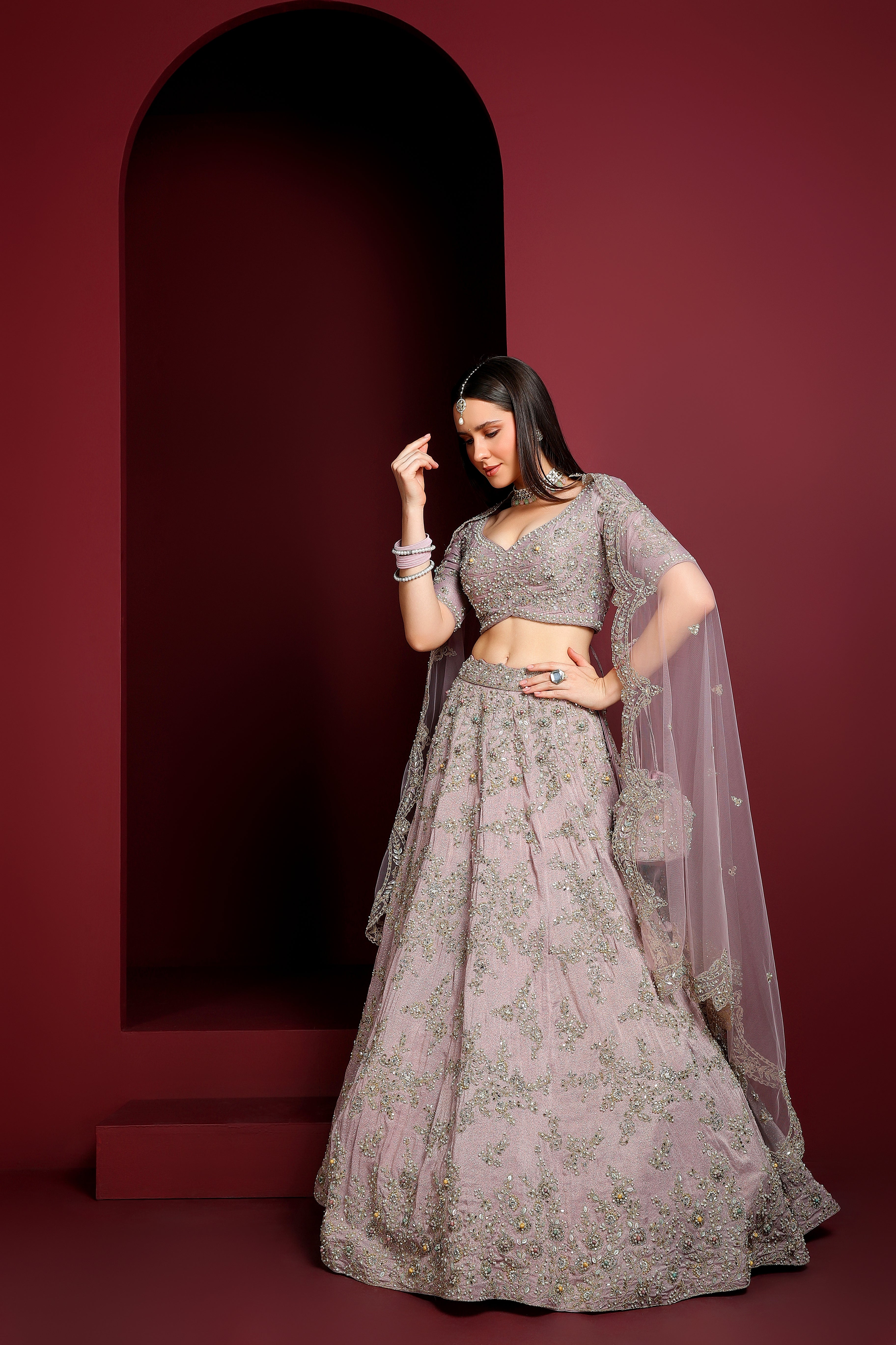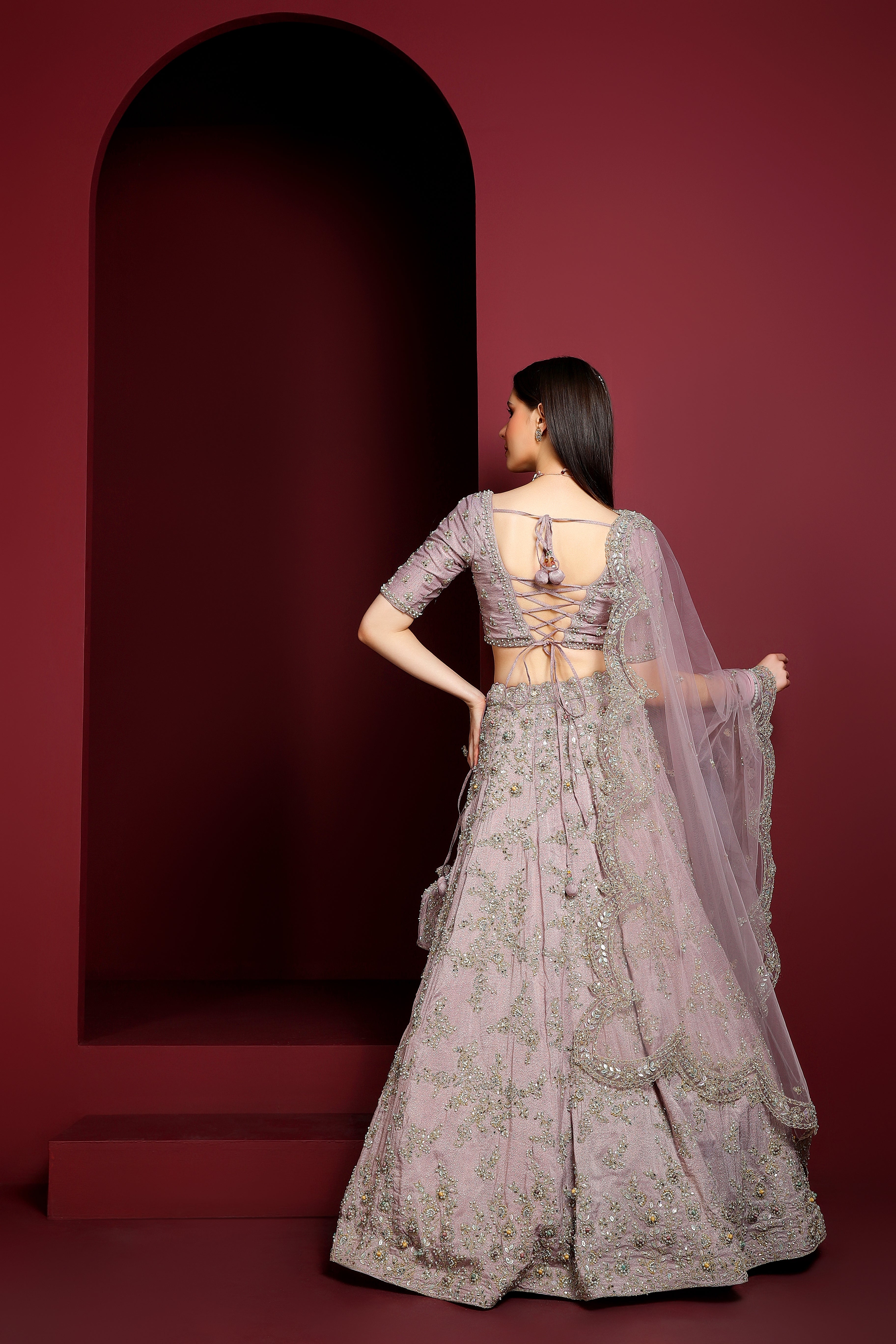 Embodying grace and modern elegance, the Noor-e-Gul Lavender Blush Lehenga is a breathtaking creation in a soft blush lavender hue. Delicately adorned with intricate embroidery, shimmering embellishments, and precious stones, this ensemble exudes sophistication. Paired with a beautifully crafted dupatta and potli, it’s the perfect choice for modern bridesmaids looking to make a statement with timeless charm.