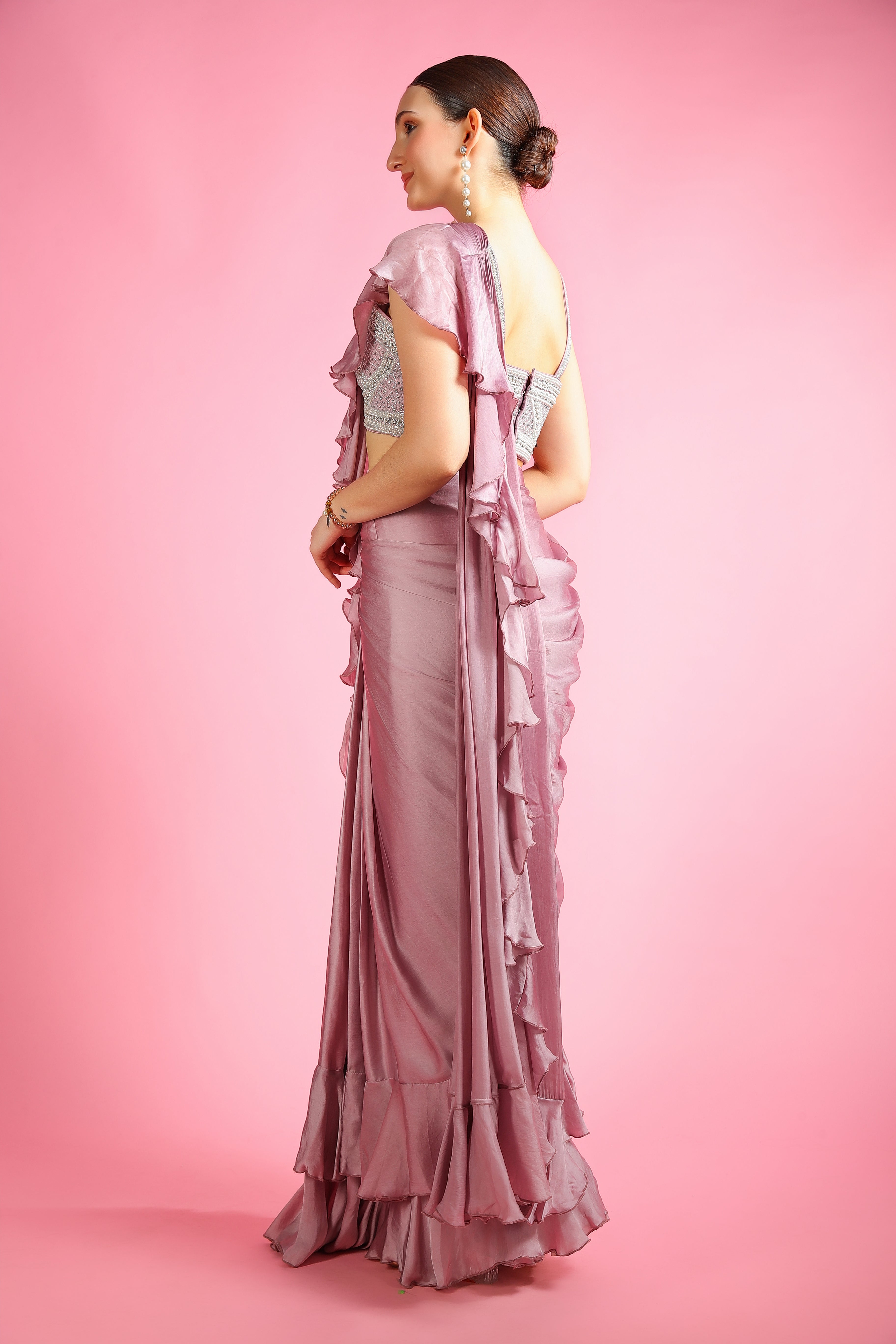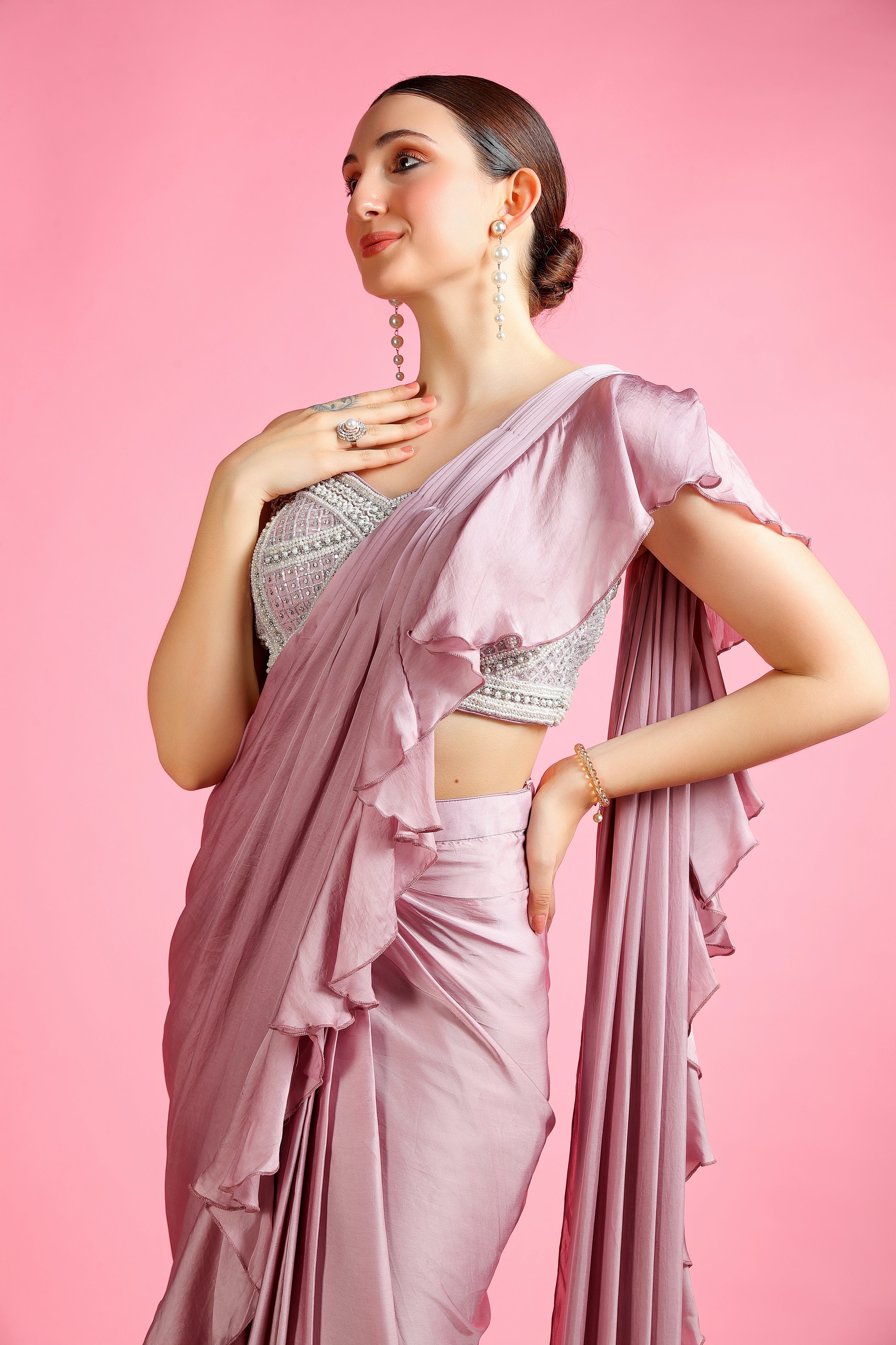 A luminous embodiment of grace and femininity, the Afsaneh Blush Drape Saree exudes timeless charm with its delicate sheen and pastel rose petal softness. The fluid drapes embrace elegance, while the intricate hand embellishments add a subtle shimmer, making it a perfect choice for grand occasions and intimate celebrations.