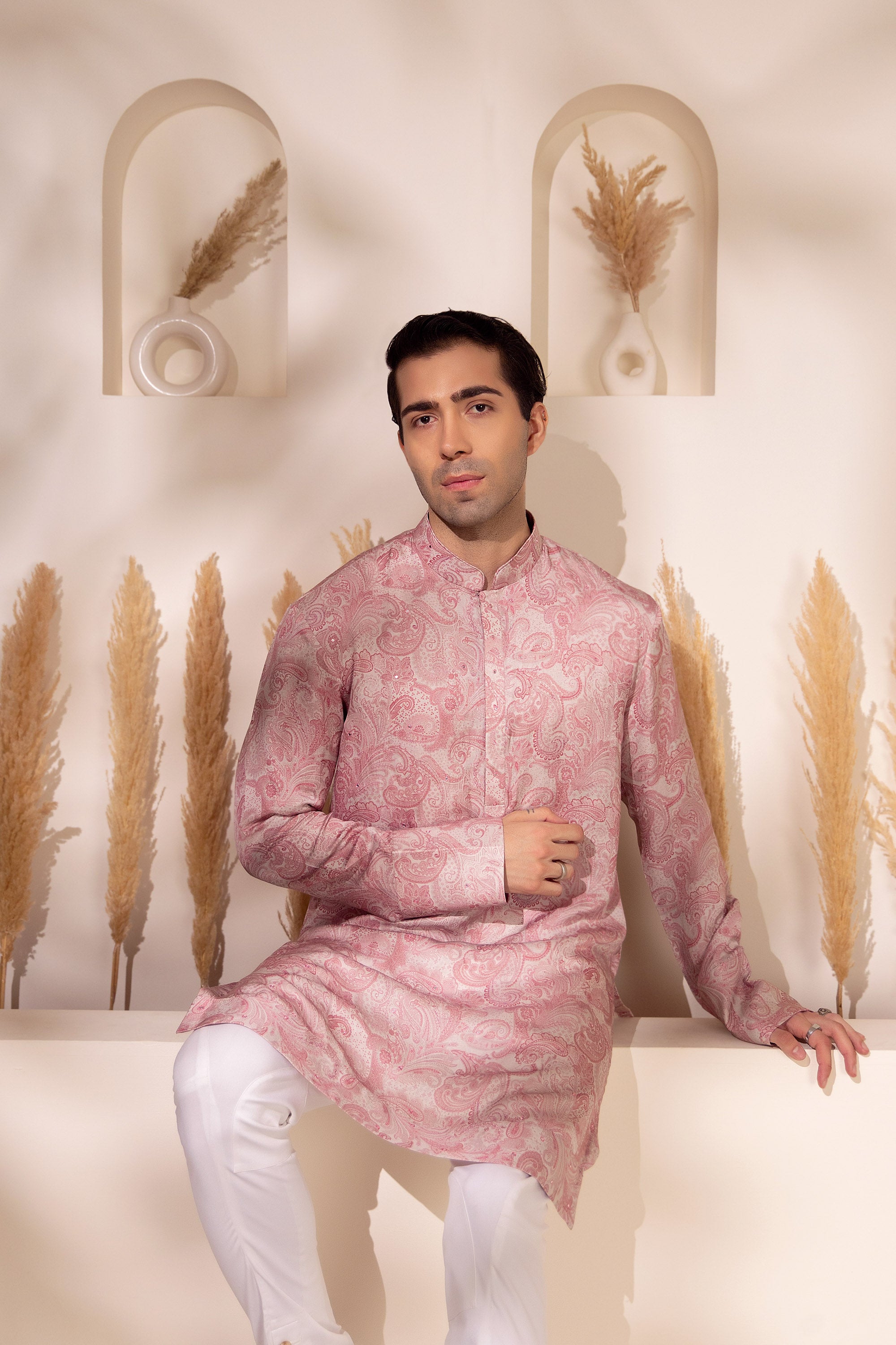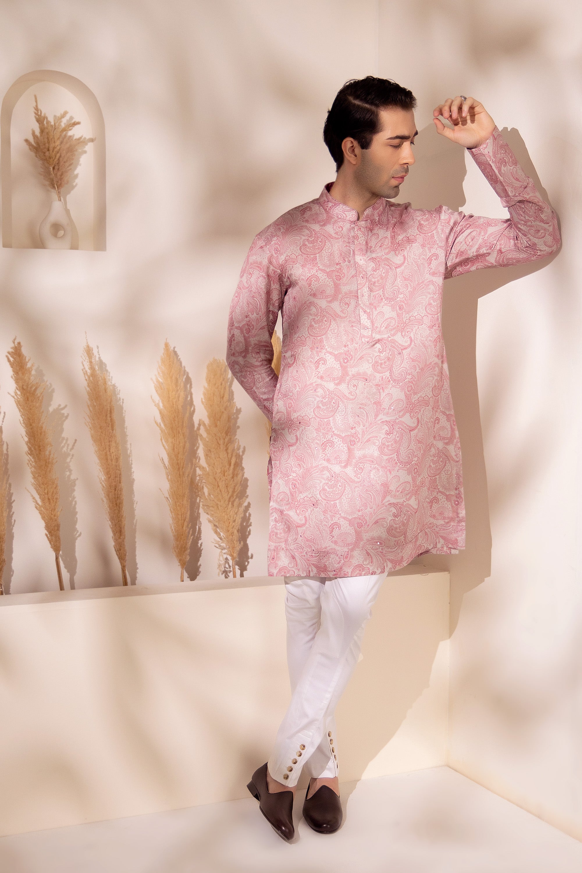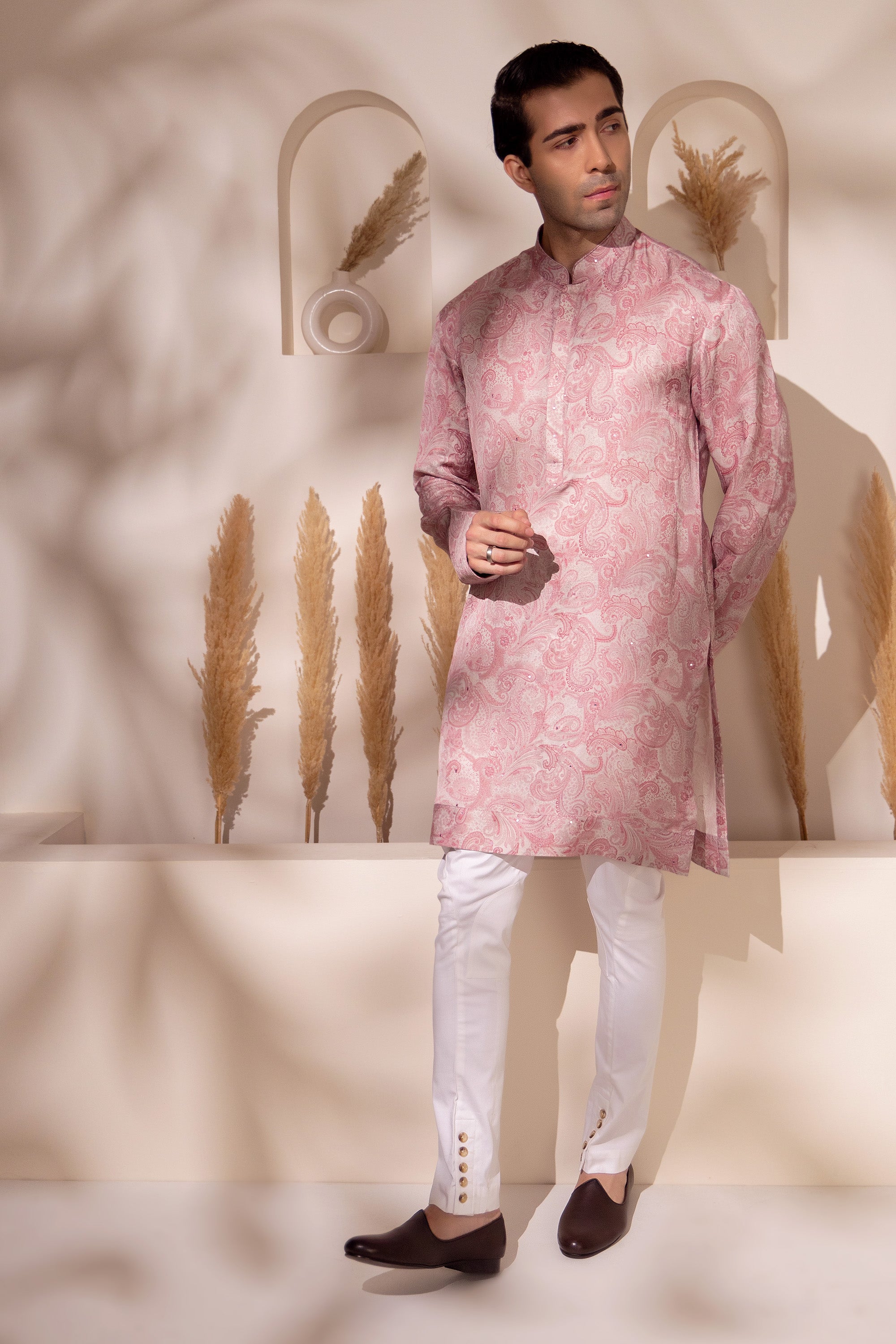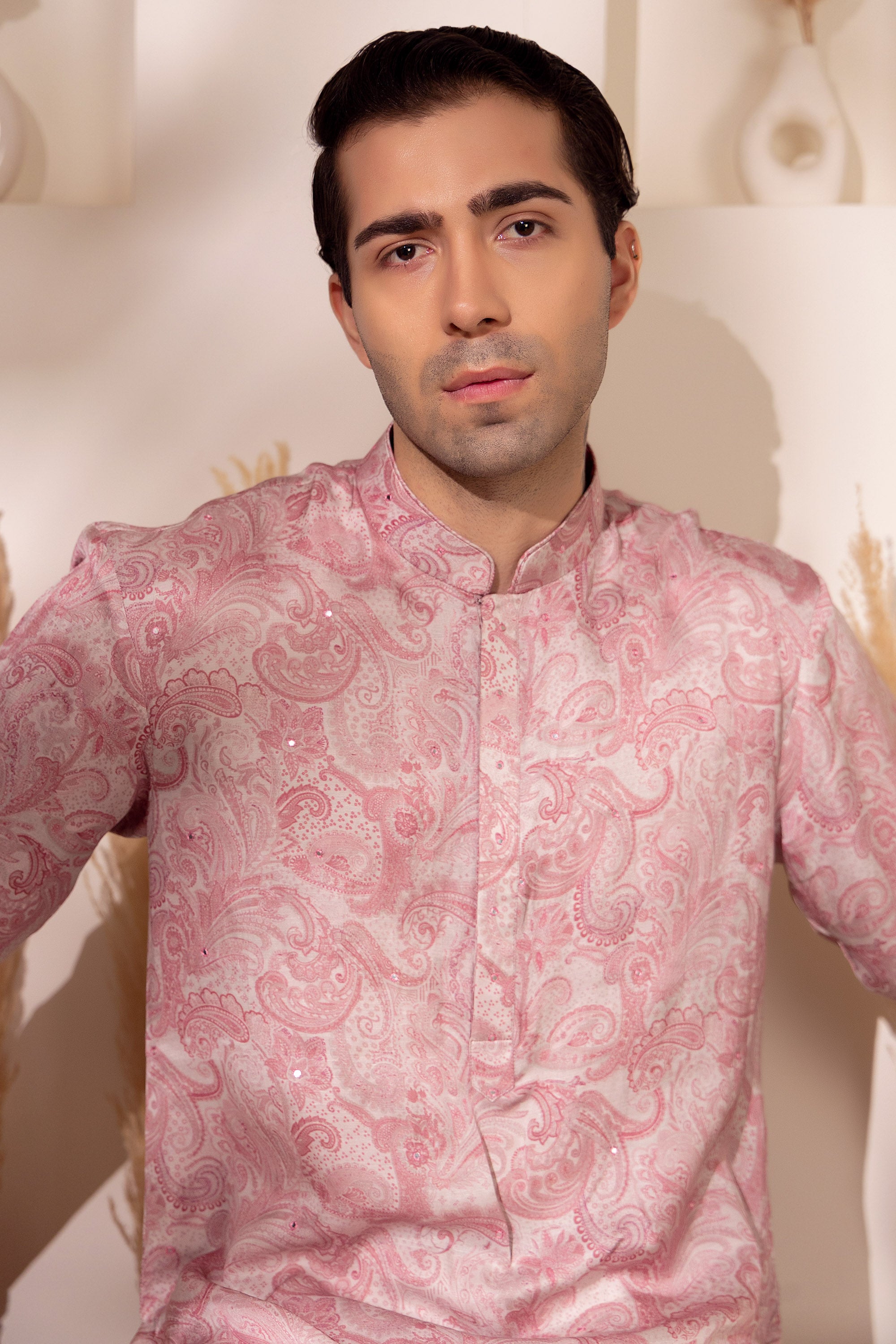 Understated charm meets contemporary grace in this blush pink kurta, crafted in soft sheen silk and adorned with an all-over paisley print. Designed for the modern man who appreciates refined aesthetics, the print blends traditional inspiration with a fresh pastel palette that feels light and celebratory.