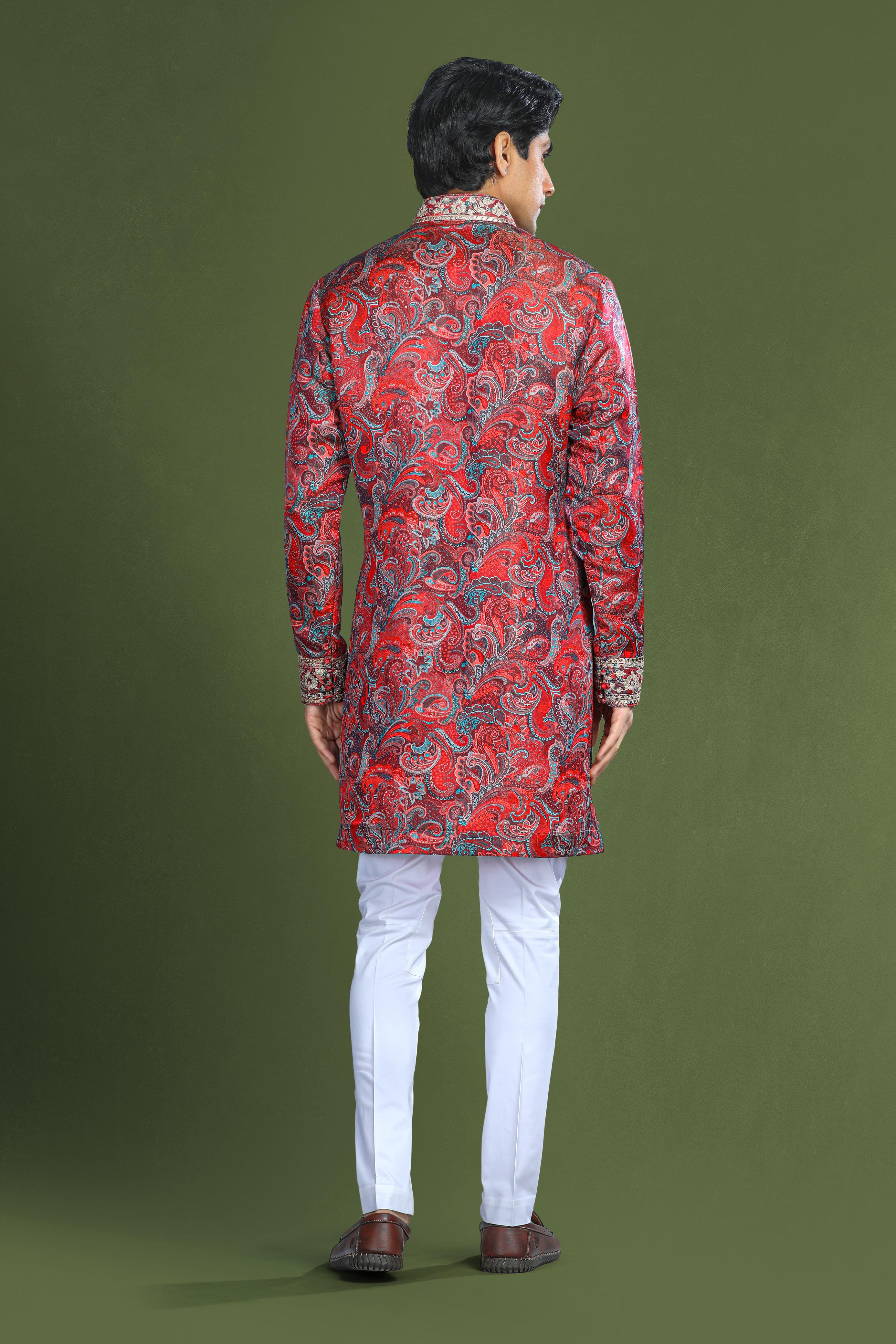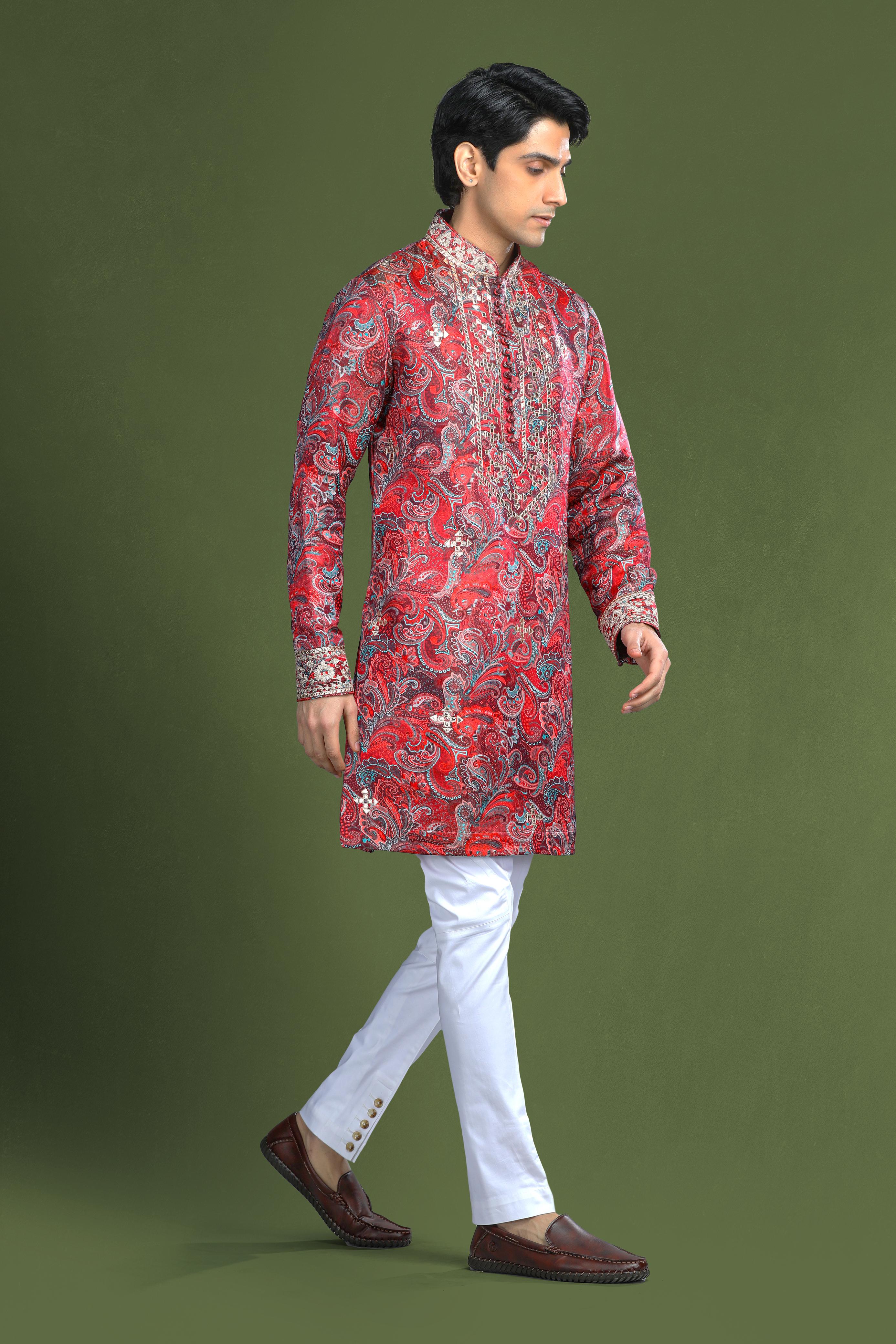 Introducing the Crimson Red Embroidered Kurta, made from smooth satin silk in a lively multi-red colour. This kurta features intricate embroidery on the neck front and cuffs, combining elegance with style. The soft fabric ensures both comfort and sophistication, making it a great addition to your wardrobe for any occasion.