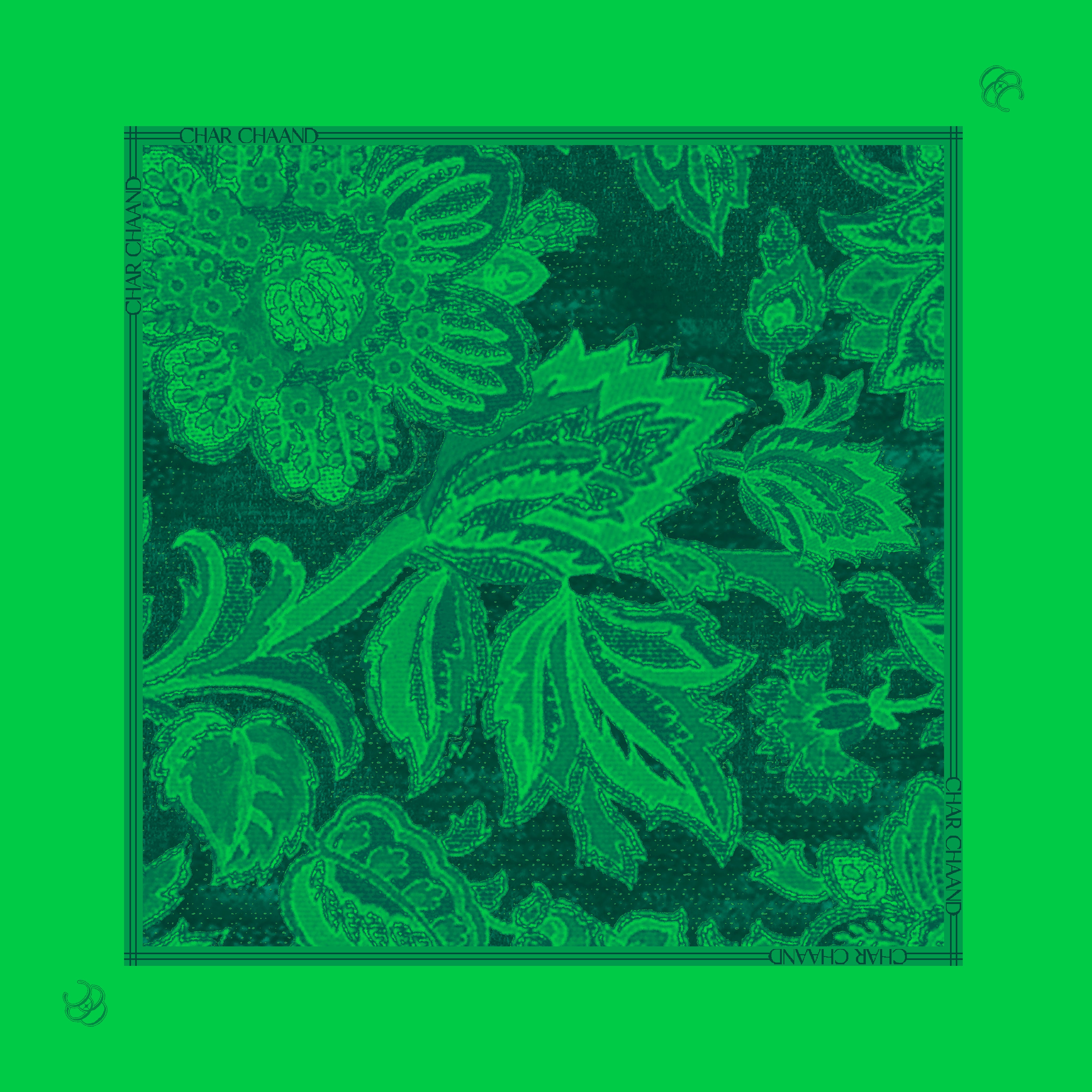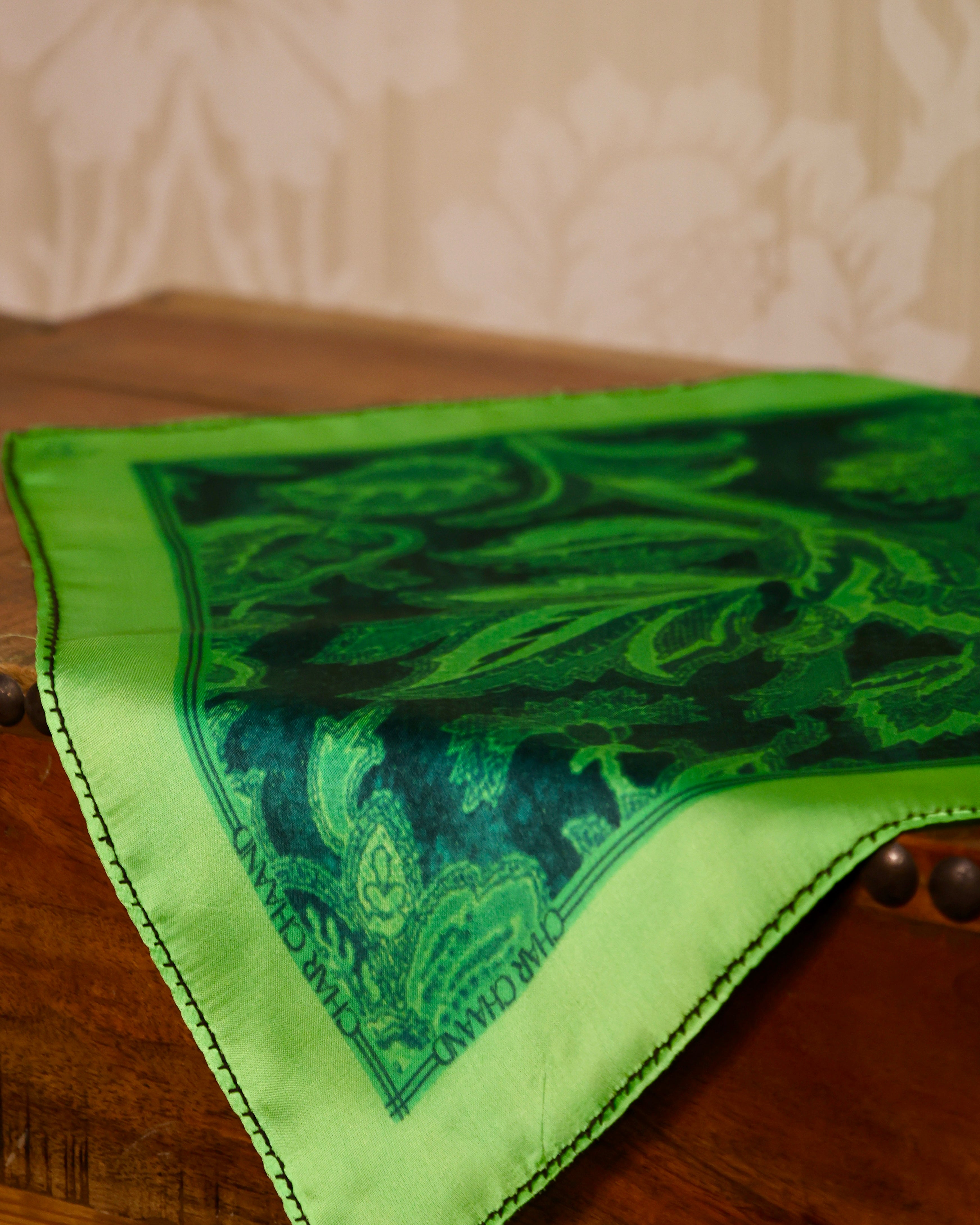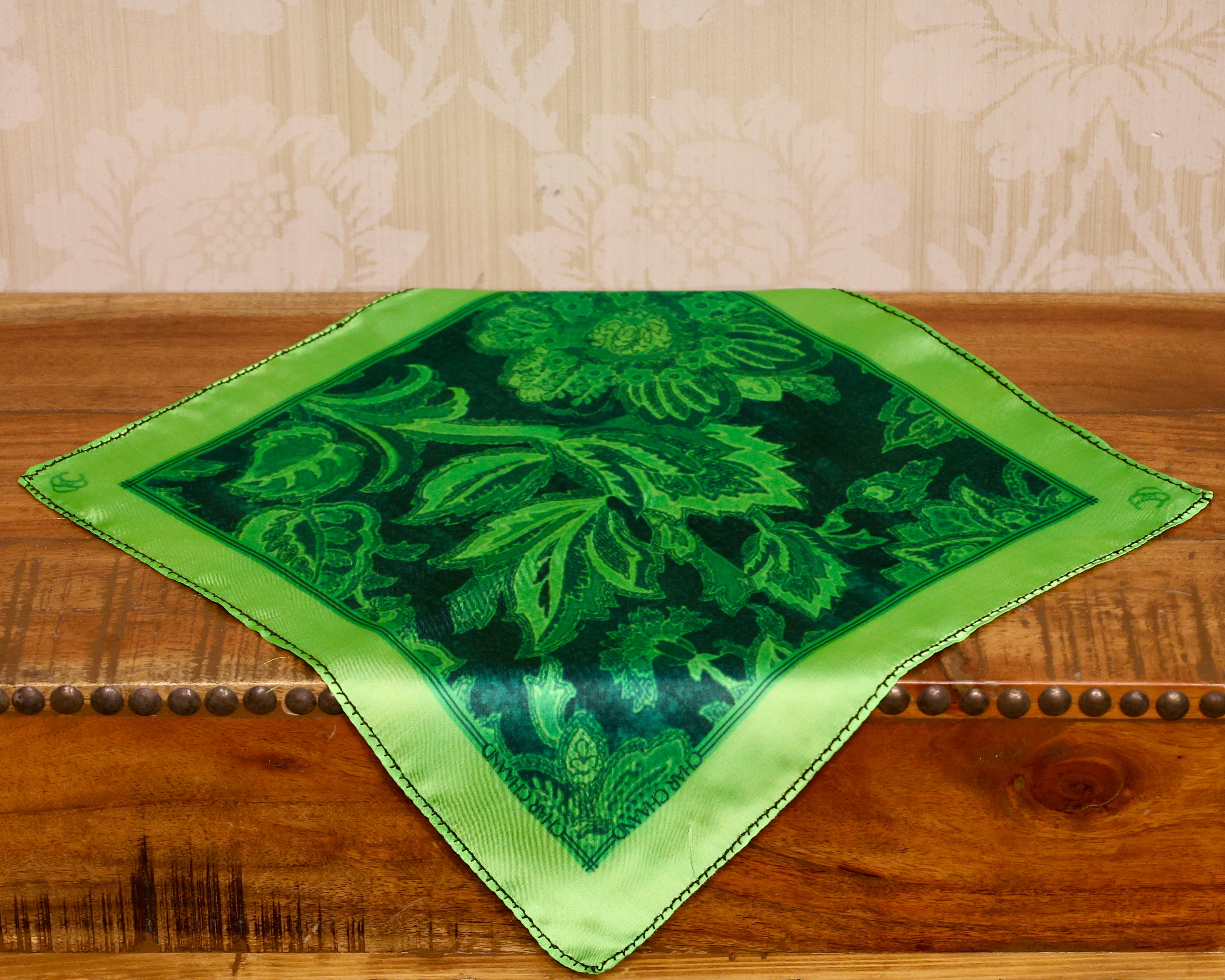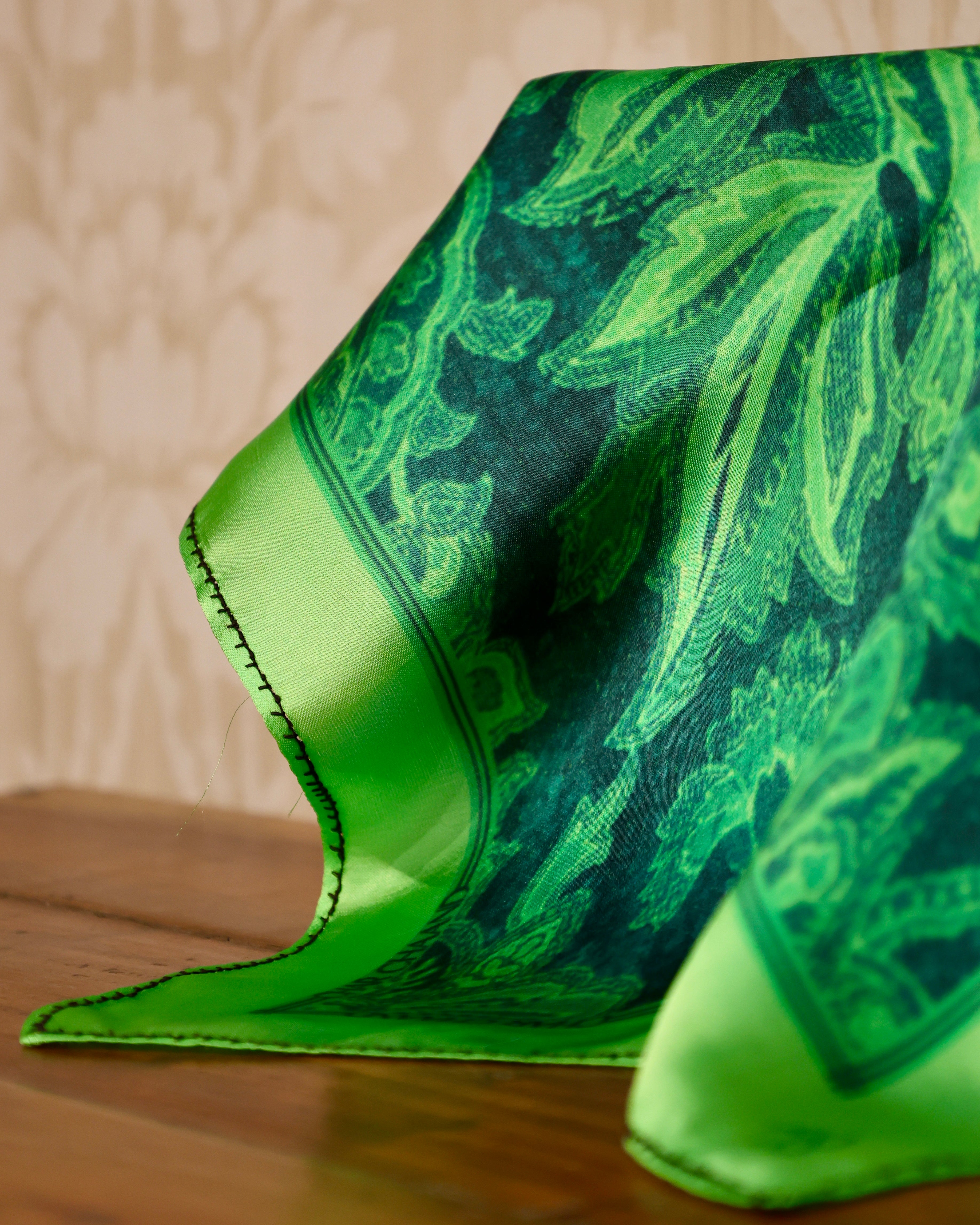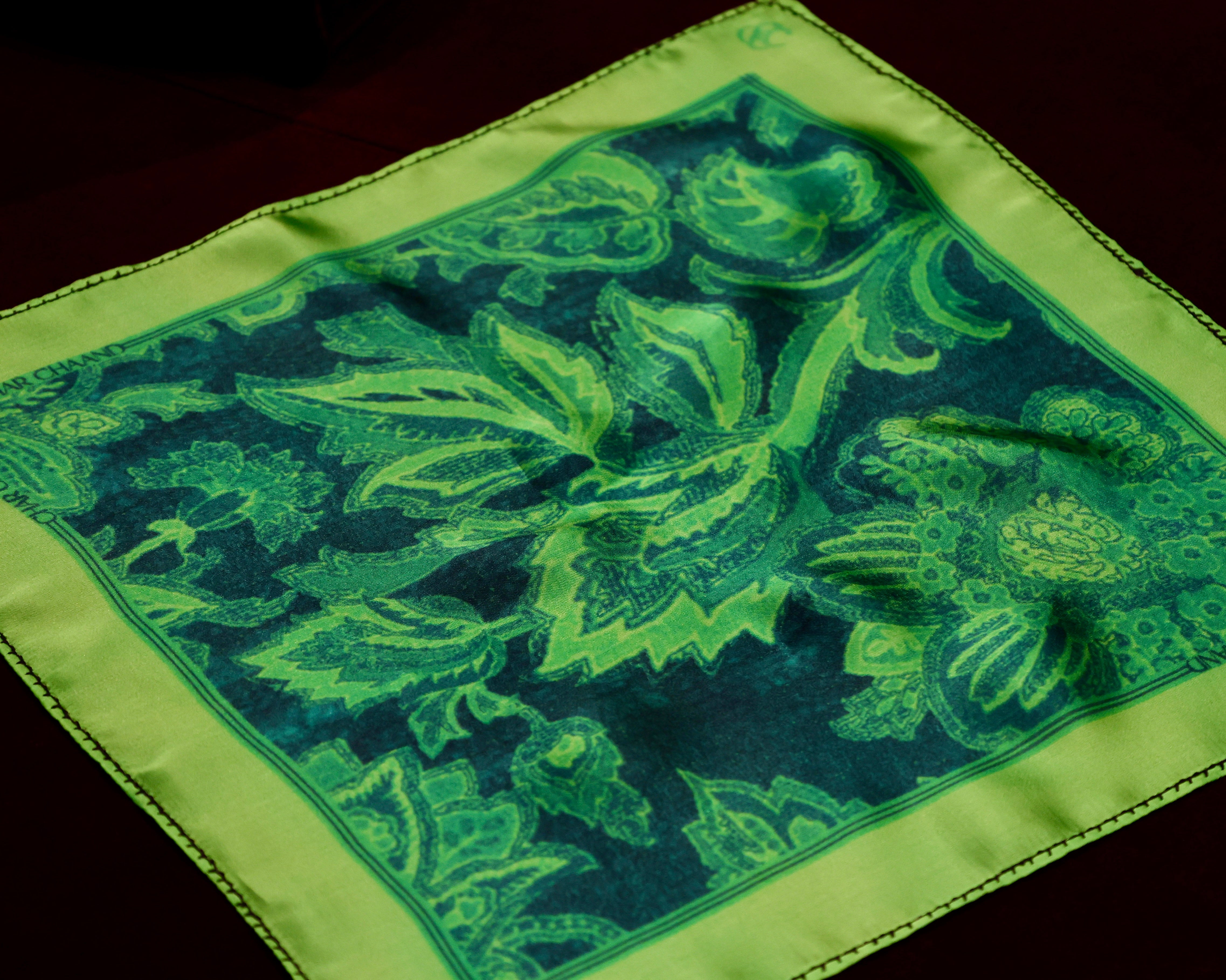 The "Emerald Bloom" pocket square is a bold statement piece, featuring striking floral patterns in deep emerald green with contrasting undertones. Its design radiates confidence and timeless style.