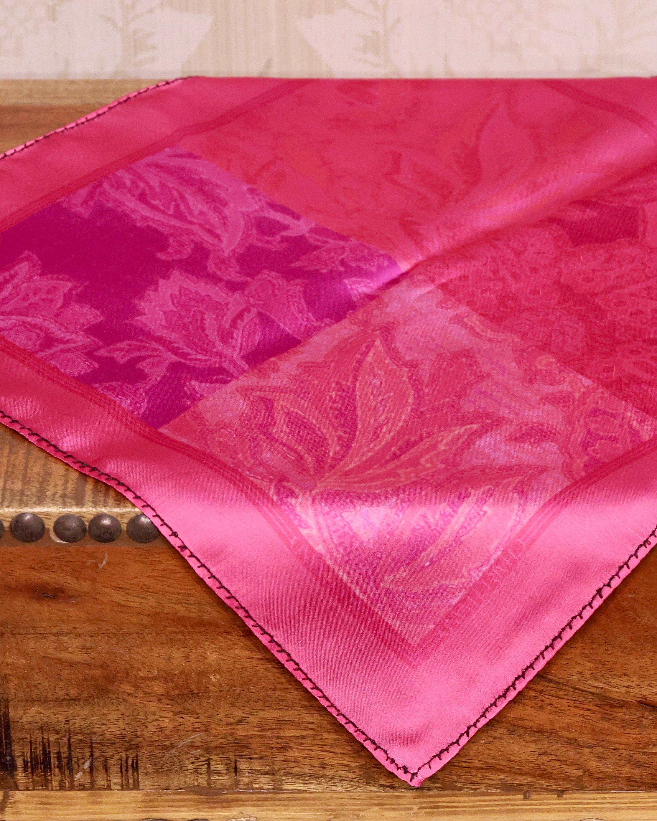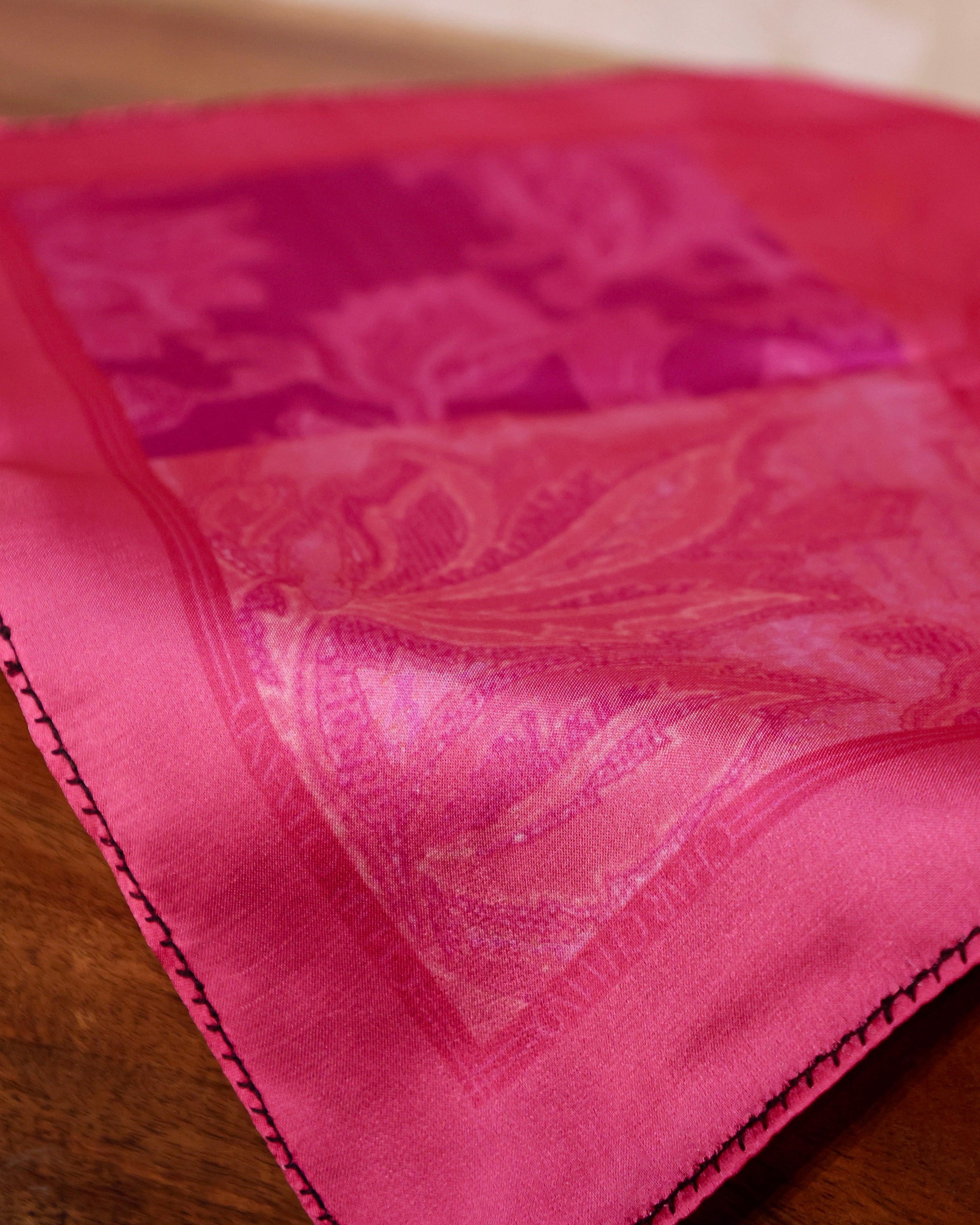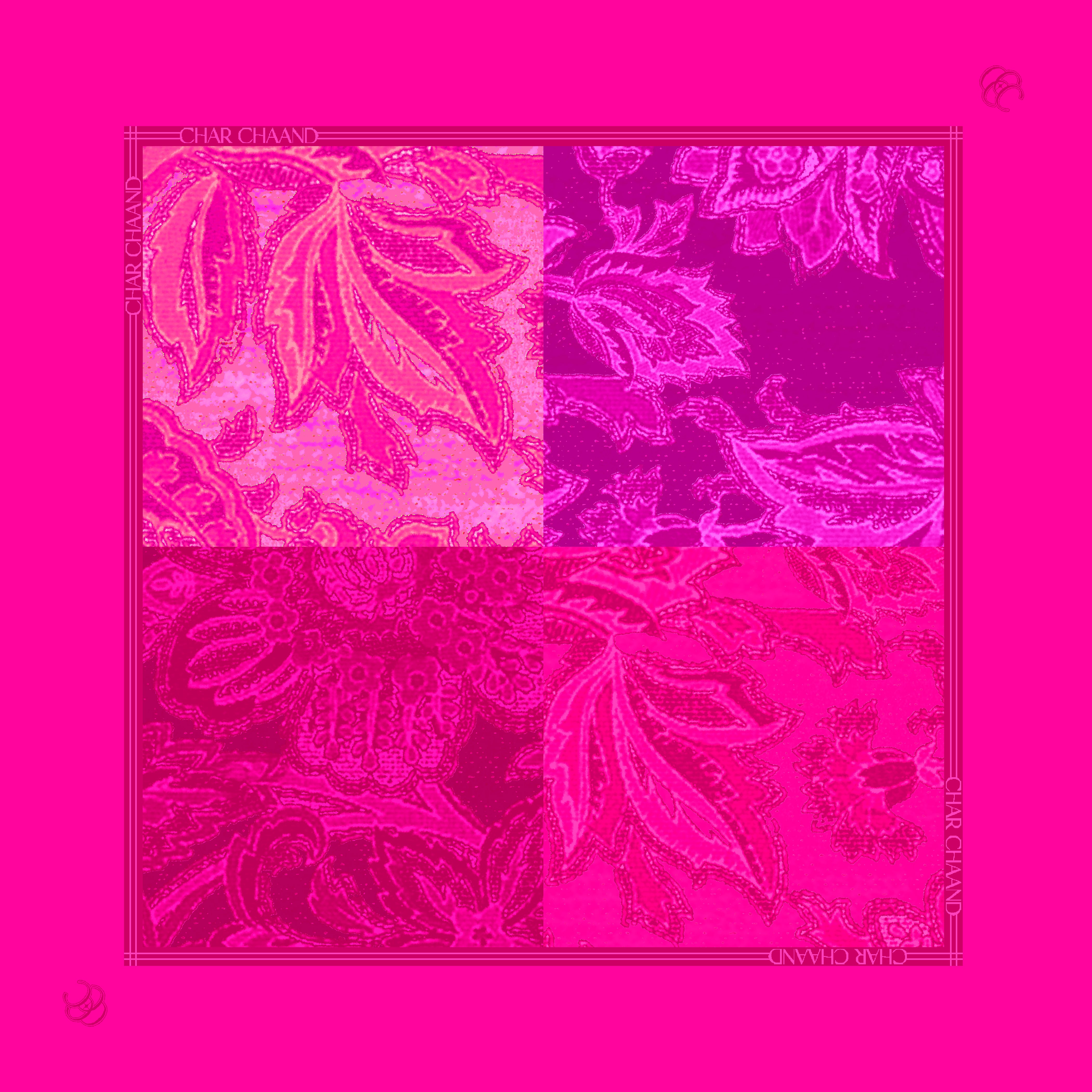 "Fuchsia Mirage" features a dynamic quadrant layout with bold pink and magenta floral motifs. The vibrant palette symbolizes a lively and modern aesthetic with artistic undertones.