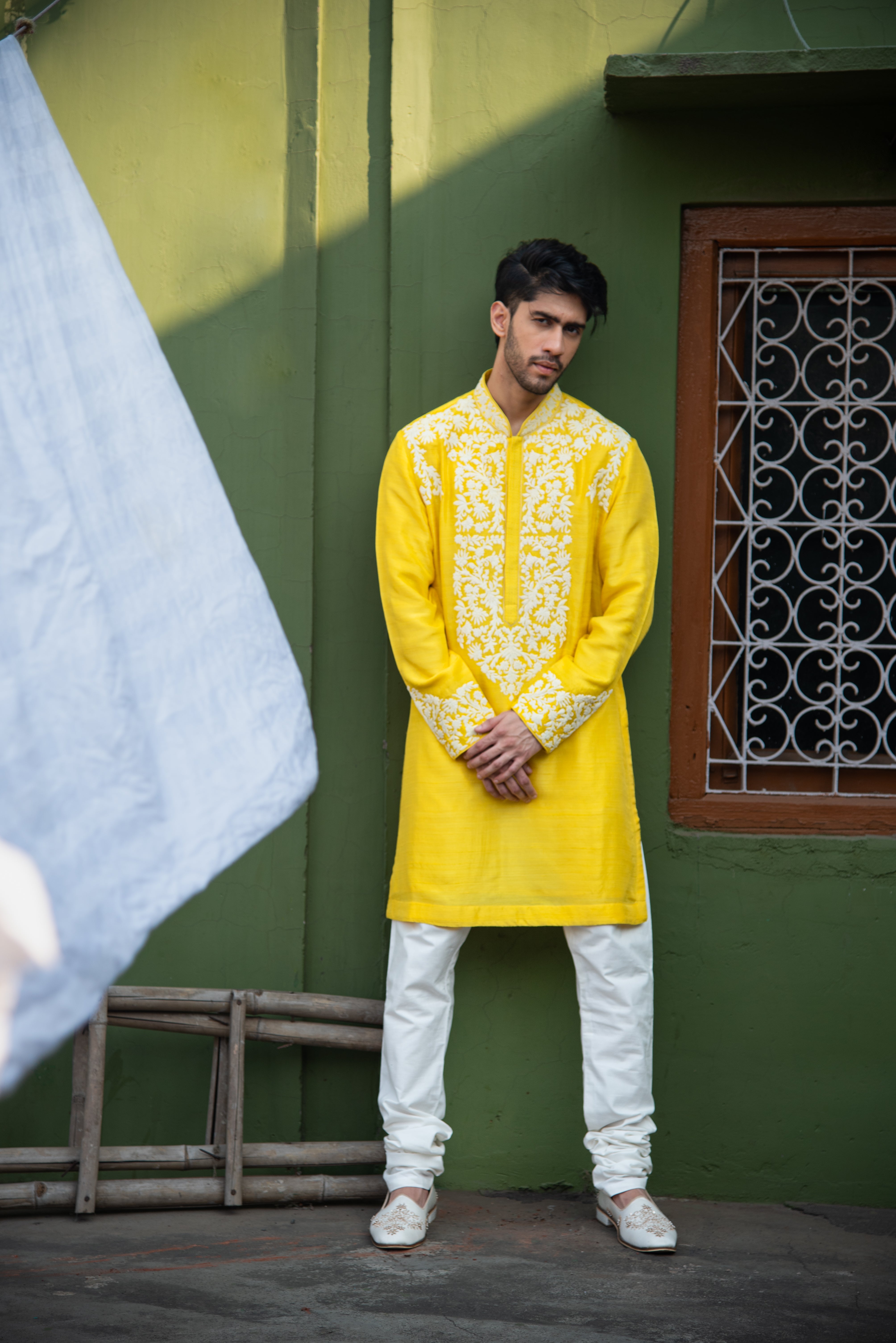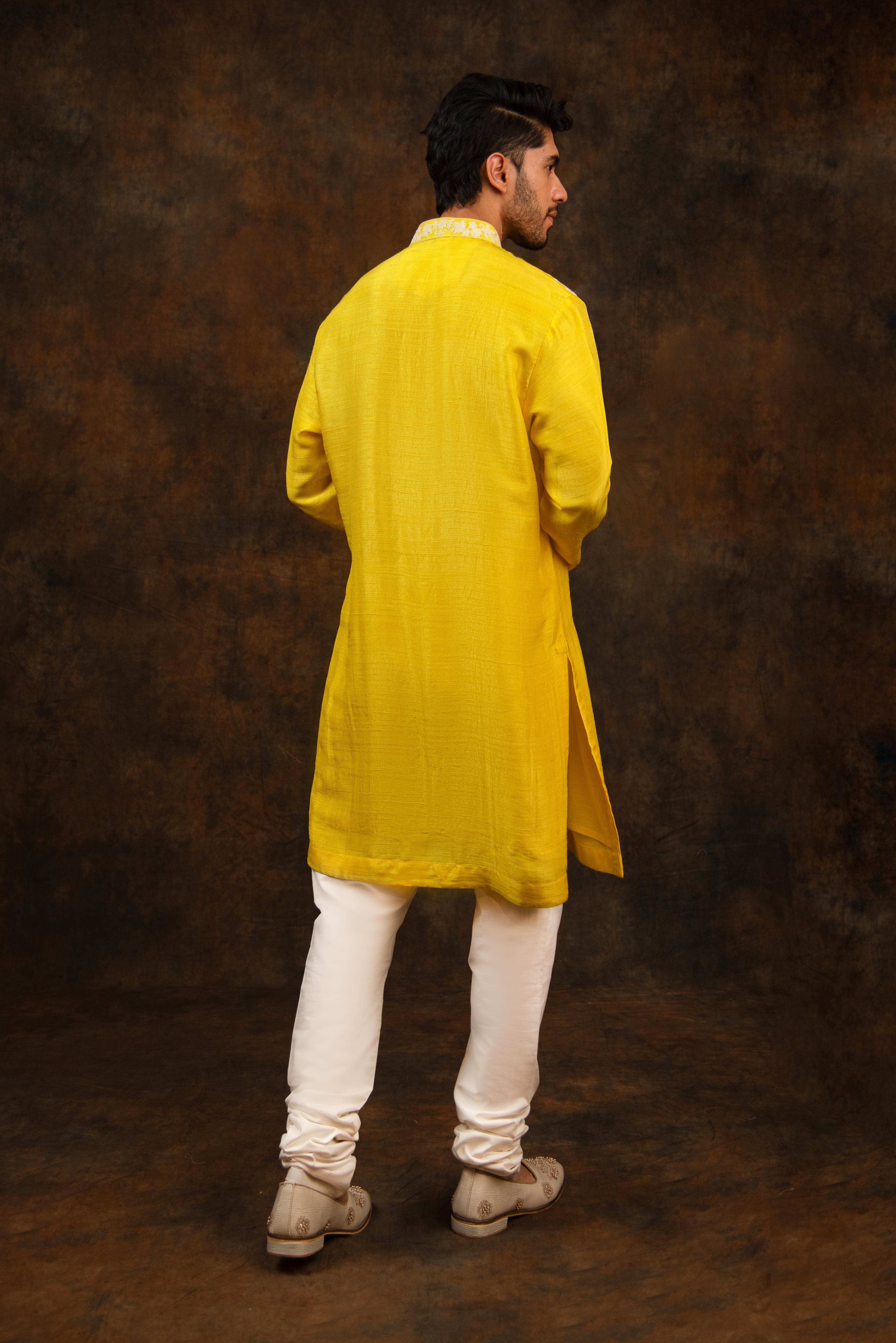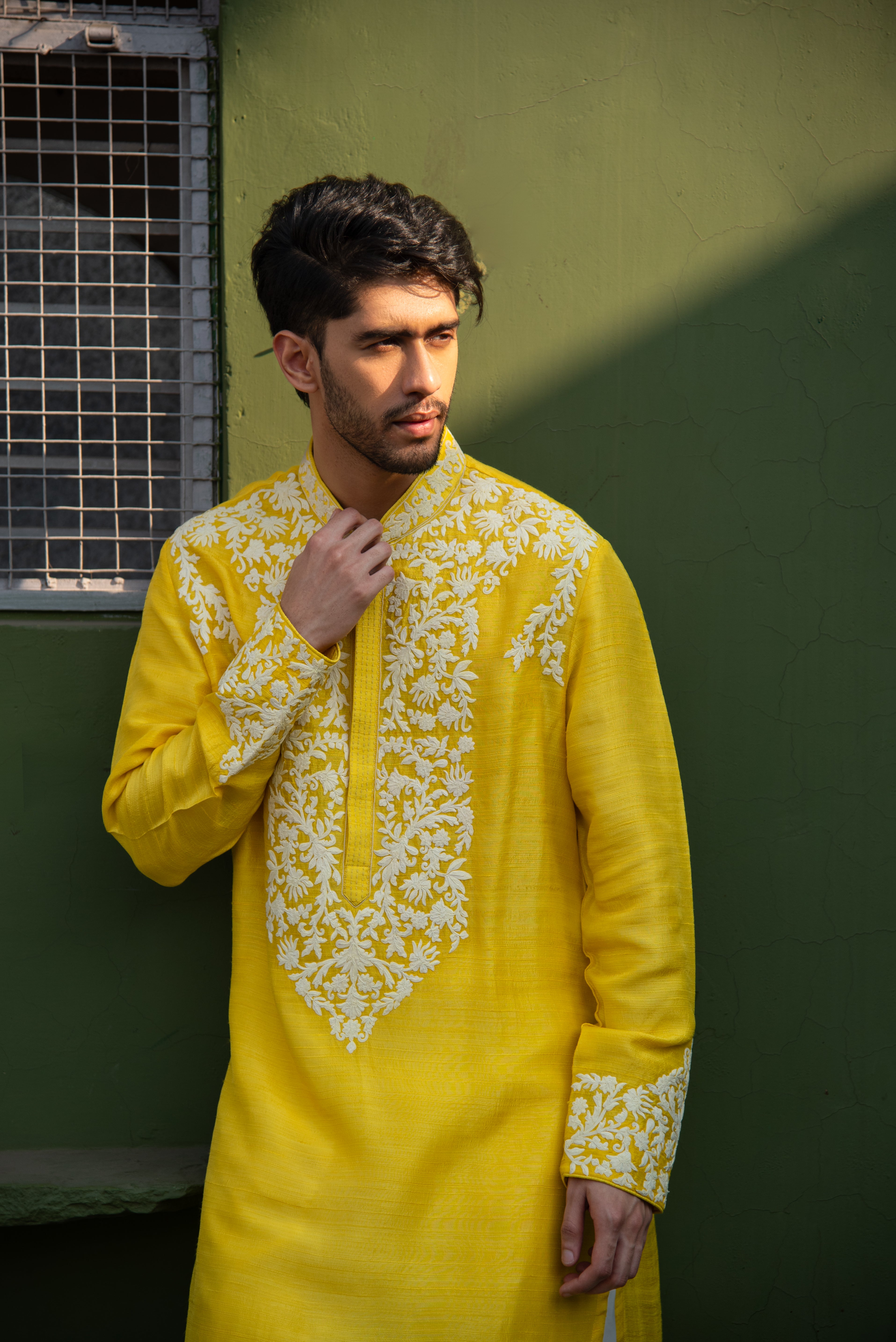 The Golden Glow Yellow Kurta is a stunning piece that showcases intricate kiran dori embroidery, gracefully accentuating the yoke, shoulders, and cuff ends. The refined saddle stitching along the openings adds a subtle touch of craftsmanship, enhancing its overall elegance. This kurta blends traditional artistry with modern sophistication, making it the perfect choice for any occasion. Its vibrant hue and fine detailing make it a versatile addition to your wardrobe.