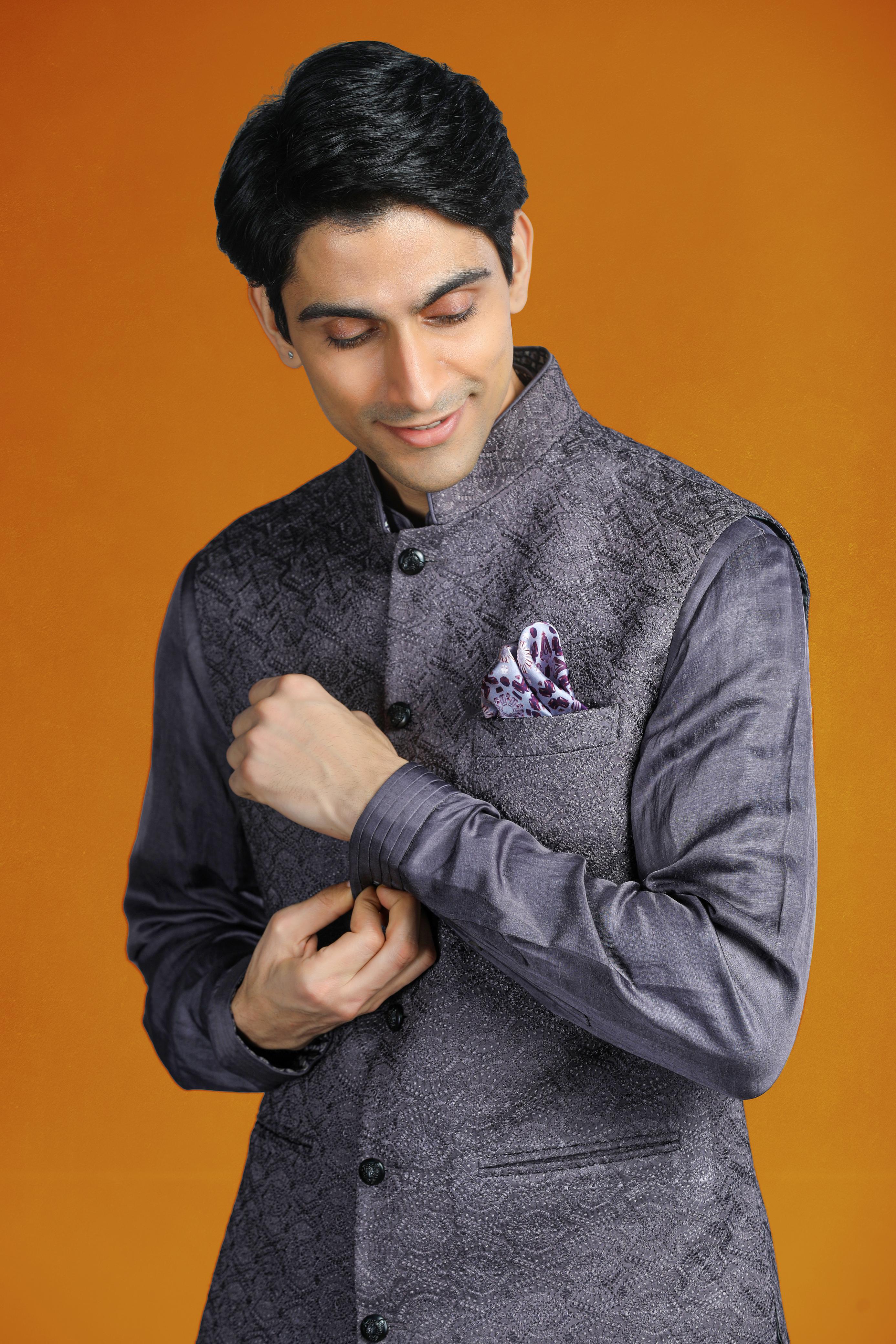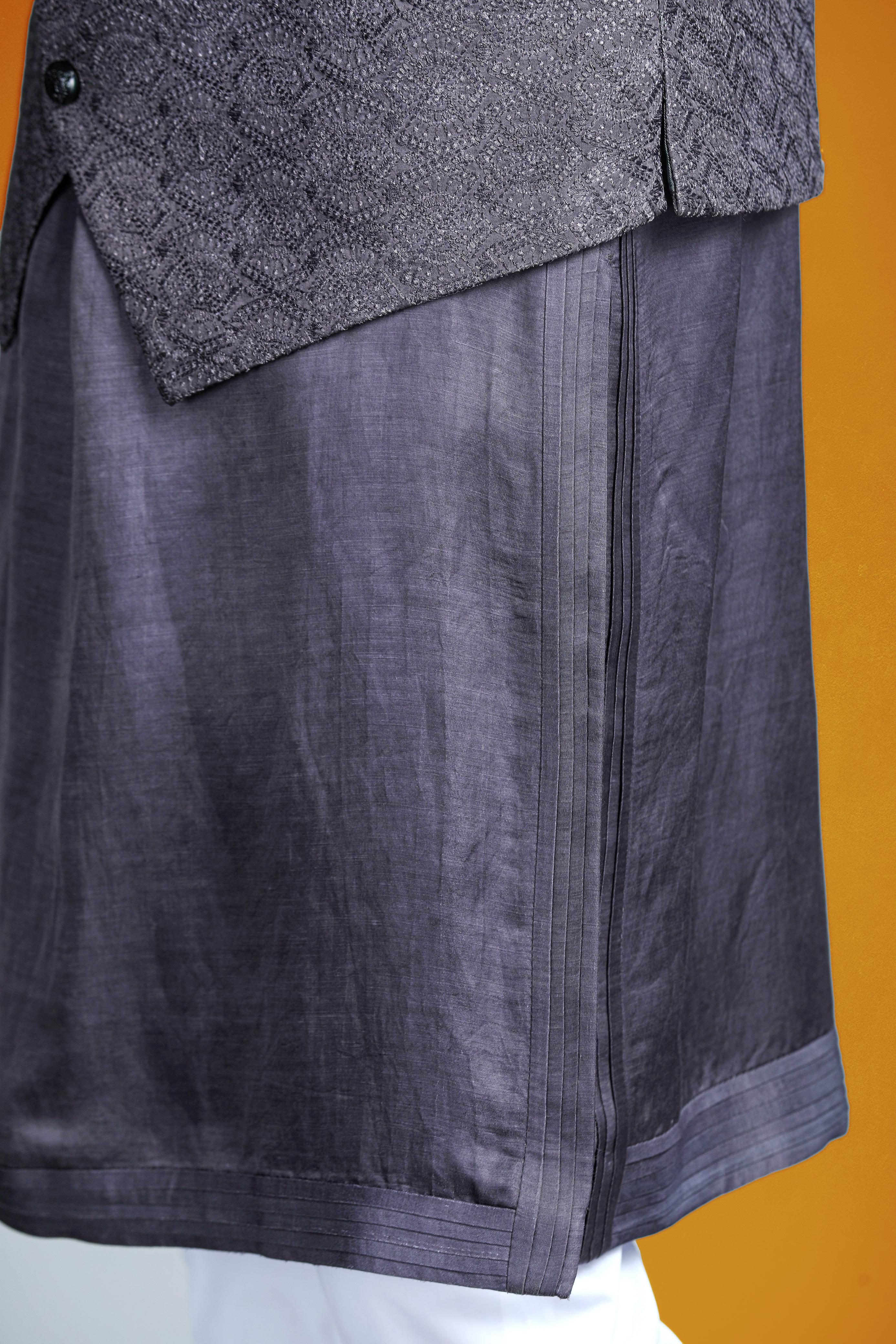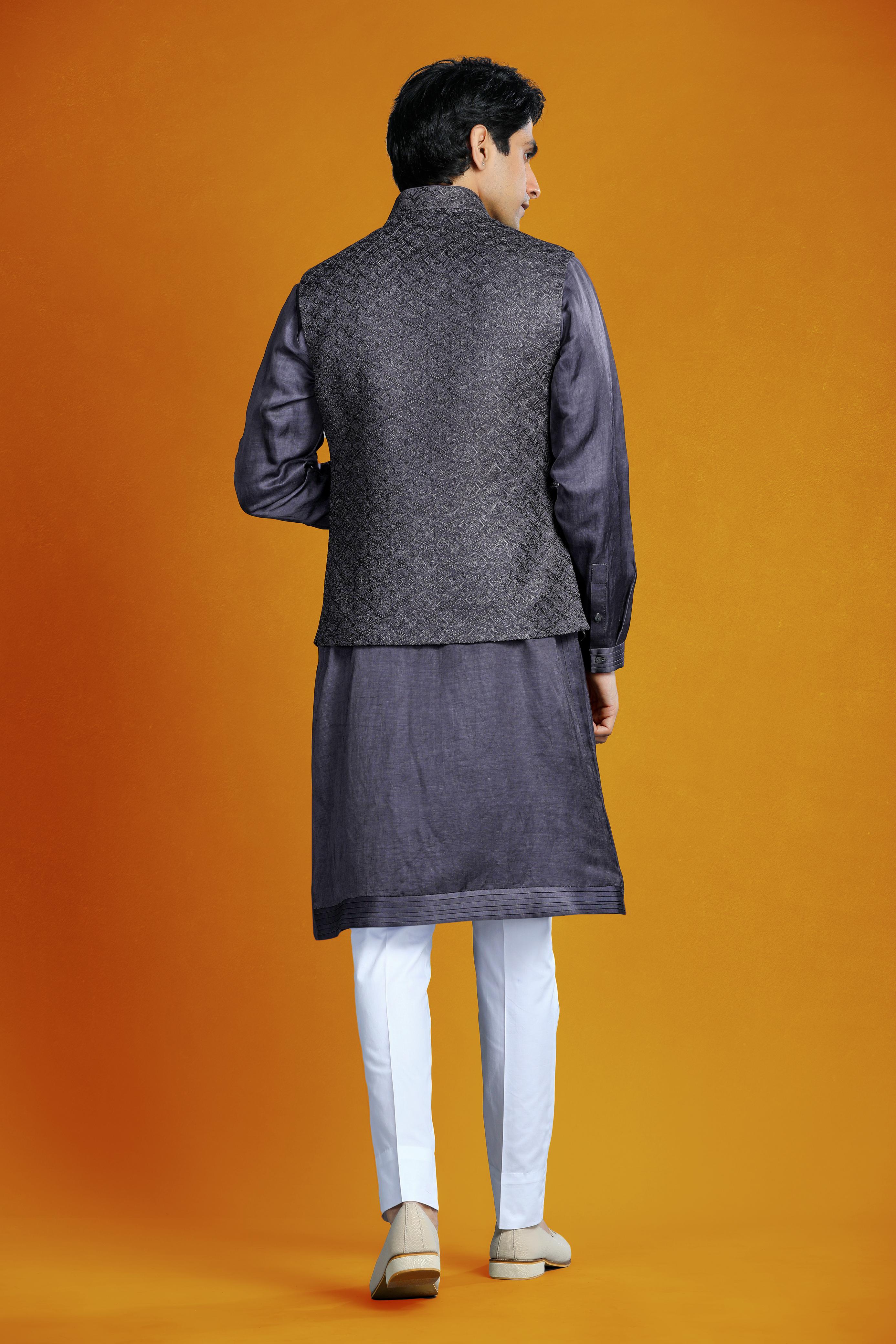 Introducing the Grey Mist Bundi & Kurta Set, a sophisticated ensemble that blends traditional artistry with modern tailoring. The chikankari embroidered Bundi, crafted in a timeless grey shade, pairs effortlessly with the linen satin kurta featuring pleat detailing on the cuffs, collar, and hemline. Ideal for formal gatherings or festive events, this outfit offers comfort without compromising on style.