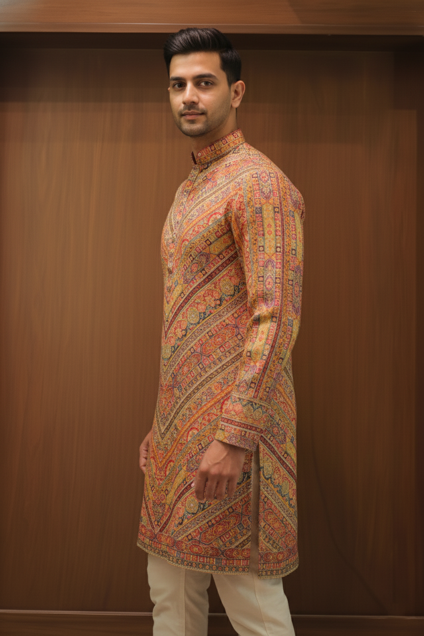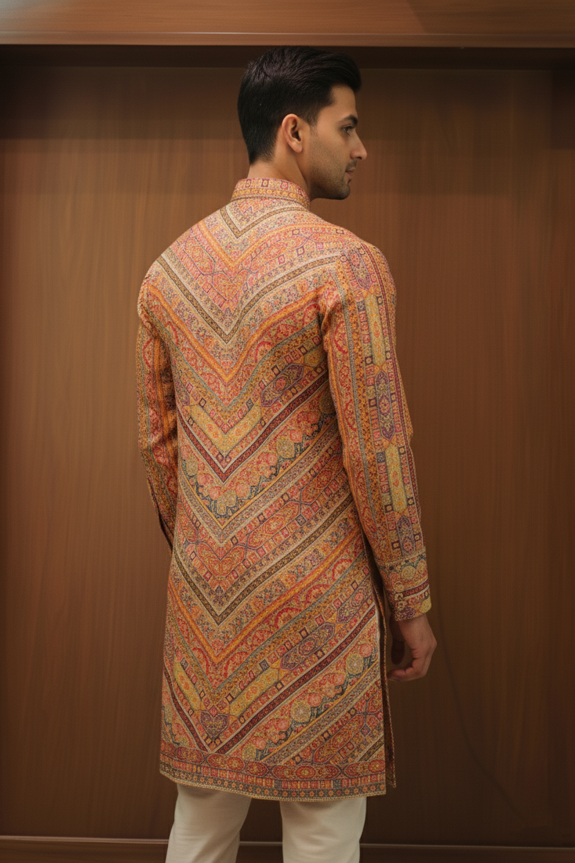 Heritage Chevron Tapestry Kurta showcases intricate chevron and geometric motifs in warm hues of rust, mustard, blue, and earthy tones. Crafted from premium linen silk, it features a structured mandarin collar, clean placket, and refined cuffs, making it an elegant choice for festive occasions and cultural celebrations.