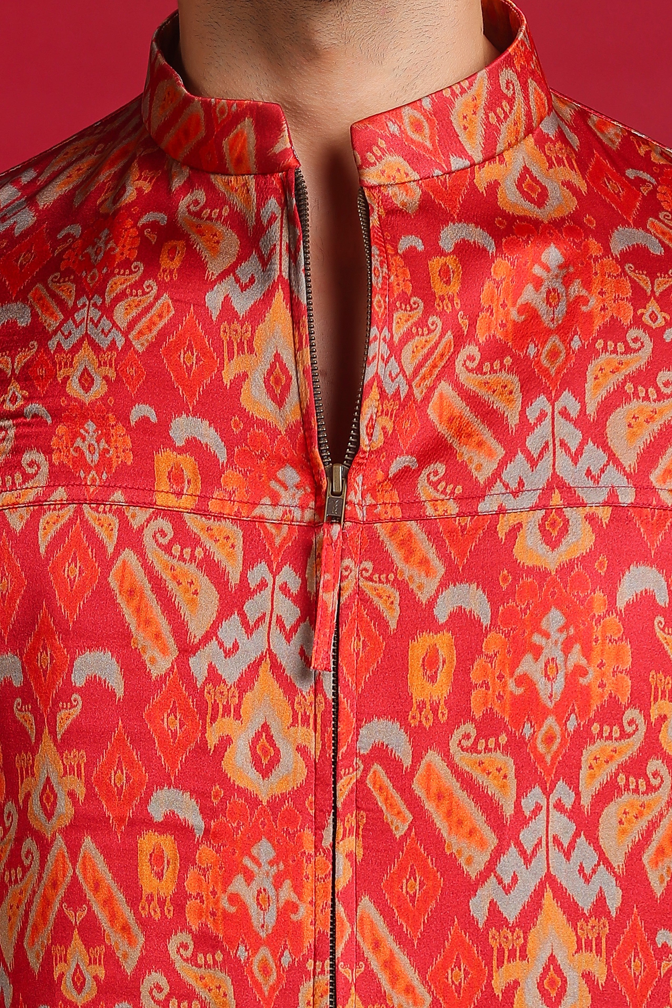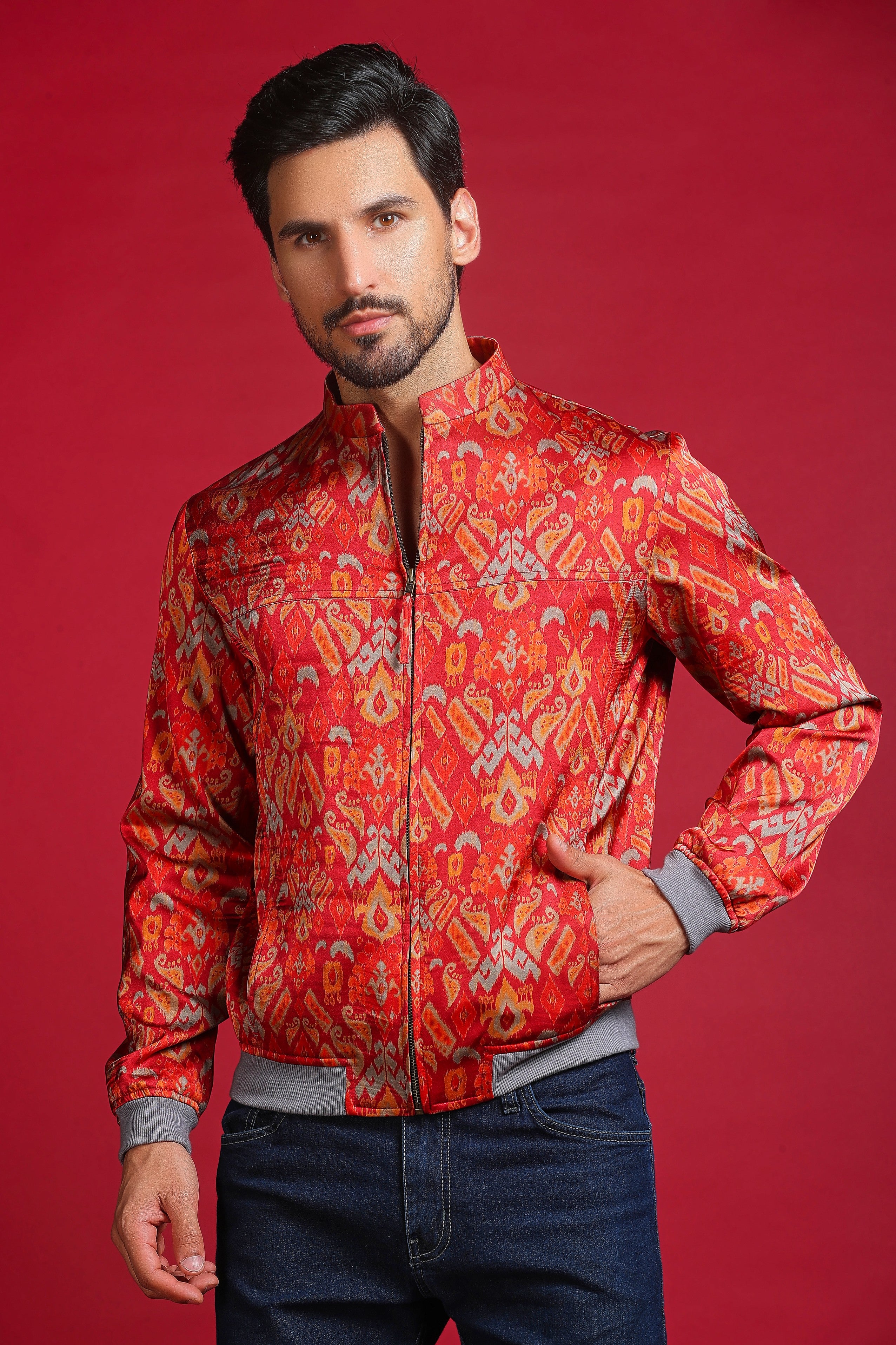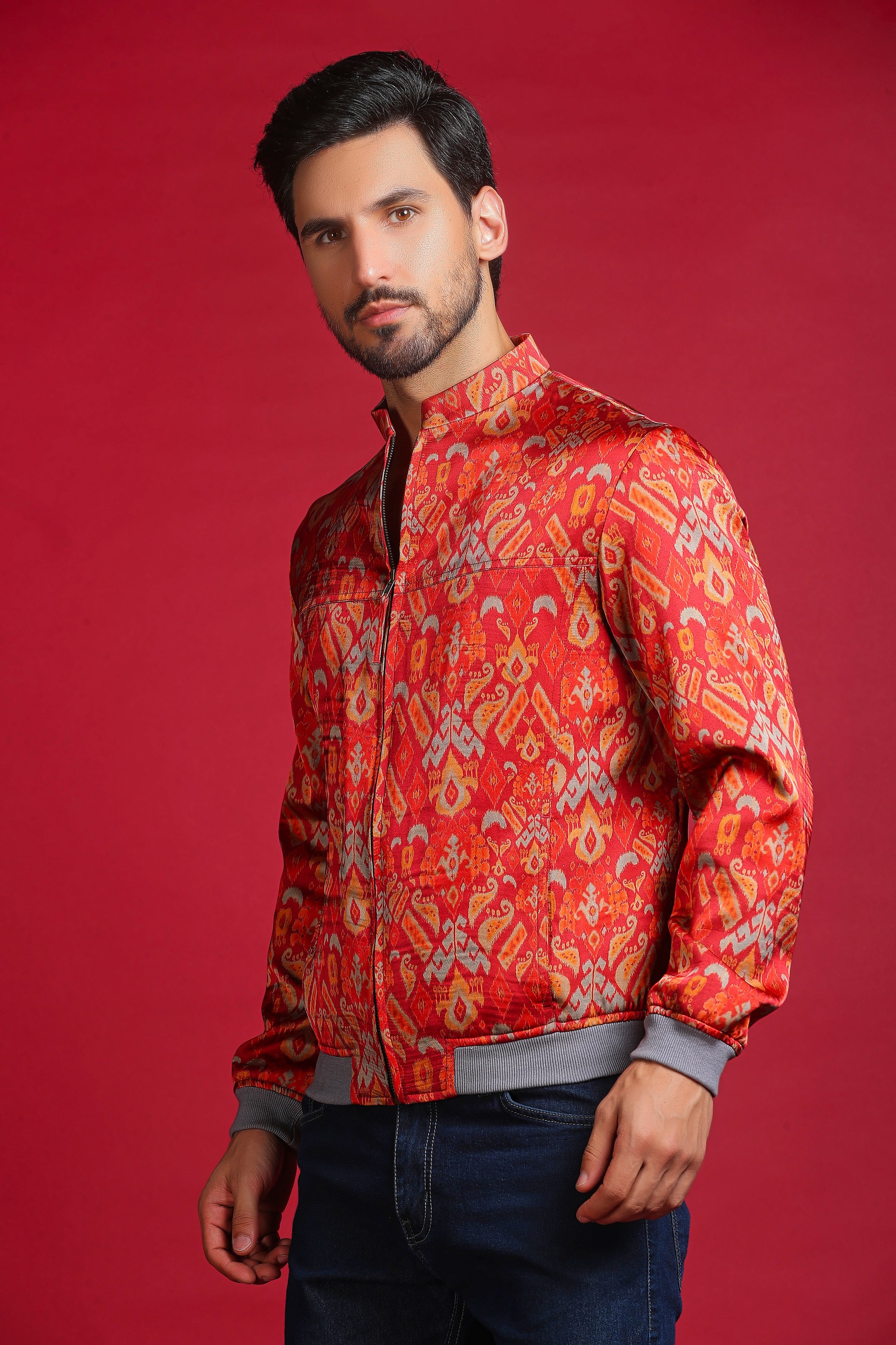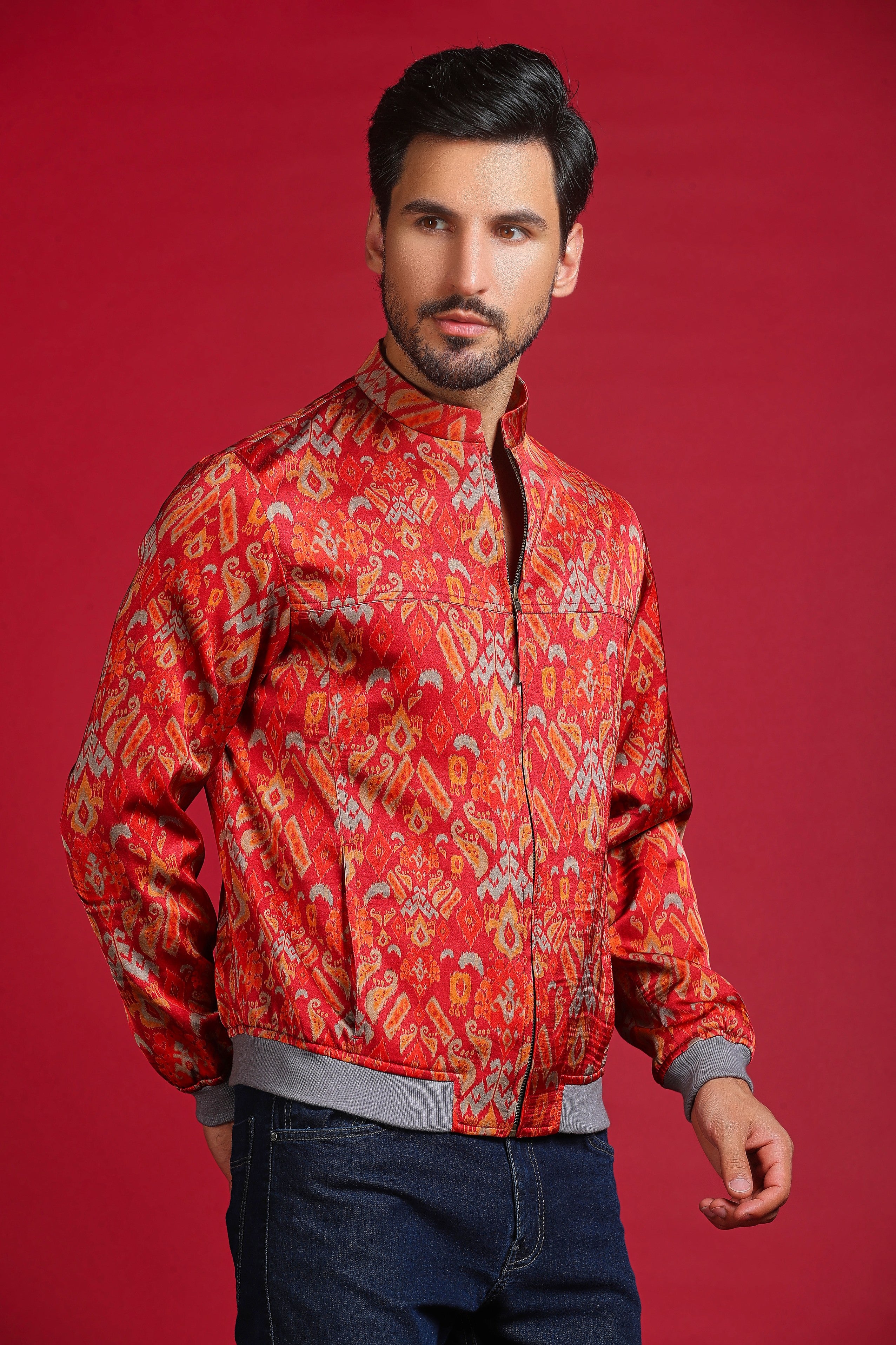 Introducing the Red Ikat Printed Bomber Jacket – a perfect blend of timeless style and modern sophistication. Crafted from luxurious satin silk, this jacket features a stunning Ikat-inspired digital print in rich shades of red, adding an elegant touch to any ensemble. Versatile and effortlessly stylish, it’s ideal for any occasion. Complete the look by pairing it with matching pants available under the bottom section.