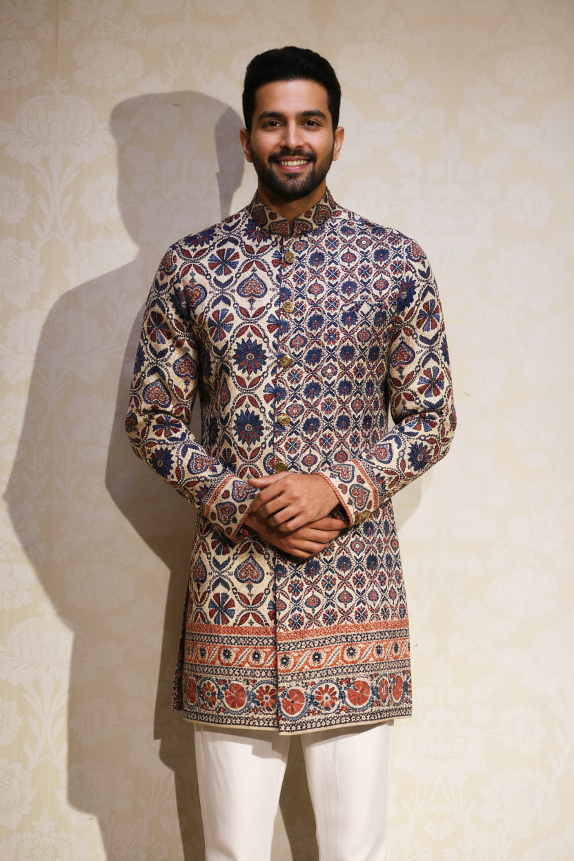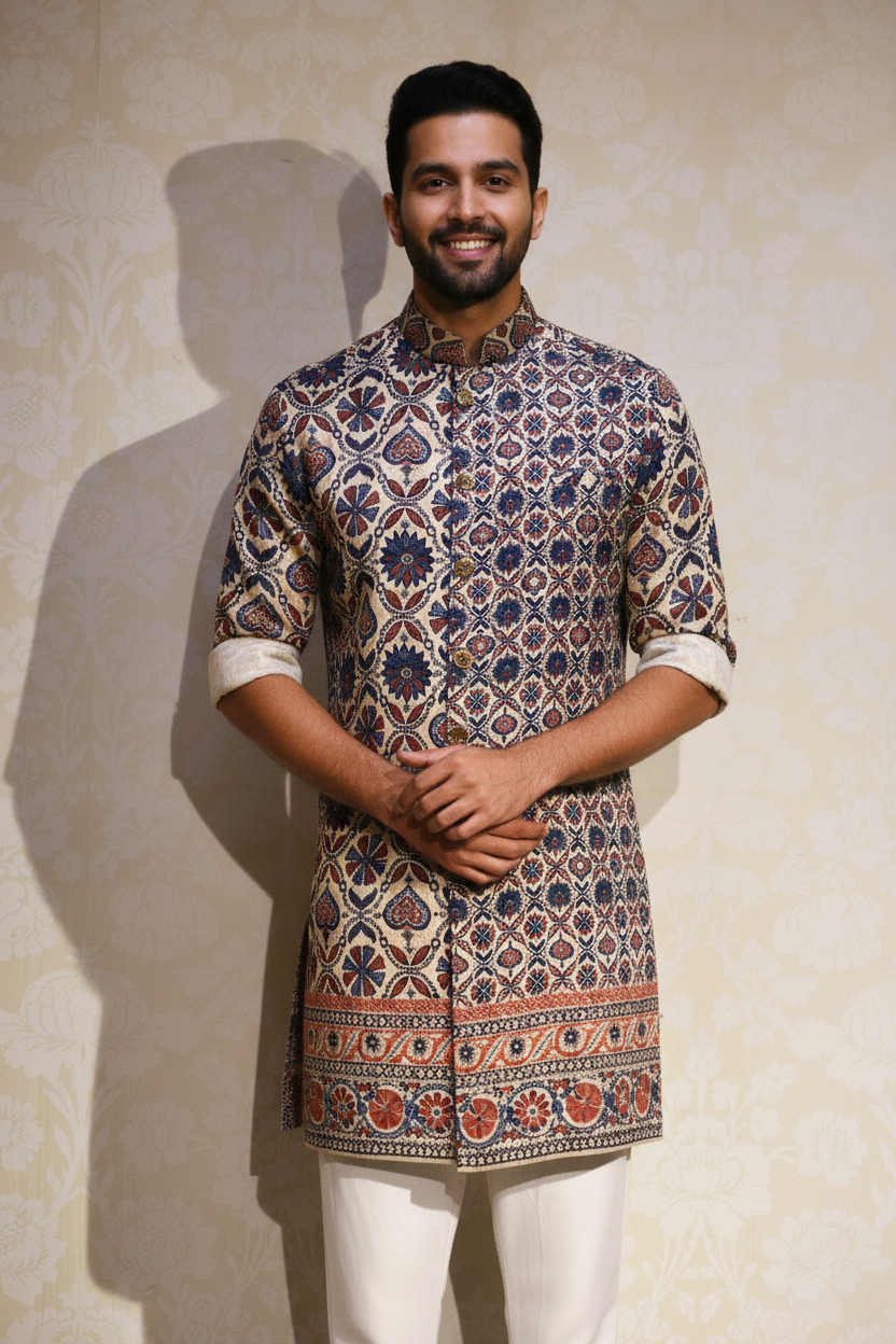 Indigo Ajrakh Mosaic Kurta showcases heritage craftsmanship with a richly detailed ajrakh-inspired mosaic of geometric and floral motifs. Crafted from premium fabric on an ivory base with indigo and rust accents, it features contrast panel detailing, ornate buttons, and a detailed hem—perfect for festive and cultural occasions.