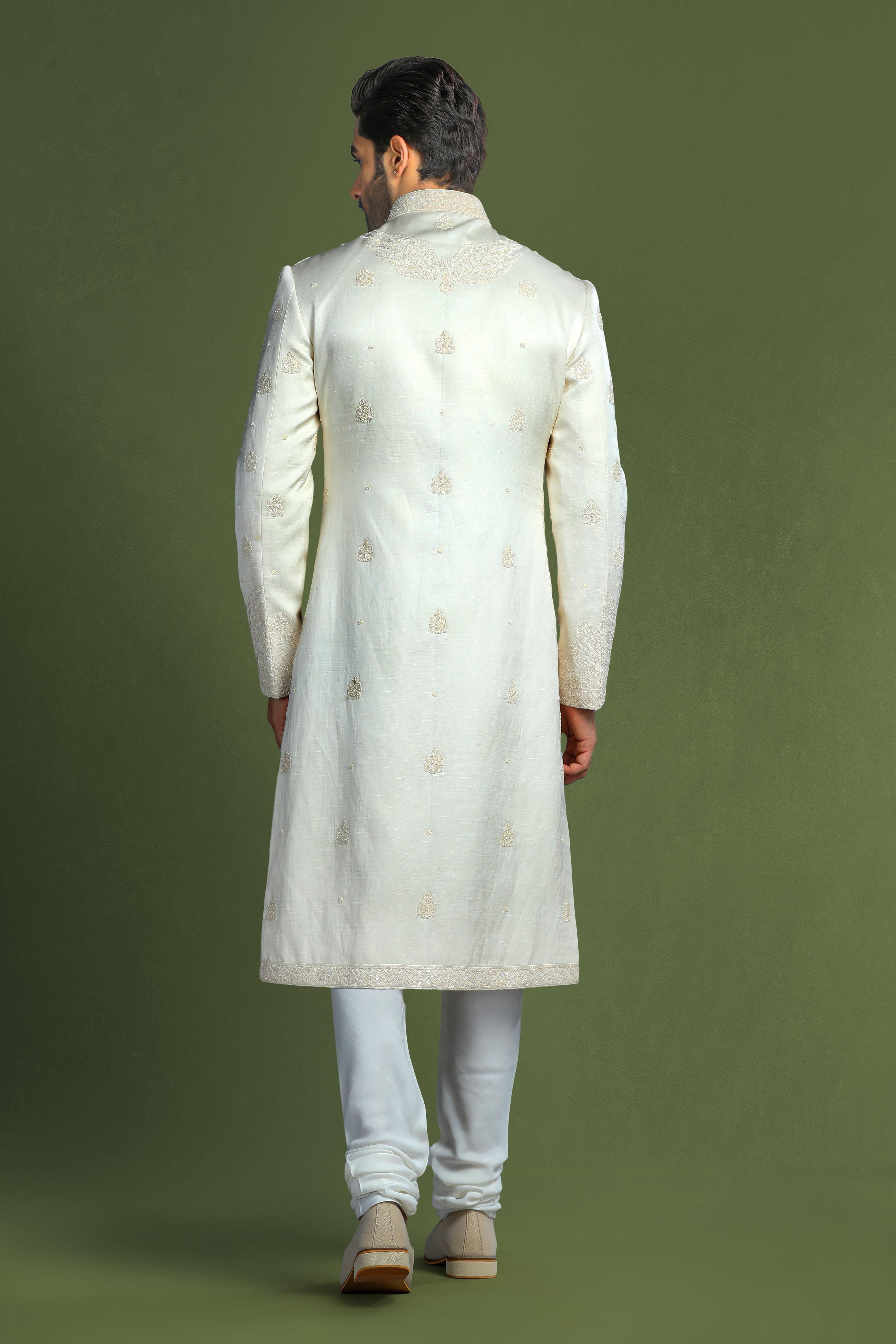 Introducing the Ivory Heritage Linen Sherwani Set, crafted from luxurious linen satin and adorned with elegant dori embroidery, embellished with fine glass beads and sequins for a touch of sophistication and shine. Paired with a silk kurta and churidar, this set embodies refined elegance, making it the perfect choice for grand occasions, ensuring you stand out in style.
