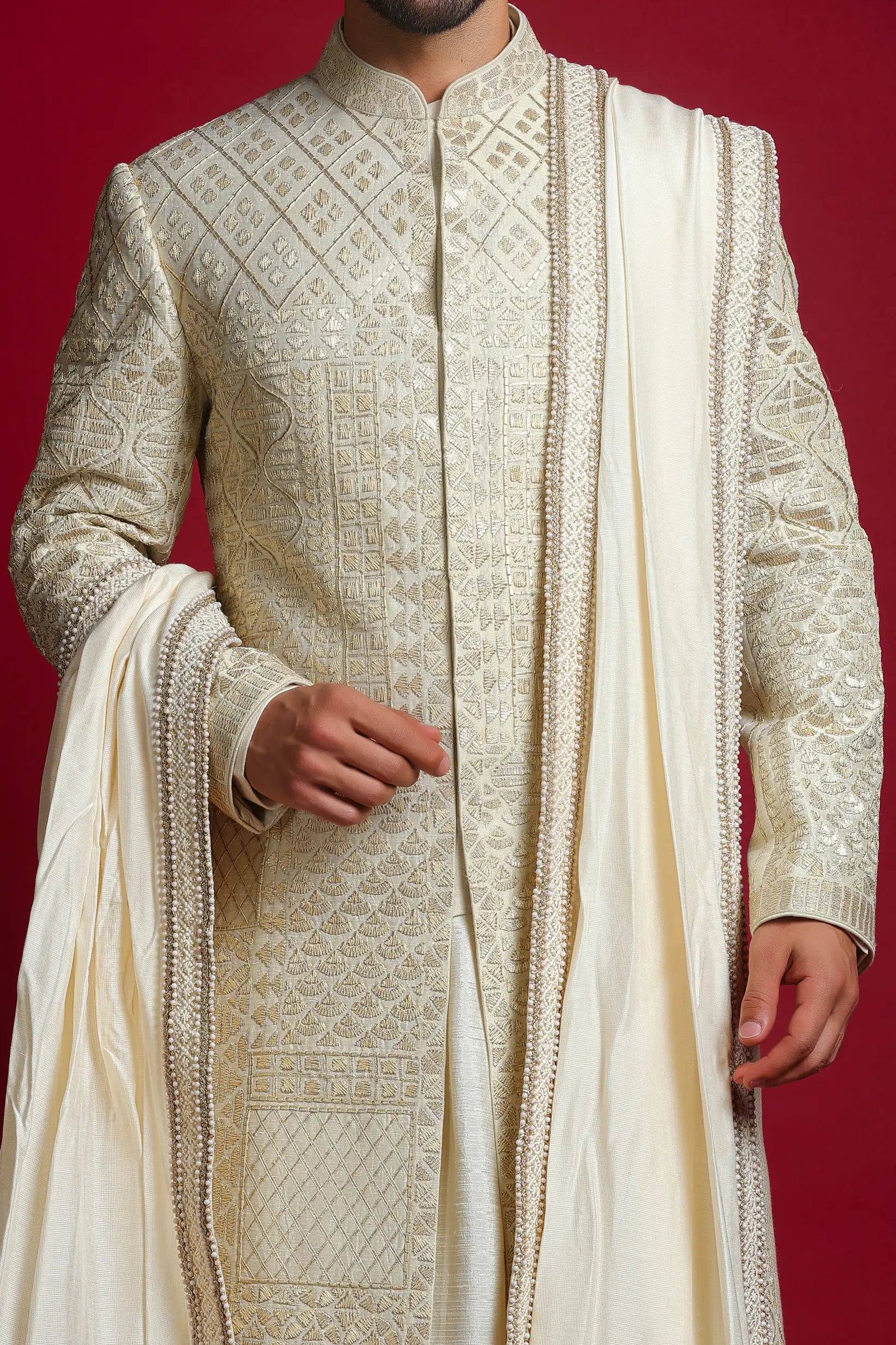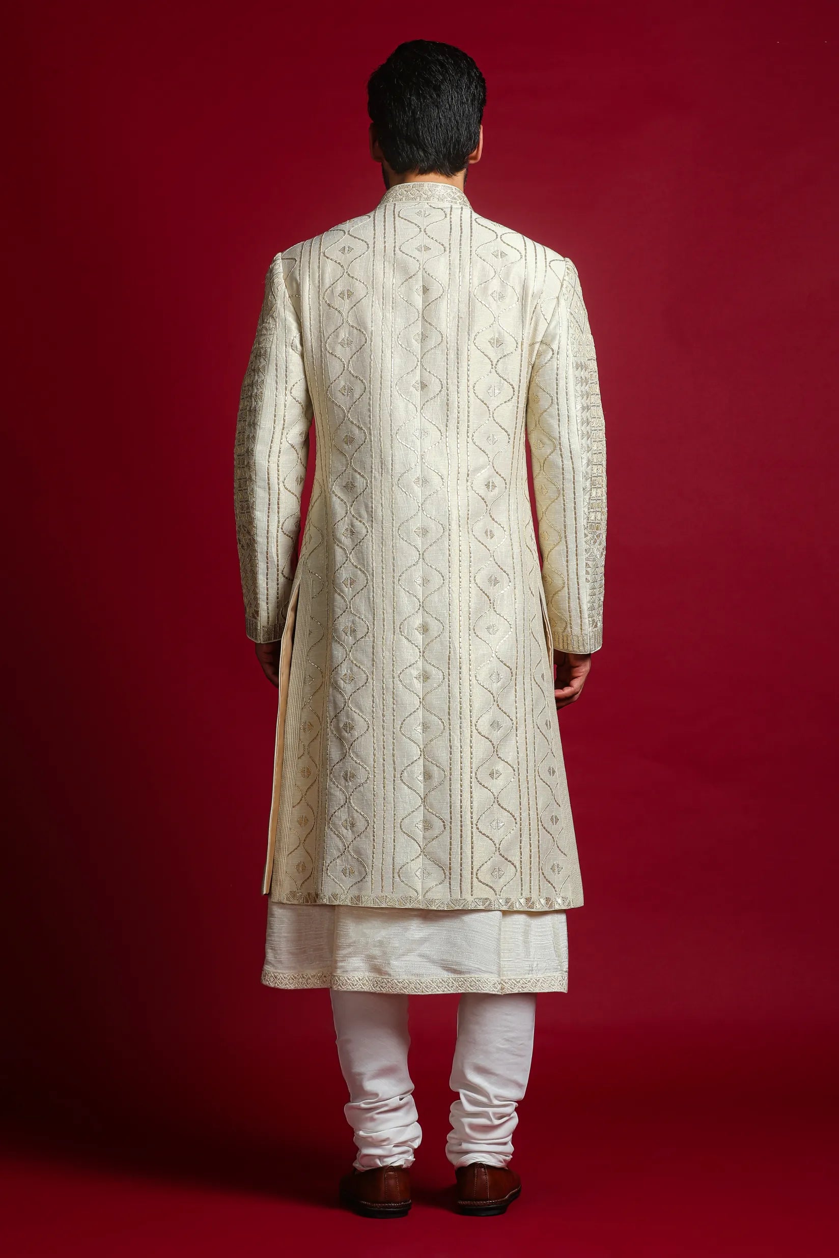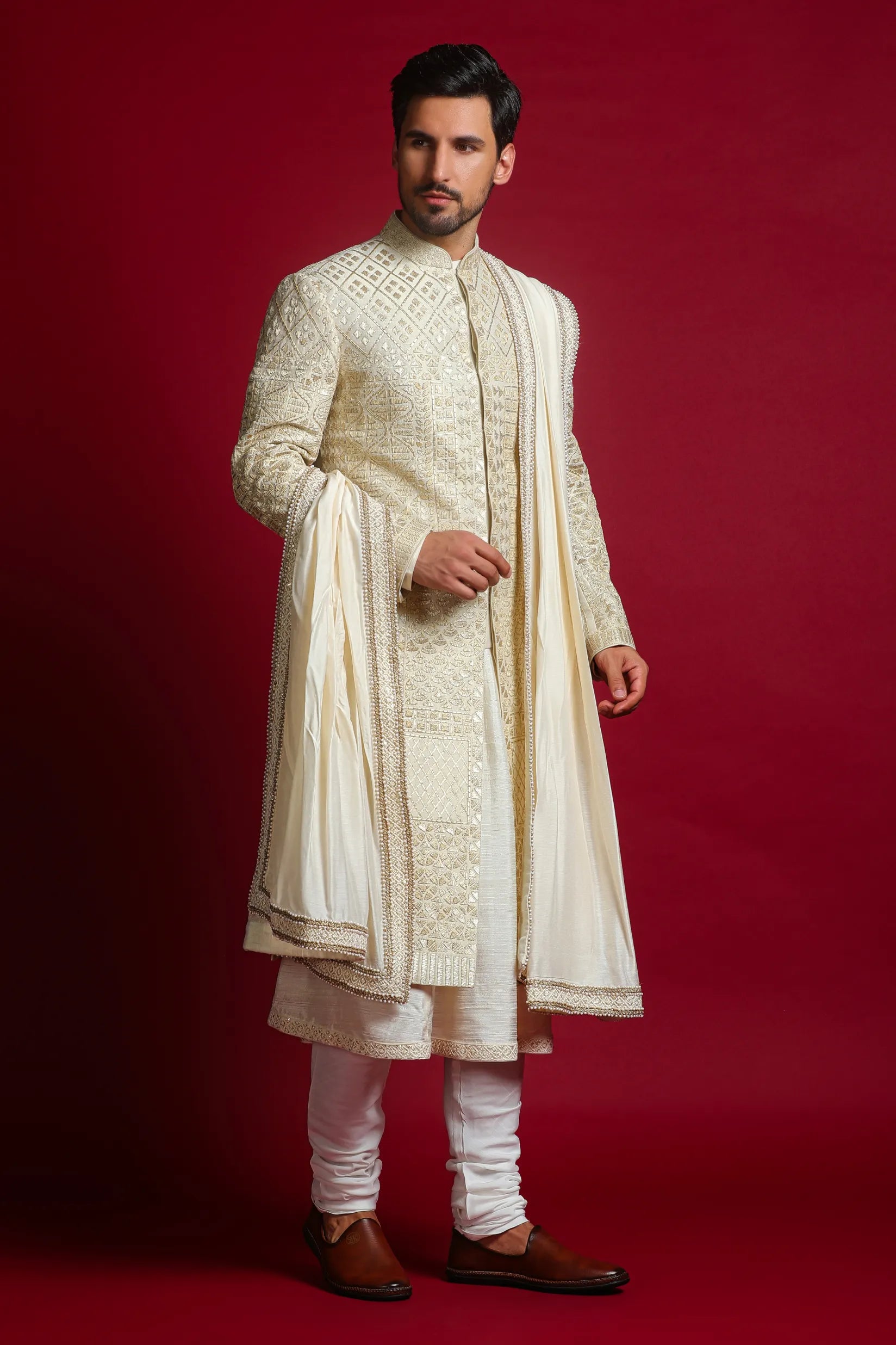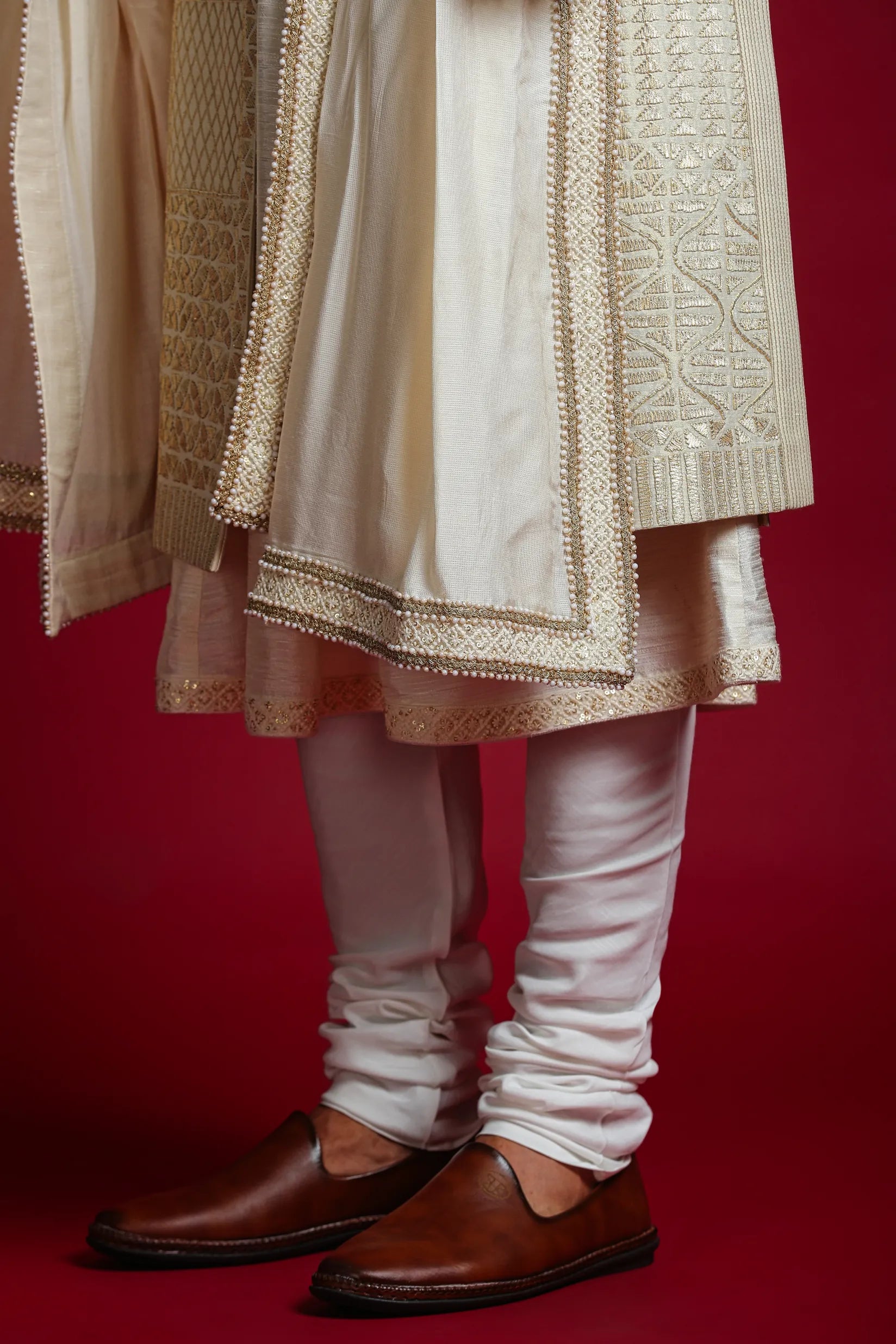 Introducing the Ivory Luxe Sherwani Set, crafted from luxurious tissue silk and adorned with intricate gota embroidery, exuding timeless elegance. The ensemble includes an ivory kurta and churidar, paired with a beautifully embroidered stole featuring a detailed thread and beaded border, adding a touch of refined craftsmanship to complete the look.