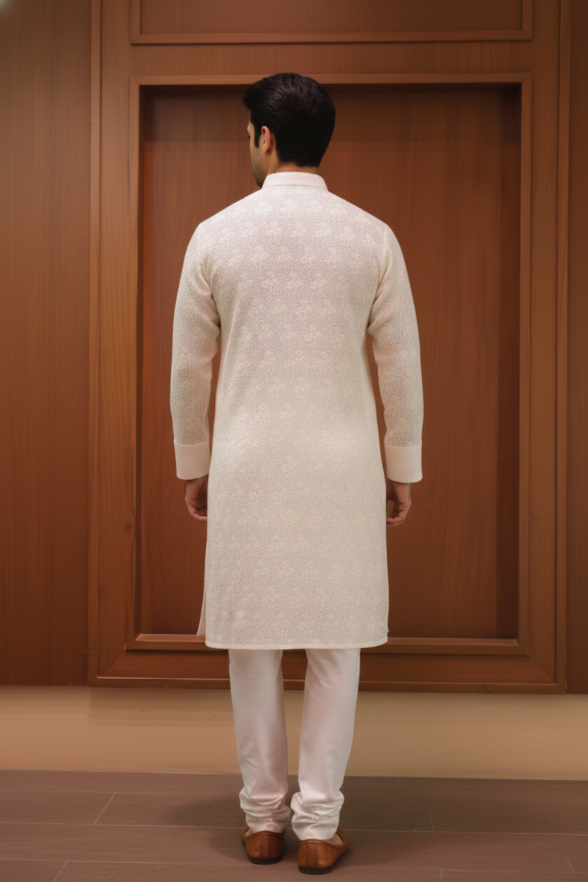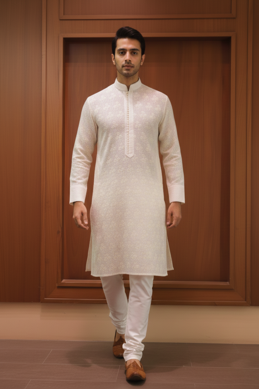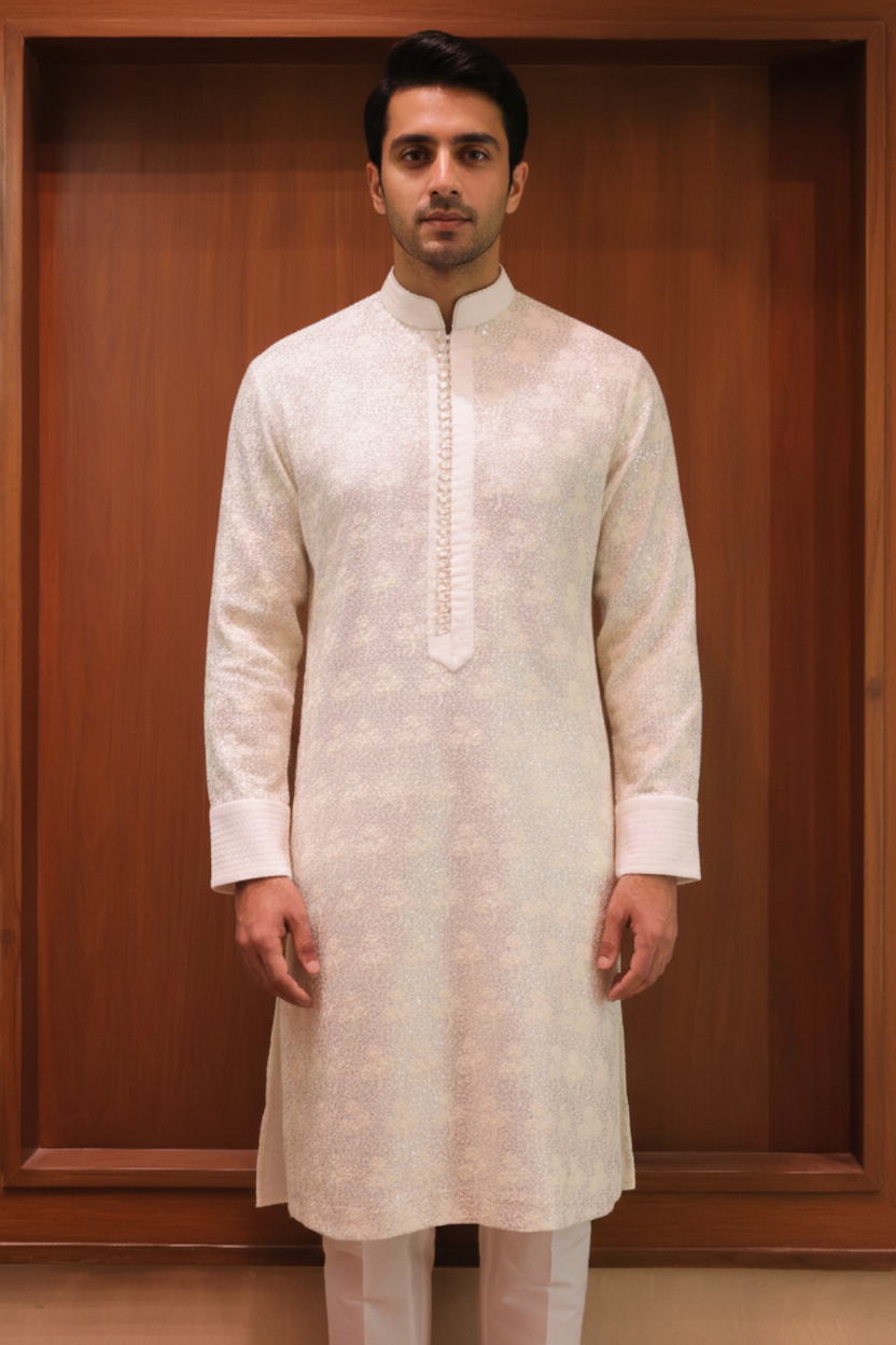 Ivory Shimmer Classic Kurta embodies refined elegance with a subtle all-over textured shimmer on a soft ivory base. Crafted from premium fabric, this kurta features a clean mandarin collar, refined placket detailing, and neatly finished cuffs for a timeless silhouette. Understated yet luxurious, it is perfect for weddings, festive celebrations, and formal traditional occasions.