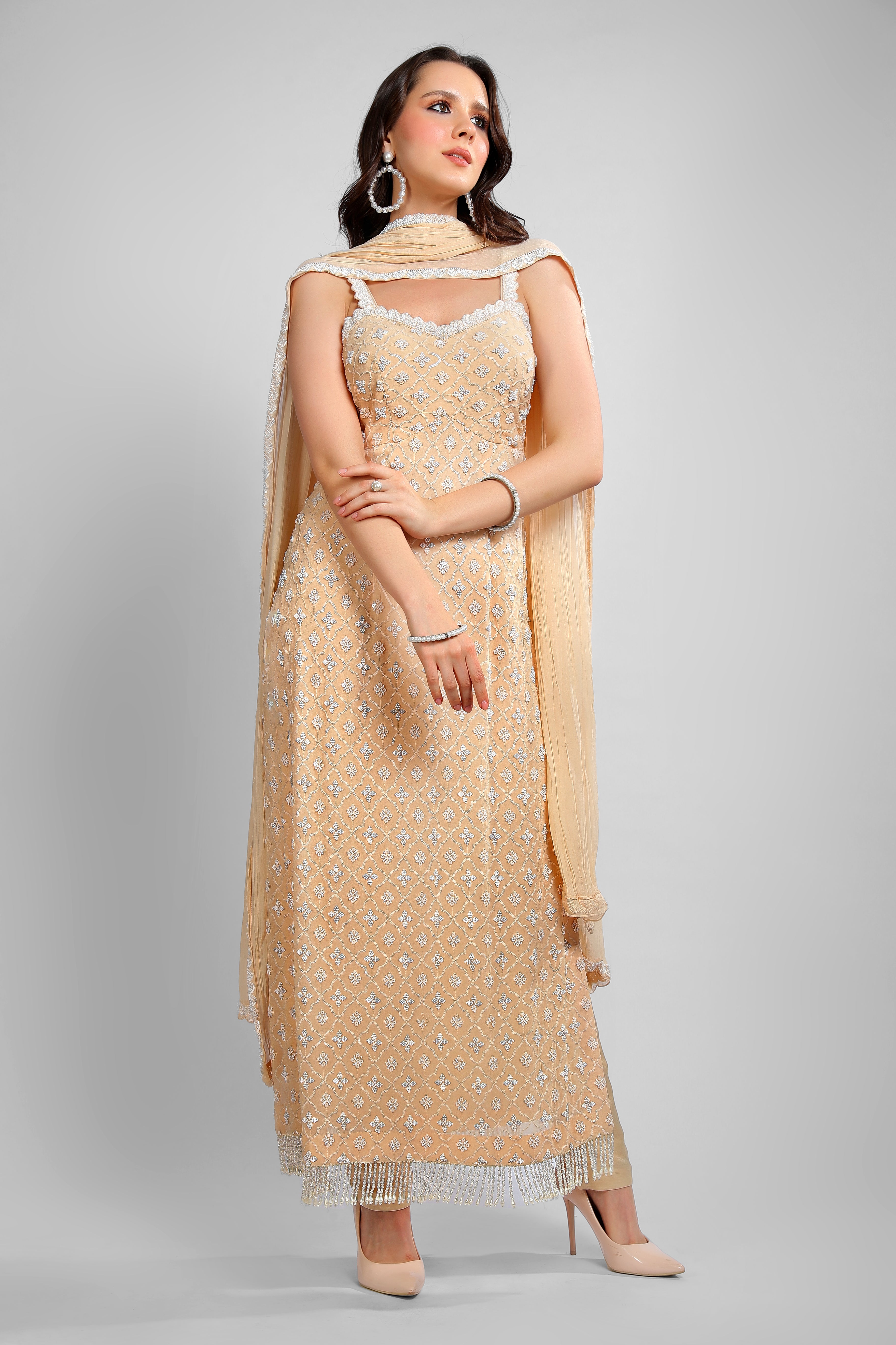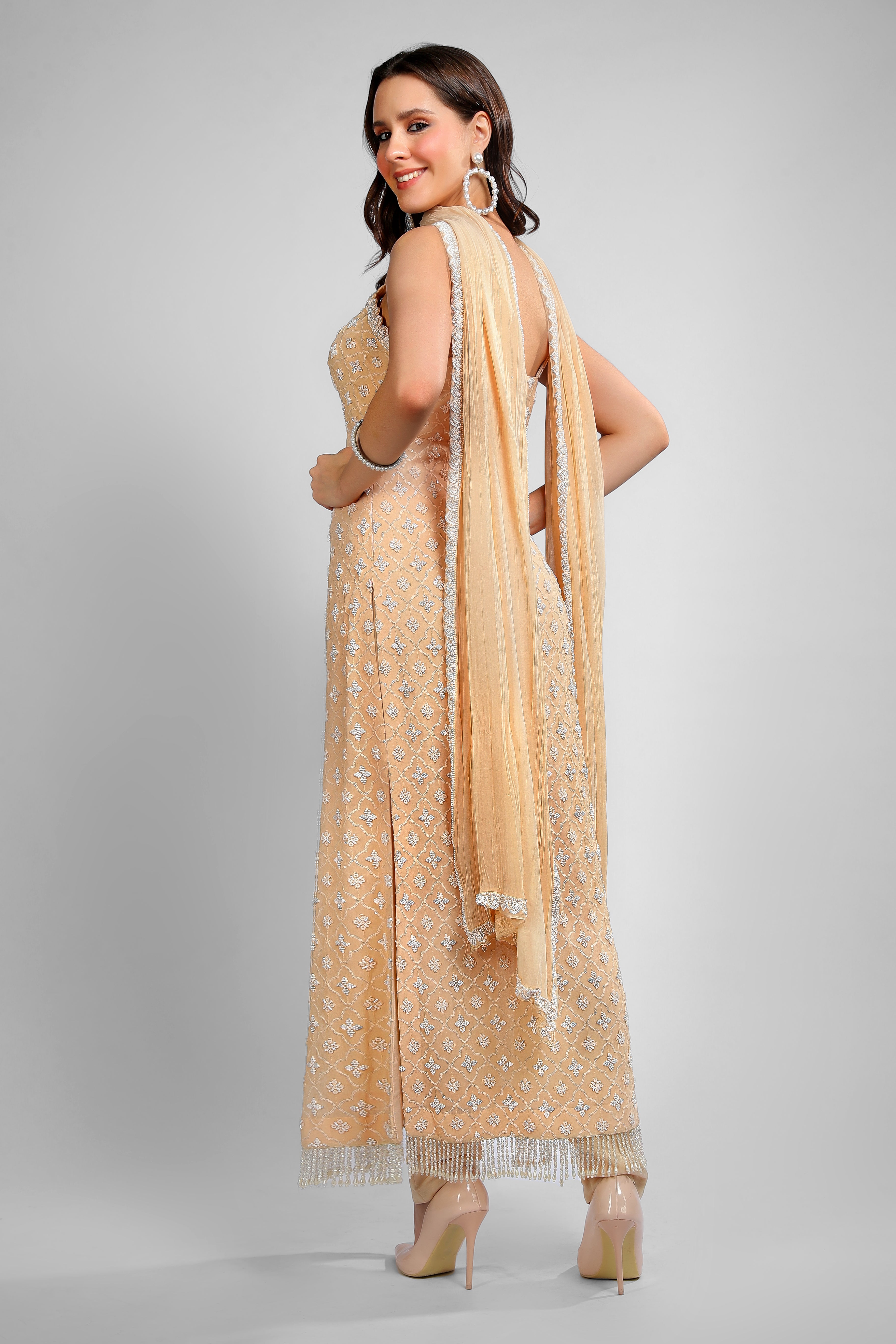 An ode to grace and tradition, the Maharani Peach Nazakat Embroidered Suit embodies effortless elegance. Crafted in a soft peach hue, this ensemble features intricate embroidery and beadwork, adding a touch of regal charm.