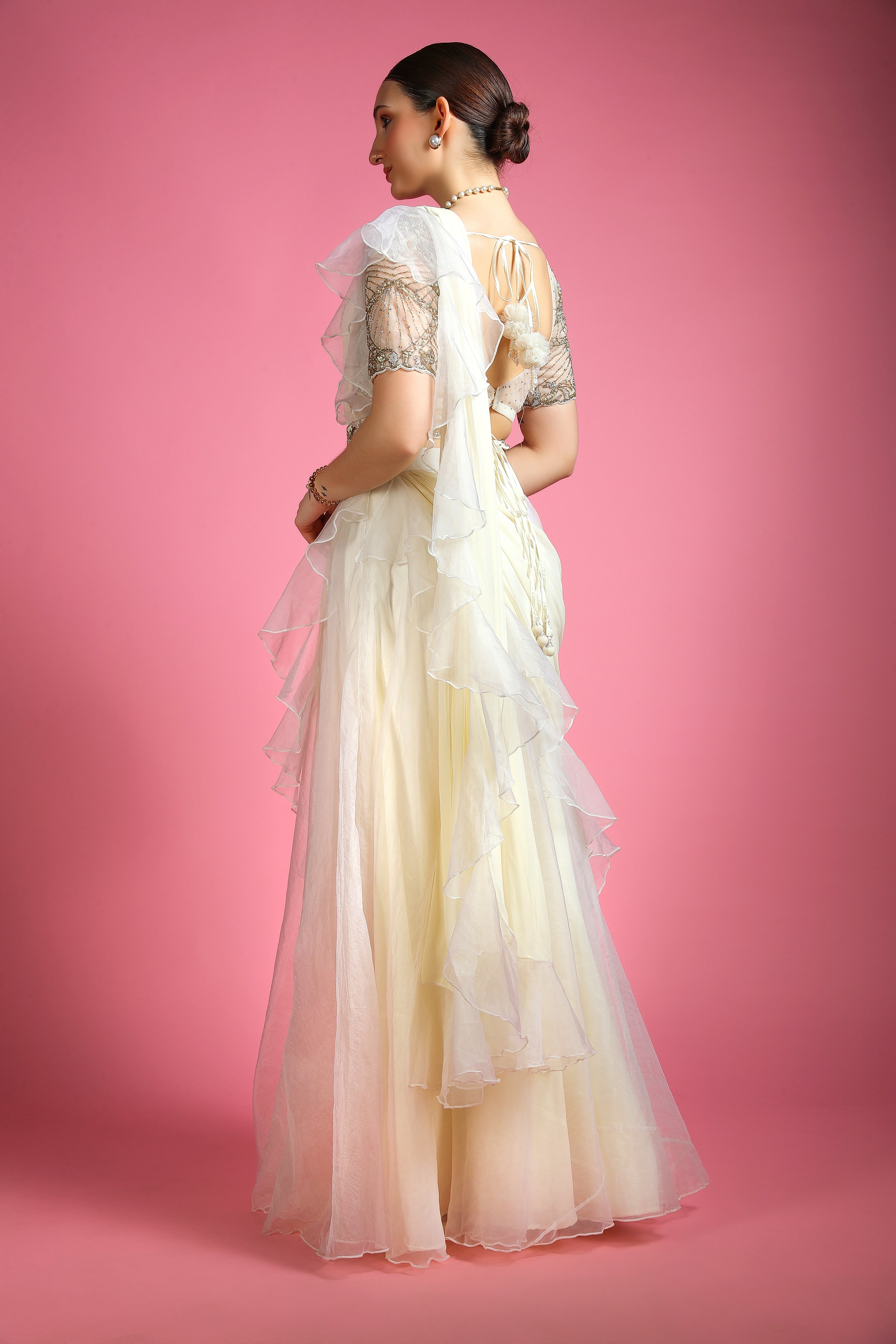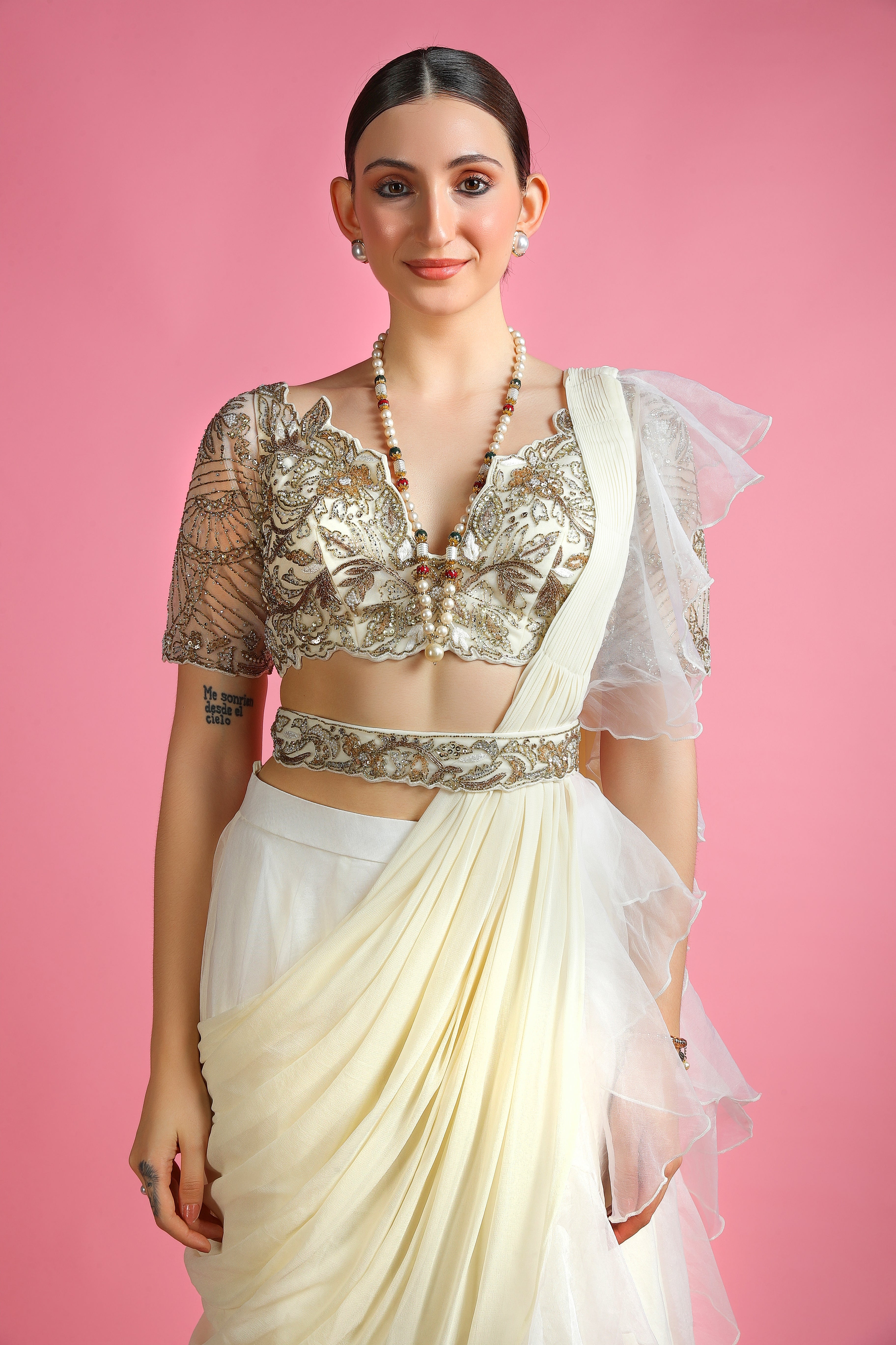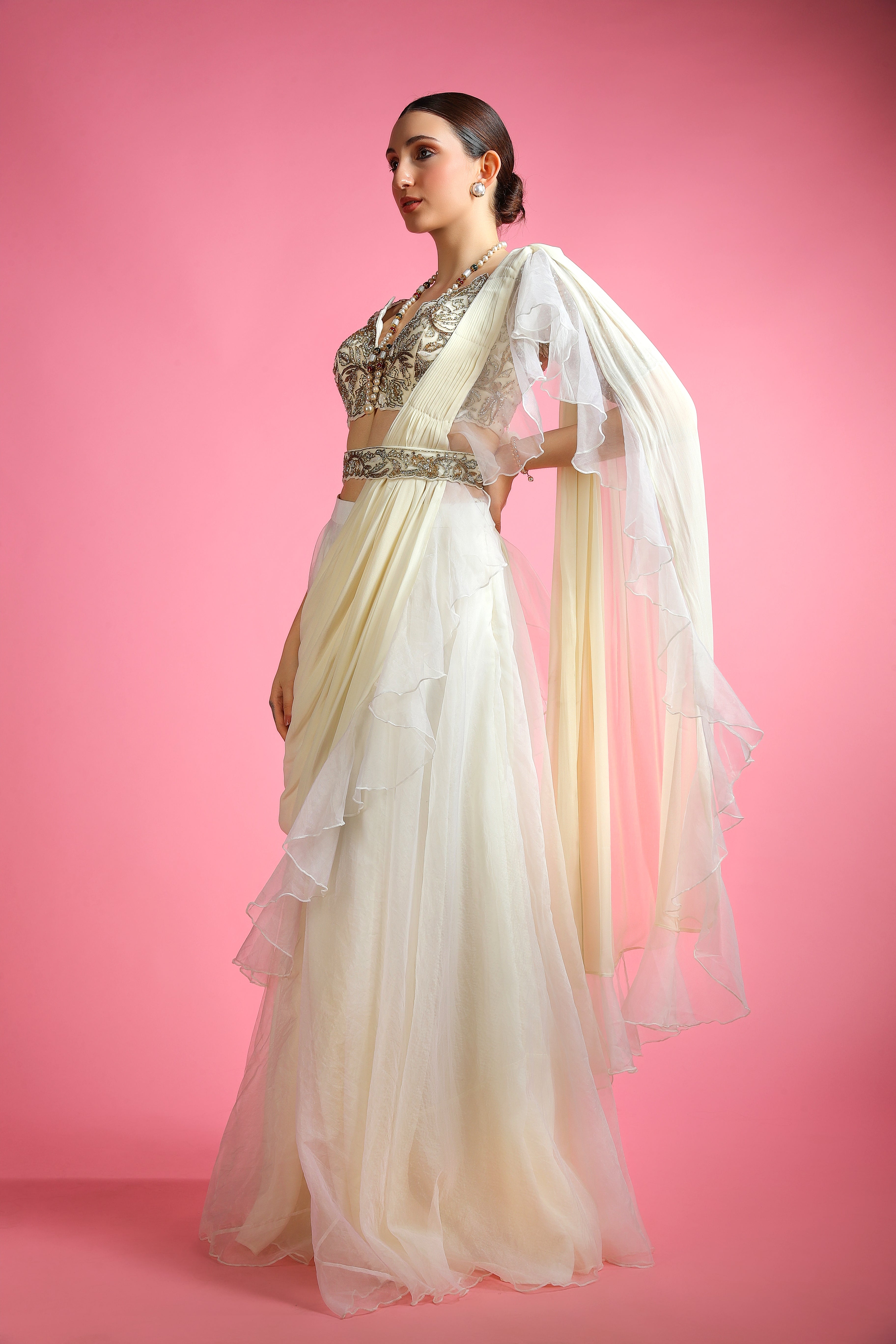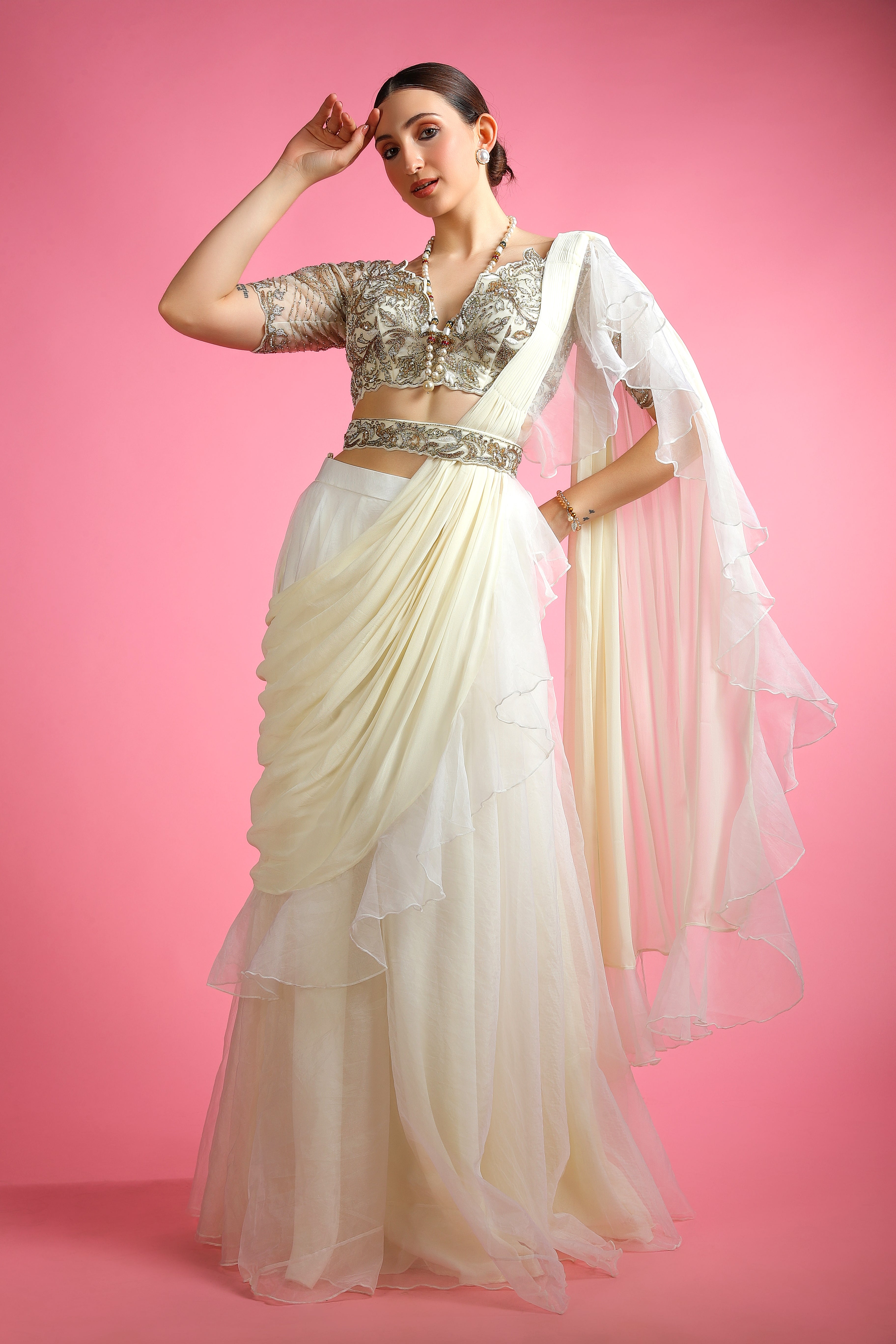 A vision of elegance, the Meher Ivory Pearl Drape Saree is a masterpiece of delicate shimmer and soft, flowing drapes. The intricately hand-embroidered blouse showcases exquisite craftsmanship, adorned with pearls and fine embroidery, evoking a sense of timeless grace. Its light, airy texture enhances movement, making it the perfect choice for grand celebrations, weddings, and evening soirées.
