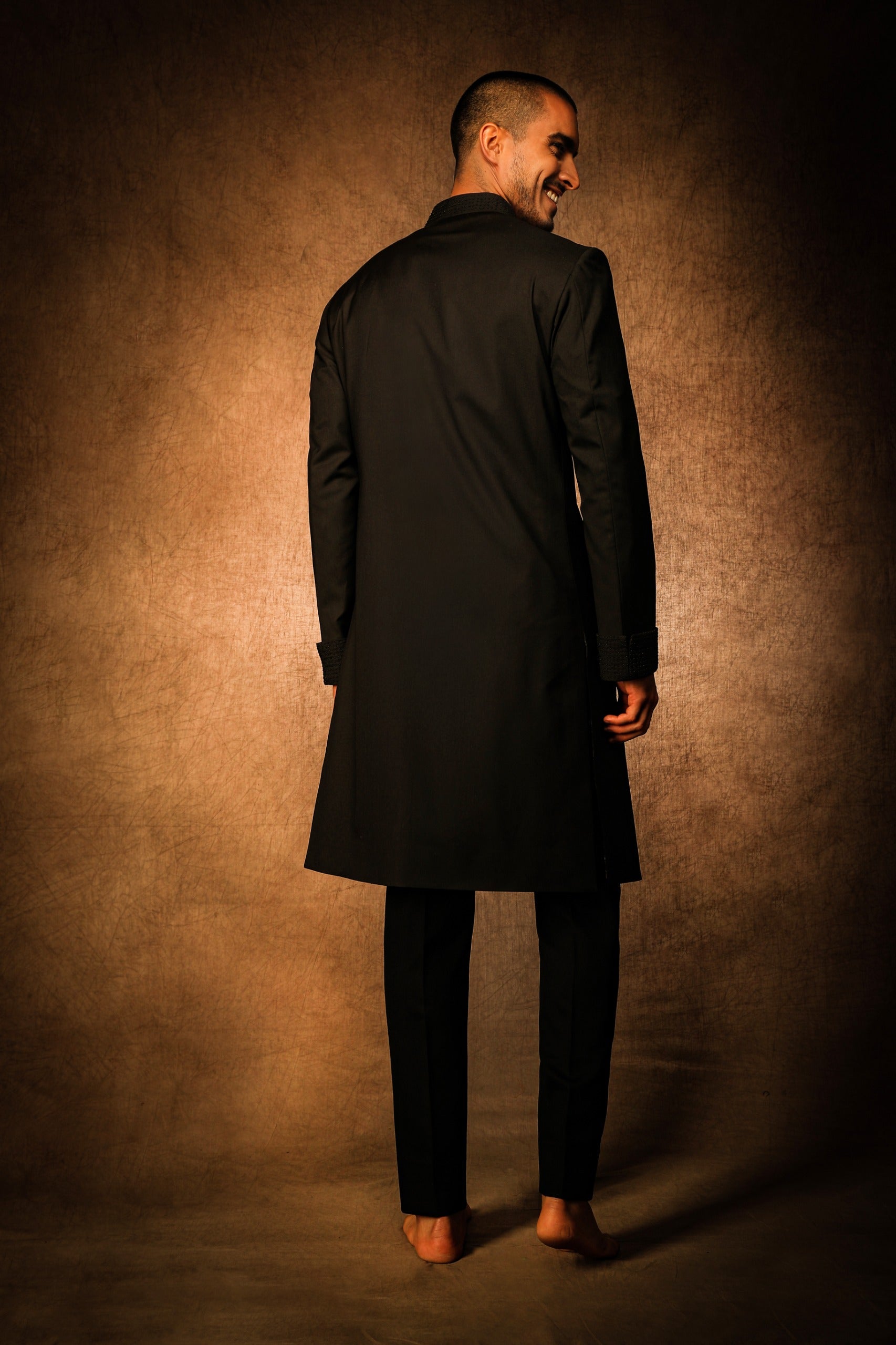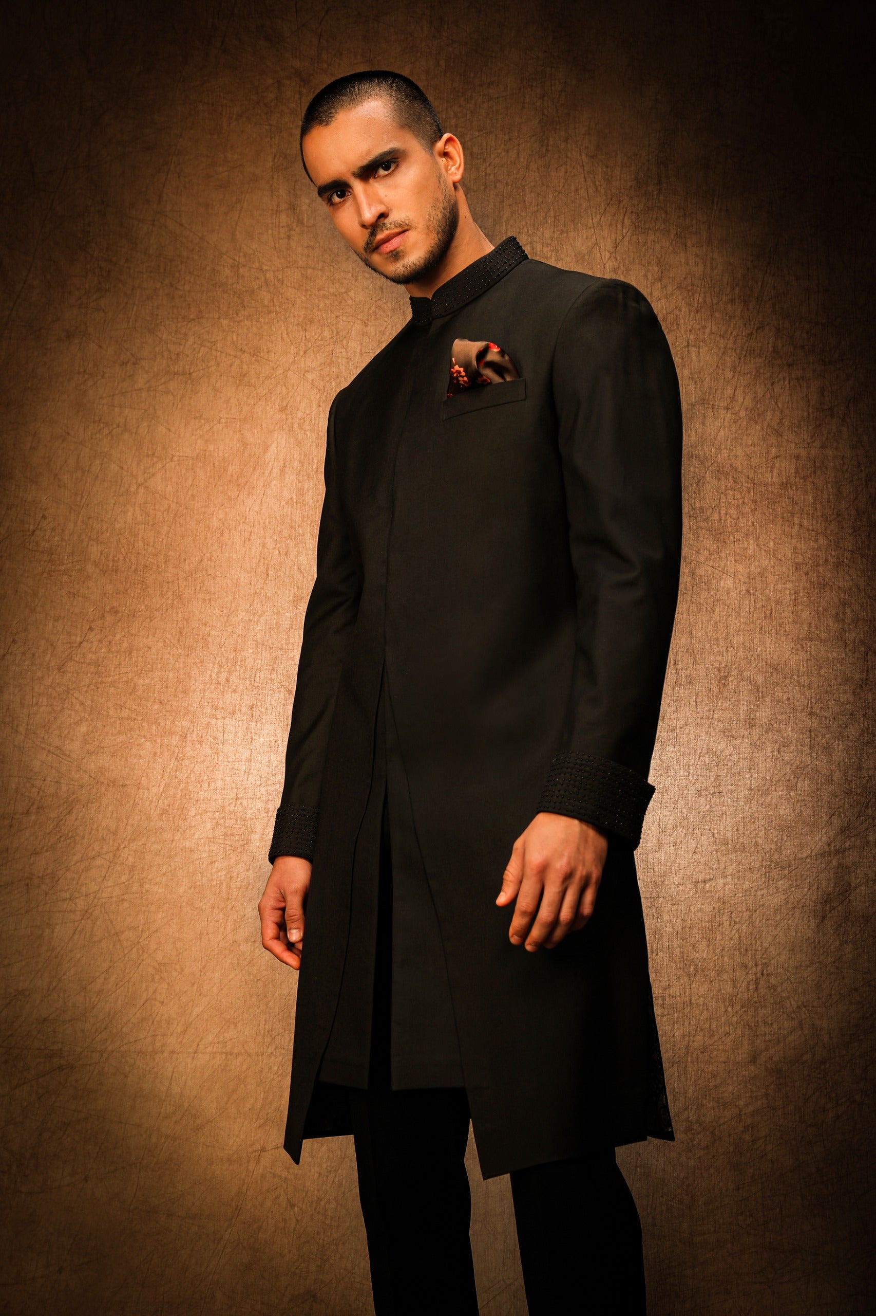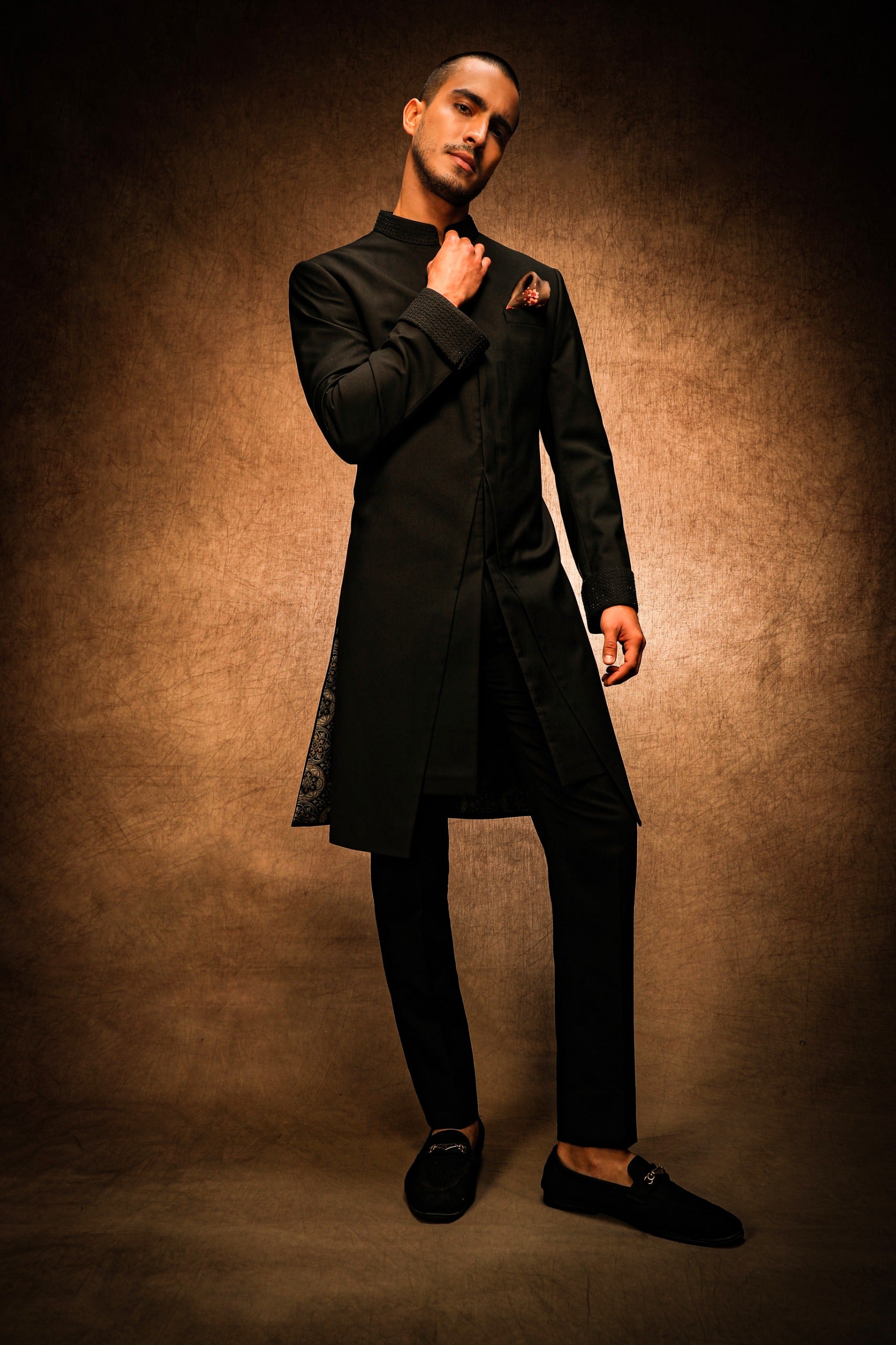 This Midnight Black V-Cut Achkan exudes timeless elegance with its premium craftsmanship. The refined front V-cut opening is the standout feature, giving it a distinctive and luxurious touch. Perfectly designed for high-end events, this achkan blends classic style with modern flair.