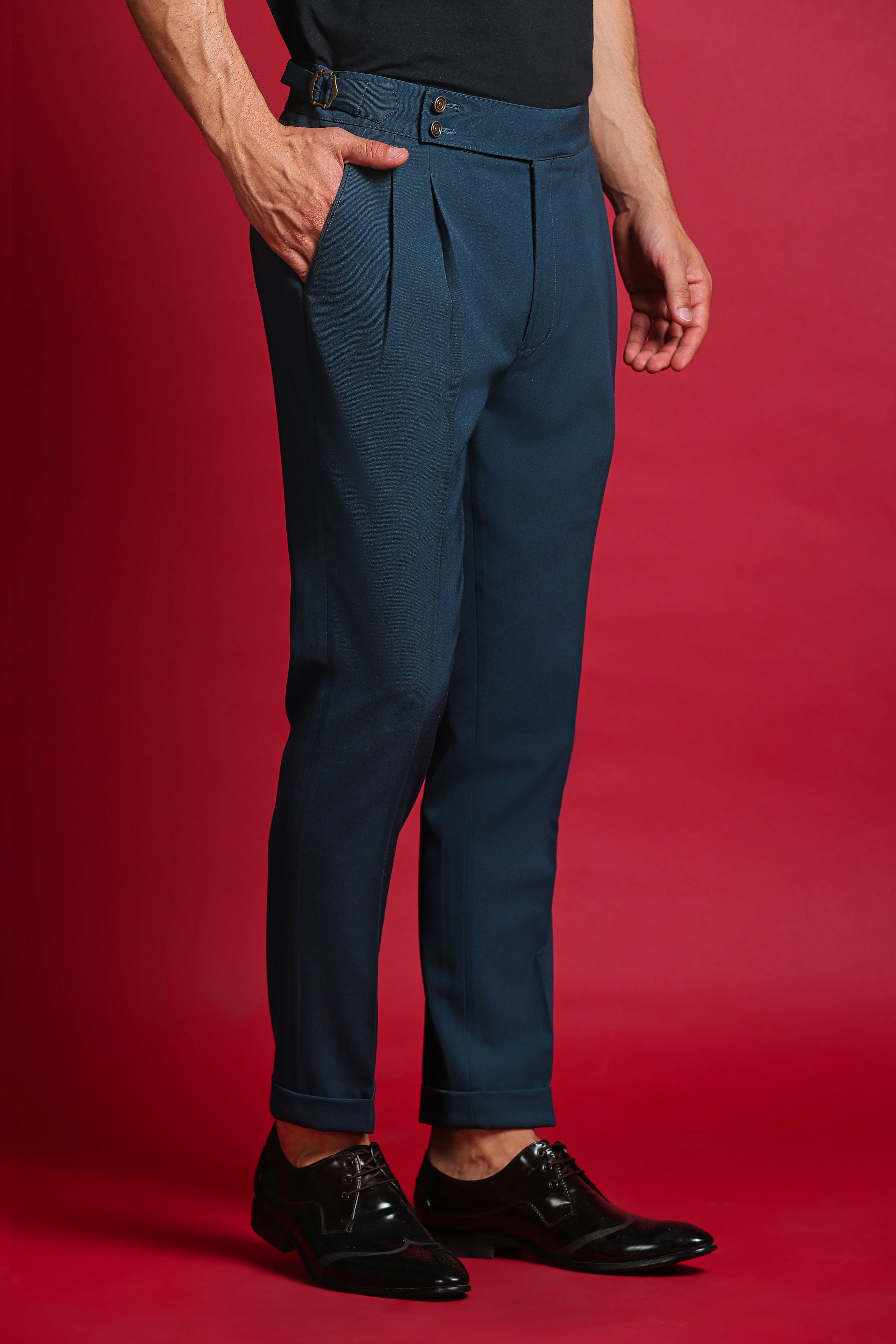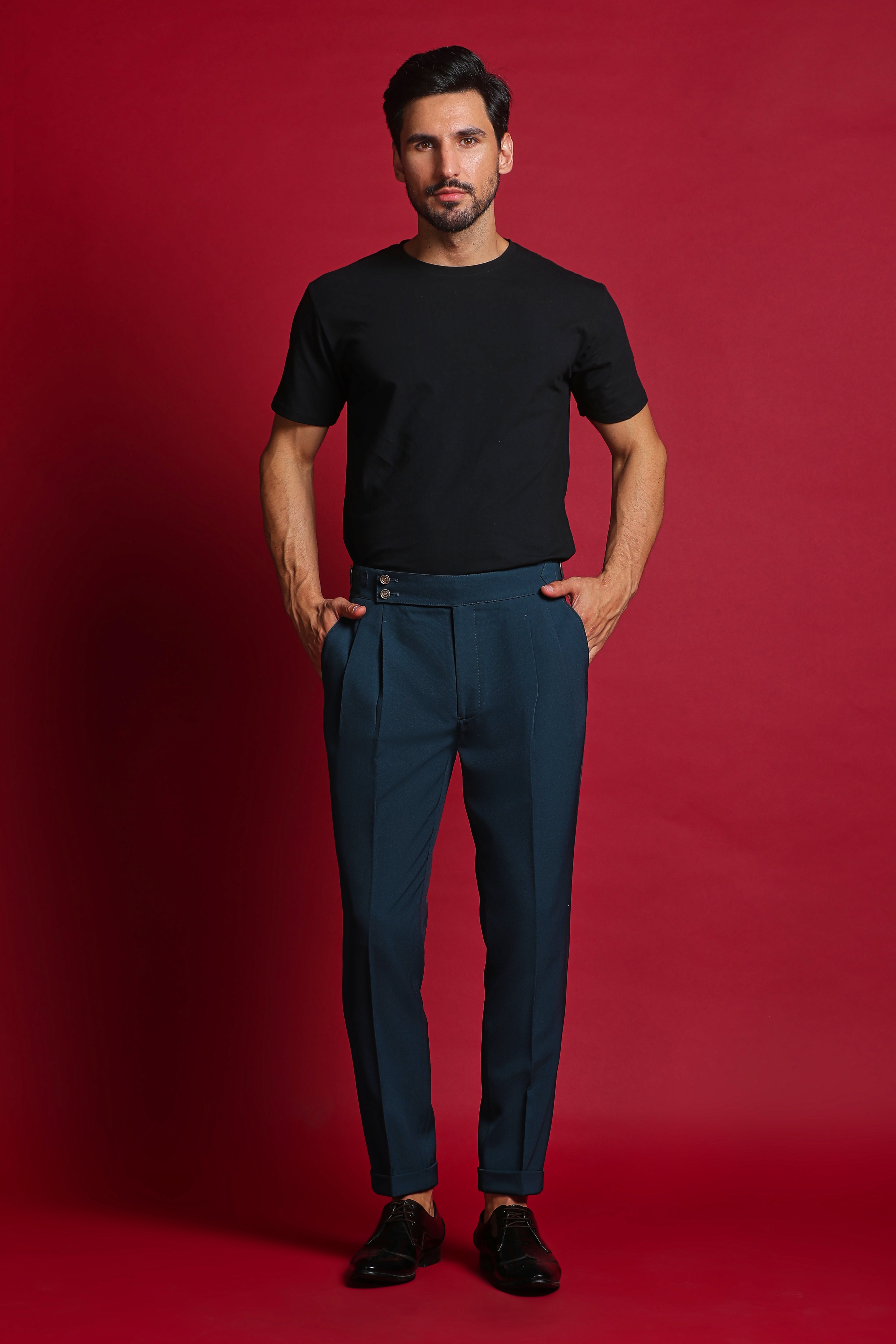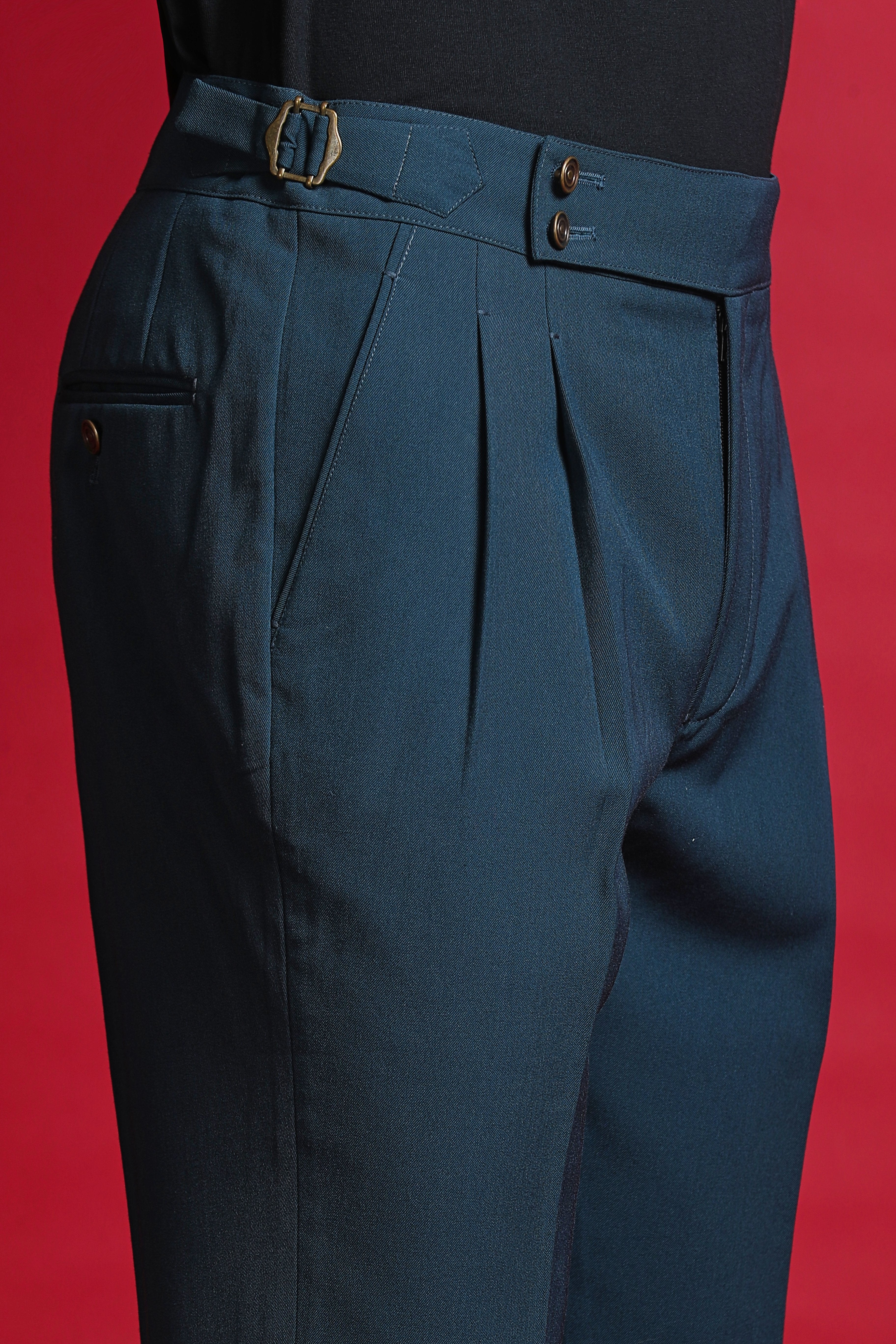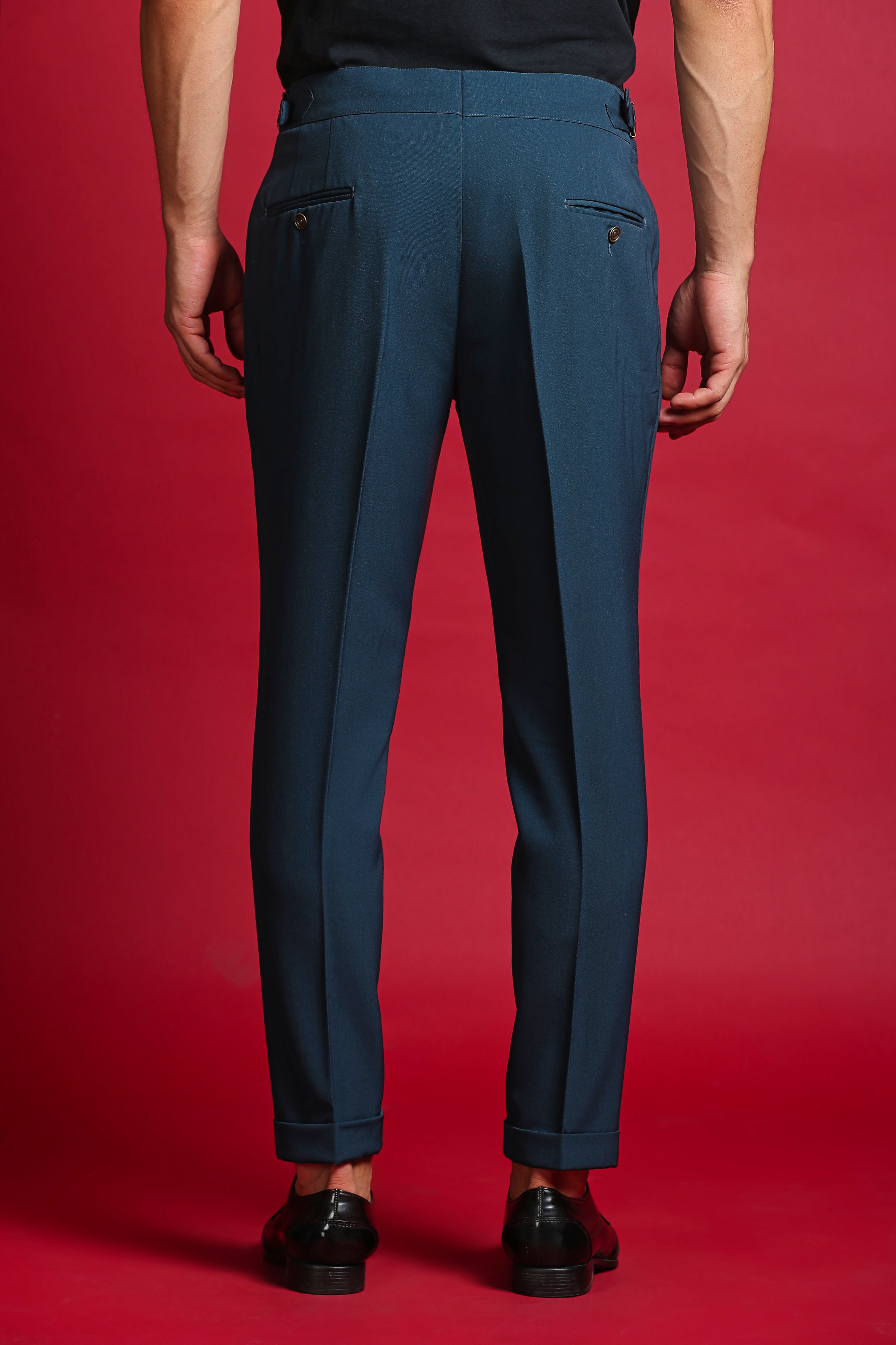 Introducing Peacock Blue Pants, tailored in a smart body fit to offer a sharp yet comfortable silhouette. Designed with double pleats, cross pockets, and an adjustable waistband for ease of wear. The turned-up bottom fold and intricate hand-done bar tack detailing elevate its overall aesthetic, making it a versatile essential for any wardrobe.