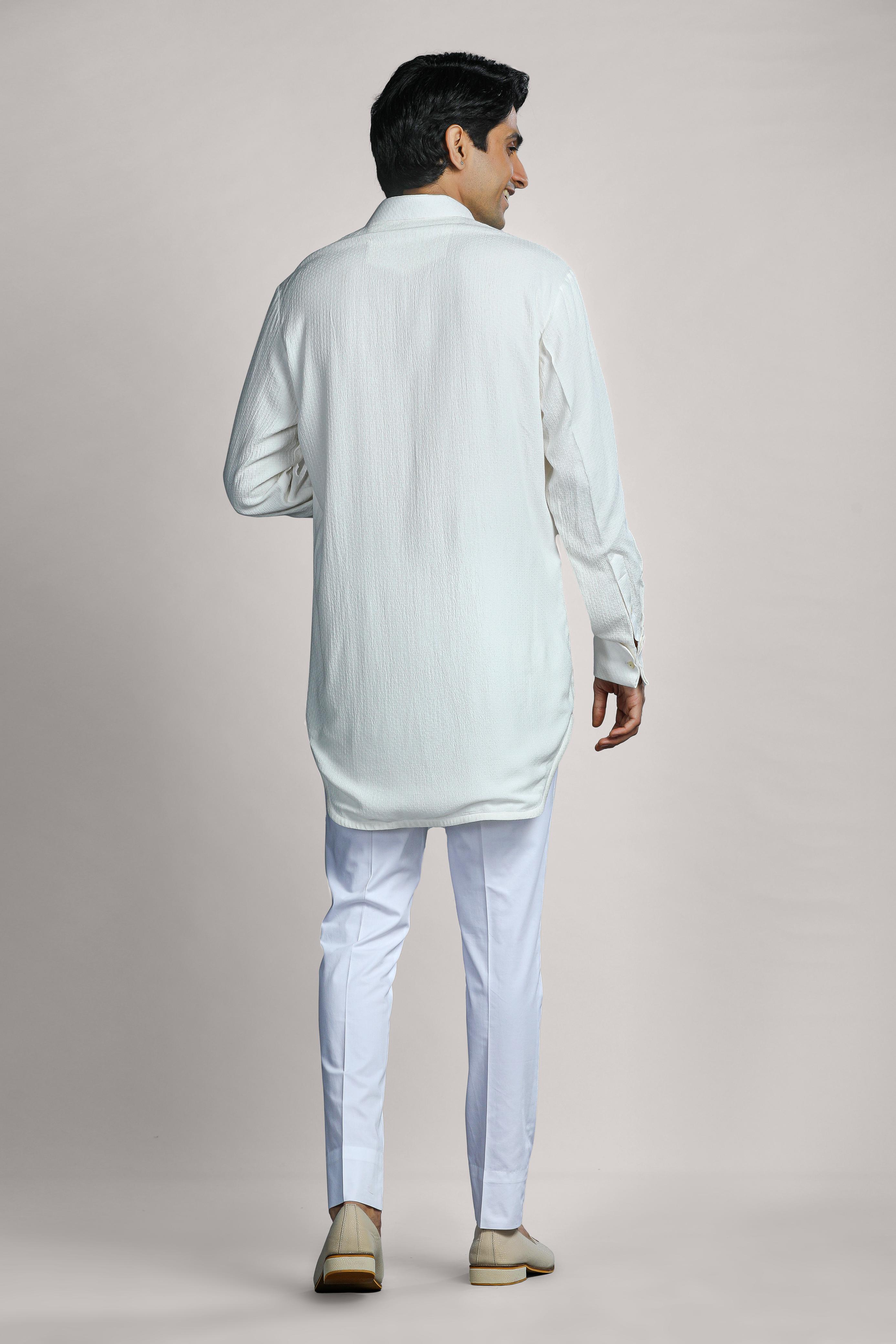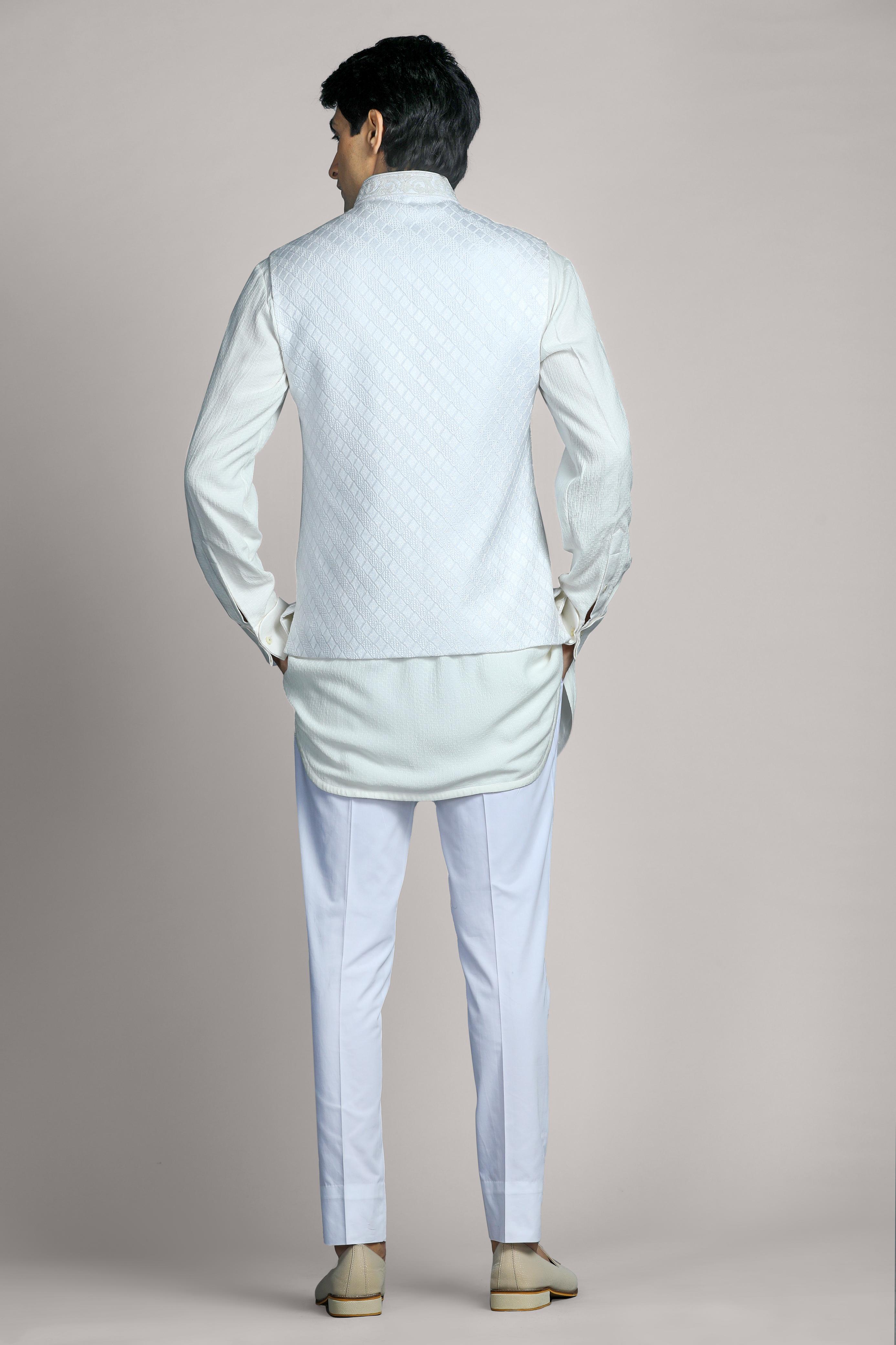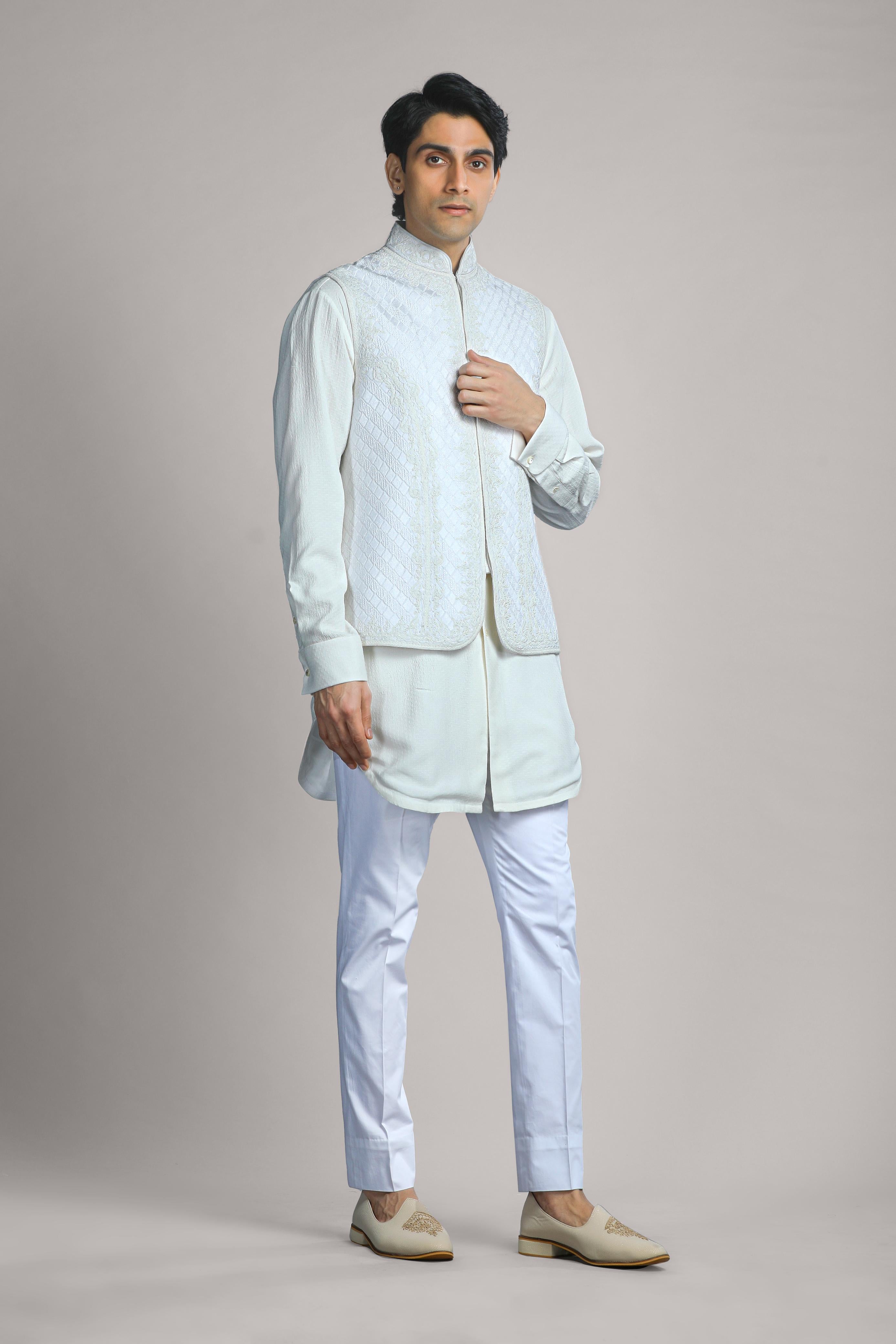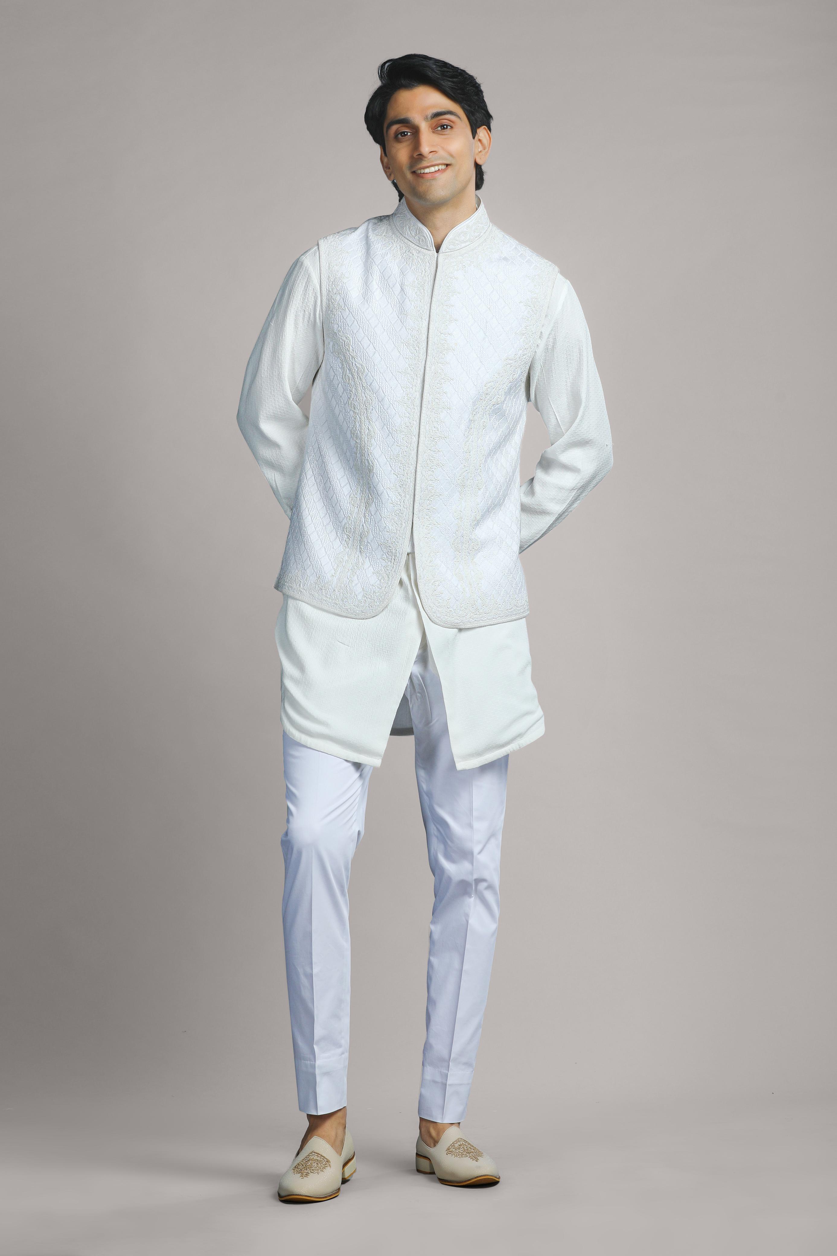 Introducing the Pearl White Bundi & Kurta Set, an exquisitely crafted ensemble featuring a white silk kurta with double cuffs and a round hemline, paired with a meticulously hand-embroidered Bundi. The Bundi showcases intricate threadwork and dori embellishments, adding a touch of elegance to the classic white silhouette.