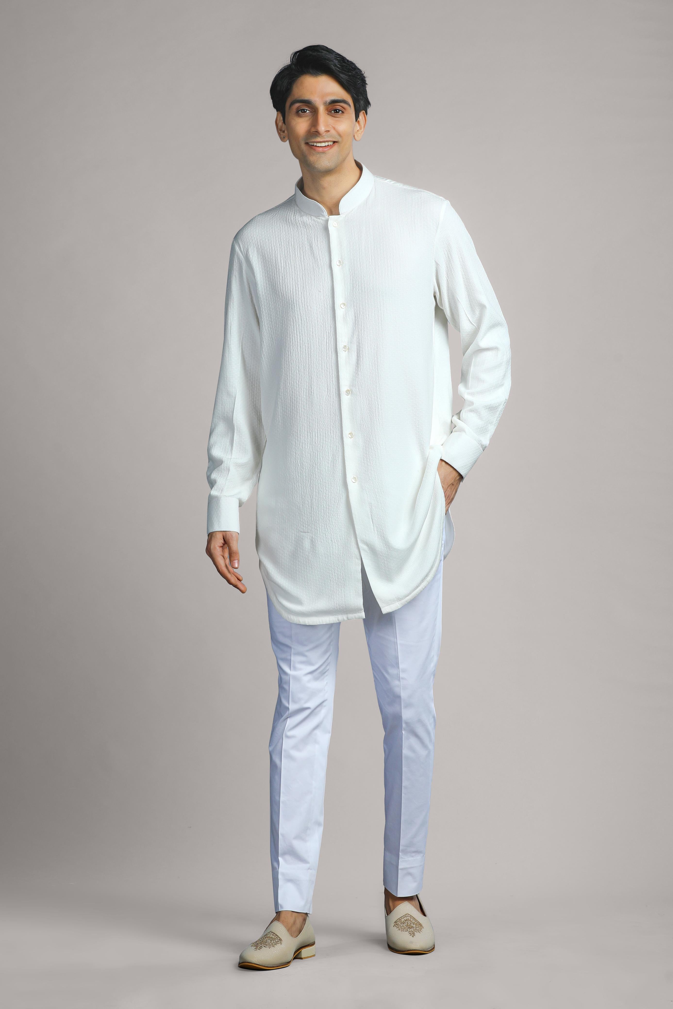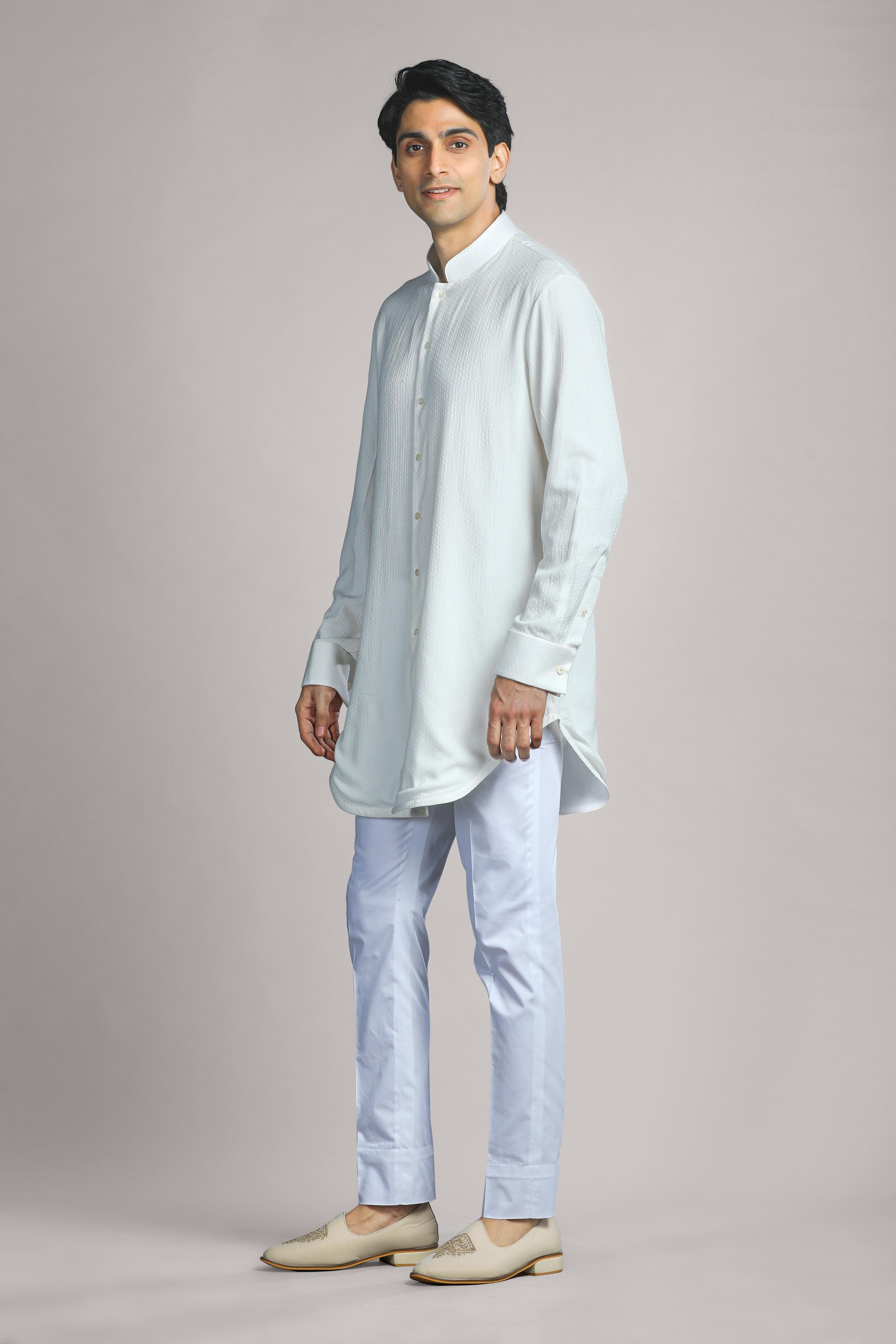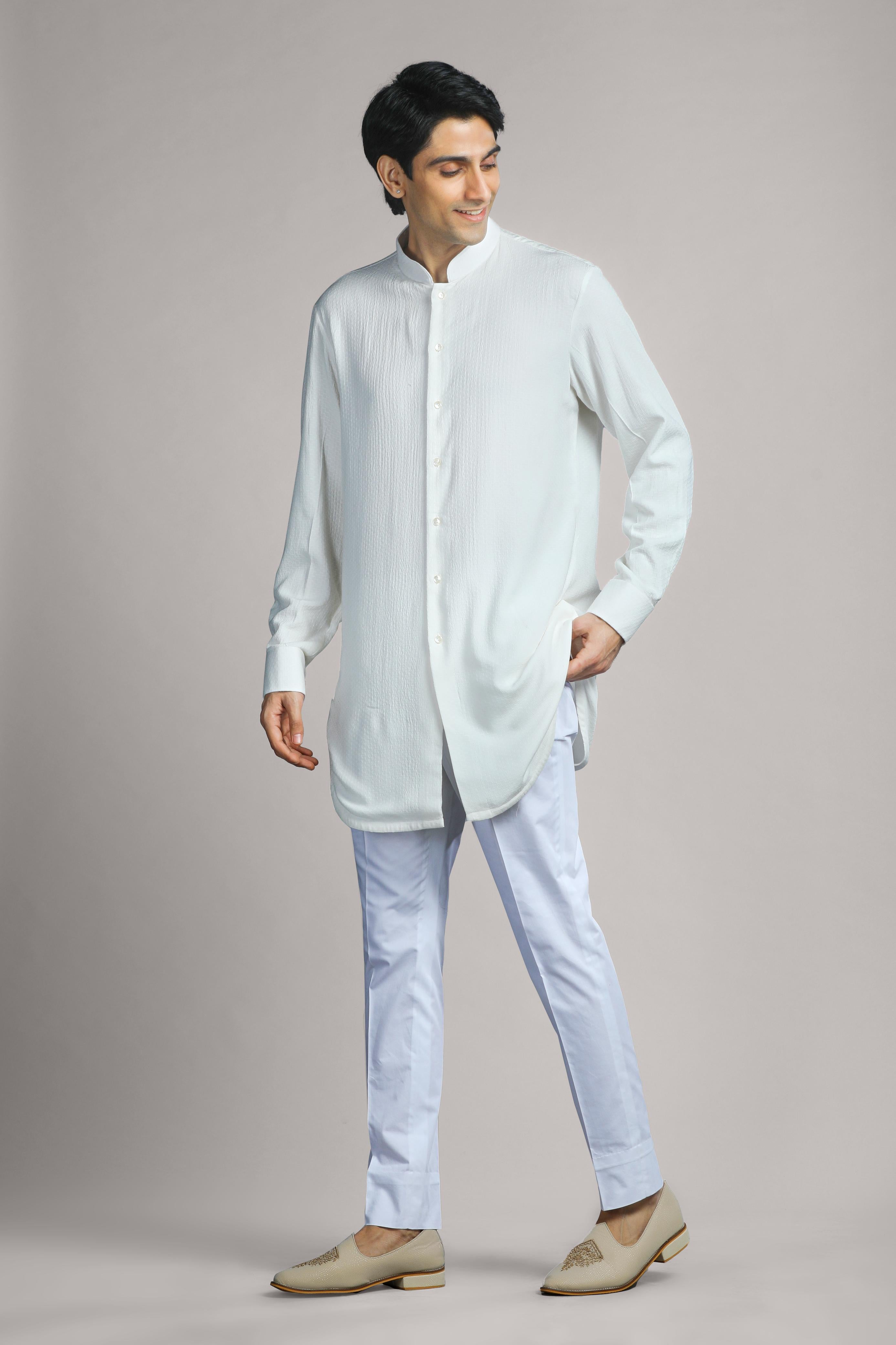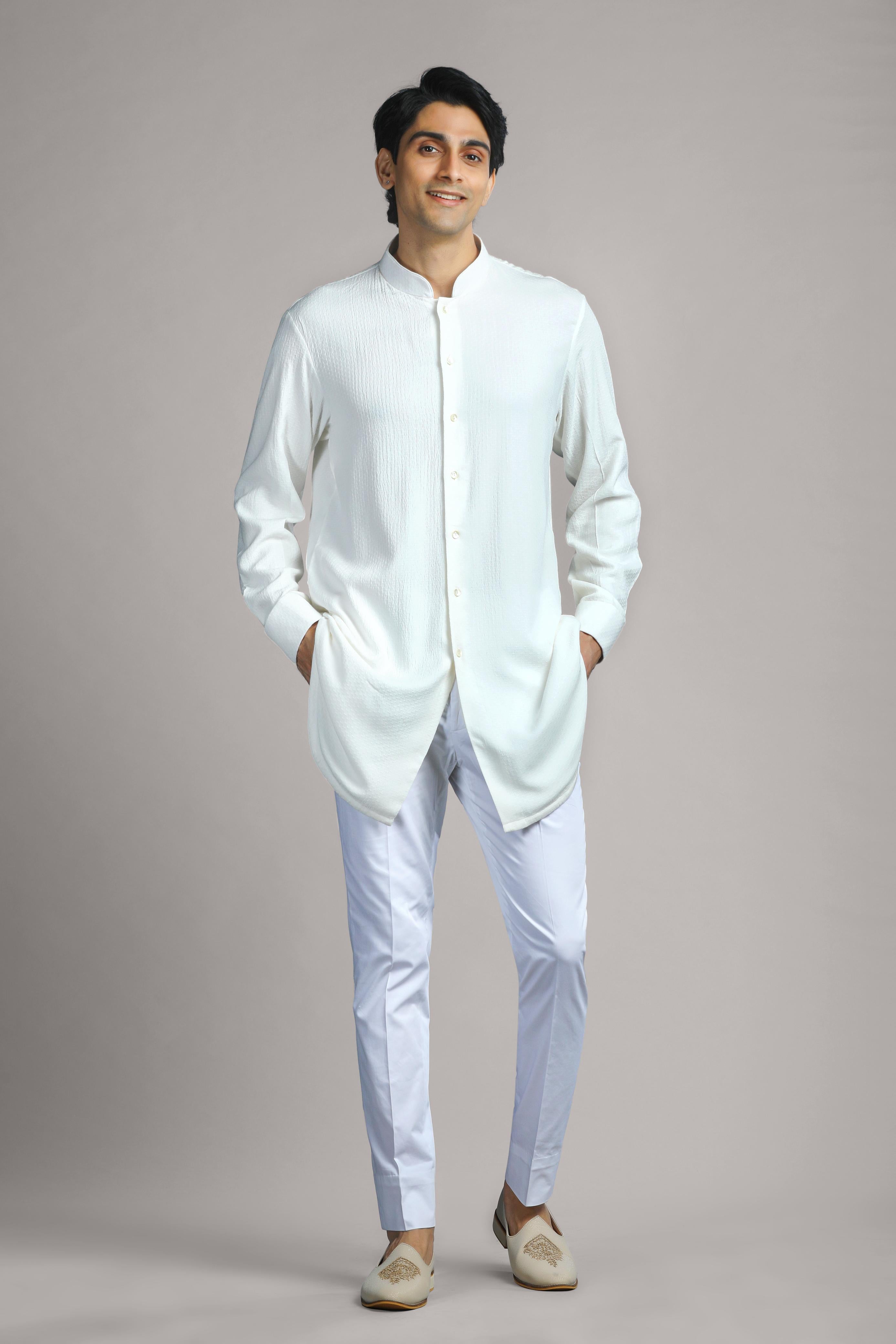 Introducing the Pearl White Bundi & Kurta Set, an exquisitely crafted ensemble featuring a white silk kurta with double cuffs and a round hemline, paired with a meticulously hand-embroidered Bundi. The Bundi showcases intricate threadwork and dori embellishments, adding a touch of elegance to the classic white silhouette.