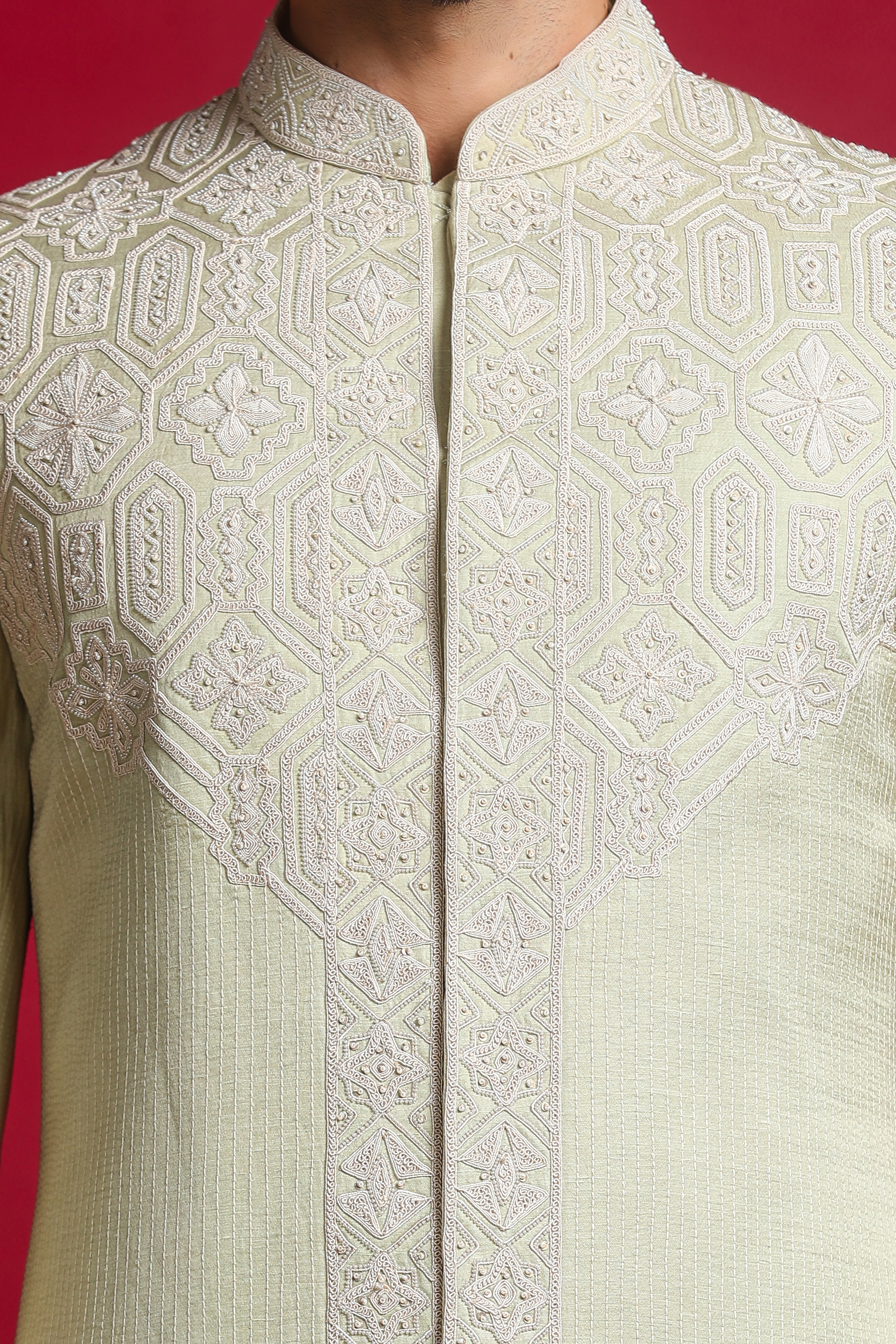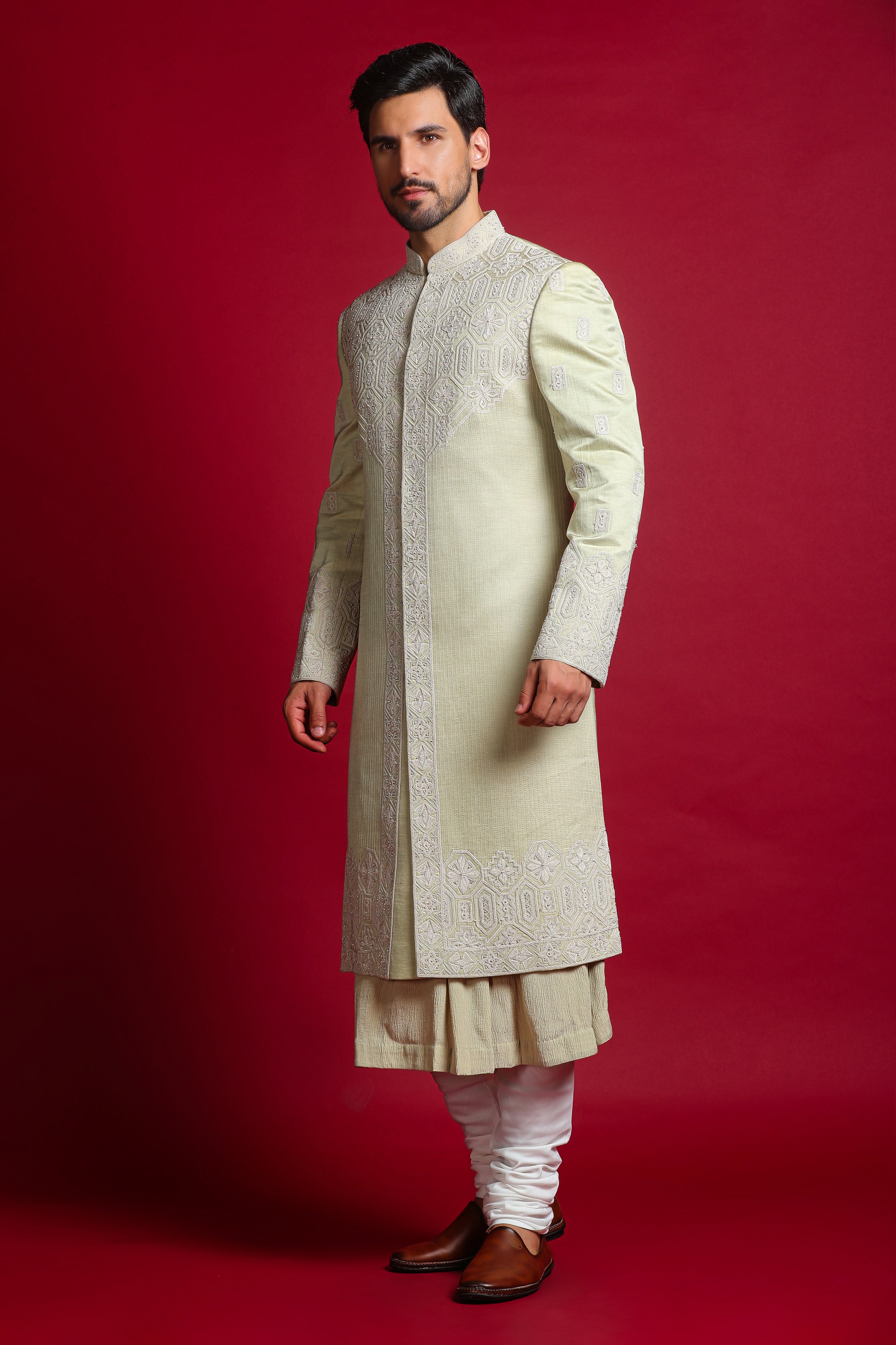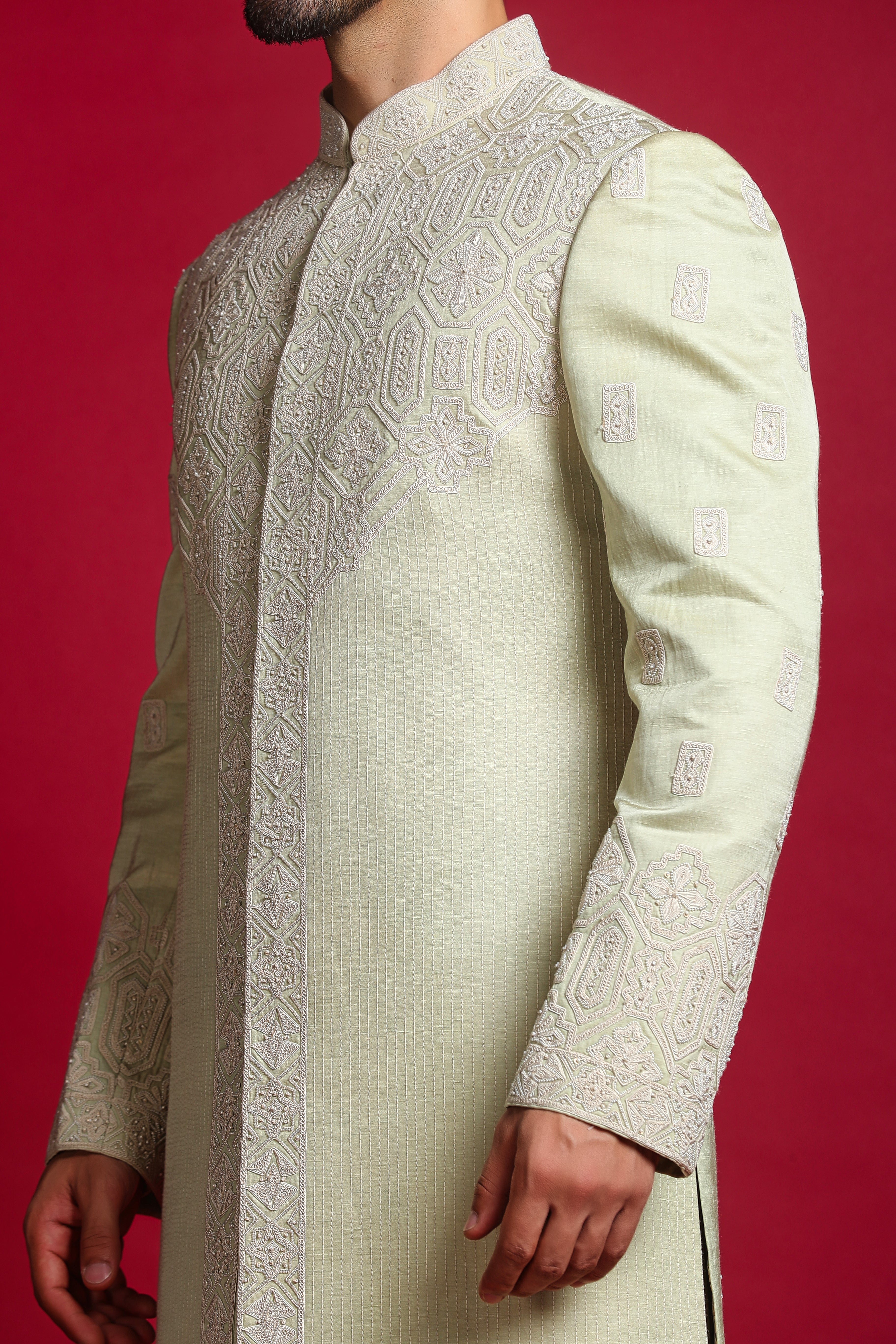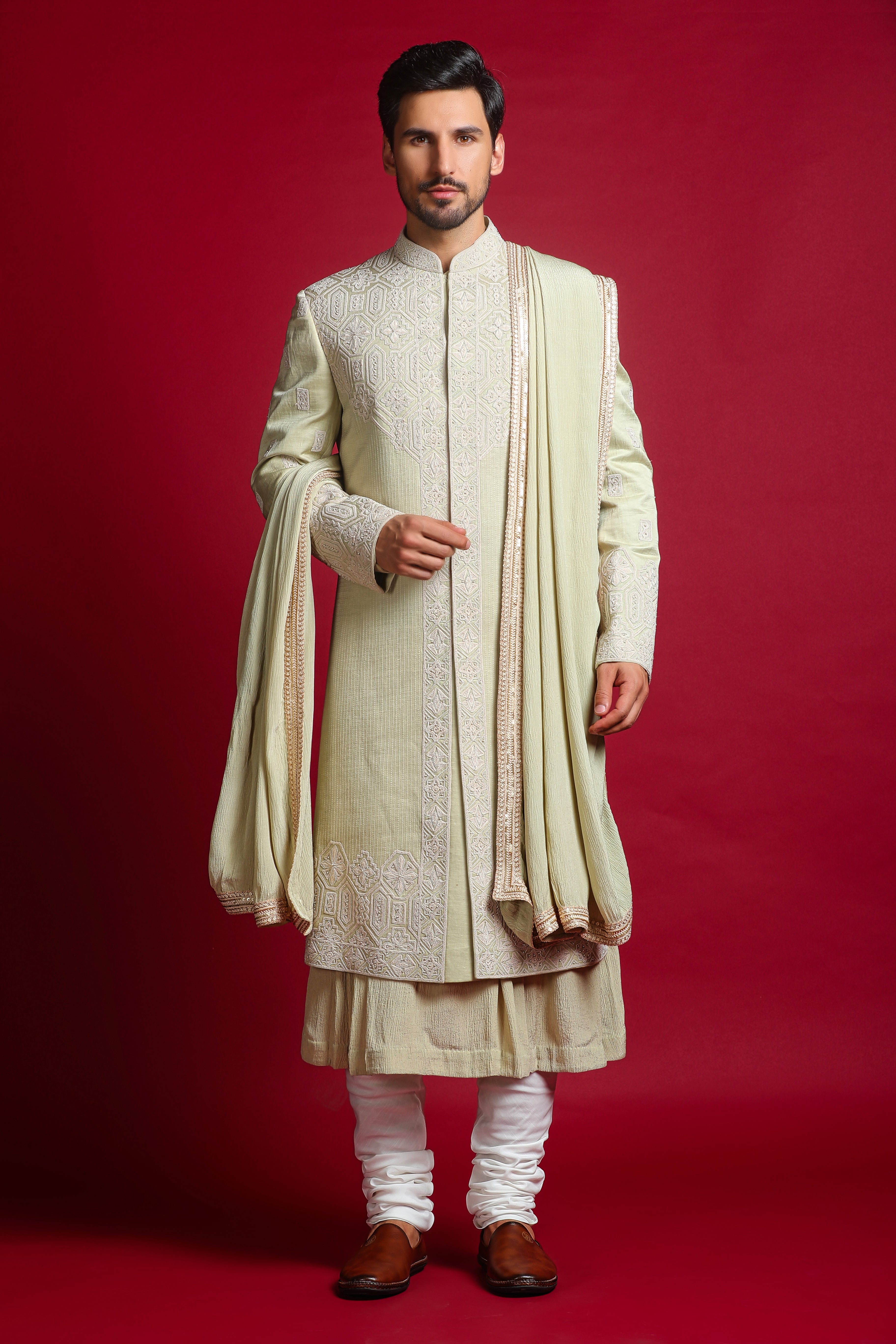 This Pista Green Sherwani Set is expertly crafted from luxurious linen silk which is paired with a heavy-weight crushed chiffon kurta, adding texture and richness to the ensemble. Completing the look are the ivory dull bosky churidar and a coordinating stole, offering a refined balance of style and sophistication.