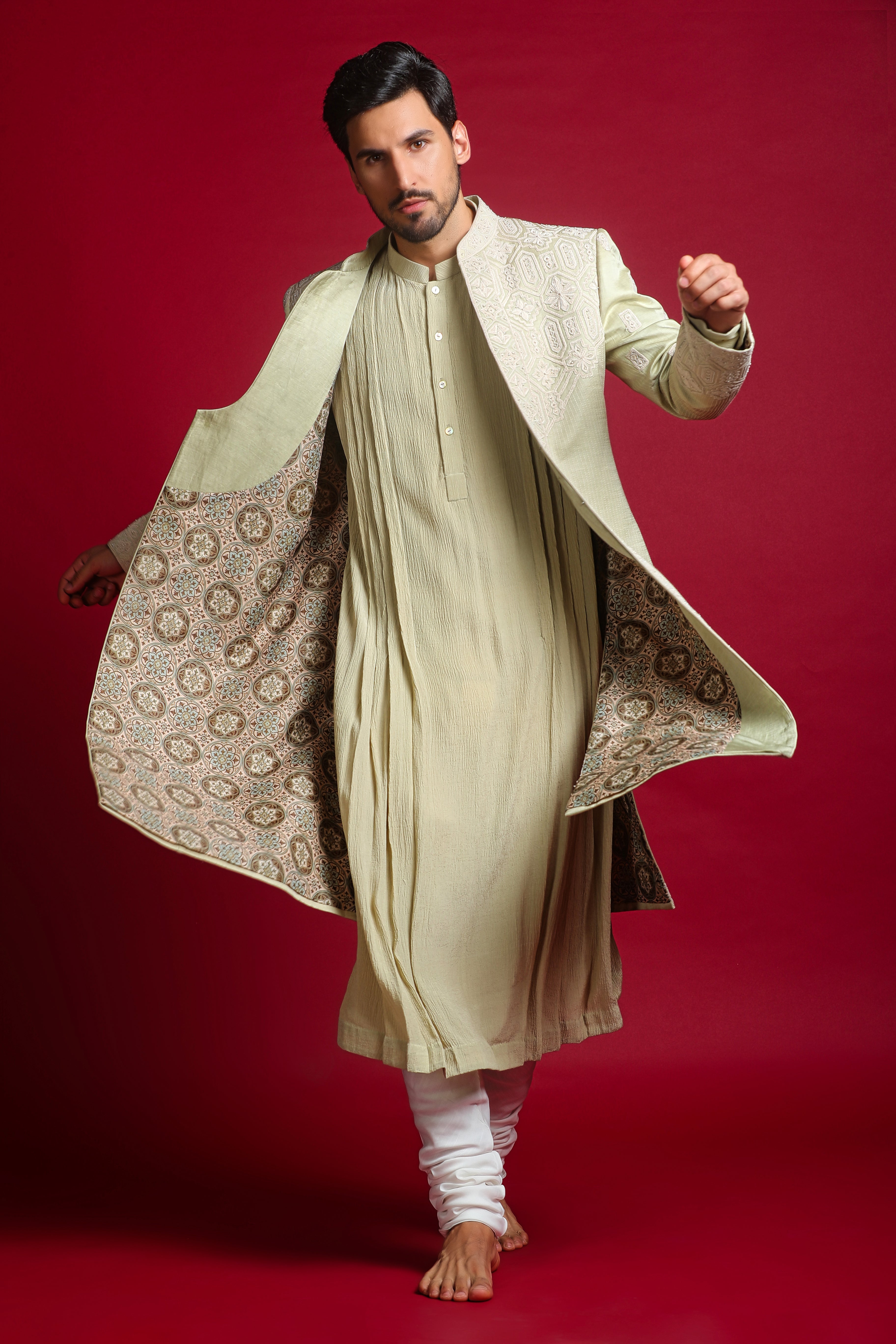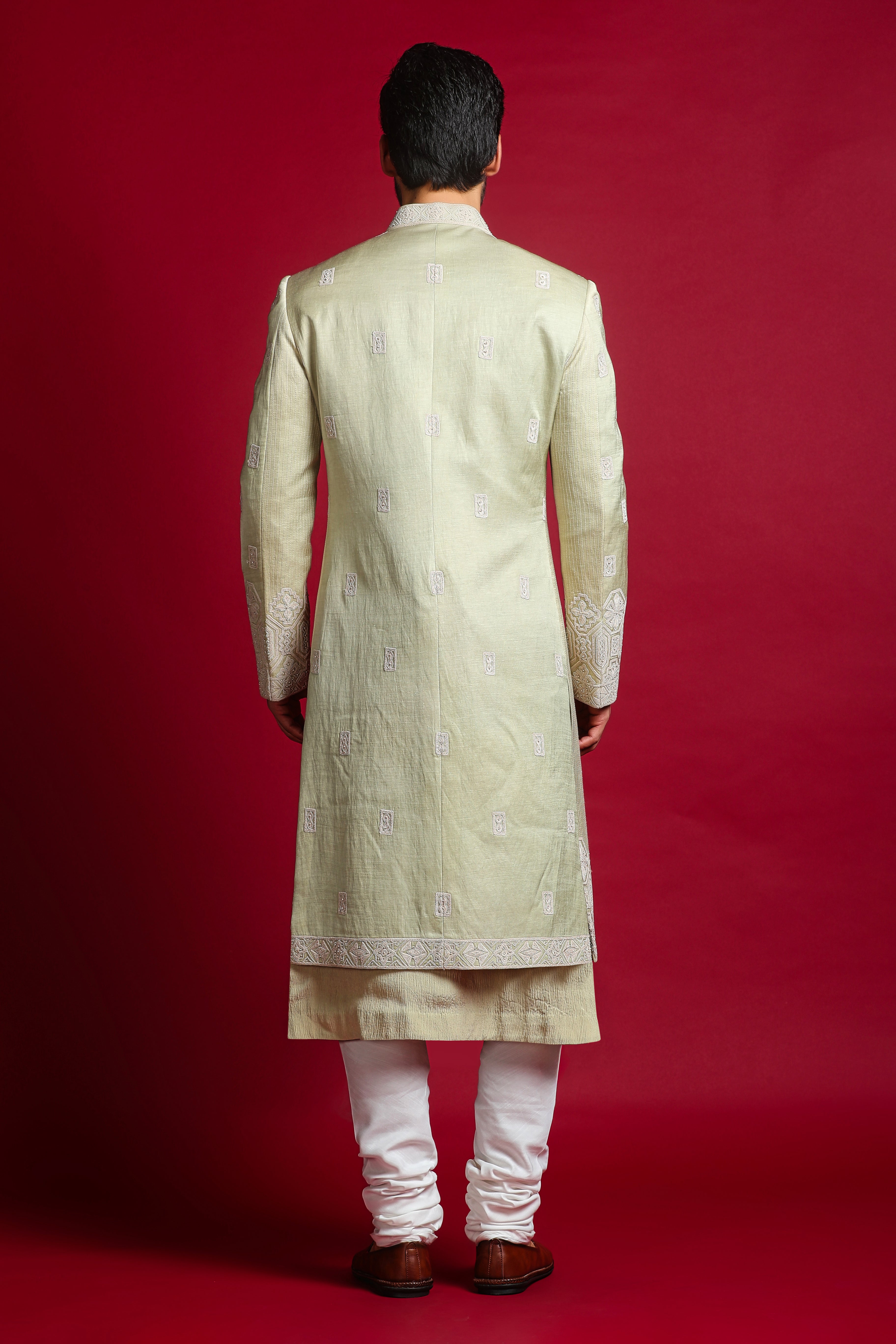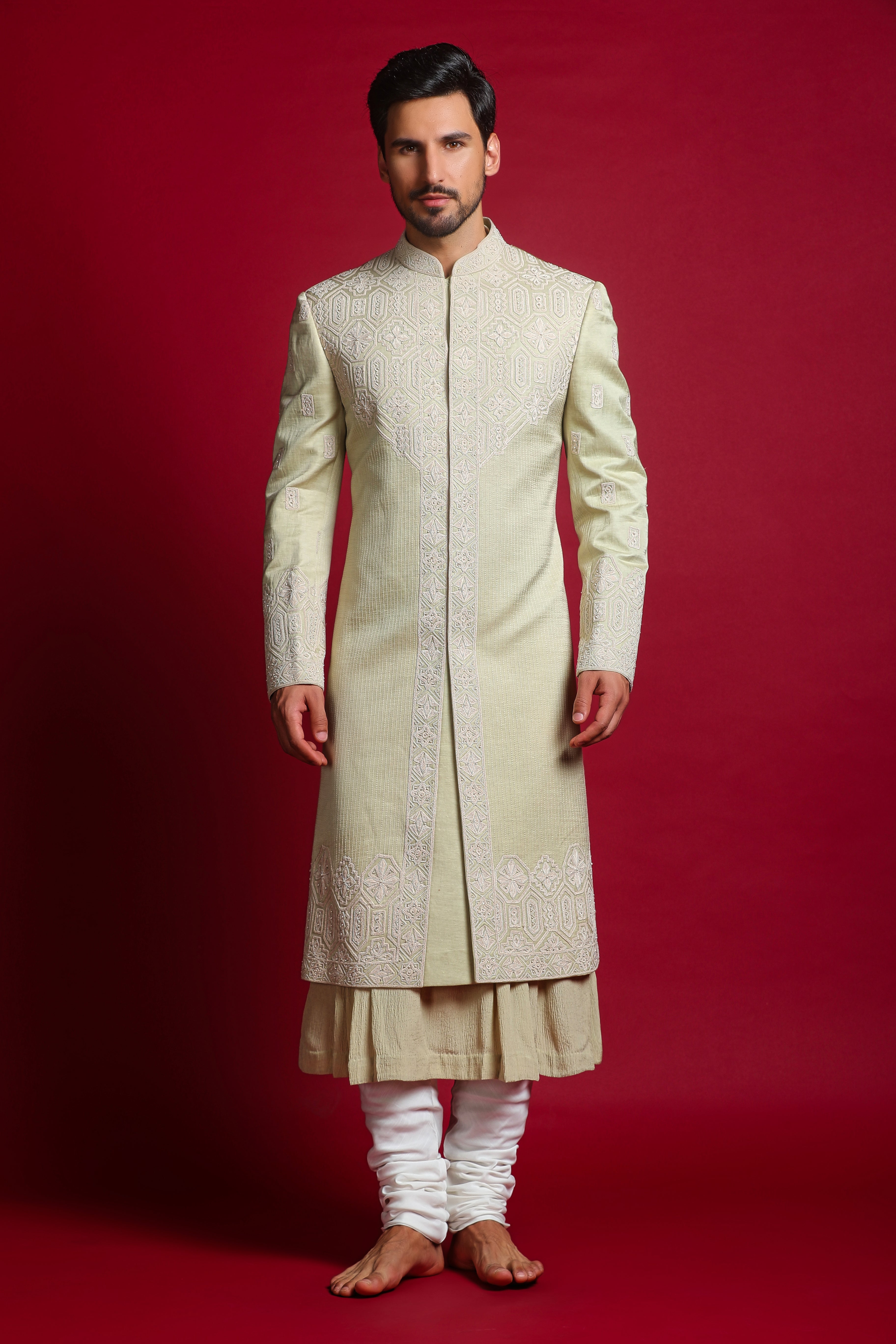 This Pista Green Sherwani Set is expertly crafted from luxurious linen silk which is paired with a heavy-weight crushed chiffon kurta, adding texture and richness to the ensemble. Completing the look are the ivory dull bosky churidar and a coordinating stole, offering a refined balance of style and sophistication.
