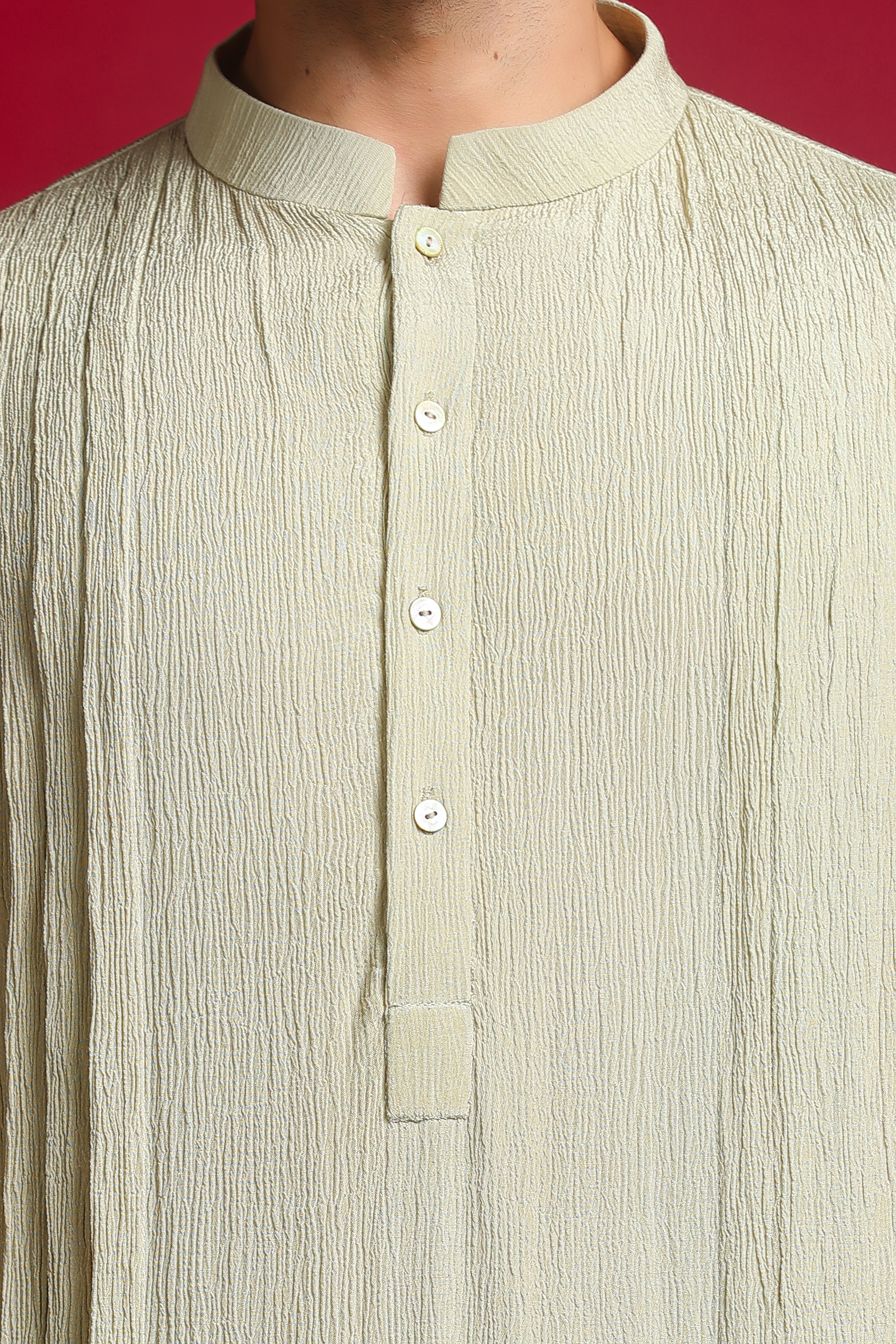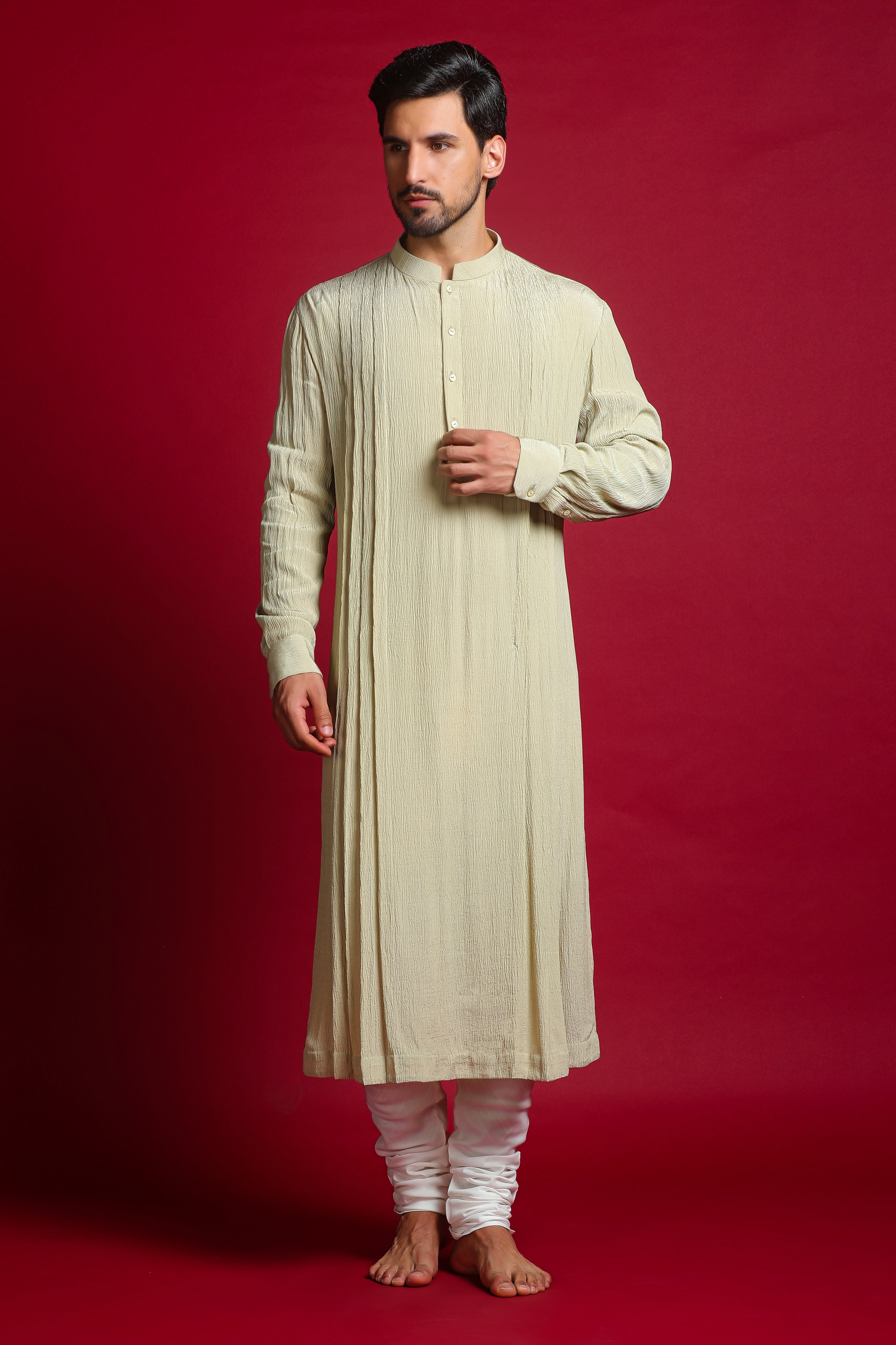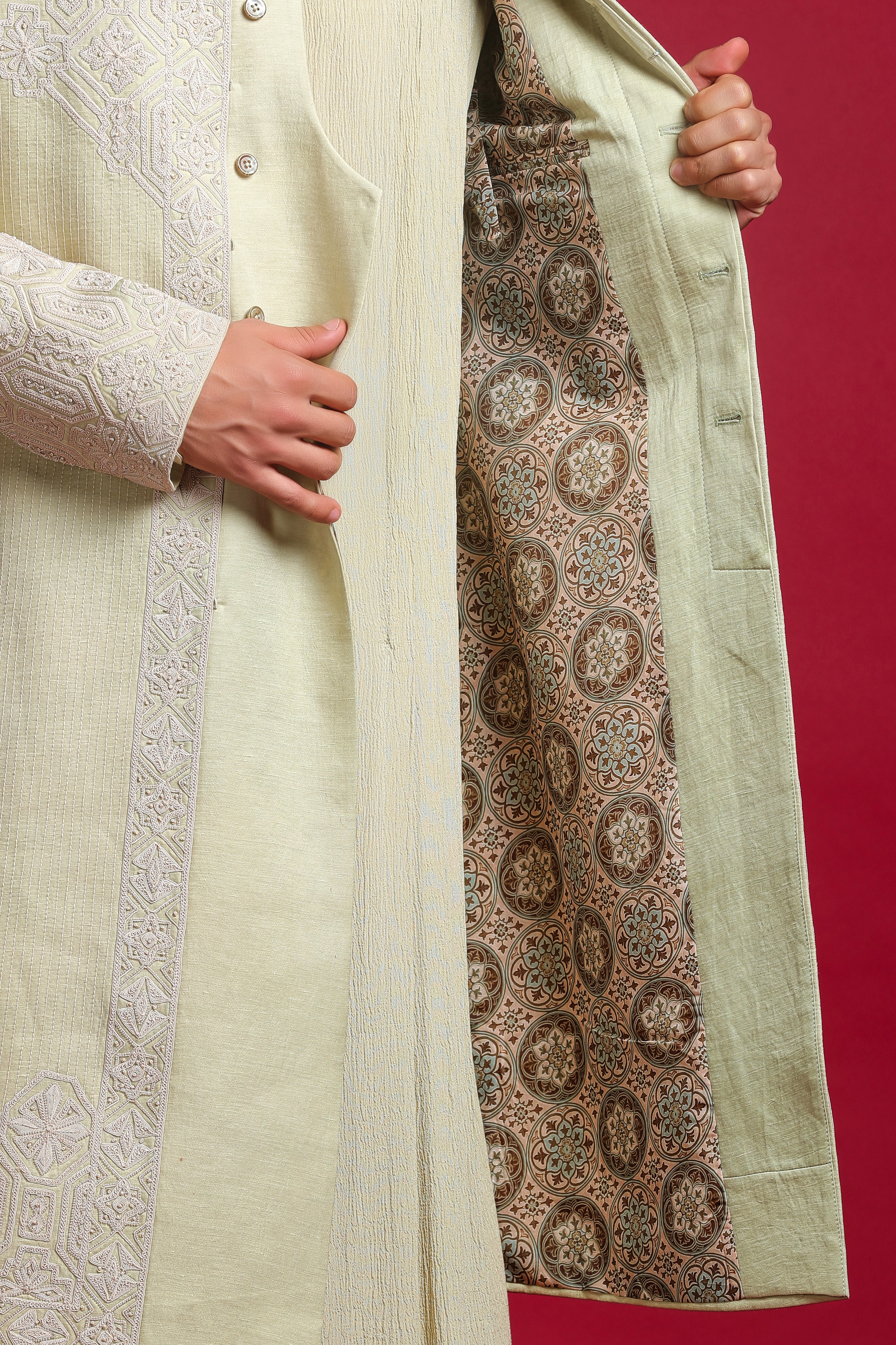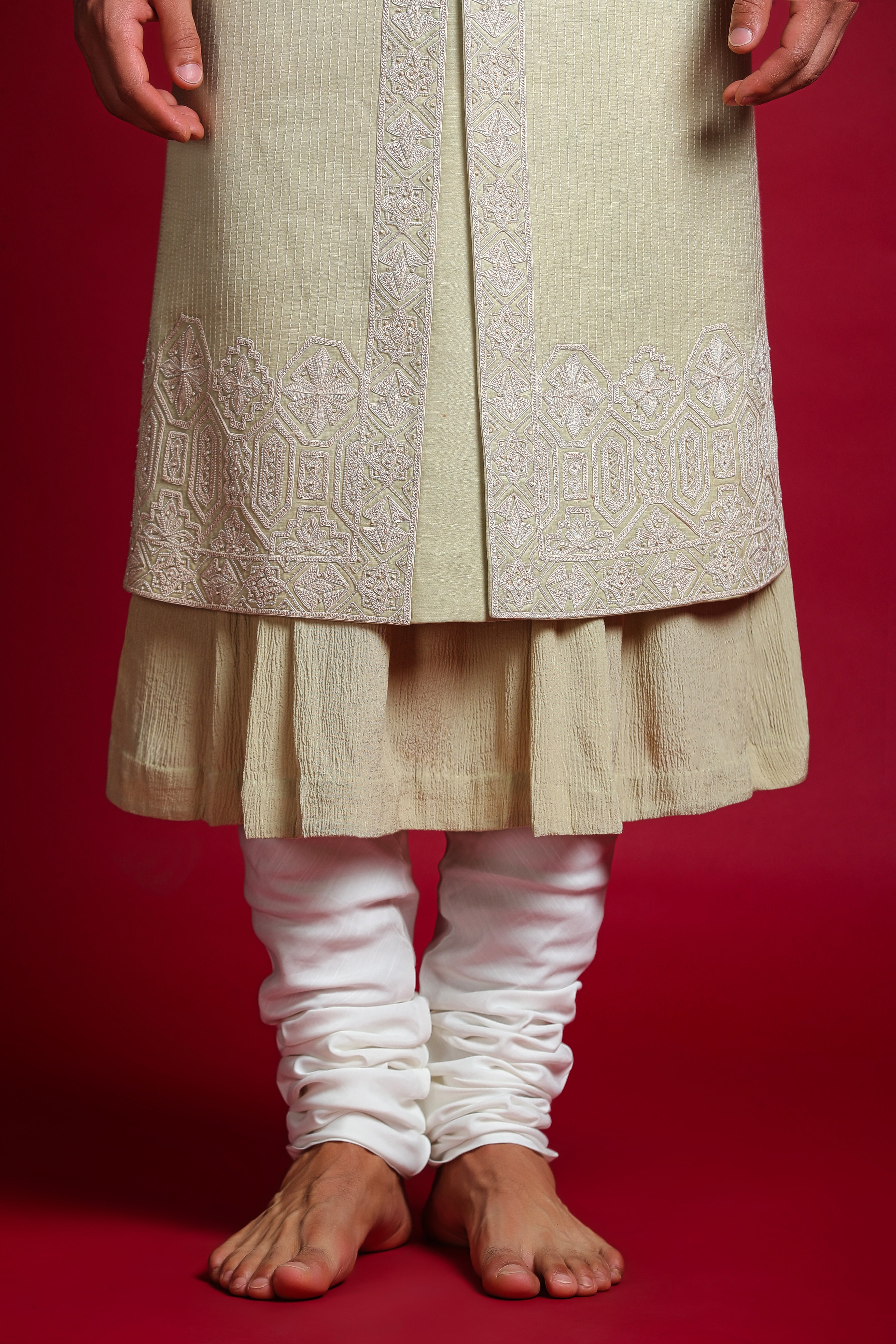 This Pista Green Sherwani Set is expertly crafted from luxurious linen silk which is paired with a heavy-weight crushed chiffon kurta, adding texture and richness to the ensemble. Completing the look are the ivory dull bosky churidar and a coordinating stole, offering a refined balance of style and sophistication.
