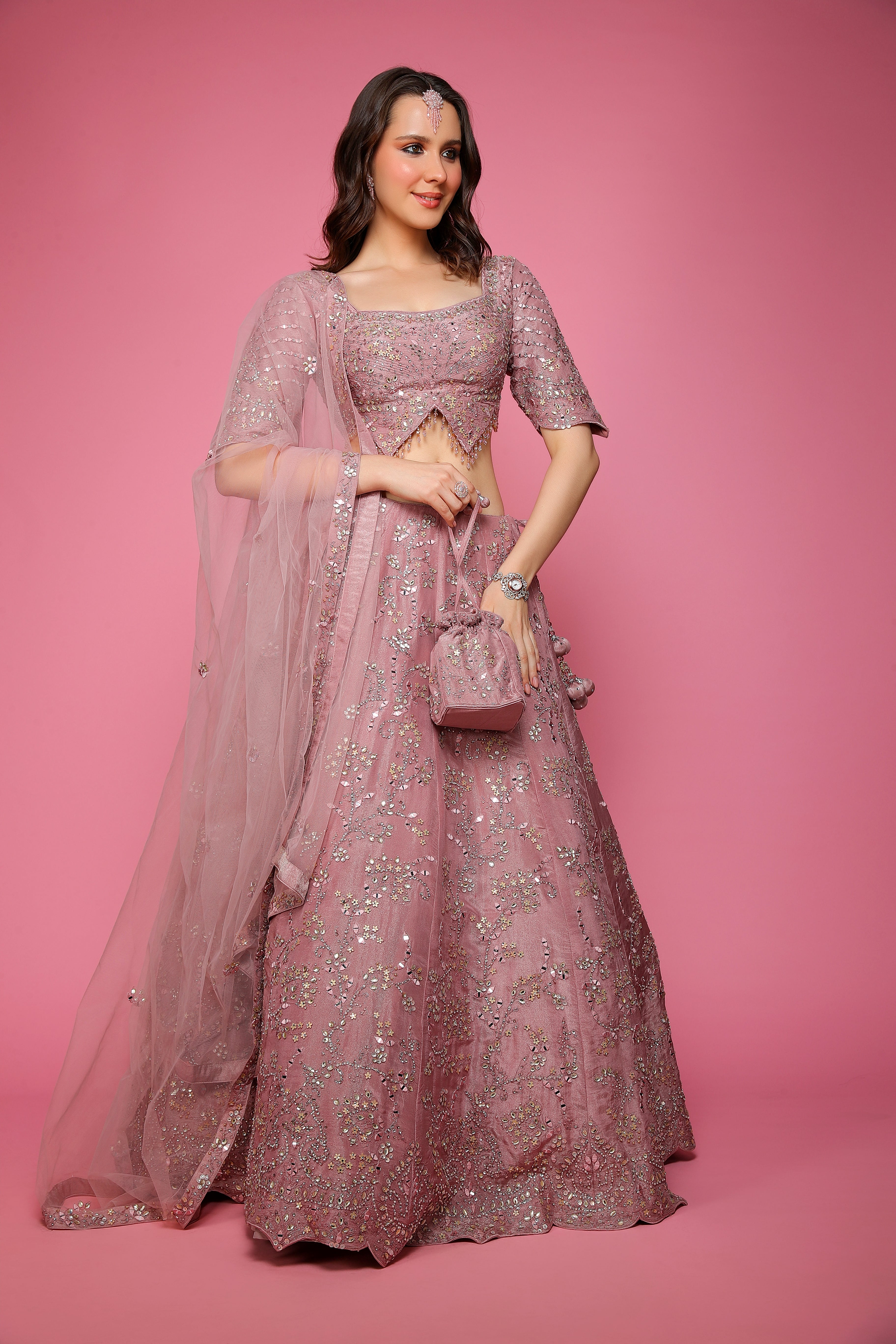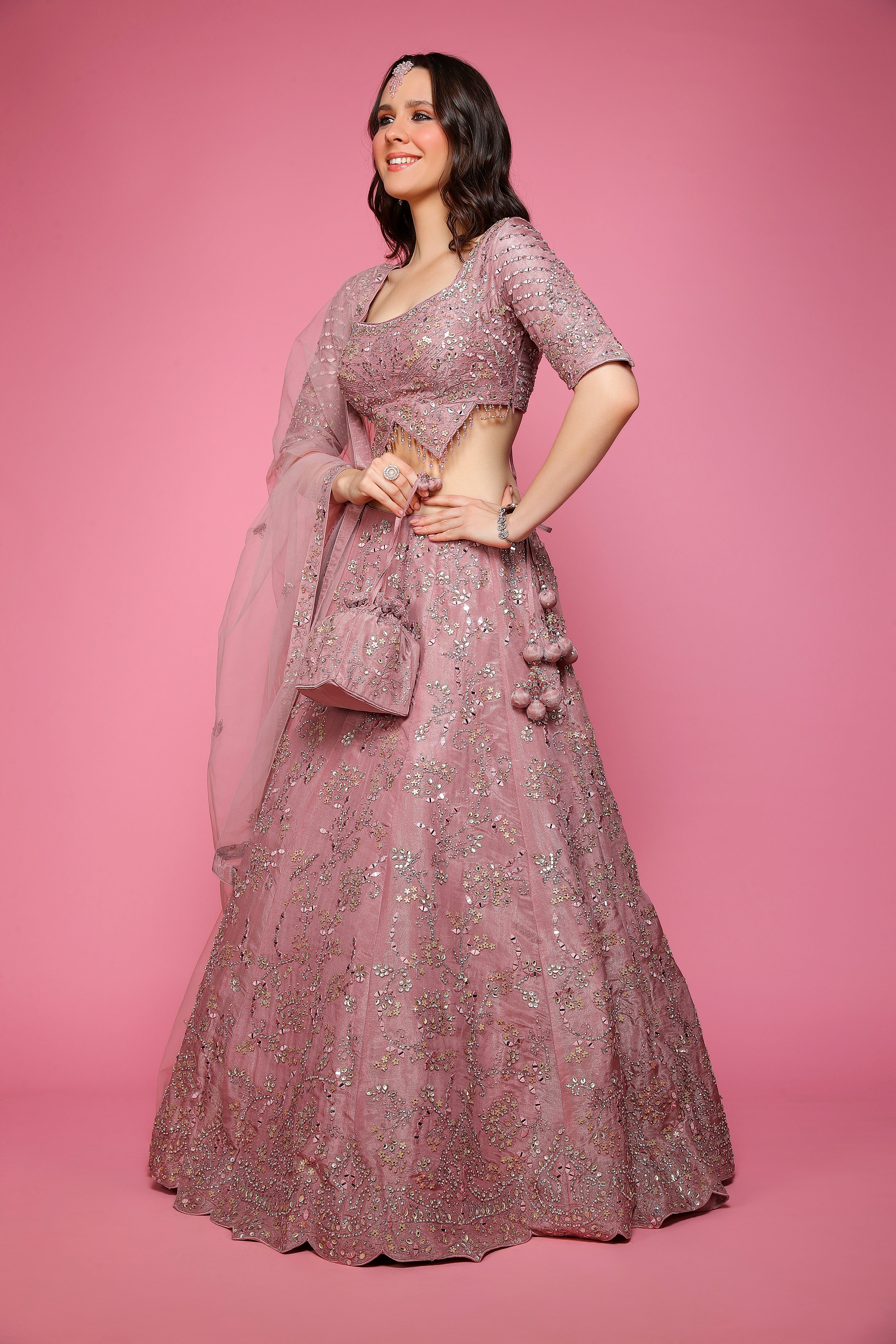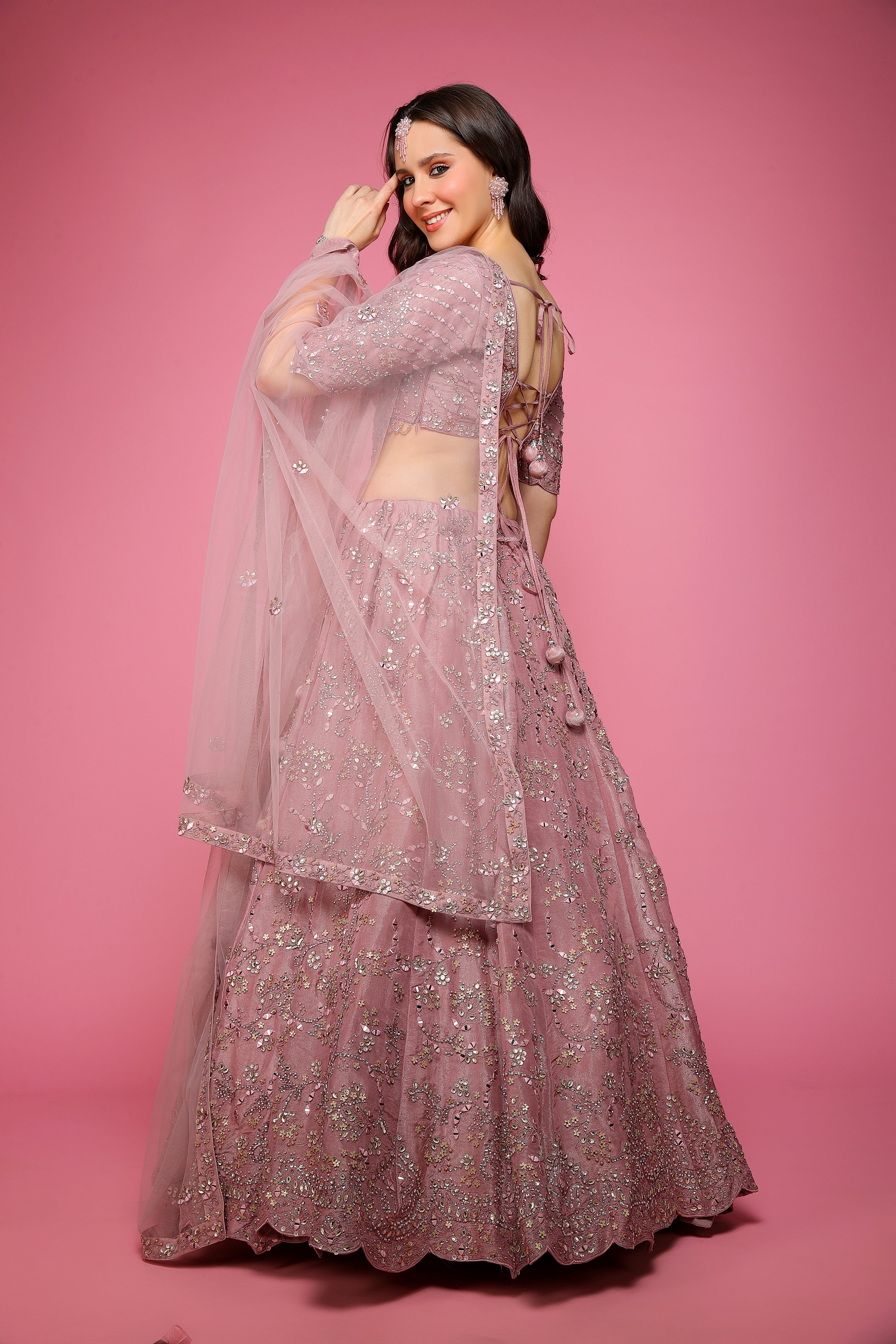 A poetic blend of elegance and charm, this dusty rose-hued lehenga is a vision of ethereal beauty. Adorned with intricate mirror, sequin, and cutdana embroidery, the ensemble exudes a celestial glow. The fitted blouse features a scalloped hemline, accentuated with delicate embellishments, while sheer embroidered sleeves add a touch of grace. The voluminous lehenga is meticulously crafted with shimmering floral vines, creating a mesmerizing play of light. Completing the look, the embroidered net dupatta cascades effortlessly, adding an enchanting allure.