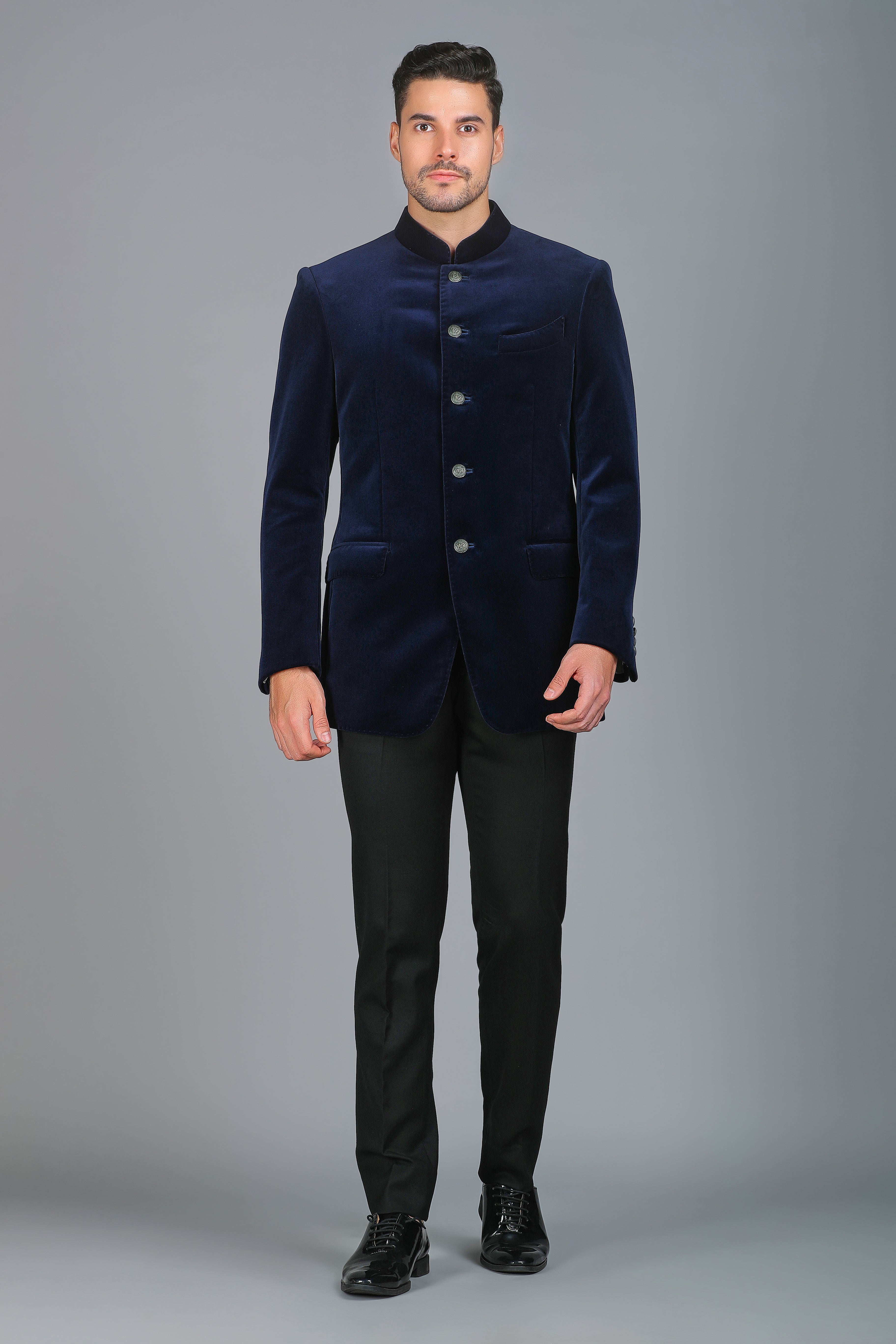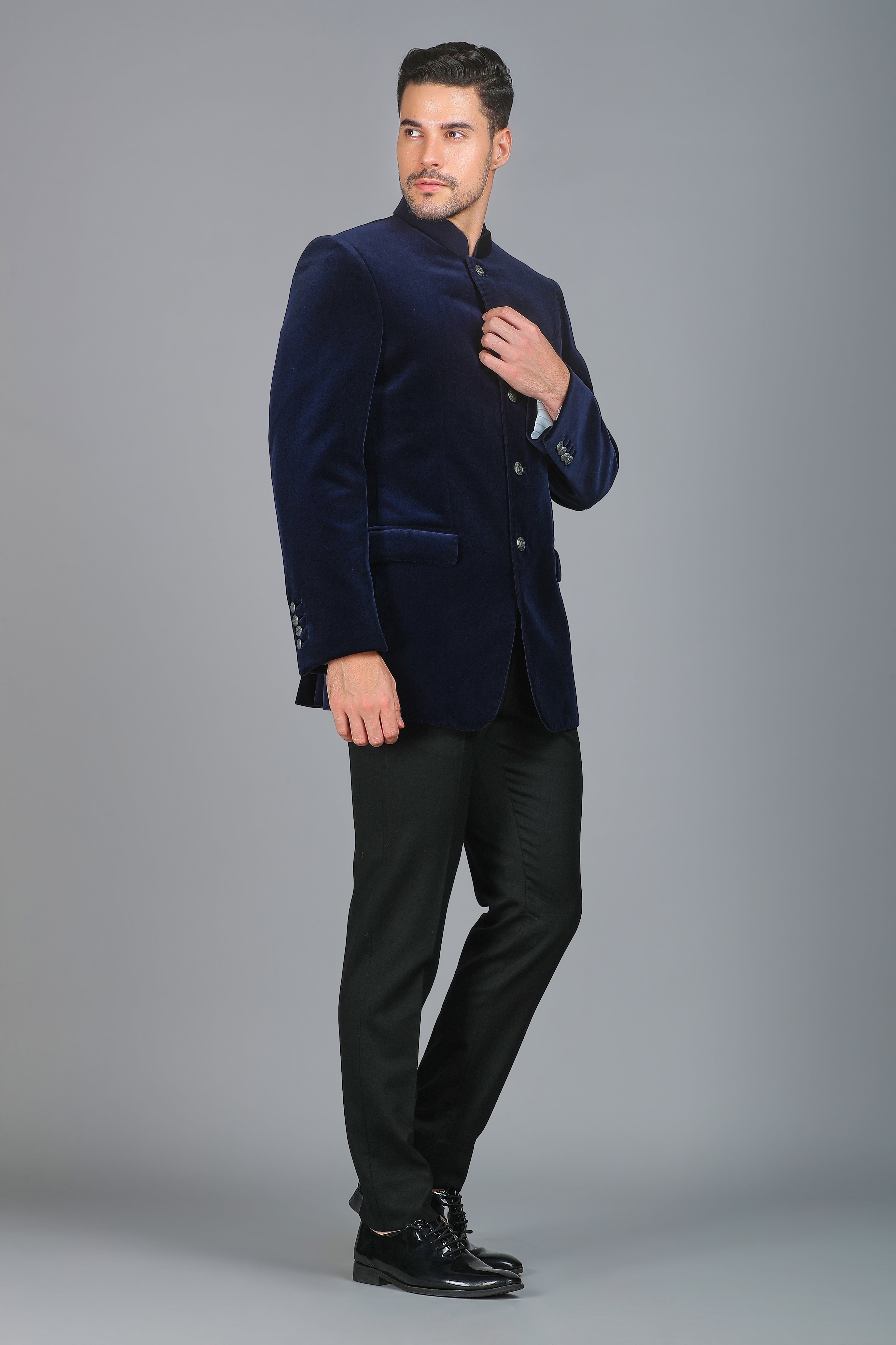 Step into elegance with our Royal Blue Velvet Silk Bandhgala Jacket, a masterpiece of refined craftsmanship. Hand-stitched with meticulous detailing, this regal ensemble is adorned with antique gold buttons, adding a touch of grandeur. Designed for a perfect fit, this Bandhgala exudes sophistication, making it an impeccable choice for any occasion, from festive celebrations to formal gatherings.