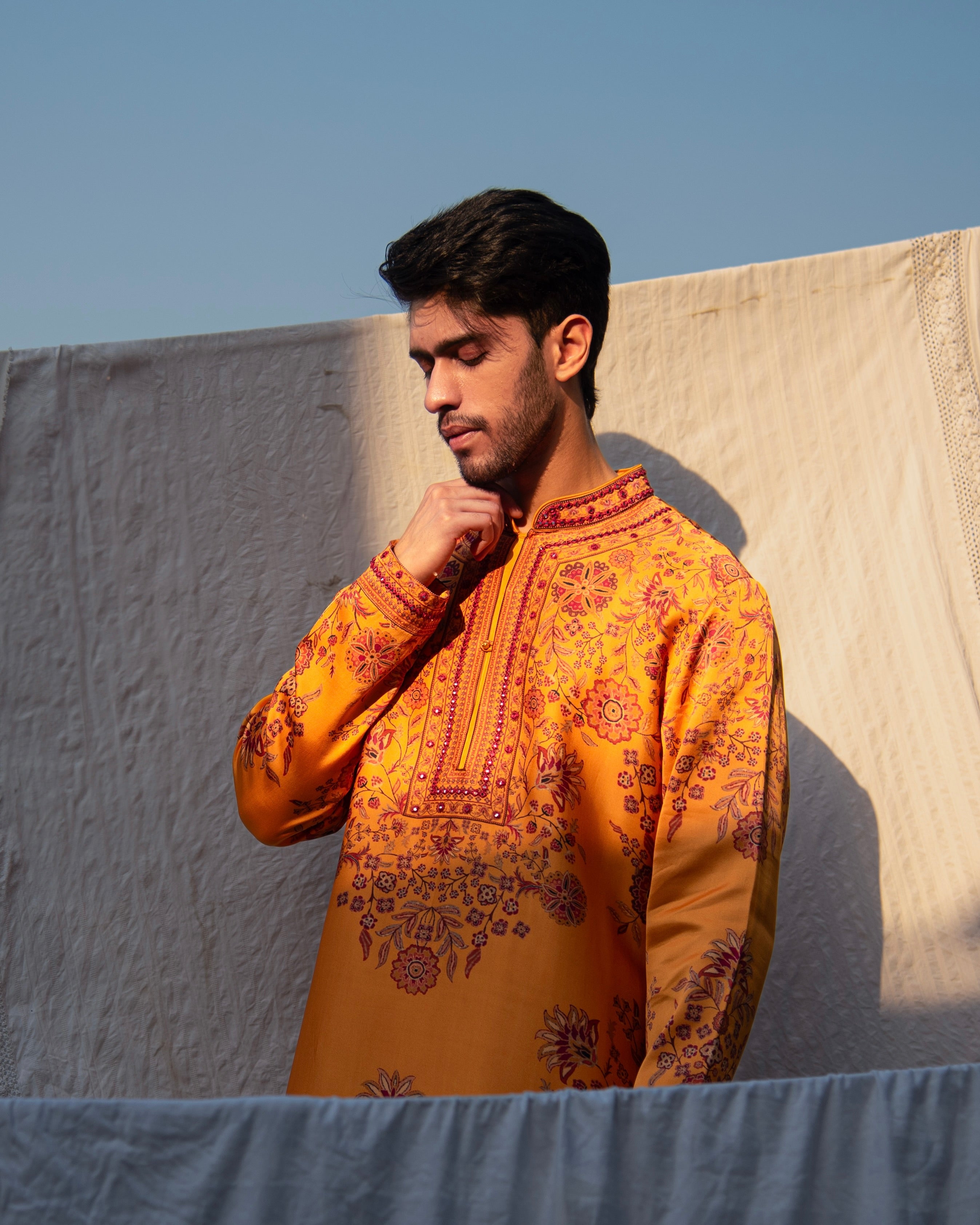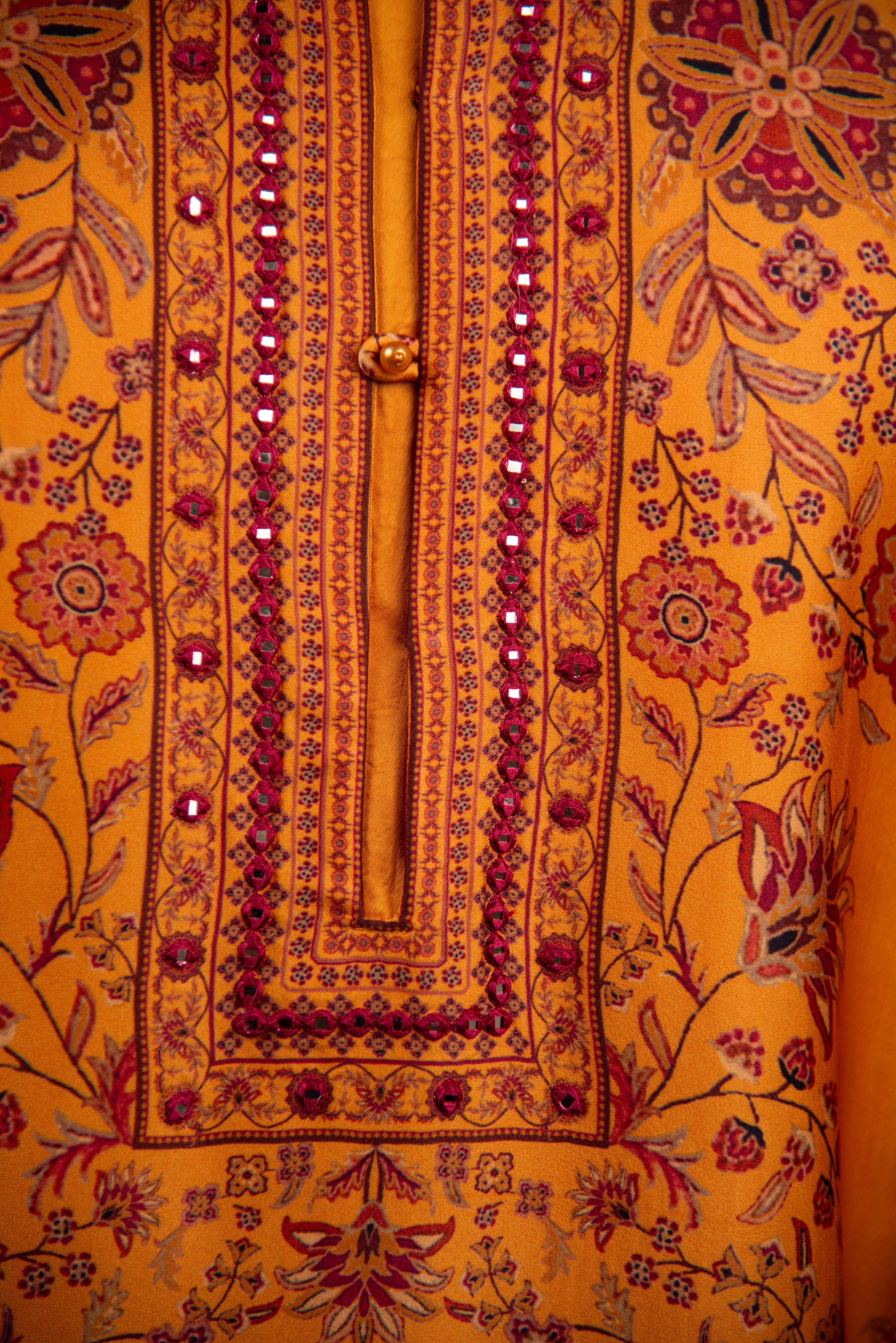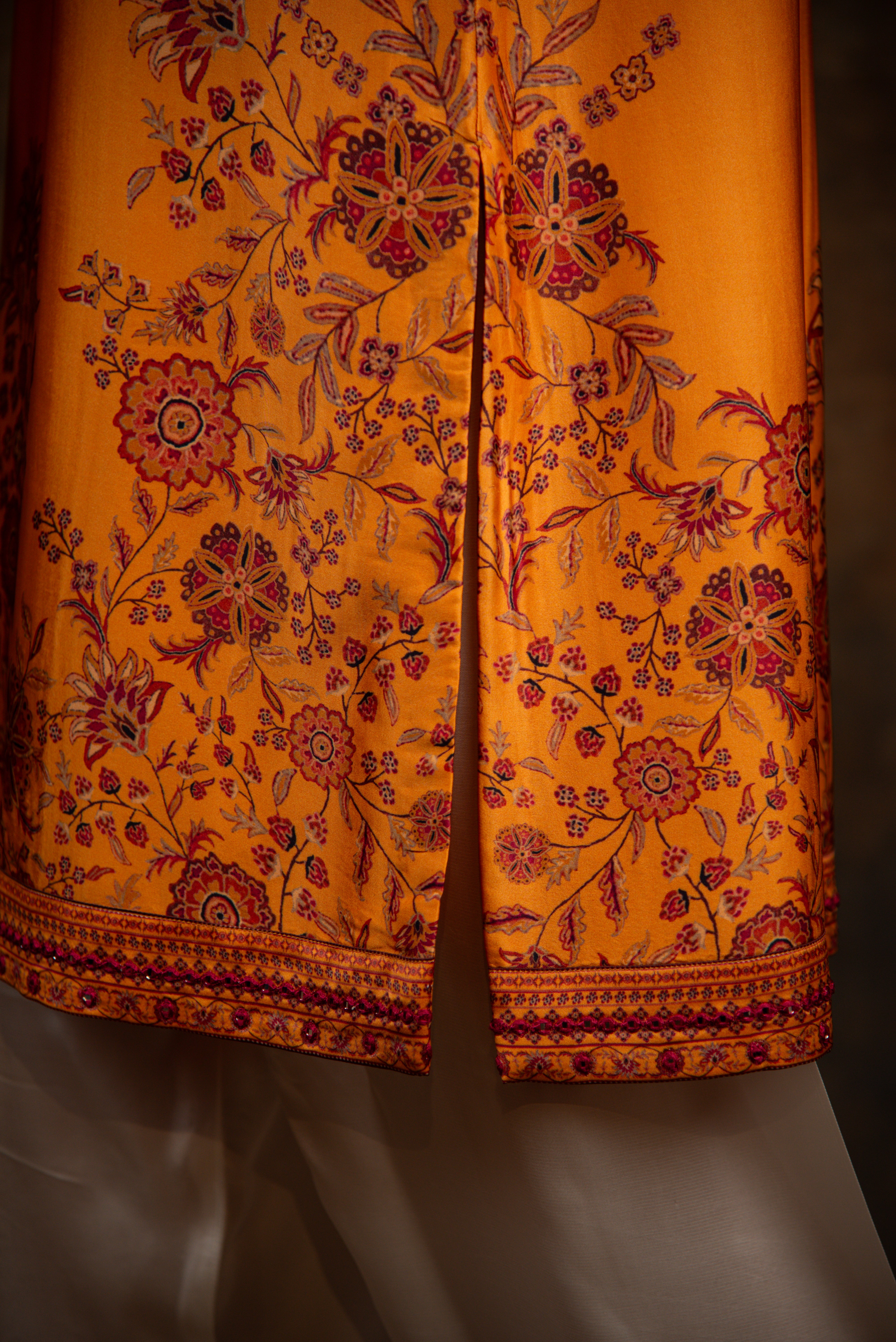 The Saffron Orange Kurta is a vibrant and energetic piece adorned with a stunning floral digital print that exudes charm. The intricate mirror embellishments, thoughtfully placed throughout the design, bring a unique flair, enhancing its overall elegance. The harmonious blend of shimmer and rich detailing makes this kurta a standout choice, perfect for special occasions or festive gatherings.