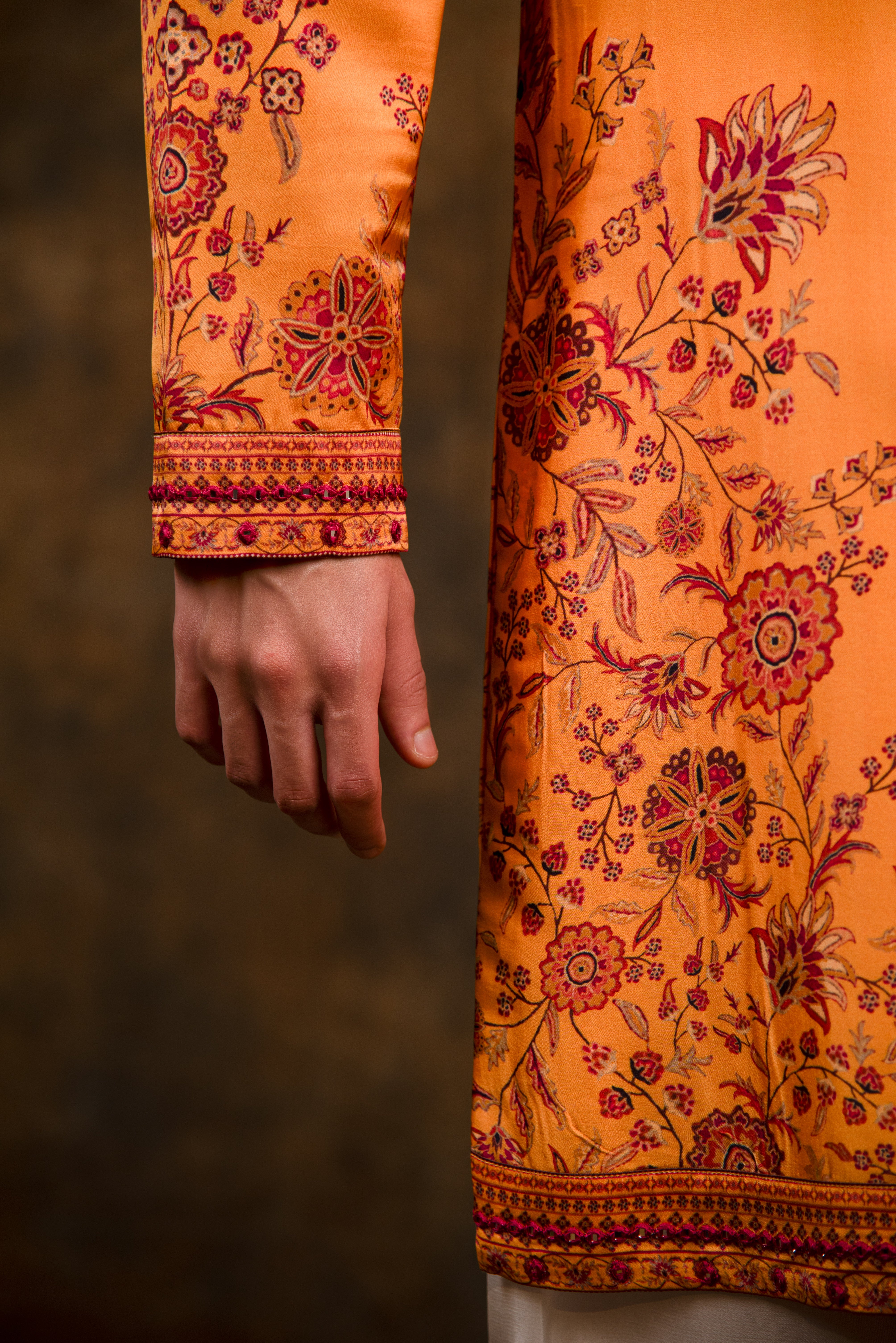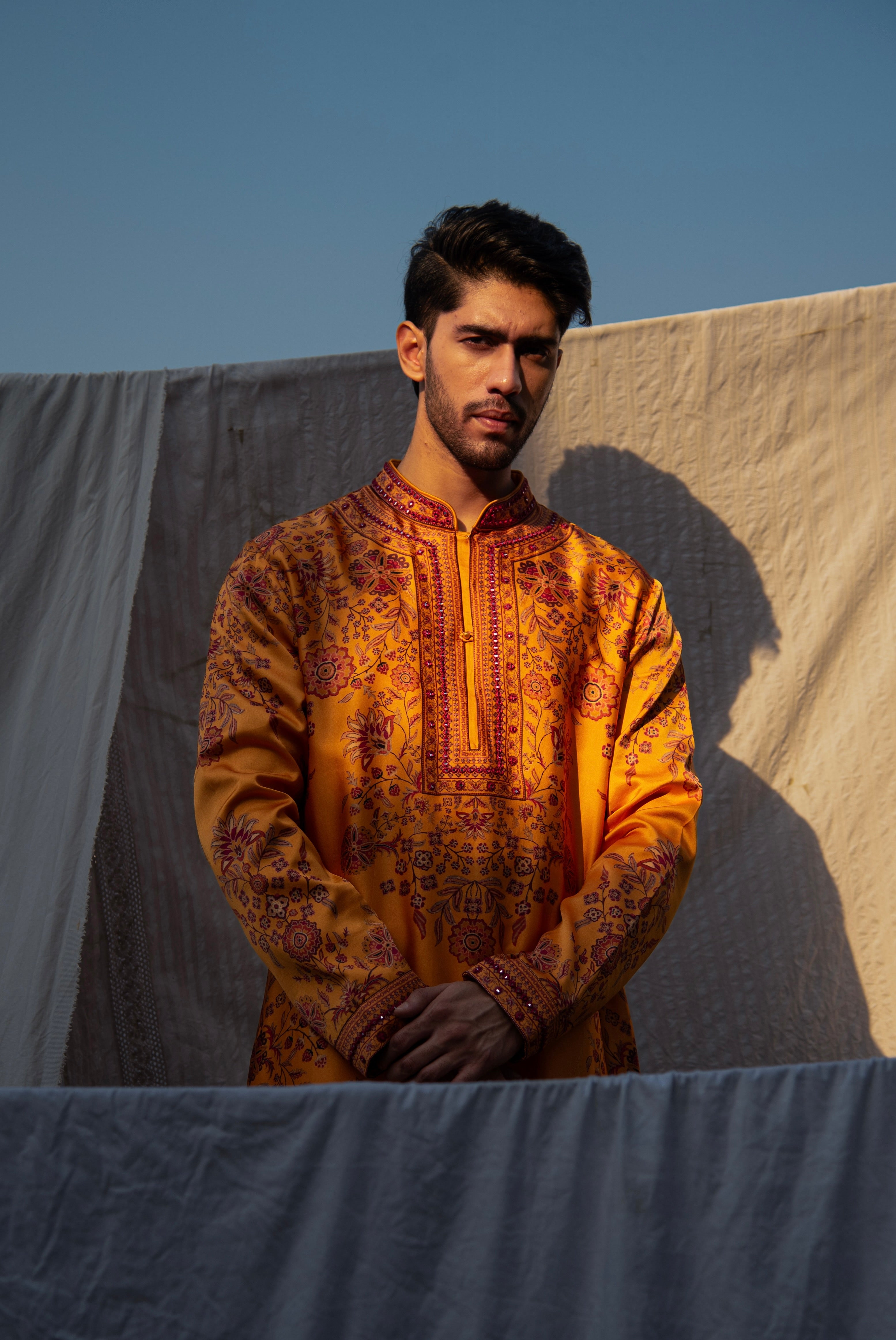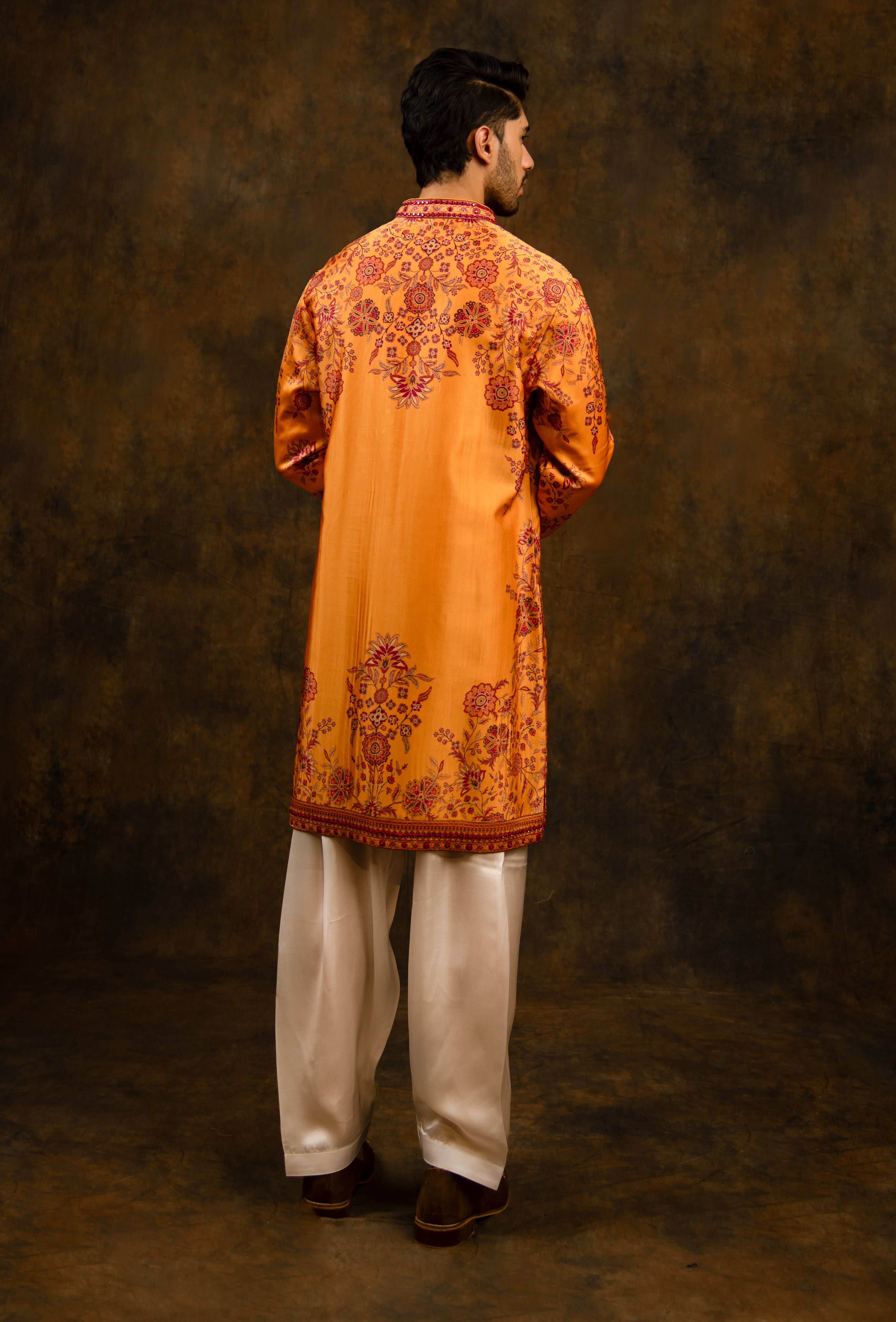 The Saffron Orange Kurta is a vibrant and energetic piece adorned with a stunning floral digital print that exudes charm. The intricate mirror embellishments, thoughtfully placed throughout the design, bring a unique flair, enhancing its overall elegance. The harmonious blend of shimmer and rich detailing makes this kurta a standout choice, perfect for special occasions or festive gatherings.